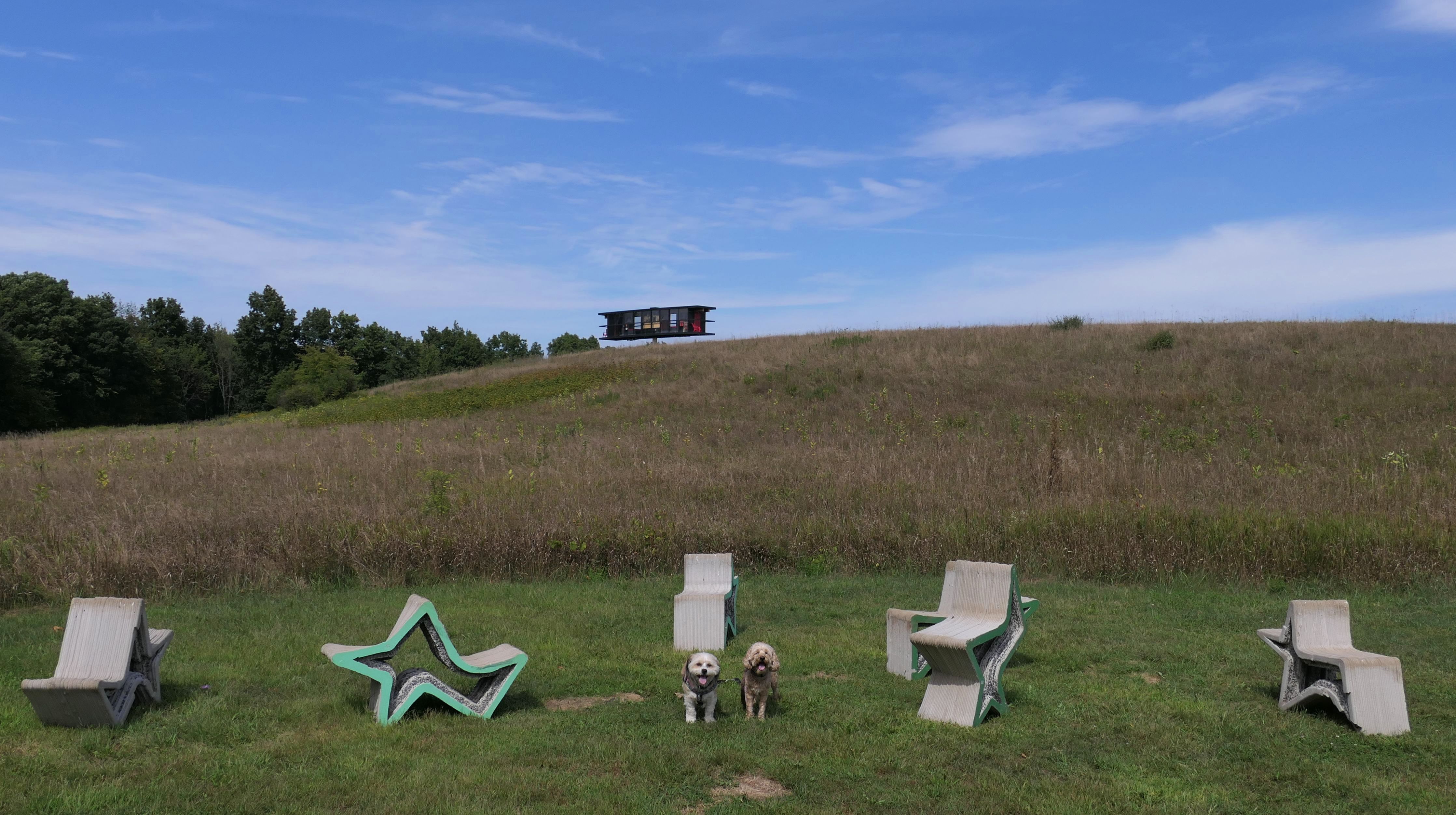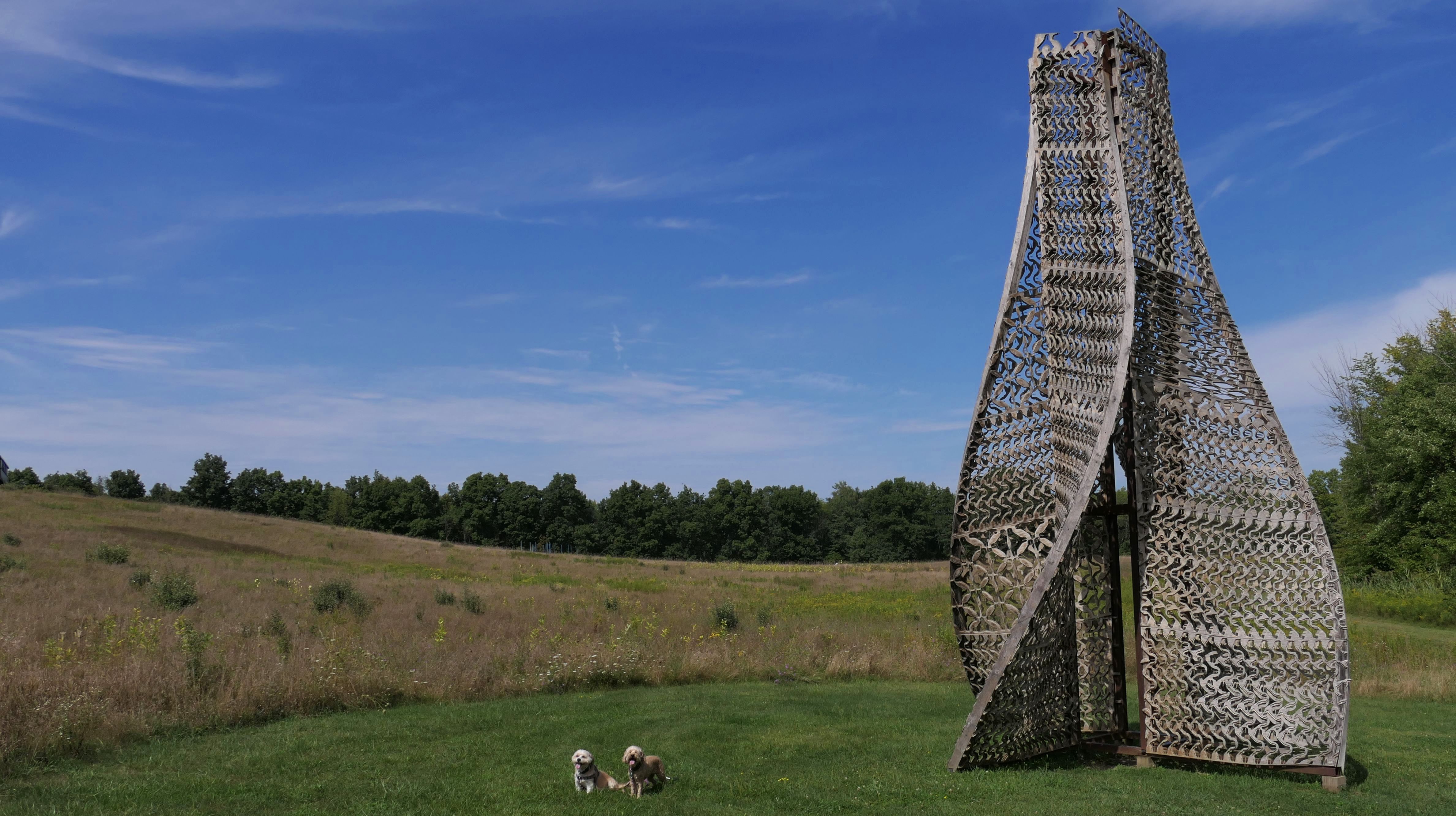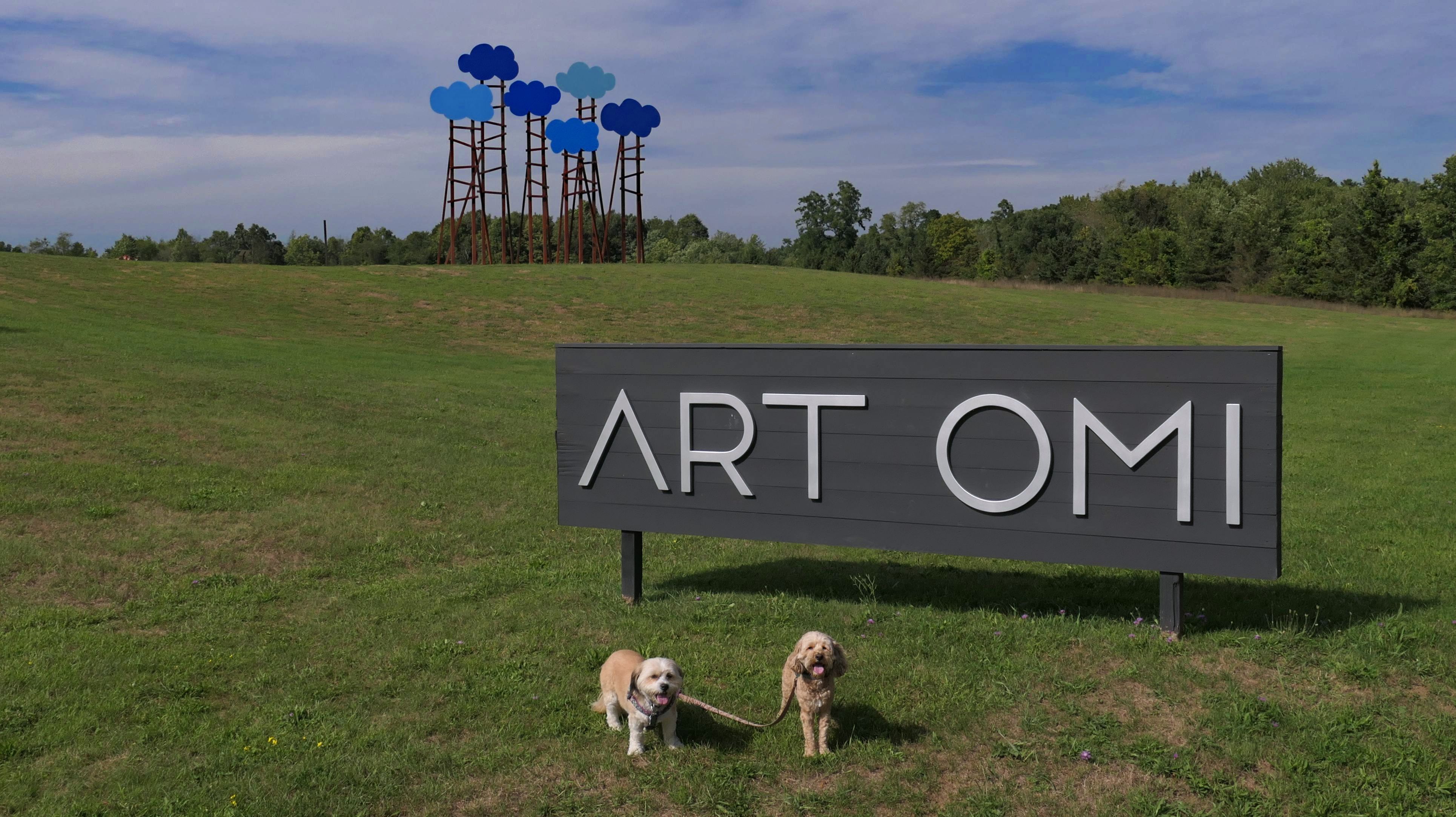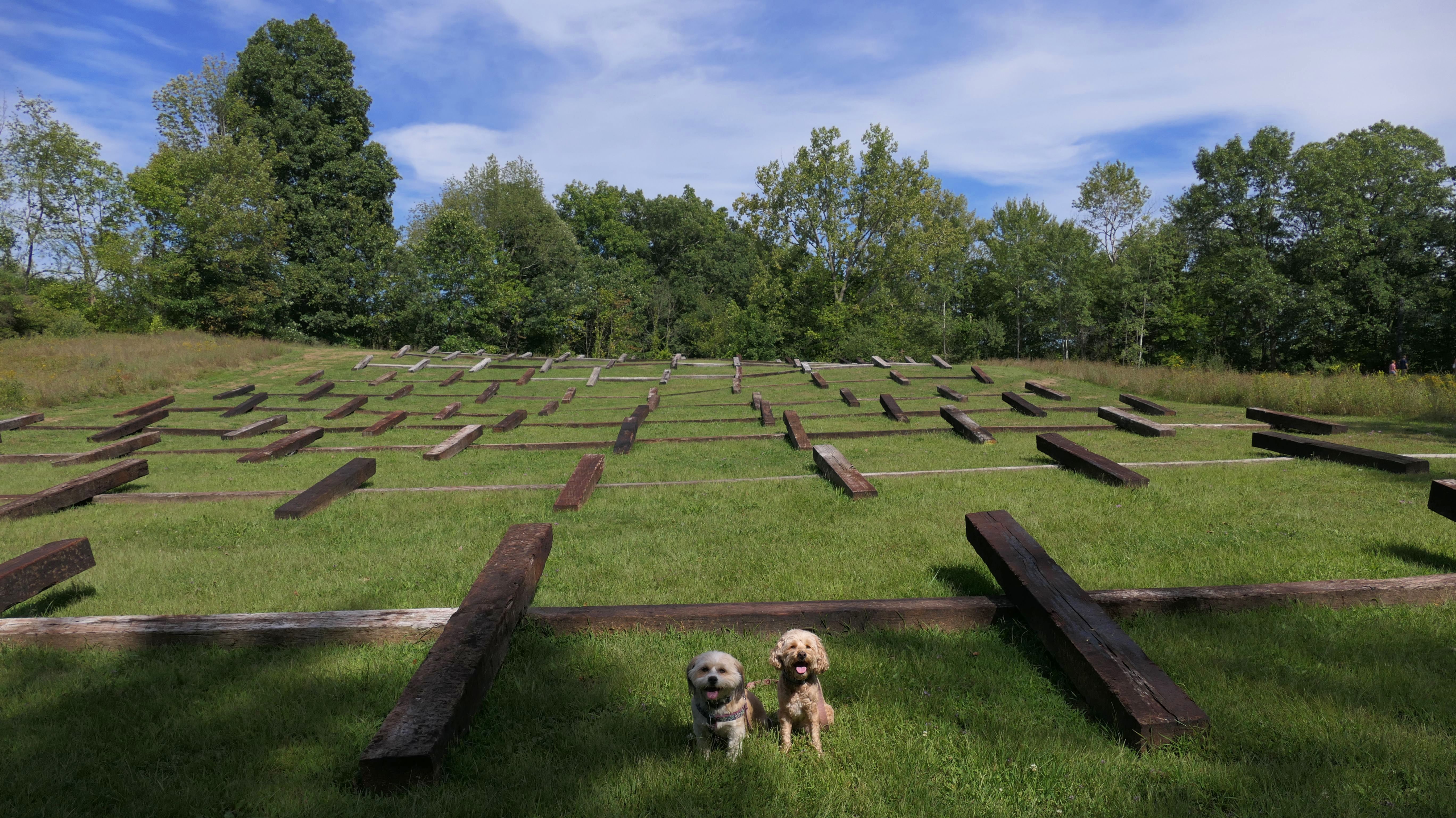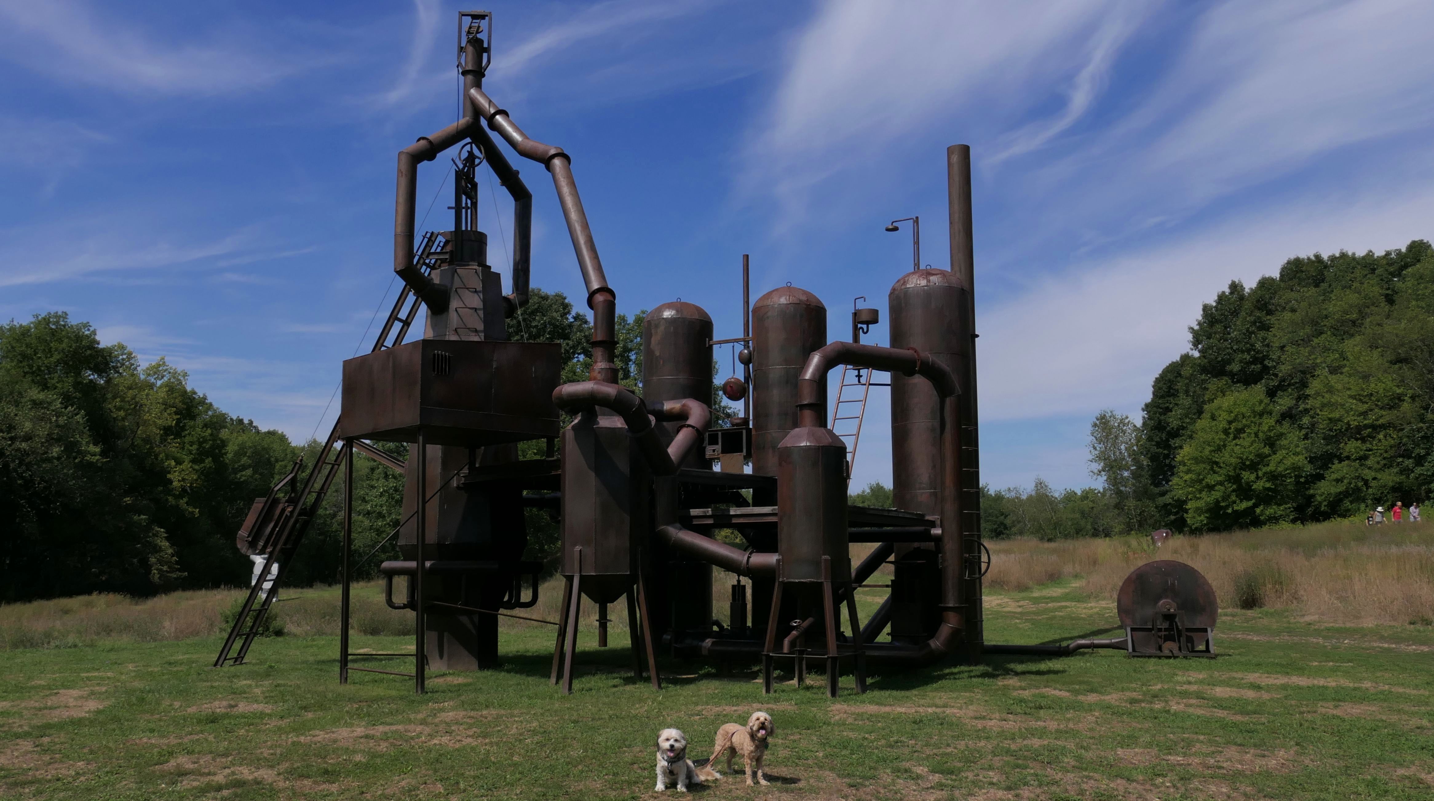 This was a completely different trip than we usually go on, and a lot of fun! This is a trail that runs through an outdoor art gallery. There are 120 acres here, filled with all sorts of "modern art". I've been to sculpture trails before in Putnam, CT and South Kingstown, RI previously, but they pale in comparison to this one! You are encouraged to pre-resgister before visiting, especially on the weekends or holidays, because the place can get busy. Admission is free, but they do suggest a $10 donation. We tried to get to most of the exhibits, but we may have missed a few because the dogs were getting tired. We wound up walking over 3 miles here, with a lot of posing for pictures! My favorite exhibit was the big concrete and marble structure with the pipes that you can look through. I can't believe I got Mandy and Lexi to cooperate and stay while I took pictures of them through the shiny reflective pipe on the other side. There's also a small indoor art gallery here as well with a few exhibits. The best part of the place is that is dog friendly (they must remain leashed of course!) This place is worth checking out if you are looking for something different. You can book your reservation on the Art Omi website, and read more about the originization.