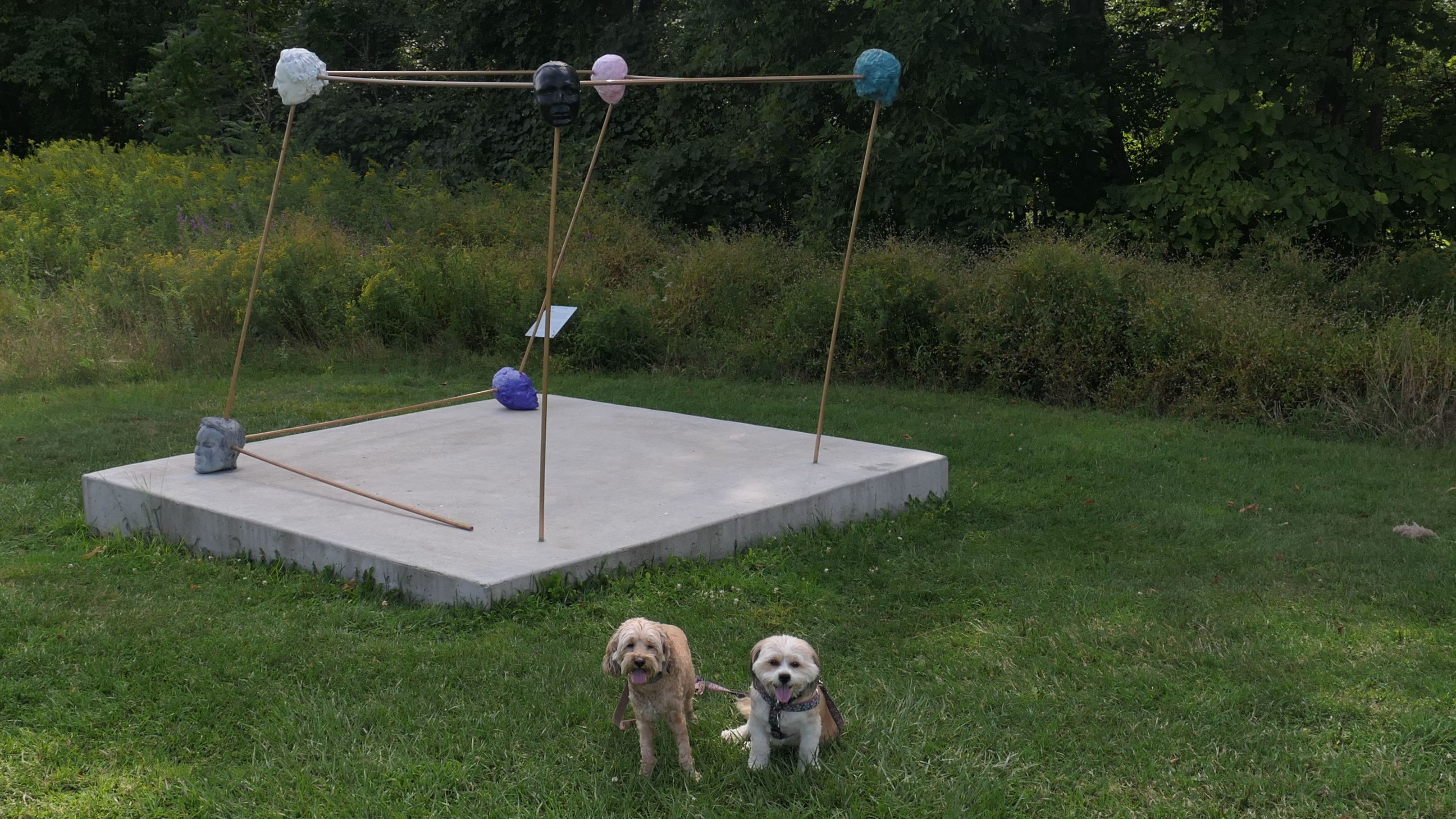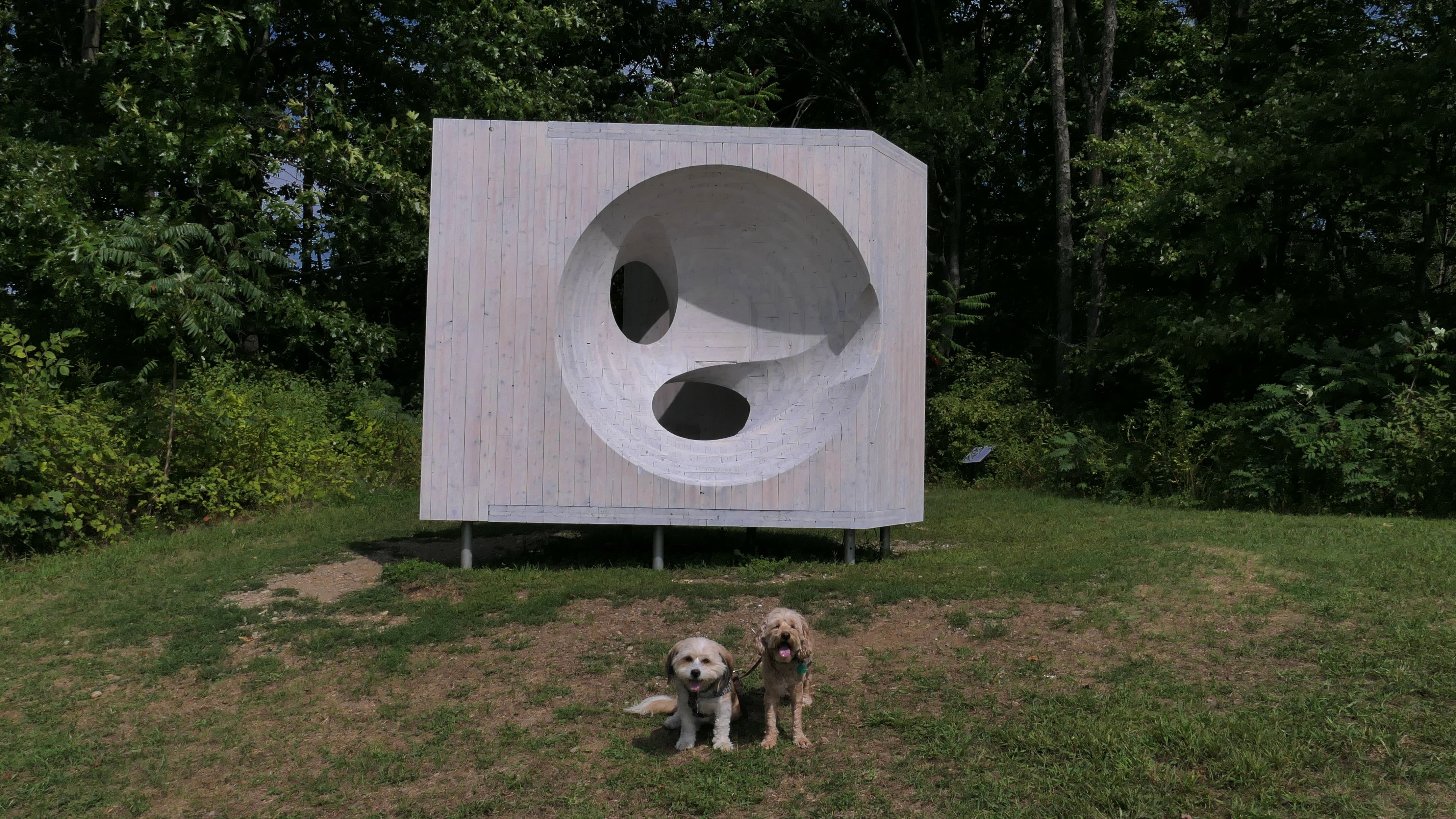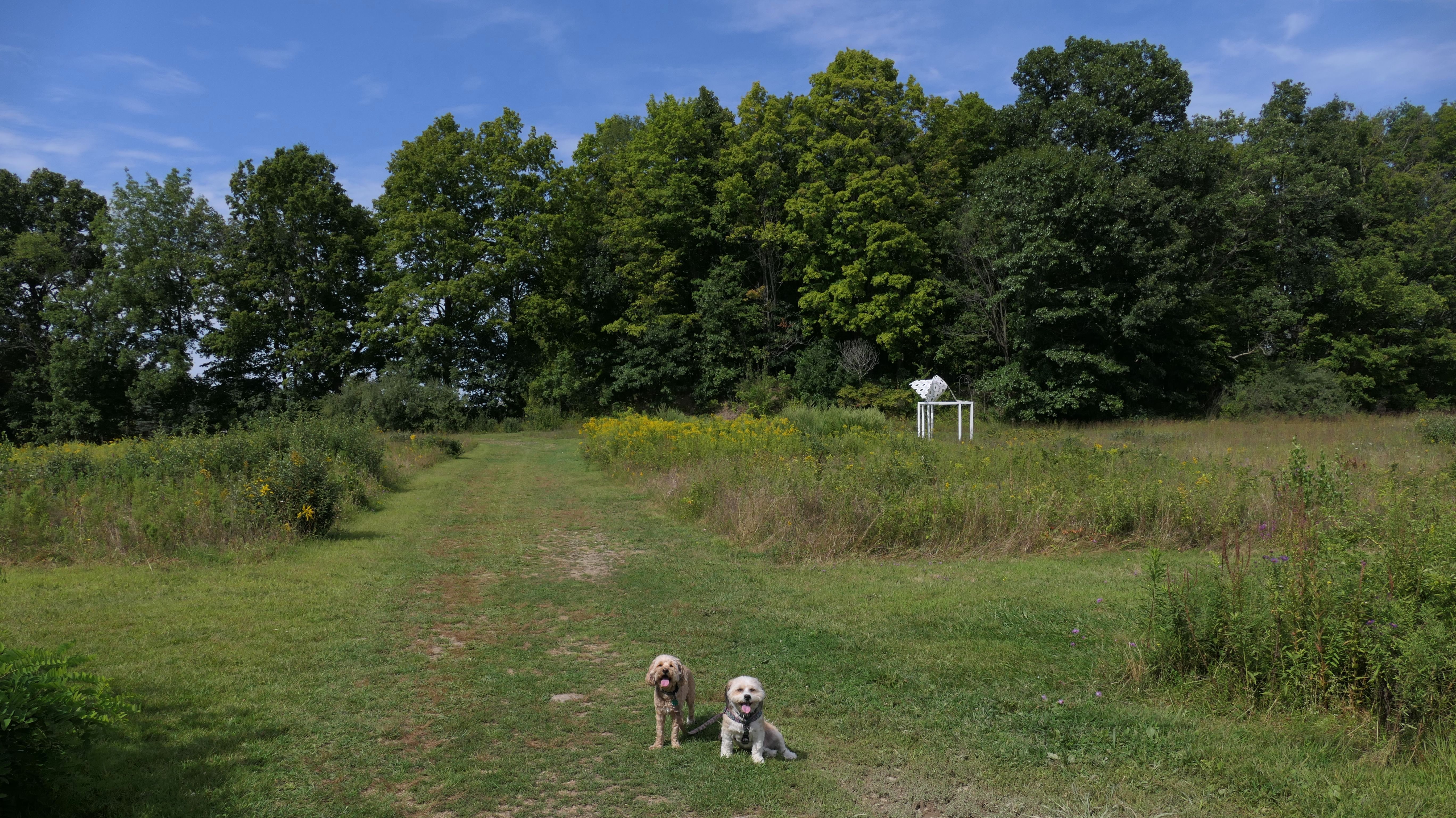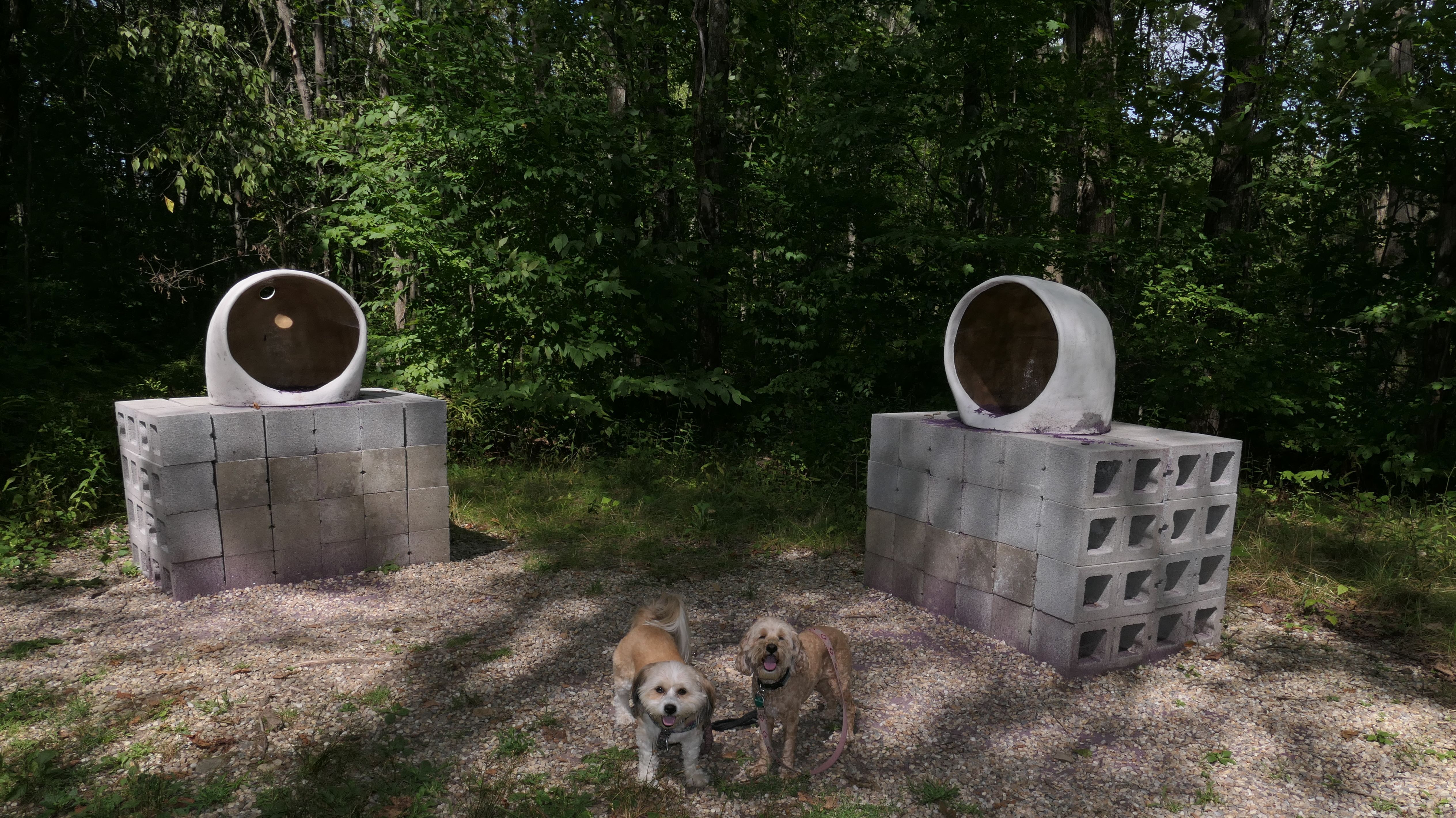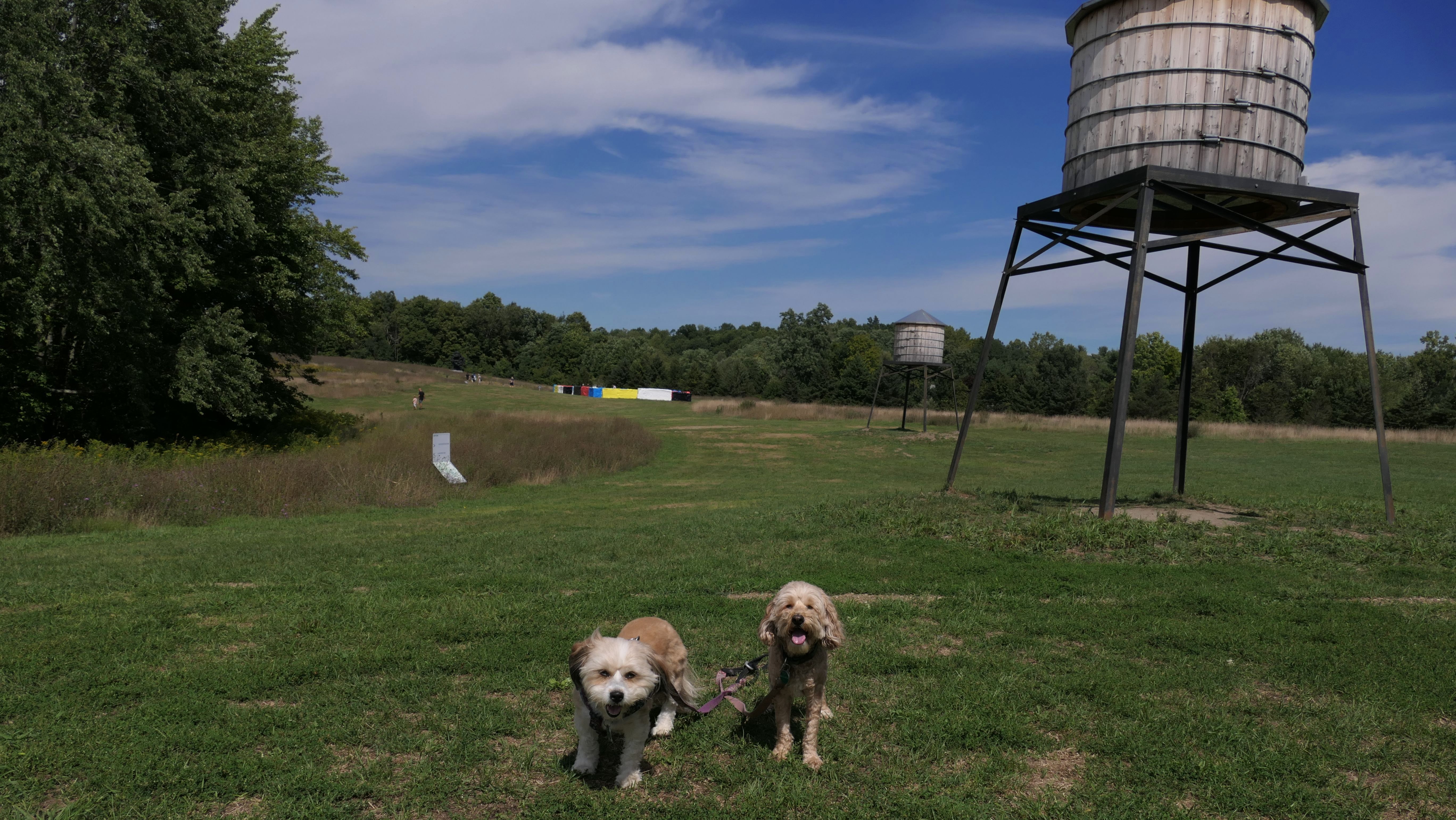 This was a completely different trip than we usually go on, and a lot of fun! This is a trail that runs through an outdoor art gallery. There are 120 acres here, filled with all sorts of "modern art". I've been to sculpture trails before in Putnam, CT and South Kingstown, RI previously, but they pale in comparison to this one! You are encouraged to pre-resgister before visiting, especially on the weekends or holidays, because the place can get busy. Admission is free, but they do suggest a $10 donation. We tried to get to most of the exhibits, but we may have missed a few because the dogs were getting tired. We wound up walking over 3 miles here, with a lot of posing for pictures! My favorite exhibit was the big concrete and marble structure with the pipes that you can look through. I can't believe I got Mandy and Lexi to cooperate and stay while I took pictures of them through the shiny reflective pipe on the other side. There's also a small indoor art gallery here as well with a few exhibits. The best part of the place is that is dog friendly (they must remain leashed of course!) This place is worth checking out if you are looking for something different. You can book your reservation on the Art Omi website, and read more about the originization.