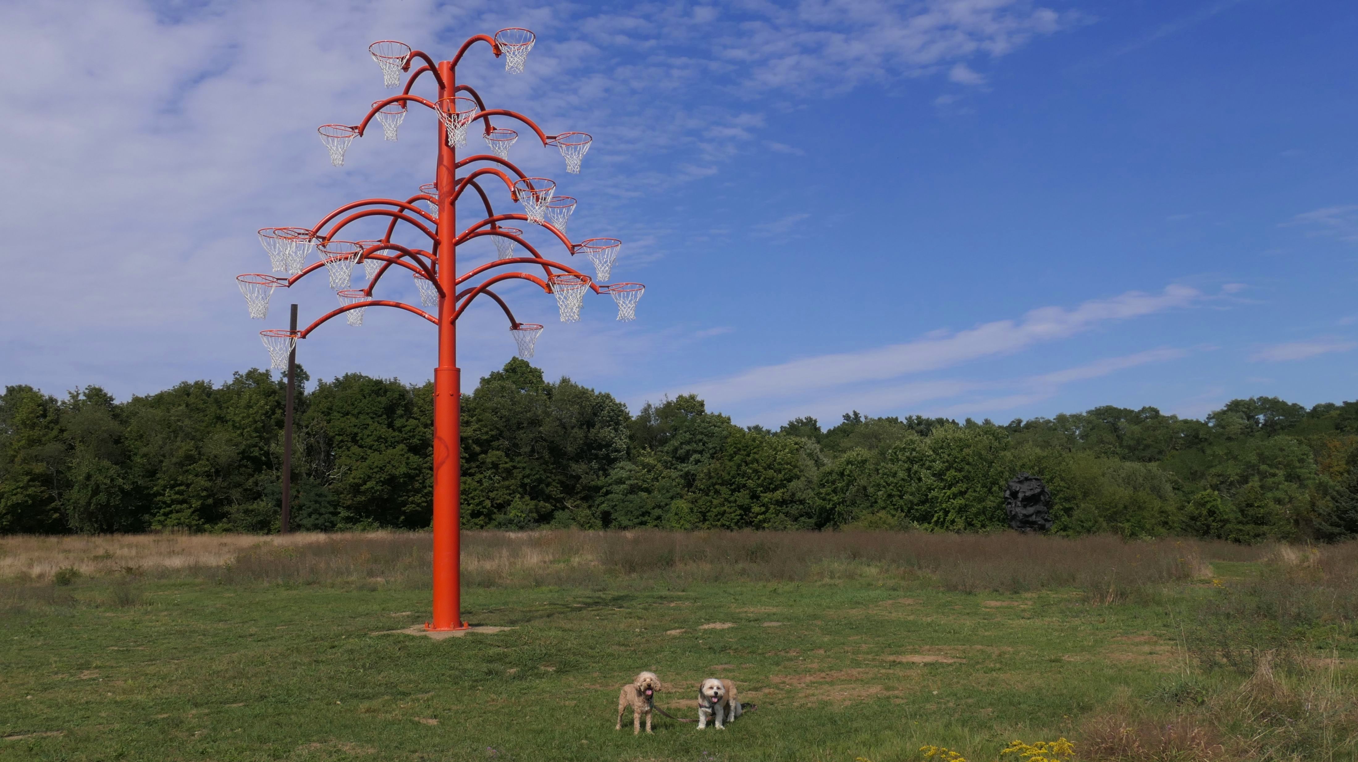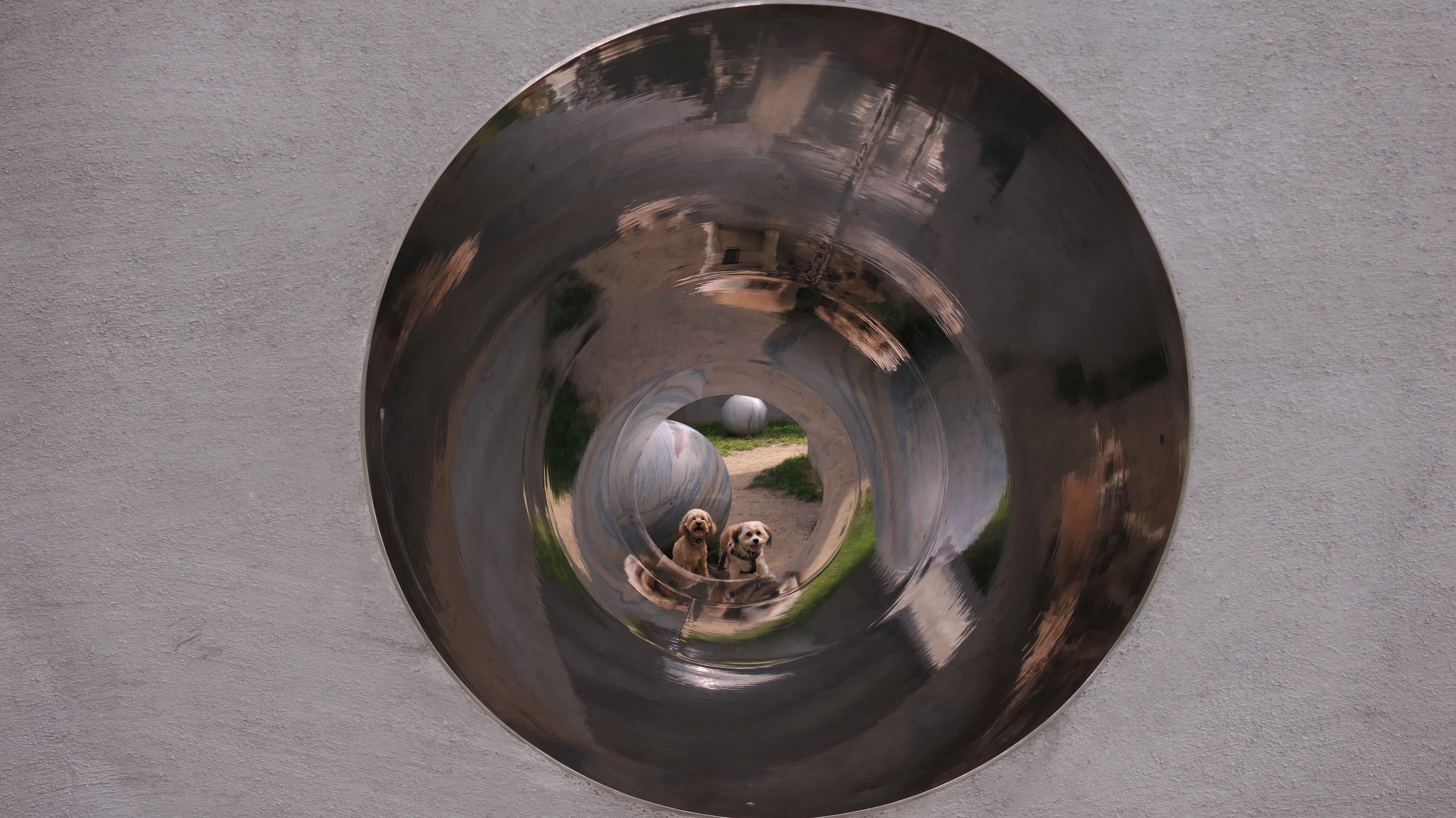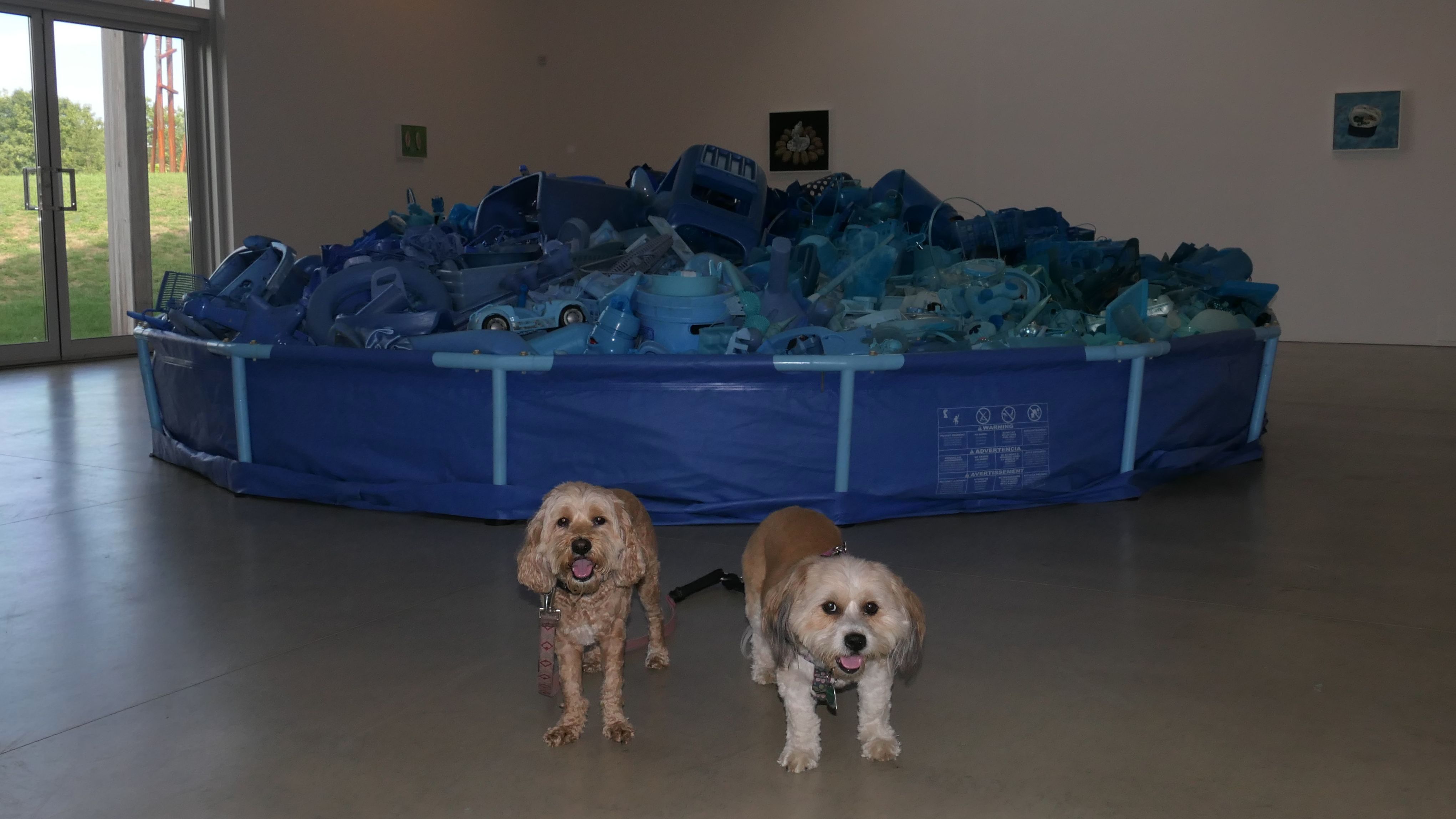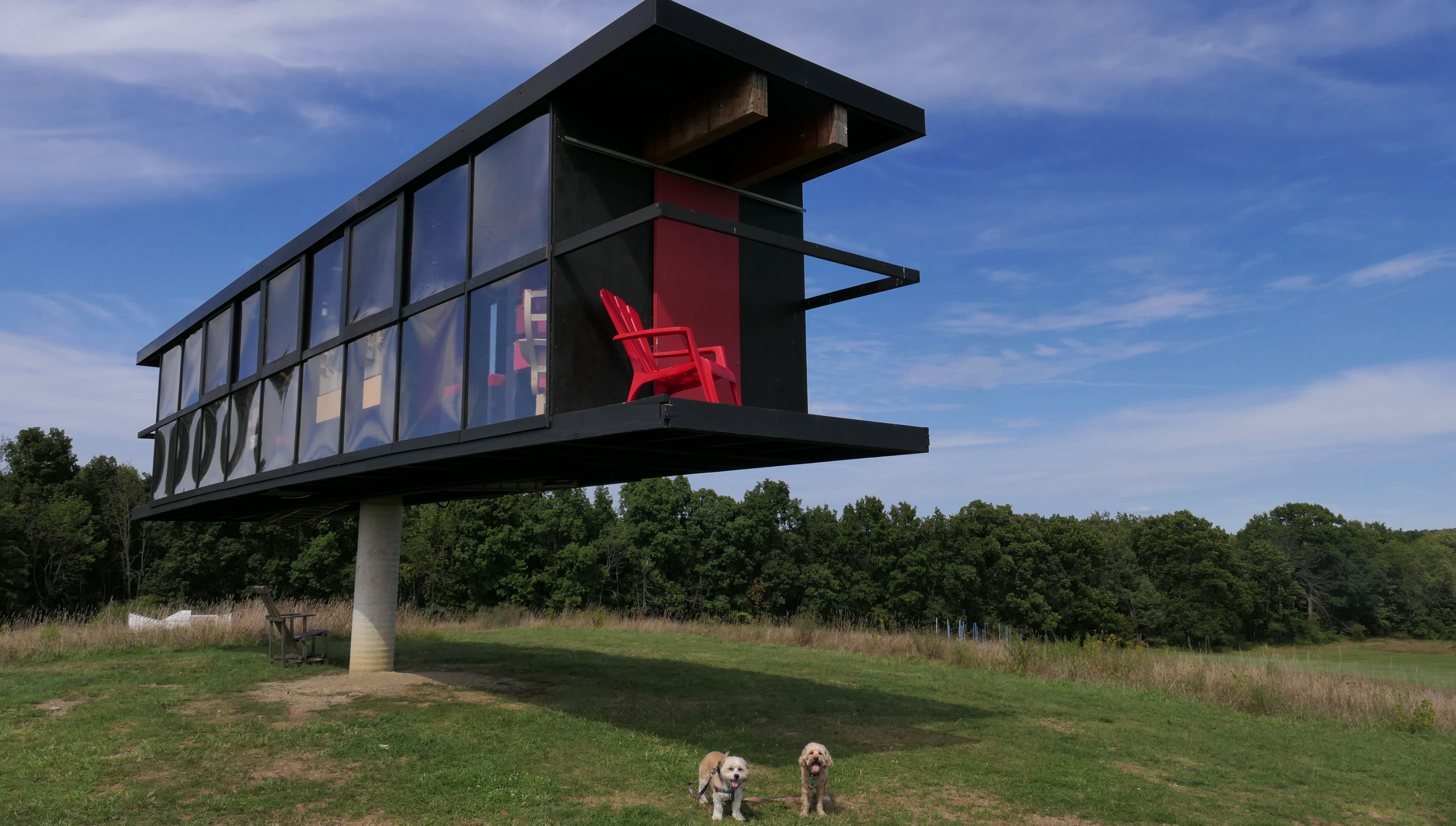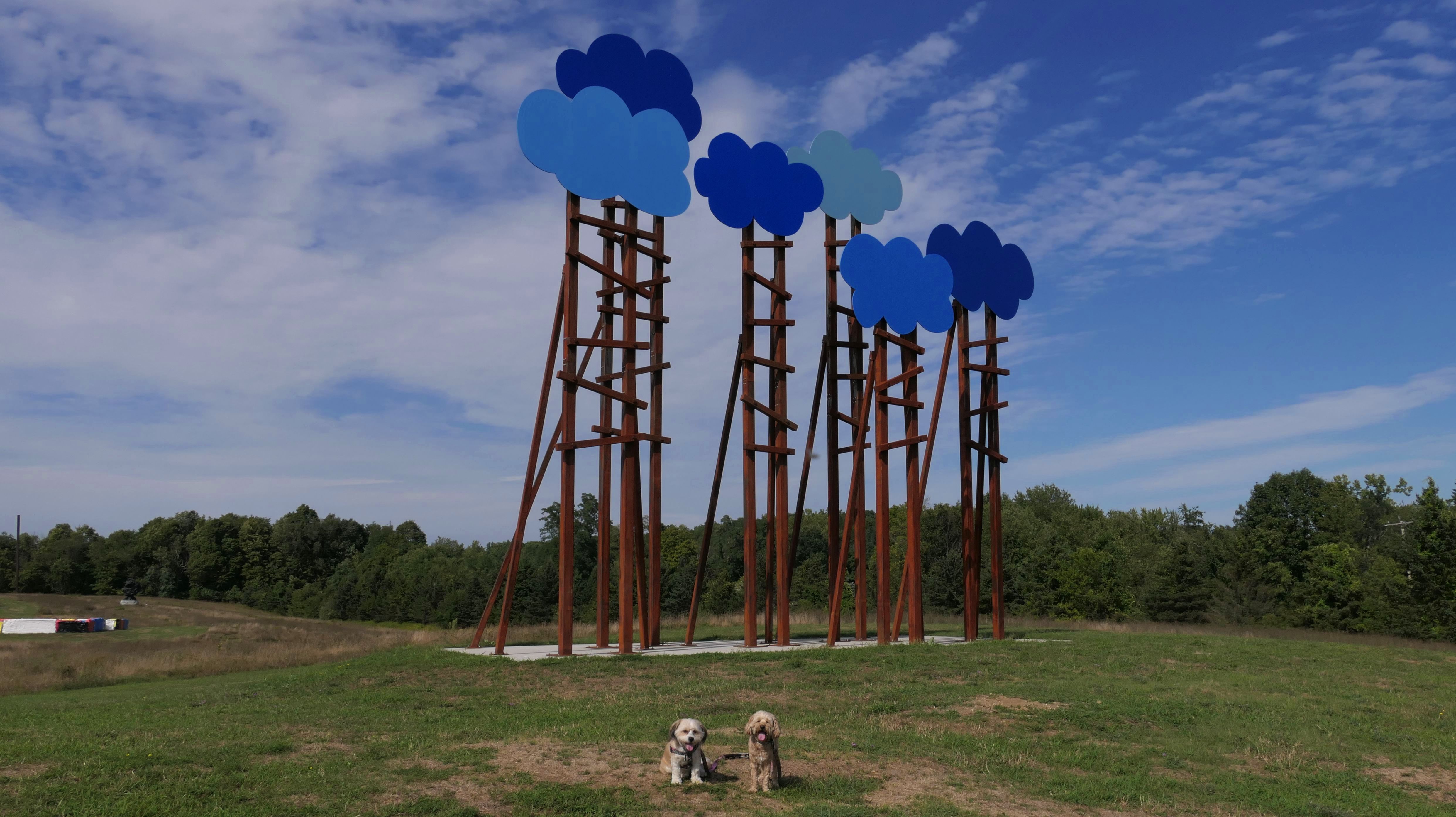This was a completely different trip than we usually go on, and a lot of fun! This is a trail that runs through an outdoor art gallery. There are 120 acres here, filled with all sorts of "modern art". I've been to sculpture trails before in Putnam, CT and South Kingstown, RI previously, but they pale in comparison to this one! You are encouraged to pre-resgister before visiting, especially on the weekends or holidays, because the place can get busy. Admission is free, but they do suggest a $10 donation. We tried to get to most of the exhibits, but we may have missed a few because the dogs were getting tired. We wound up walking over 3 miles here, with a lot of posing for pictures! My favorite exhibit was the big concrete and marble structure with the pipes that you can look through. I can't believe I got Mandy and Lexi to cooperate and stay while I took pictures of them through the shiny reflective pipe on the other side. There's also a small indoor art gallery here as well with a few exhibits. The best part of the place is that is dog friendly (they must remain leashed of course!) This place is worth checking out if you are looking for something different. You can book your reservation on the Art Omi website, and read more about the originization.