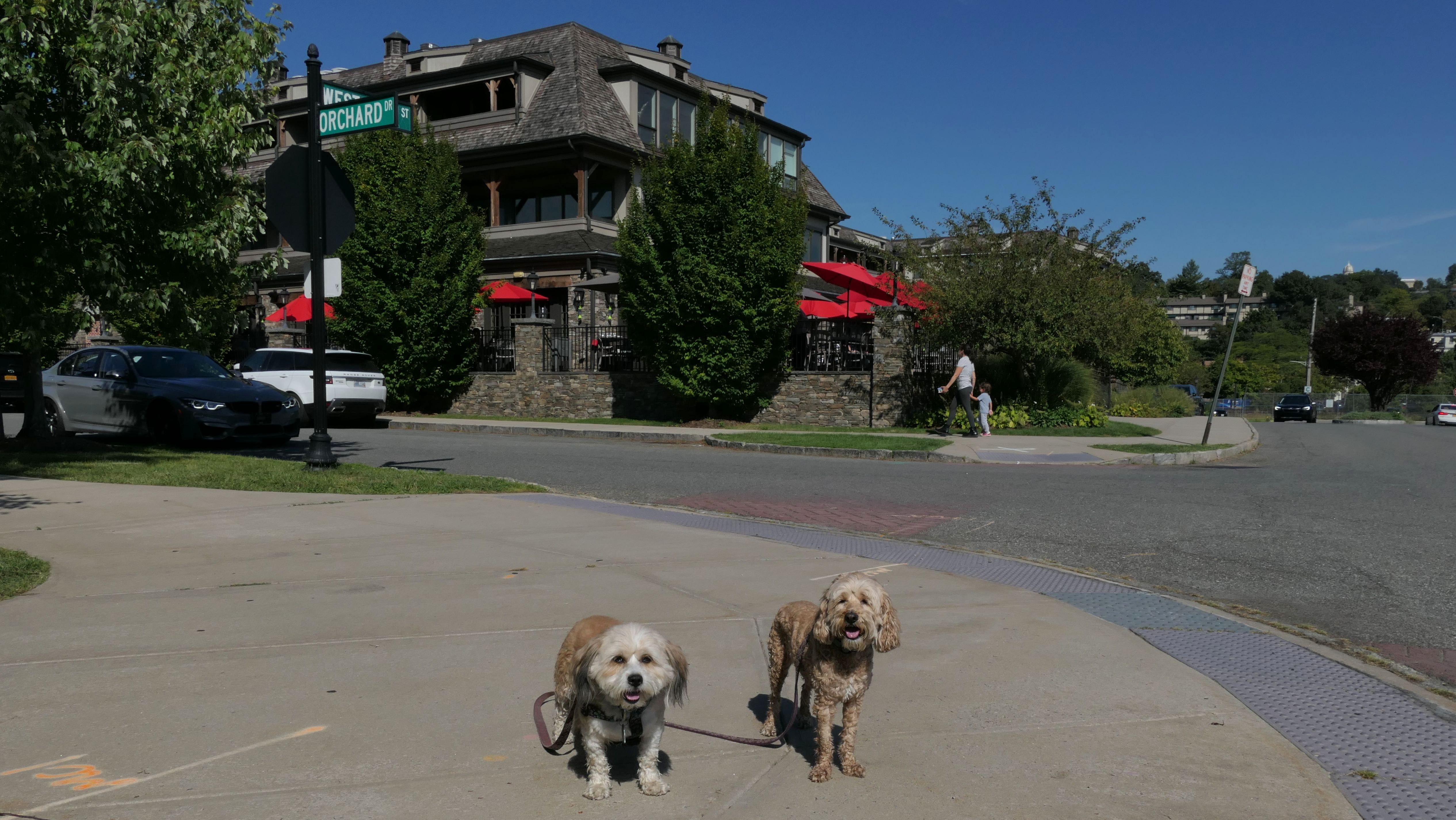 We were headed to a place near here, called "Scenic Hudson Park". Unfortunately, when we arrived at that park, there were signs indicating that dogs weren't allowed. The Google AI search results were completely incorrect. At any rate, this park was nearby, and we were planning on visiting this one anyway. It's a small, dog friendly, but nice park, with great views of the Mario Cumomo bridge. Looking to the south, you can also see the New York City skyline in the hazy distance. The only issue is that it is on the small side. After looping the park, we headed to Downtown Irvington next.