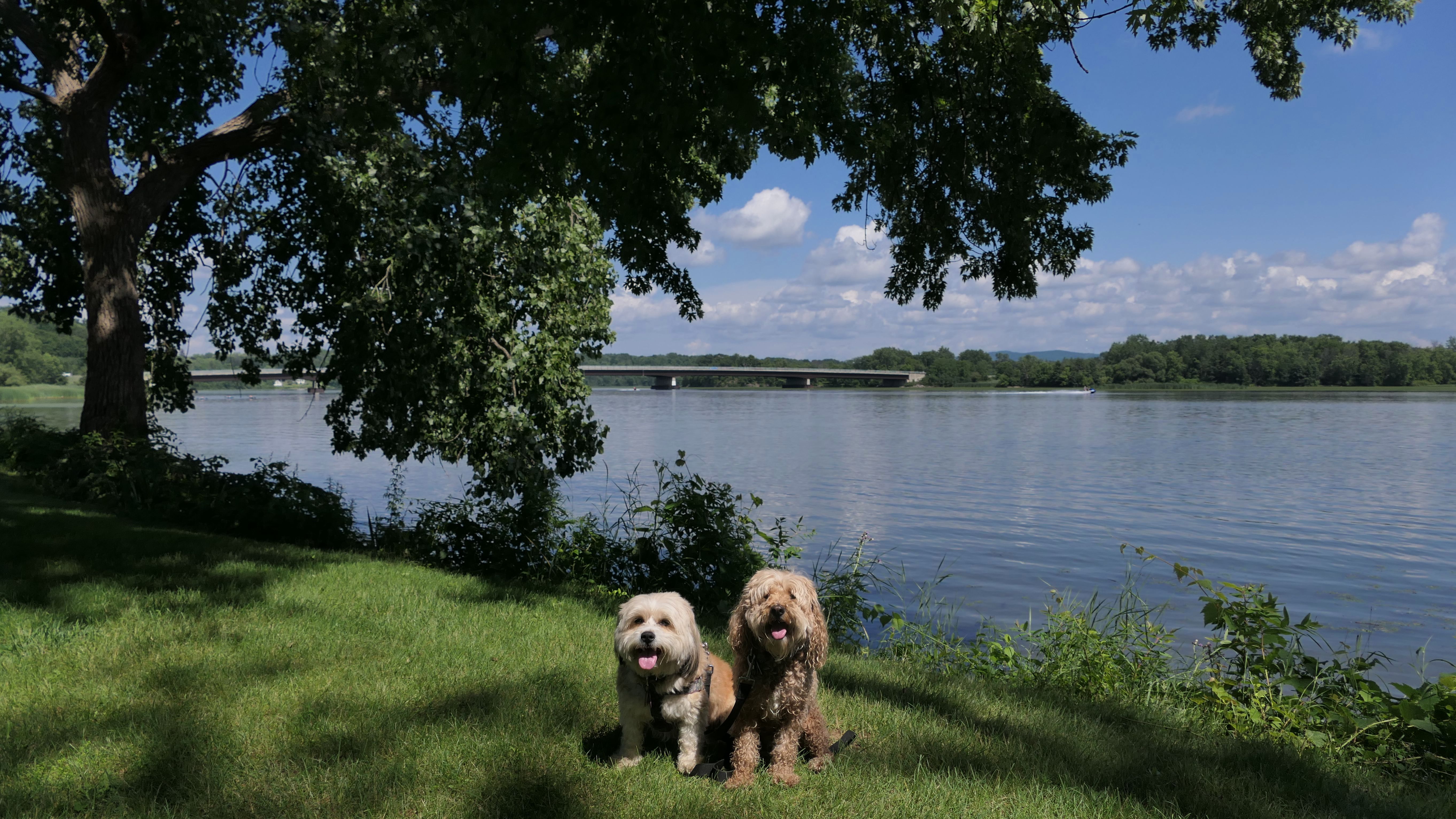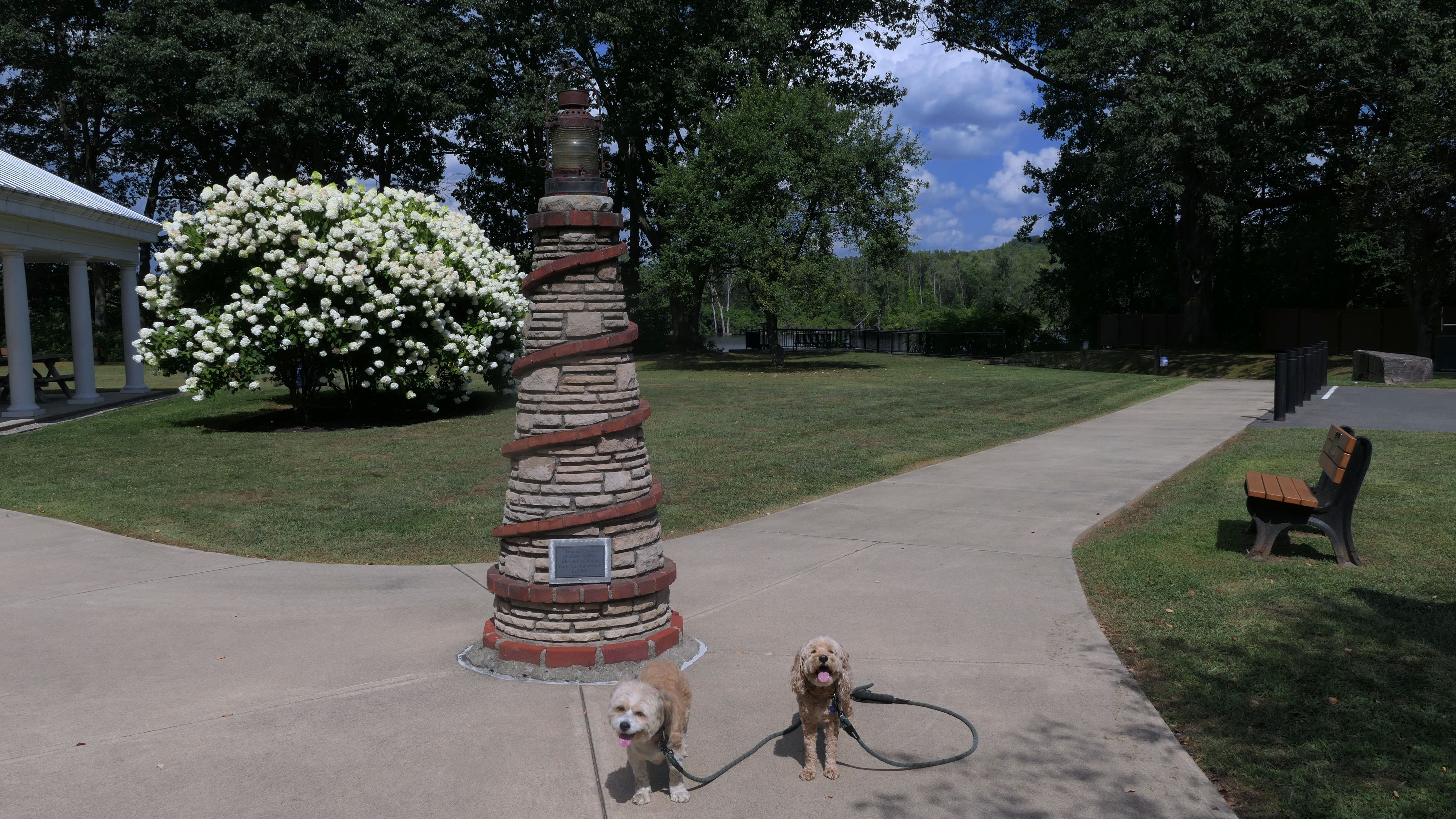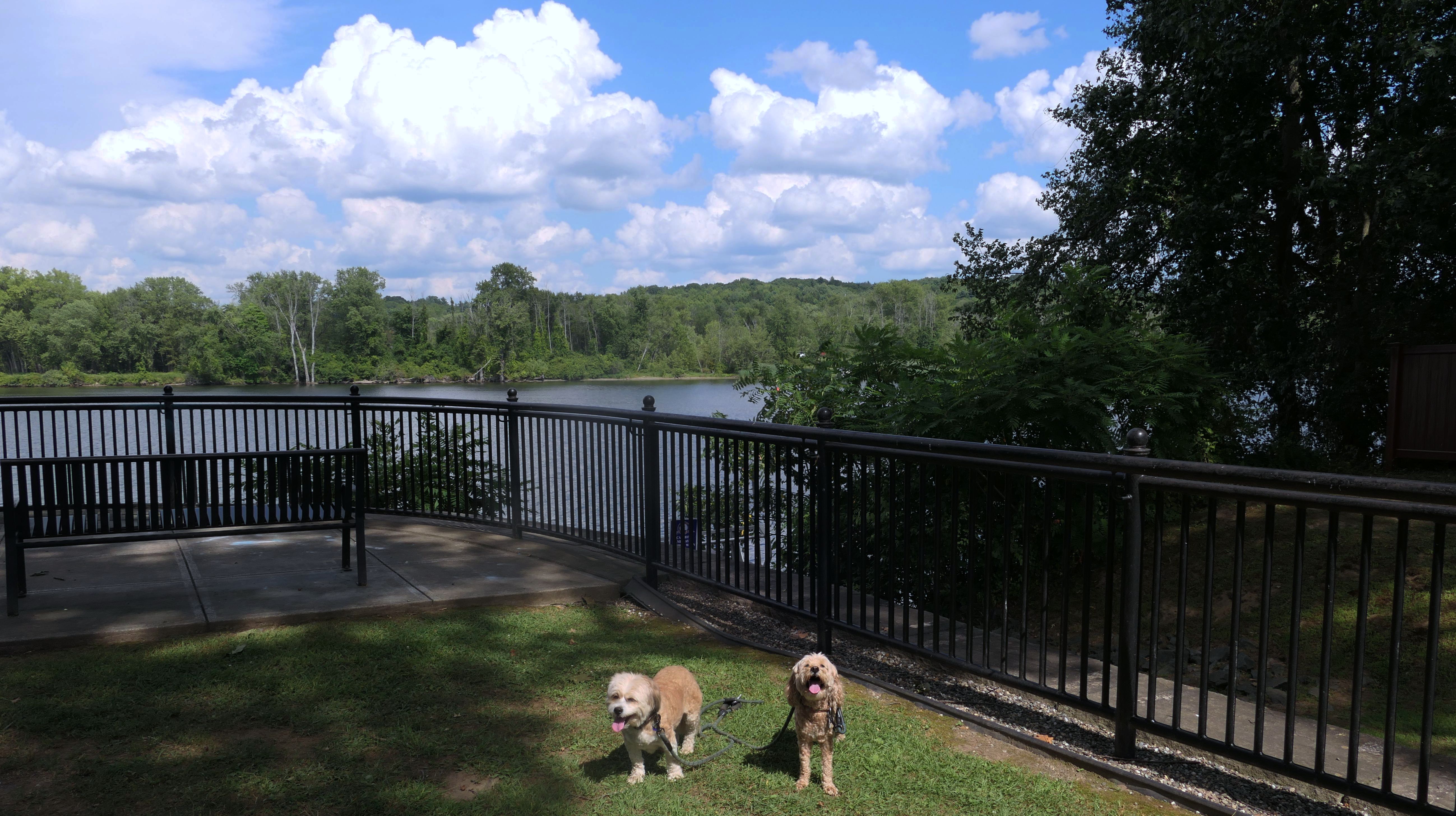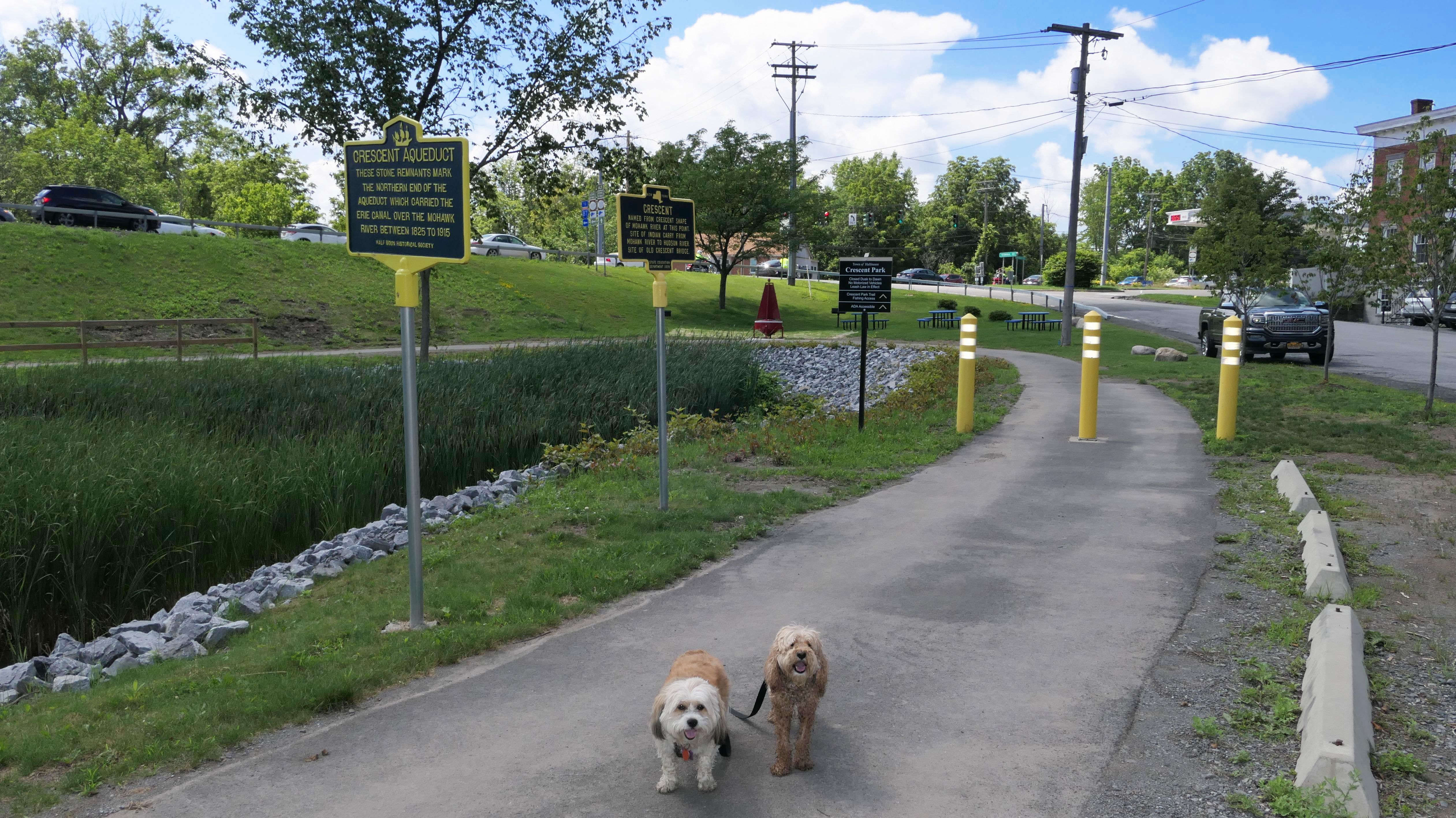 It was awful weather in Connecticut, so we came up here for the 4th of July. We had to drive through torrential downpours and thunderstorms to get here, but when we arrived in the area here, the sun was out! This is a nice park on the shores of the Mohawk River. There's a paved bike trail here called the Crescent Trail that we intended on walking. Unfortunately, the down side to sun is the heat! The trail lacks shade, and it was too hot for the dogs, so we only walked about a half mile before we turned around and headed back. We wound up finding a shadier trail a few miles away.