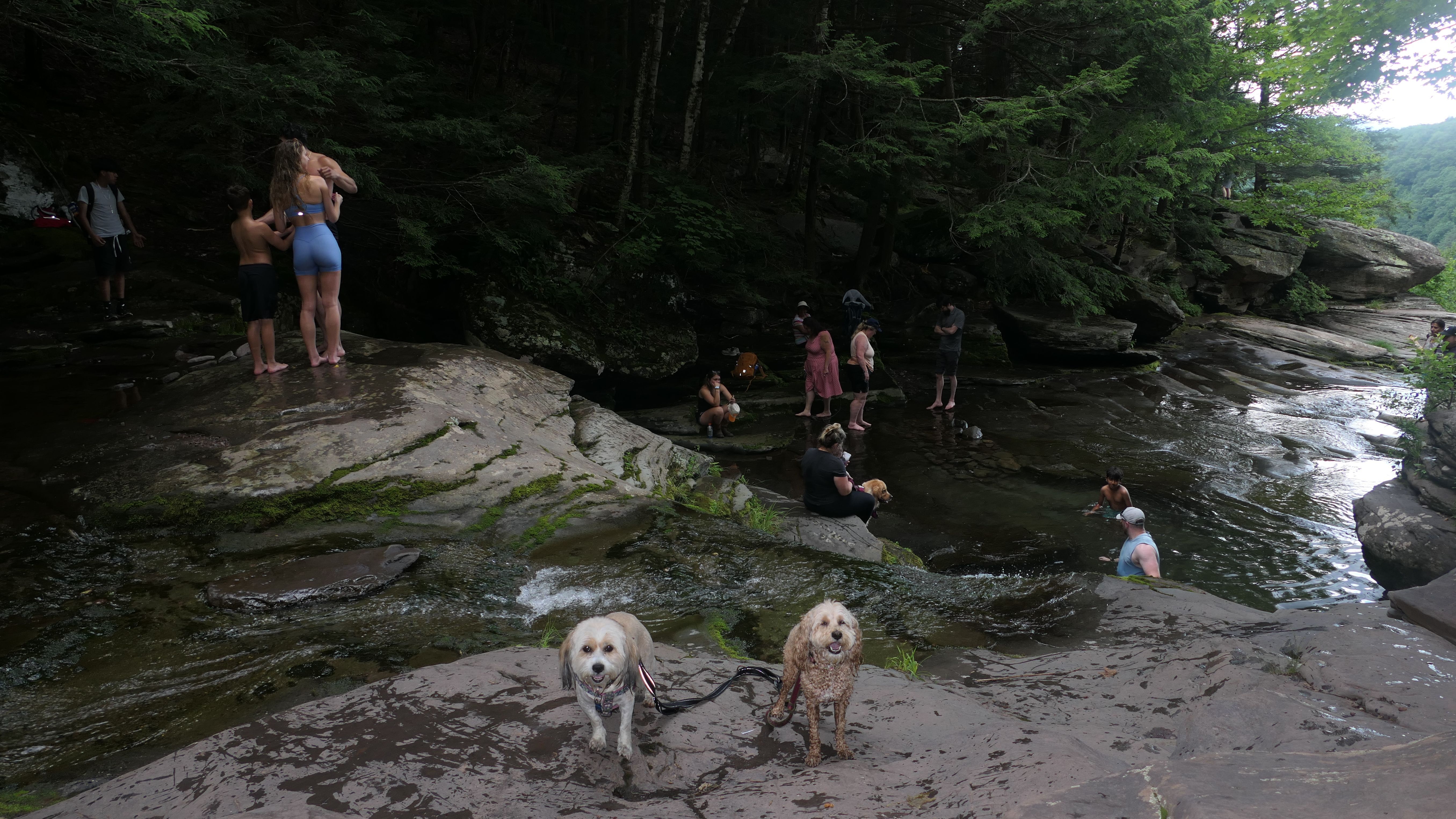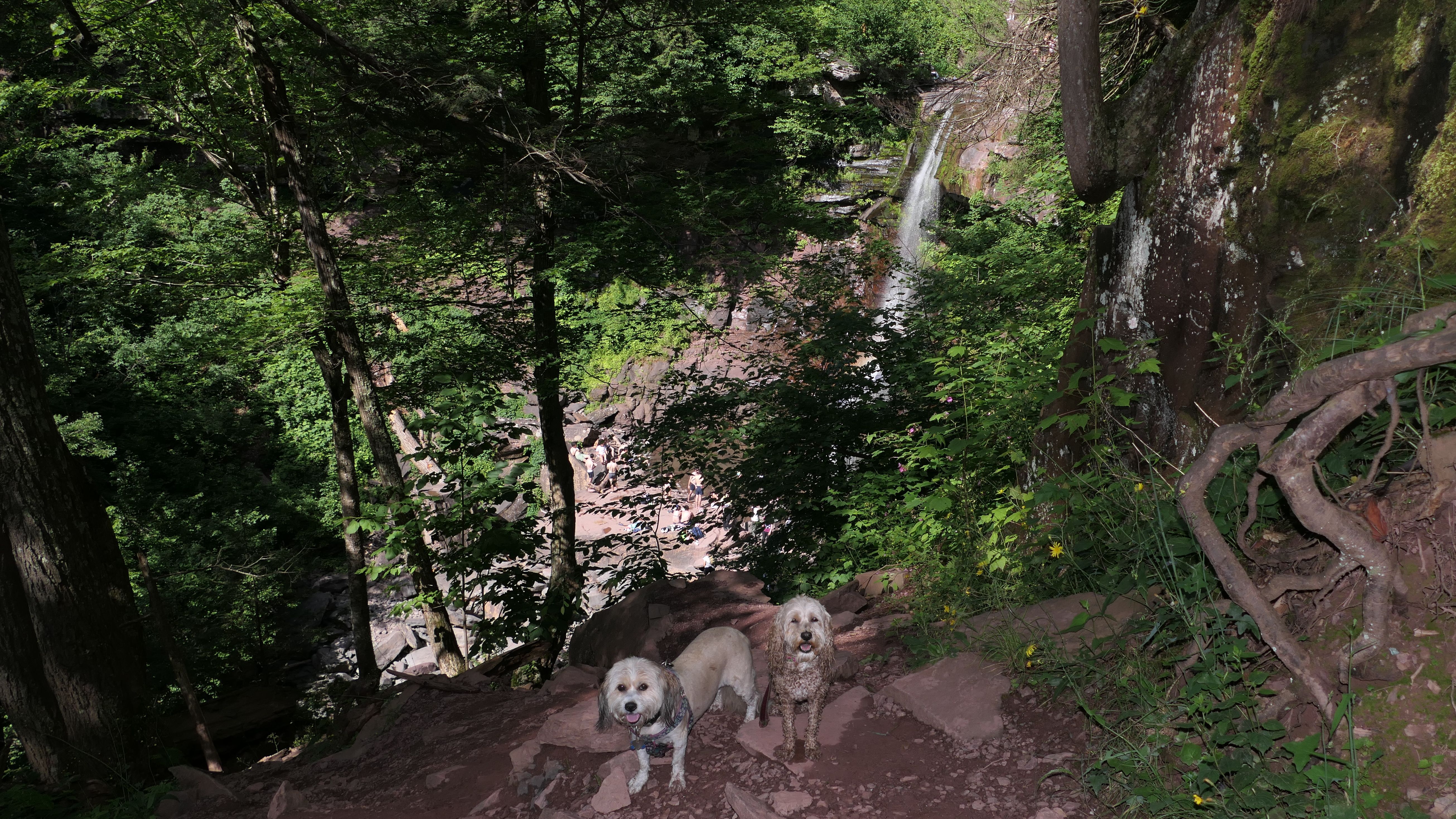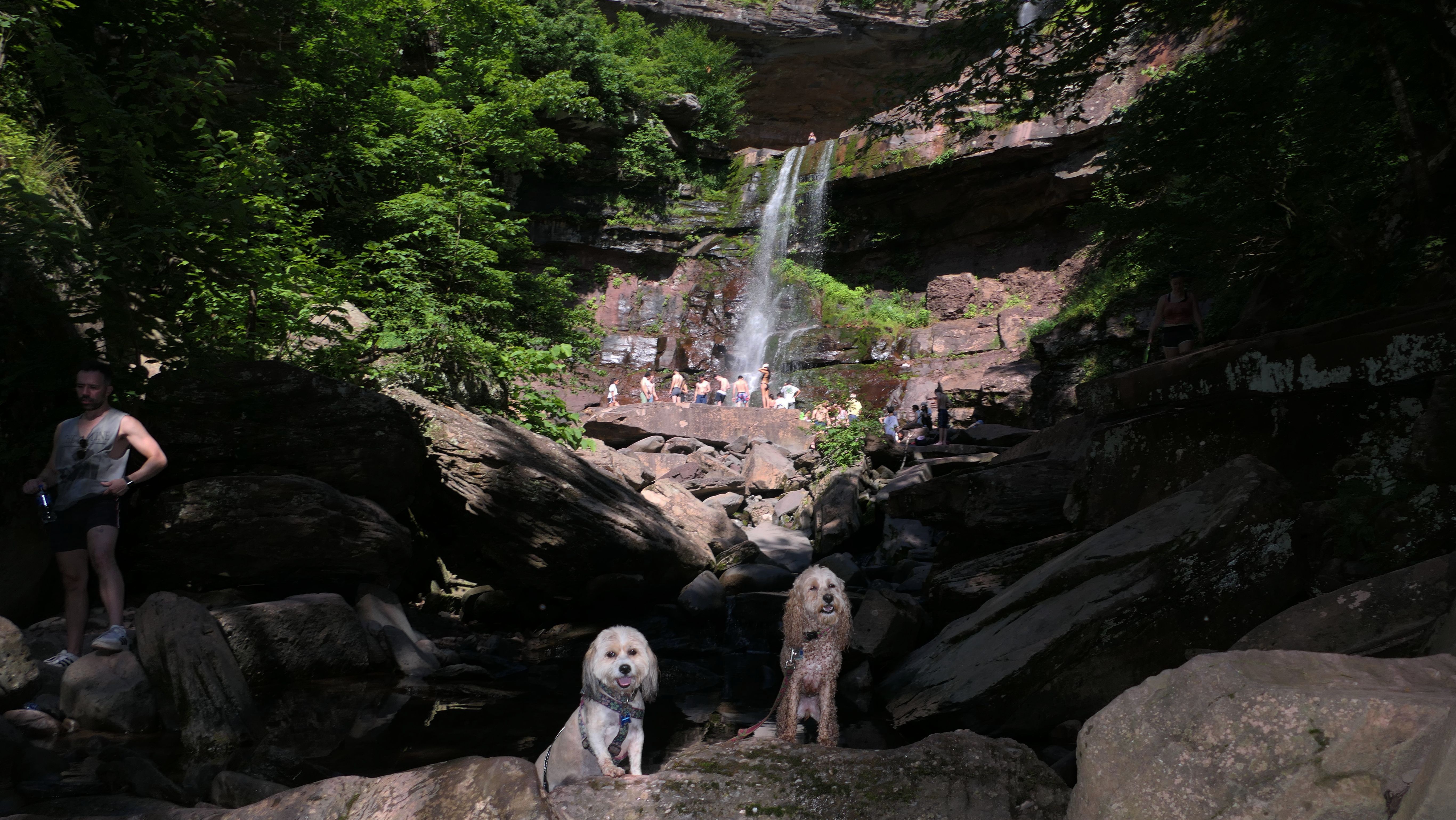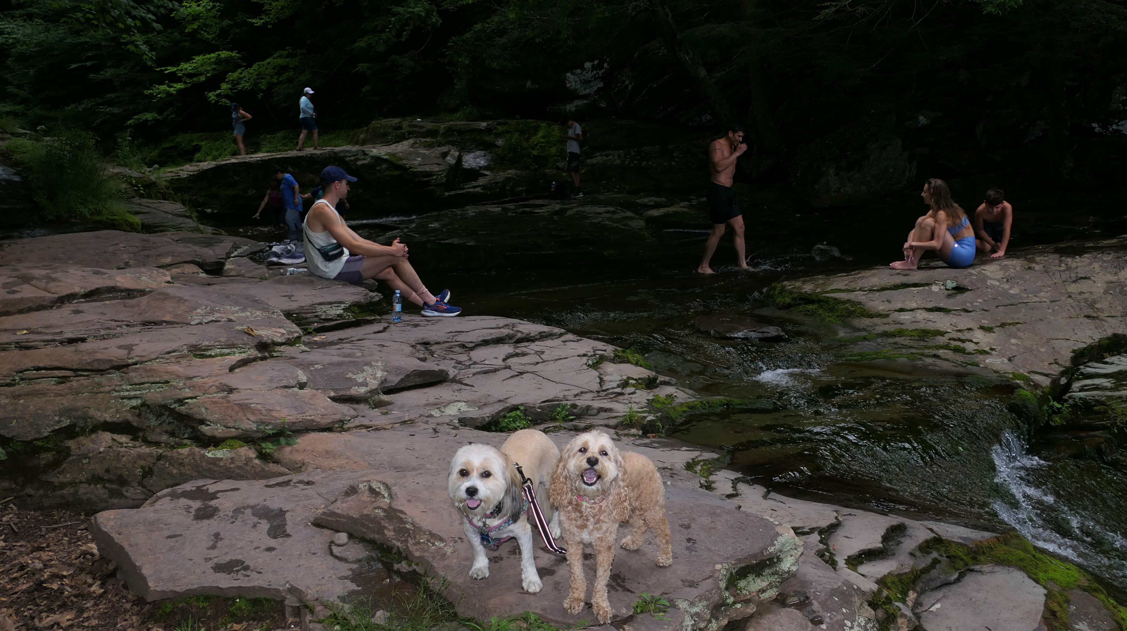 This place was packed. We were the last car they let enter the parking area. The adventure consisted of a hike to a viewing platform near the top of the waterfall, and then actually going to the top of the falls. This was a great spot that Mandy and Lexi went into the water and cooled off right away on a very warm and muggy day. After that, we hiked down a trail featuring a very long stone staircase to the bottom of the falls. We took some photos from the bottom. The waterfall is big, and it wasn't possible to take a photo of the dogs in front of the whole thing. It was hard to take photos in general, because the place was crowded, the terrain was narrow and rocky, and the sun would come and go changing the lighting. (Here is a picture of the waterfall without the dogs). The waterfall had multiple levels and people were swimming in the pools at every level. We didn't actually go to the middle level. The route there looked pretty rugged. We climbed back up the stairs after exploring the bottom for a bit. My Apple Watch reported that we climbed 580 feet, which is a new record for us. Needless to say, we were tired after the climb! This was a good workout, but I wish we did this trip on a cooler day, maybe in the middle of the week, instead of a holiday weekend, when there would be less people.