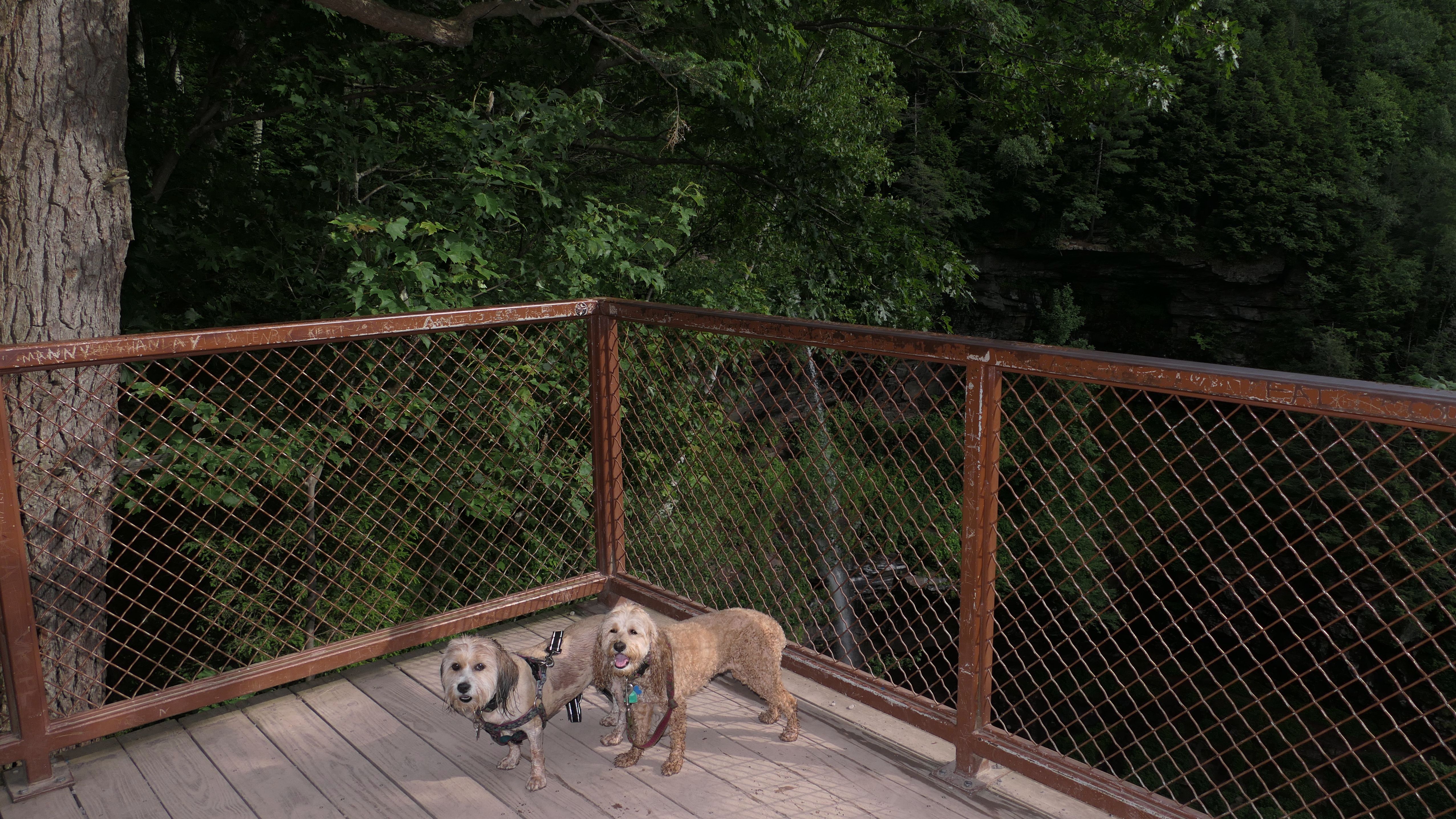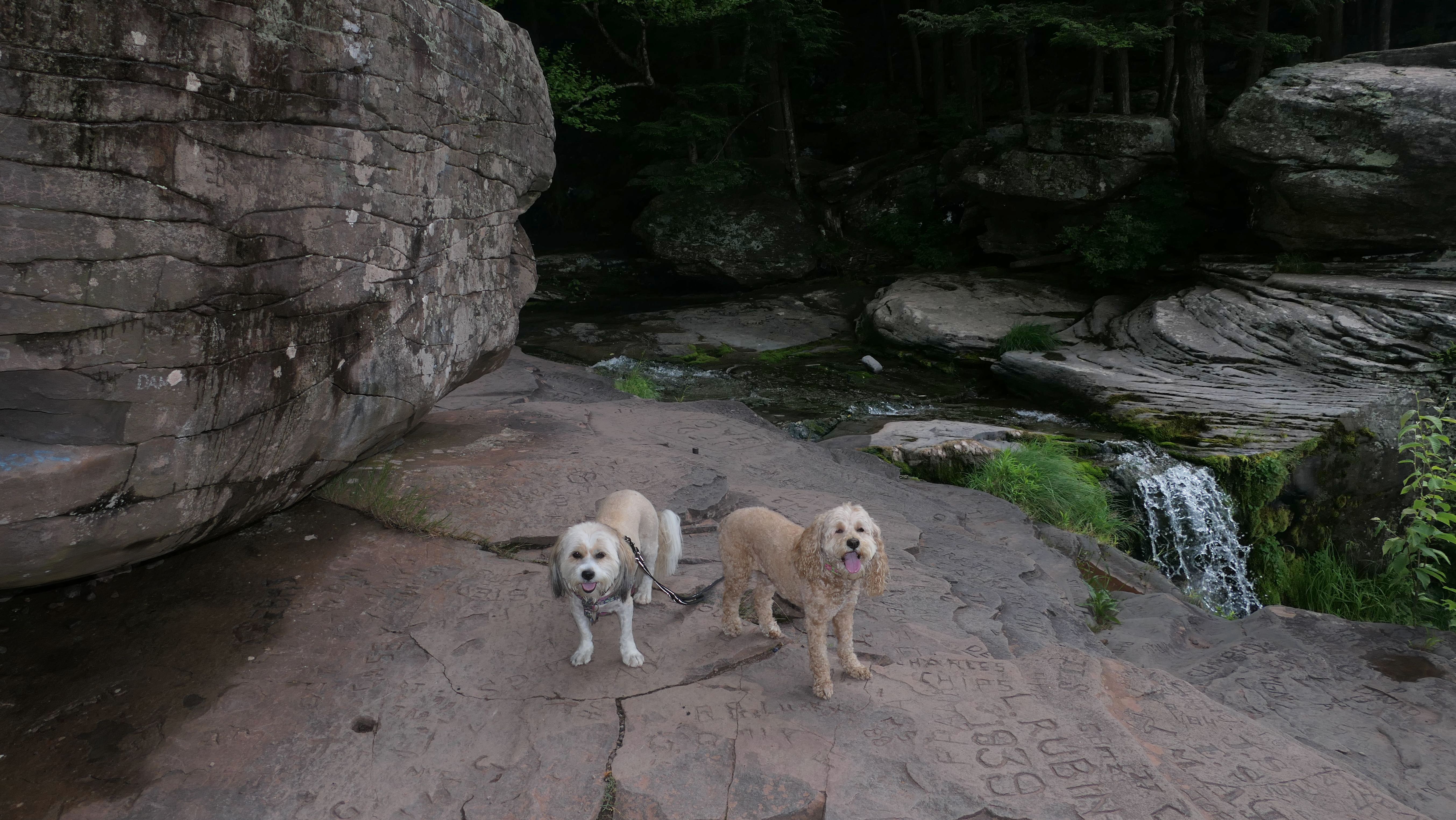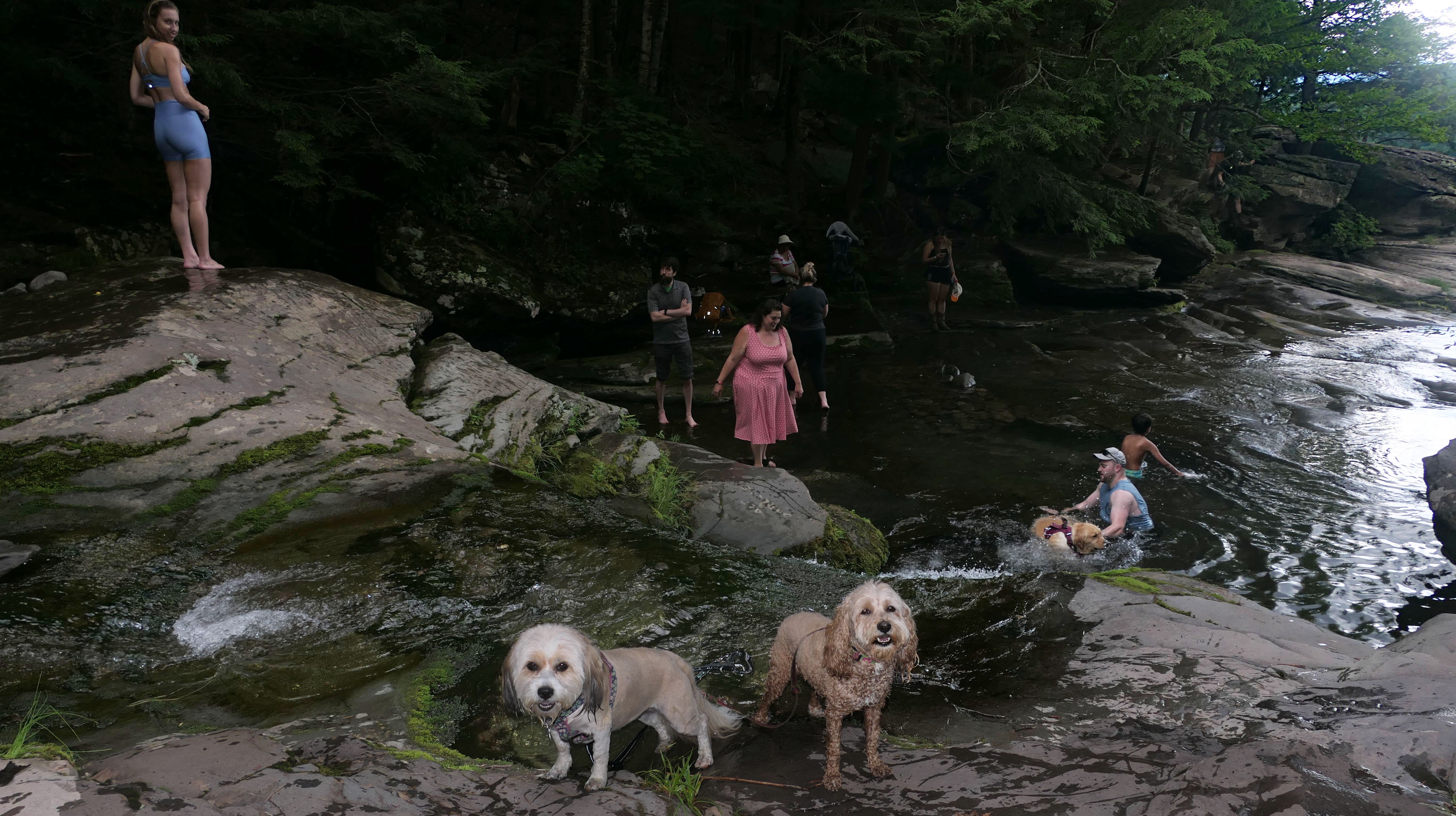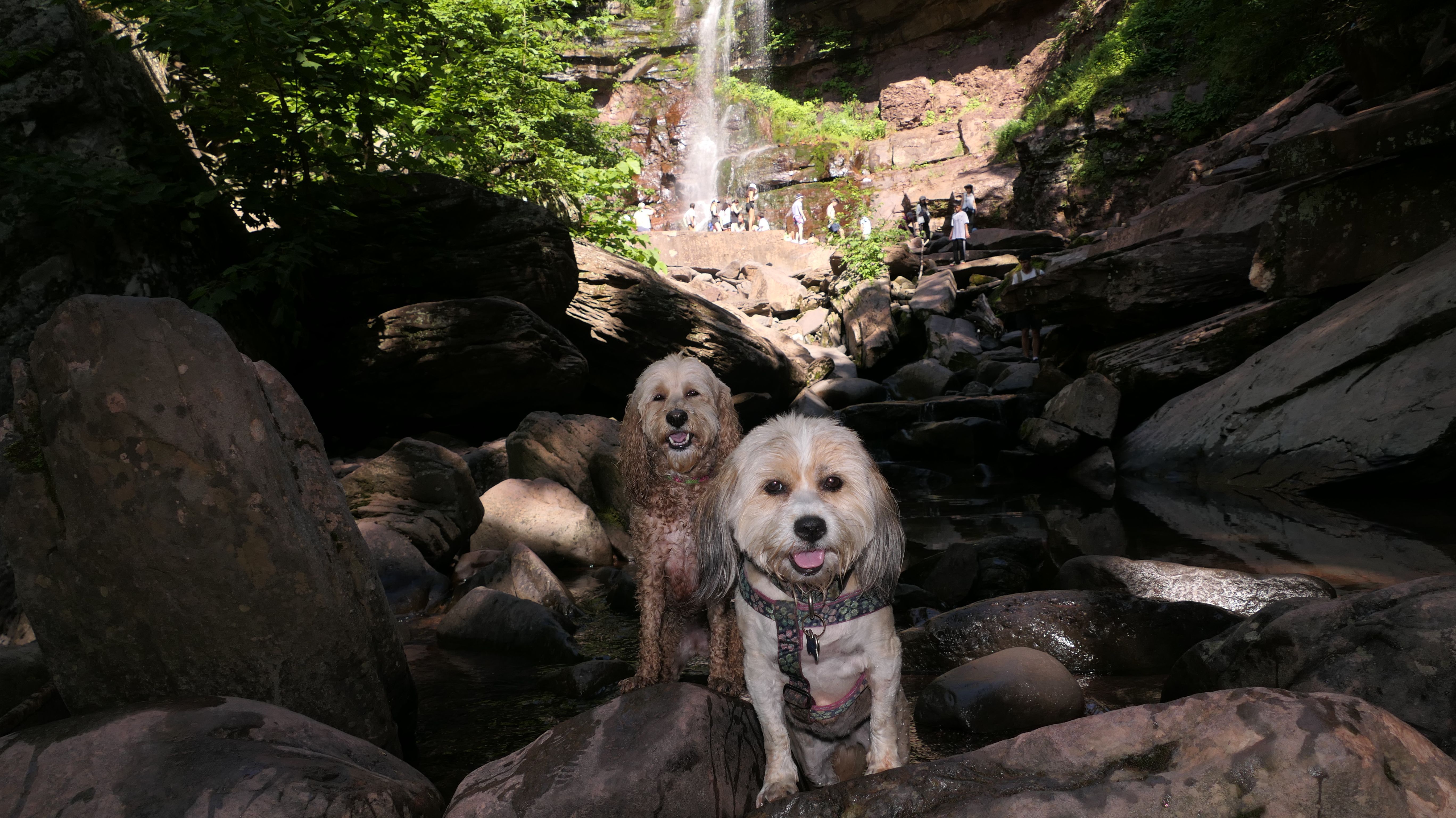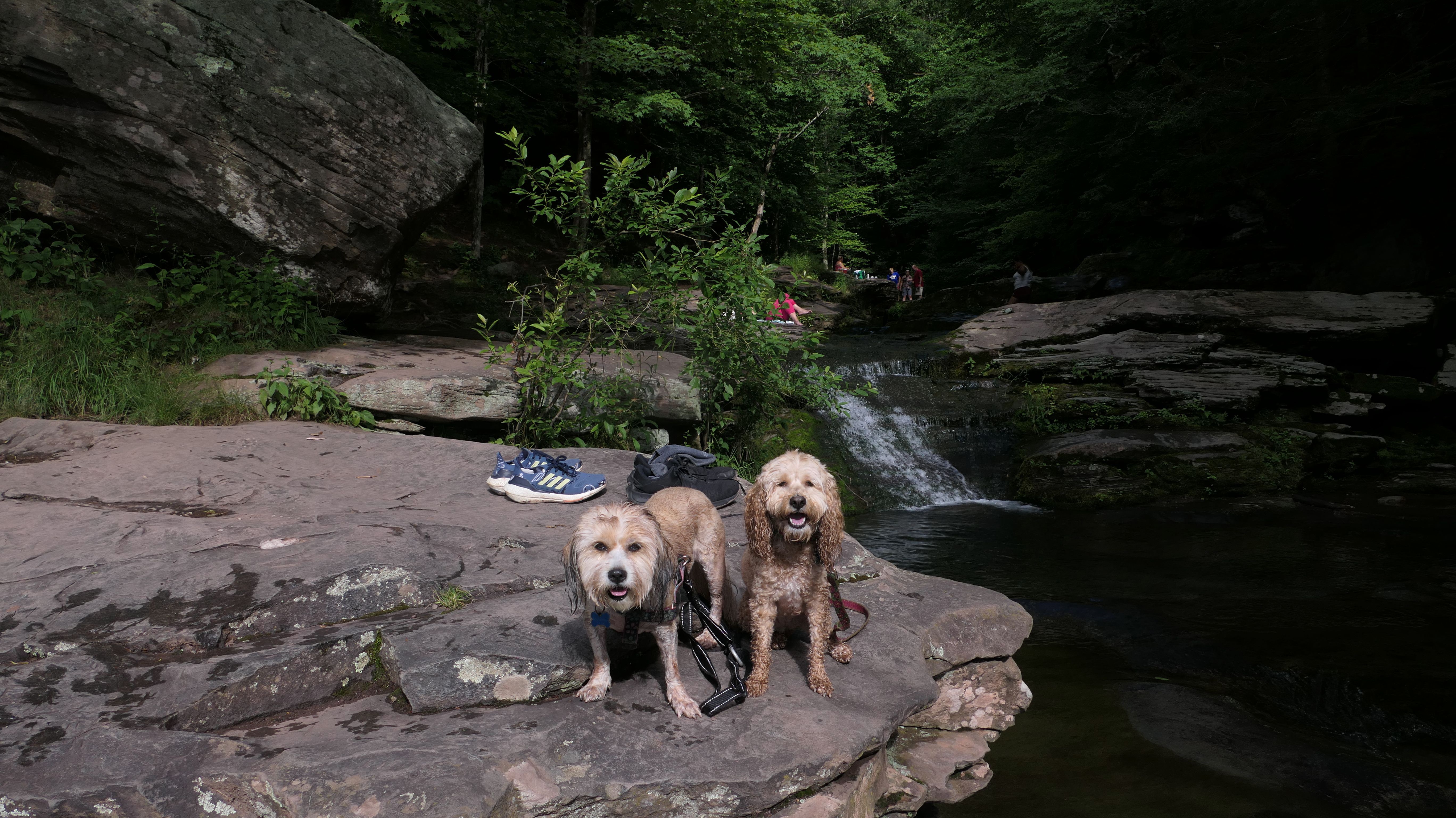 This place was packed. We were the last car they let enter the parking area. The adventure consisted of a hike to a viewing platform near the top of the waterfall, and then actually going to the top of the falls. This was a great spot that Mandy and Lexi went into the water and cooled off right away on a very warm and muggy day. After that, we hiked down a trail featuring a very long stone staircase to the bottom of the falls. We took some photos from the bottom. The waterfall is big, and it wasn't possible to take a photo of the dogs in front of the whole thing. It was hard to take photos in general, because the place was crowded, the terrain was narrow and rocky, and the sun would come and go changing the lighting. (Here is a picture of the waterfall without the dogs). The waterfall had multiple levels and people were swimming in the pools at every level. We didn't actually go to the middle level. The route there looked pretty rugged. We climbed back up the stairs after exploring the bottom for a bit. My Apple Watch reported that we climbed 580 feet, which is a new record for us. Needless to say, we were tired after the climb! This was a good workout, but I wish we did this trip on a cooler day, maybe in the middle of the week, instead of a holiday weekend, when there would be less people.