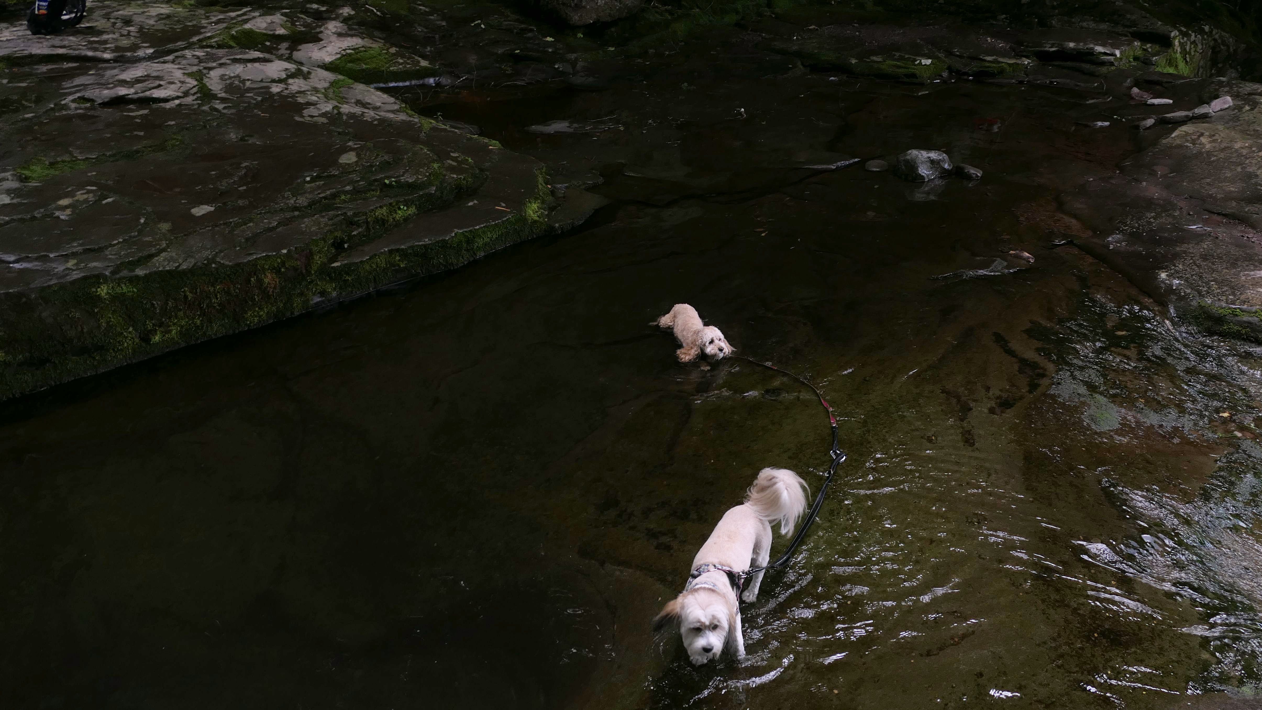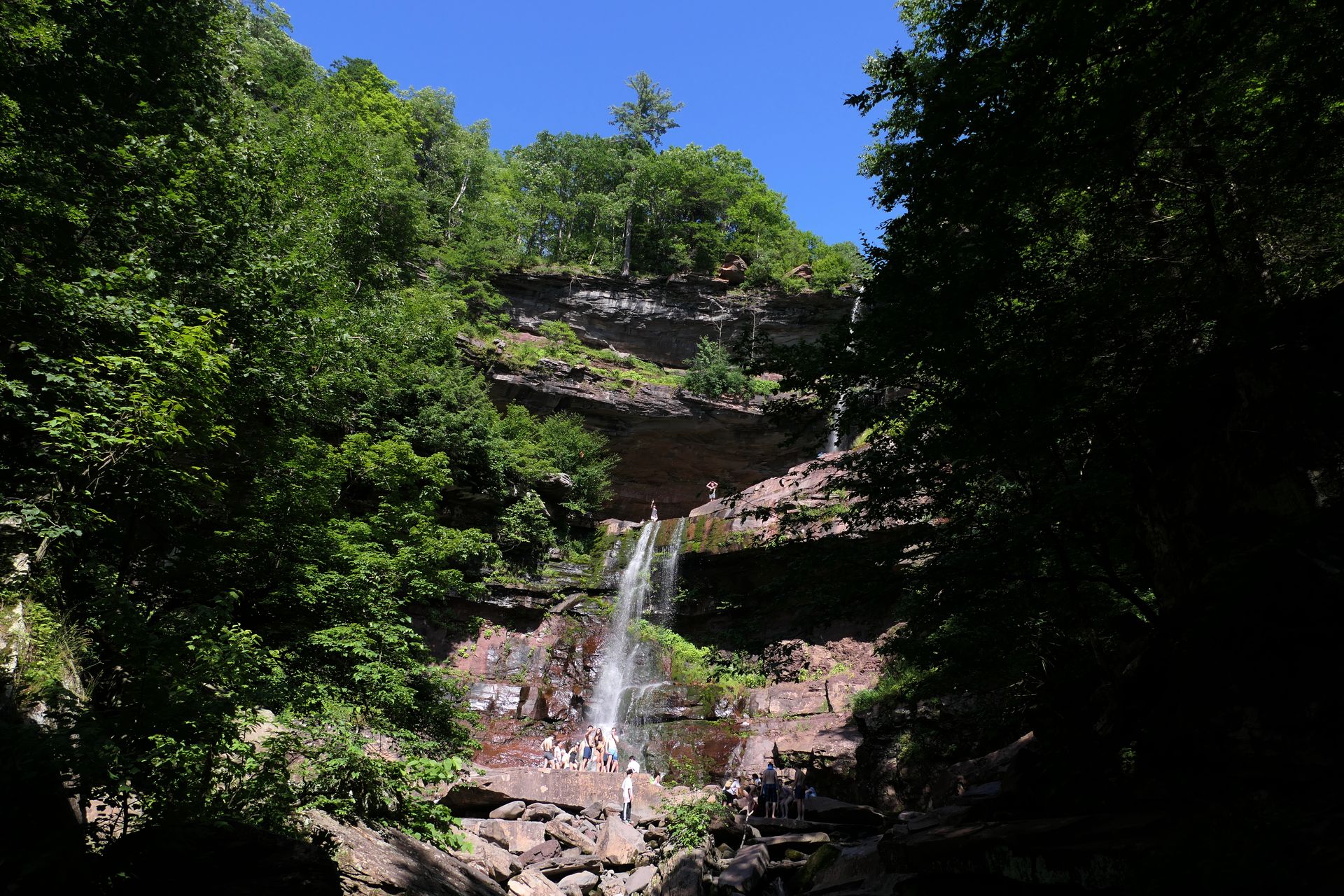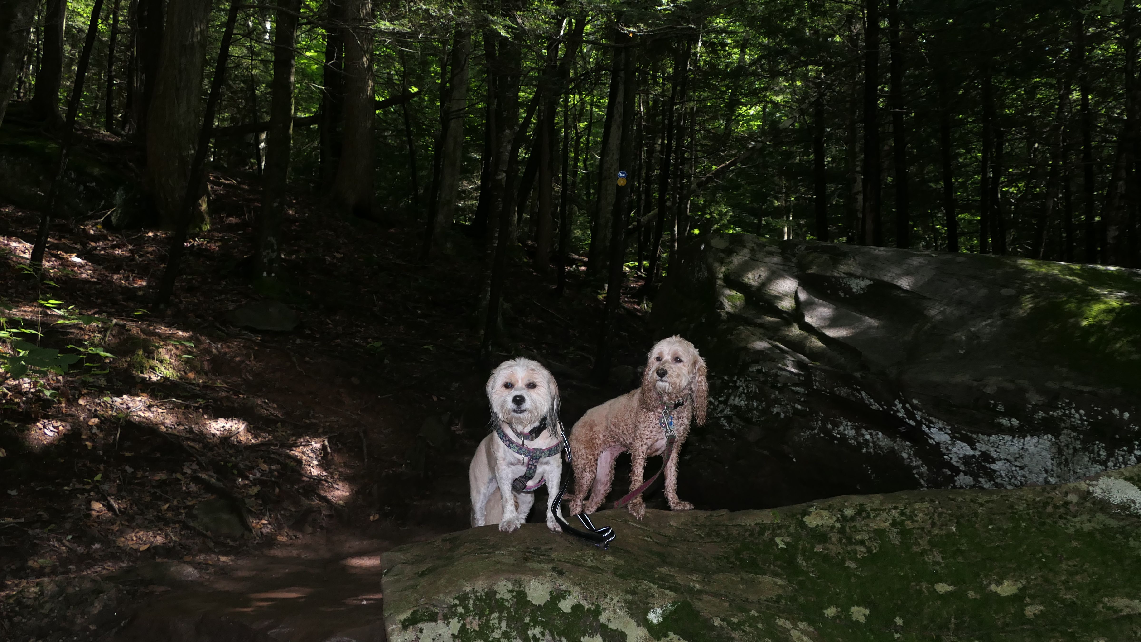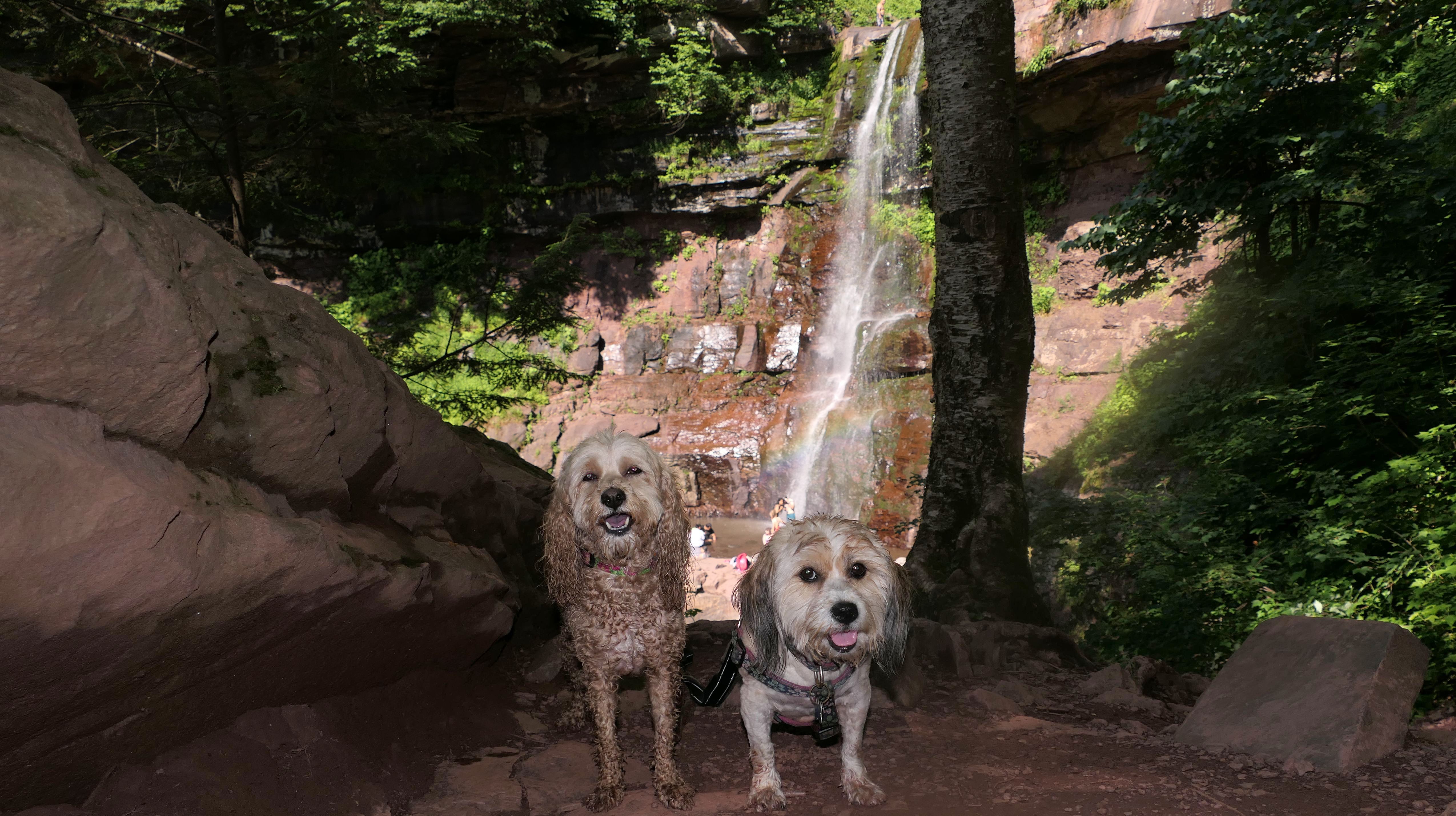 This place was packed. We were the last car they let enter the parking area. The adventure consisted of a hike to a viewing platform near the top of the waterfall, and then actually going to the top of the falls. This was a great spot that Mandy and Lexi went into the water and cooled off right away on a very warm and muggy day. After that, we hiked down a trail featuring a very long stone staircase to the bottom of the falls. We took some photos from the bottom. The waterfall is big, and it wasn't possible to take a photo of the dogs in front of the whole thing. It was hard to take photos in general, because the place was crowded, the terrain was narrow and rocky, and the sun would come and go changing the lighting. (Here is a picture of the waterfall without the dogs). The waterfall had multiple levels and people were swimming in the pools at every level. We didn't actually go to the middle level. The route there looked pretty rugged. We climbed back up the stairs after exploring the bottom for a bit. My Apple Watch reported that we climbed 580 feet, which is a new record for us. Needless to say, we were tired after the climb! This was a good workout, but I wish we did this trip on a cooler day, maybe in the middle of the week, instead of a holiday weekend, when there would be less people.