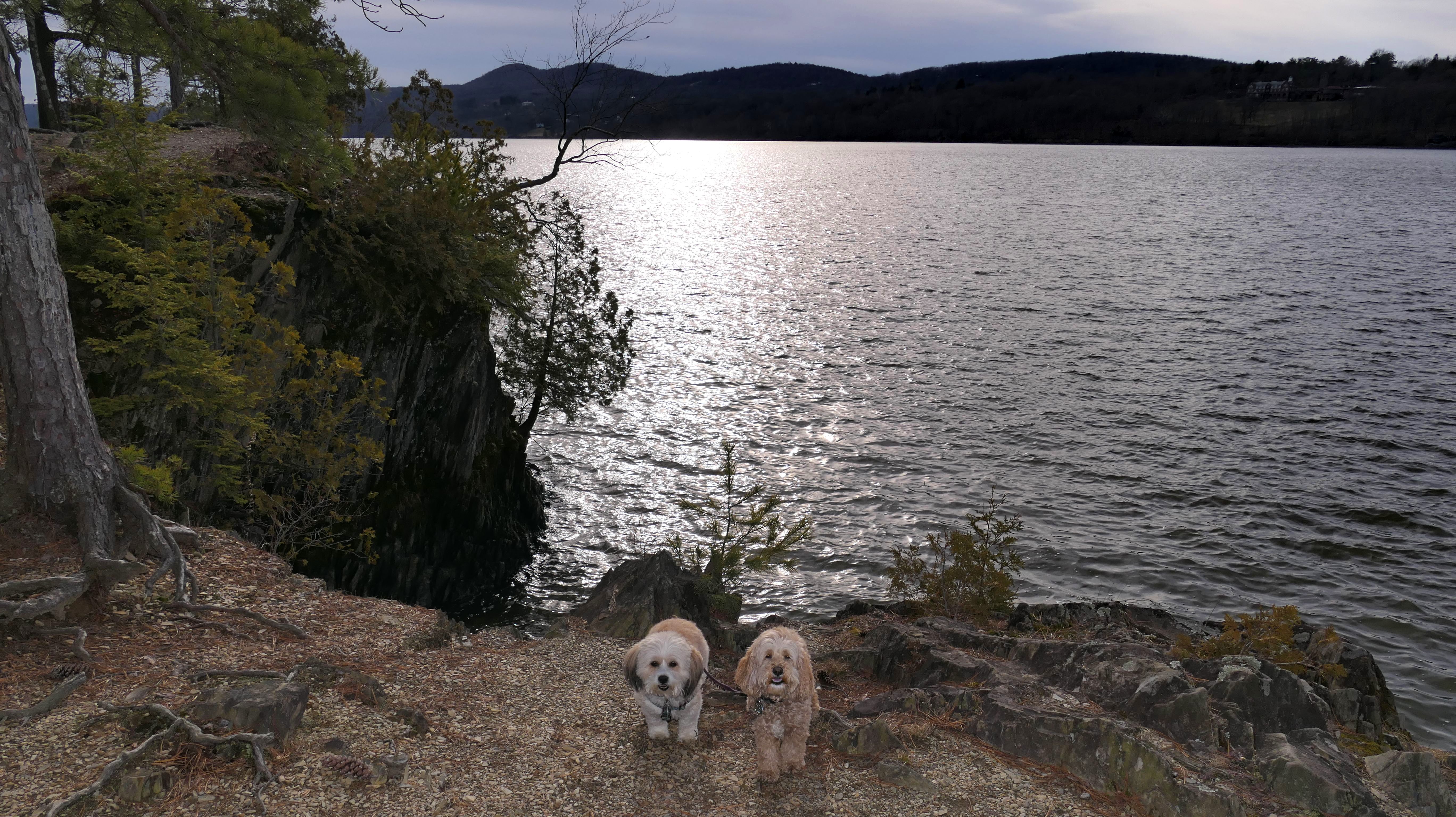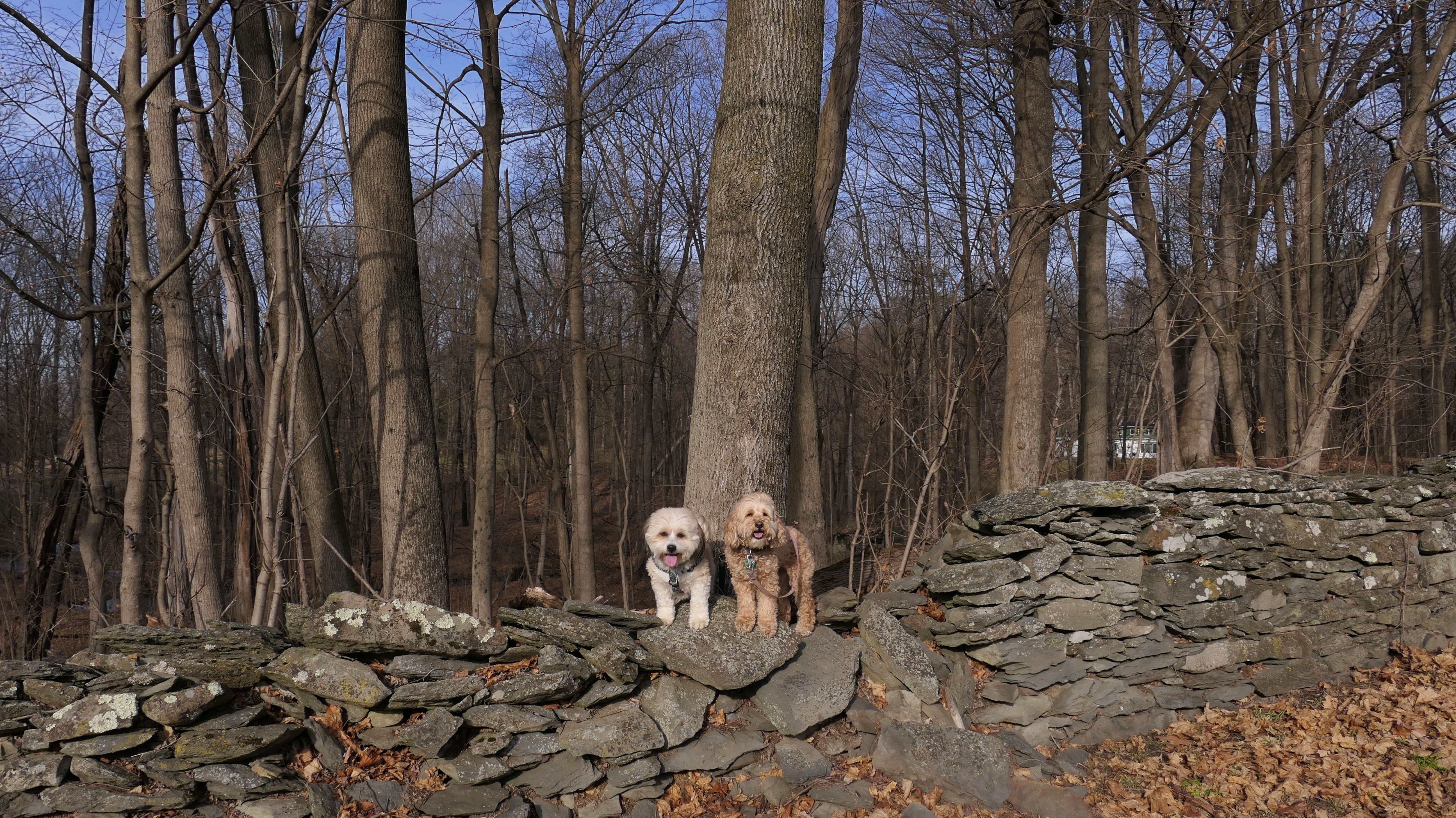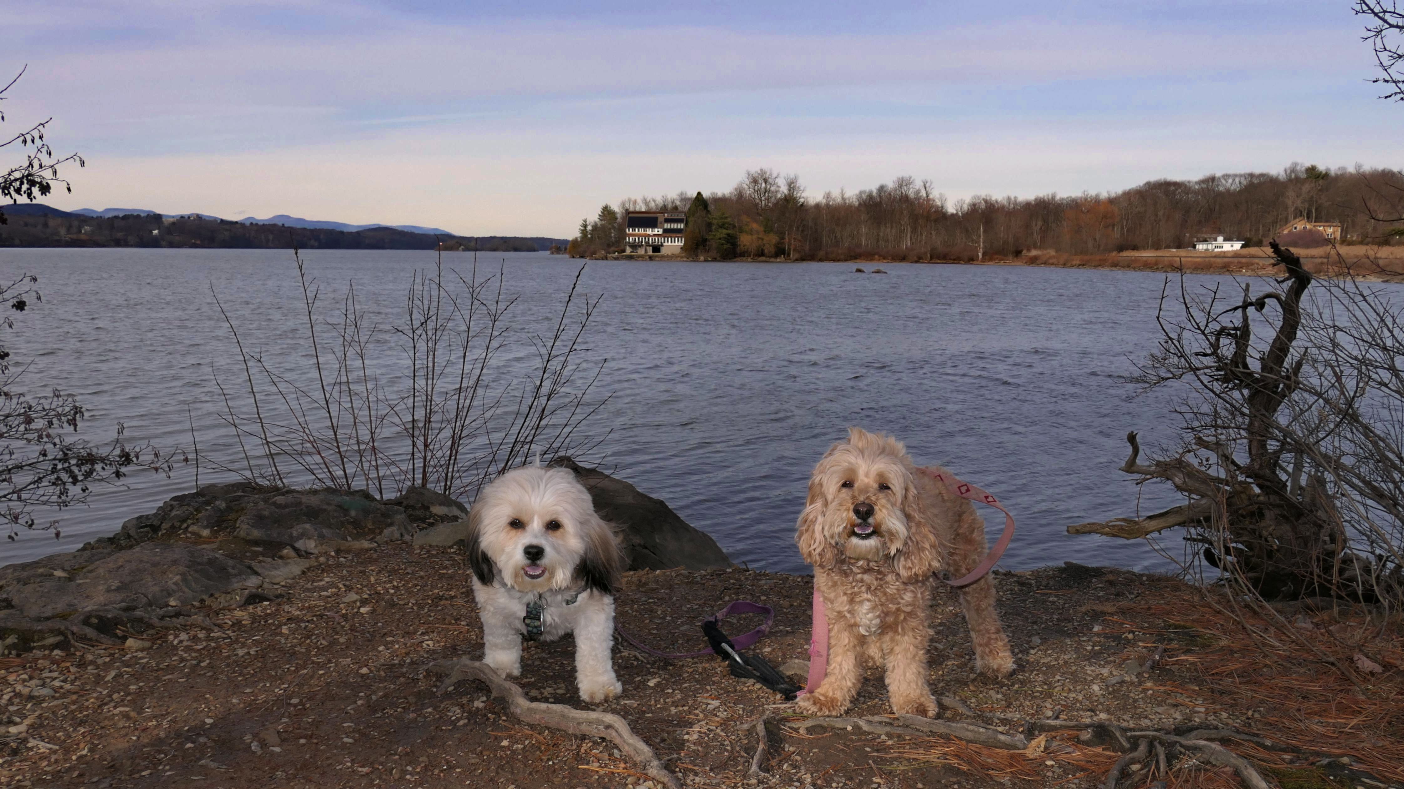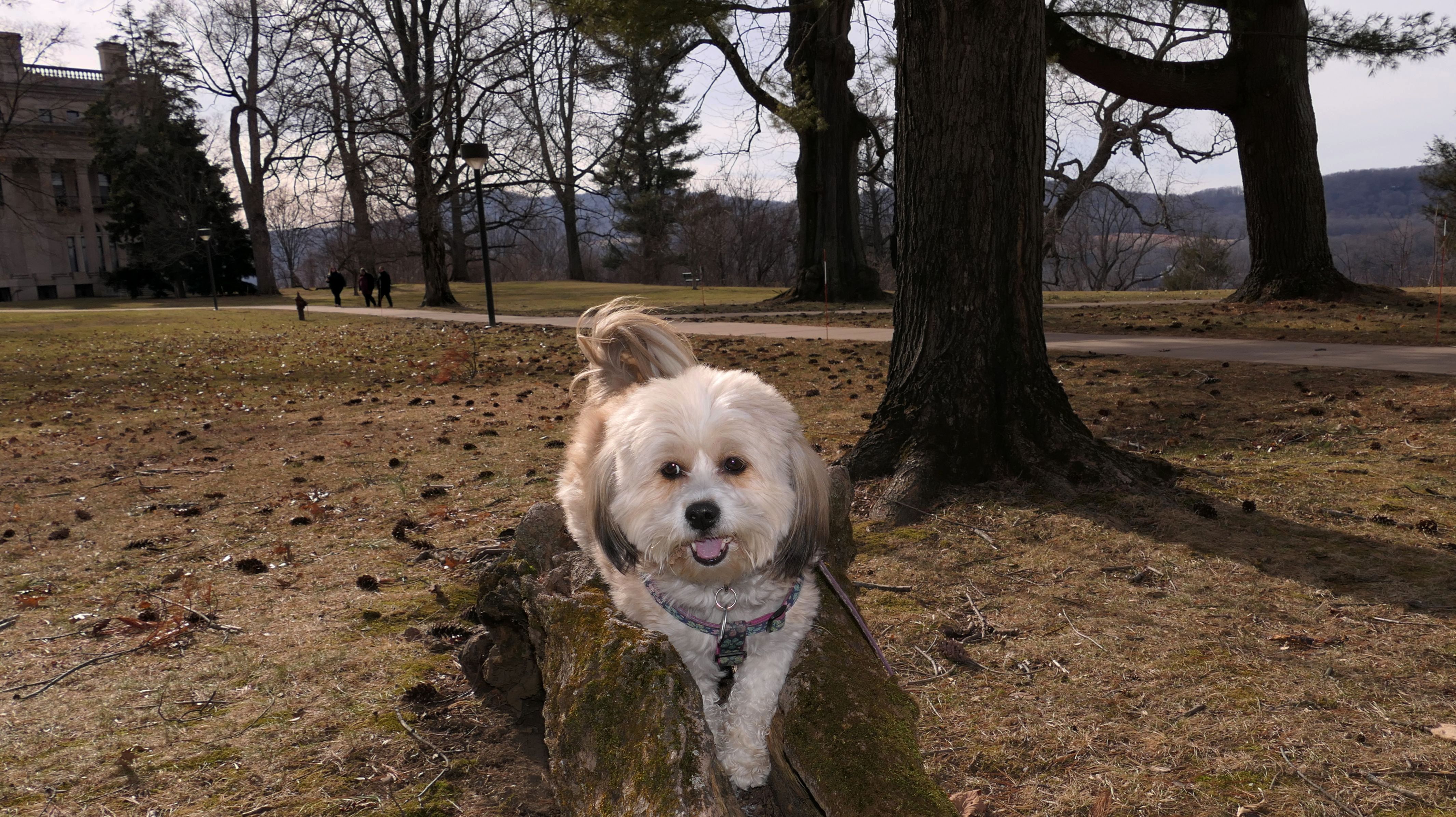 Our first vist here was a very enjoyable walk on a 50 degree day at the end of January. Only problem, was that I forgot to take a picture of the actual mansion. Yes, I have shots of the dogs on the steps of the mansion, but I completely forgot to take a picture of the whole thing. As far as our walk was concerned, We started off right near the mansion, and then explored the gardens, which probably look better in any other season other than winter. We then hiked the loop trail that goes down a steep hill and runs parallel with the railroad tracks and the Hudson River. There's a spot on one end of the loop where we took a detour down to an area right along the river, before heading back up the hill. Oh, and there's a waterfall too! All in all, it's a pretty nice place. We were able to walk 3 1/2 miles here. I won't get into the historical significance of the place, you can read up on it on Wikipedia for that. Scroll down for our second visit, where I actually took some photos of the actual mansion!