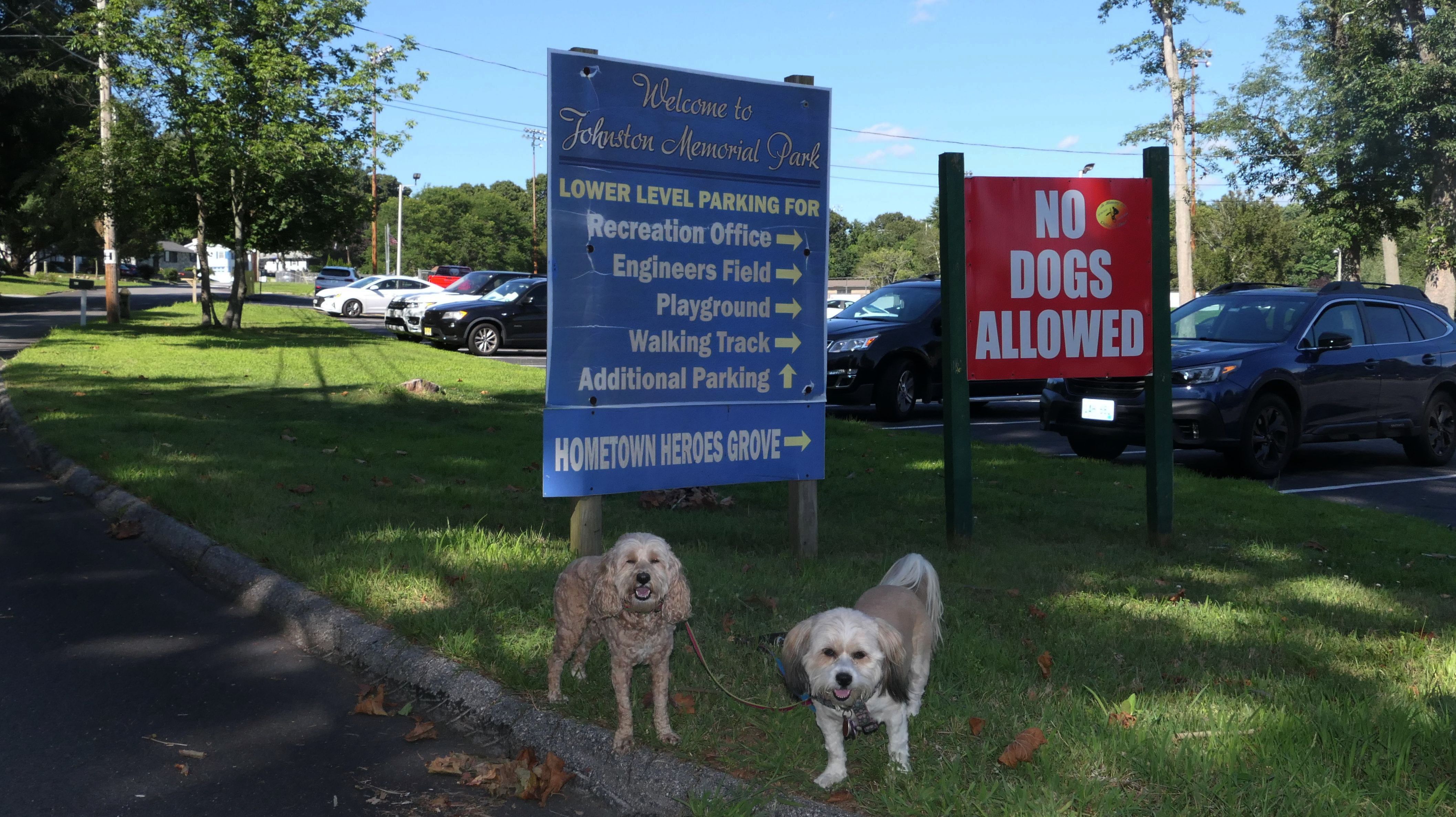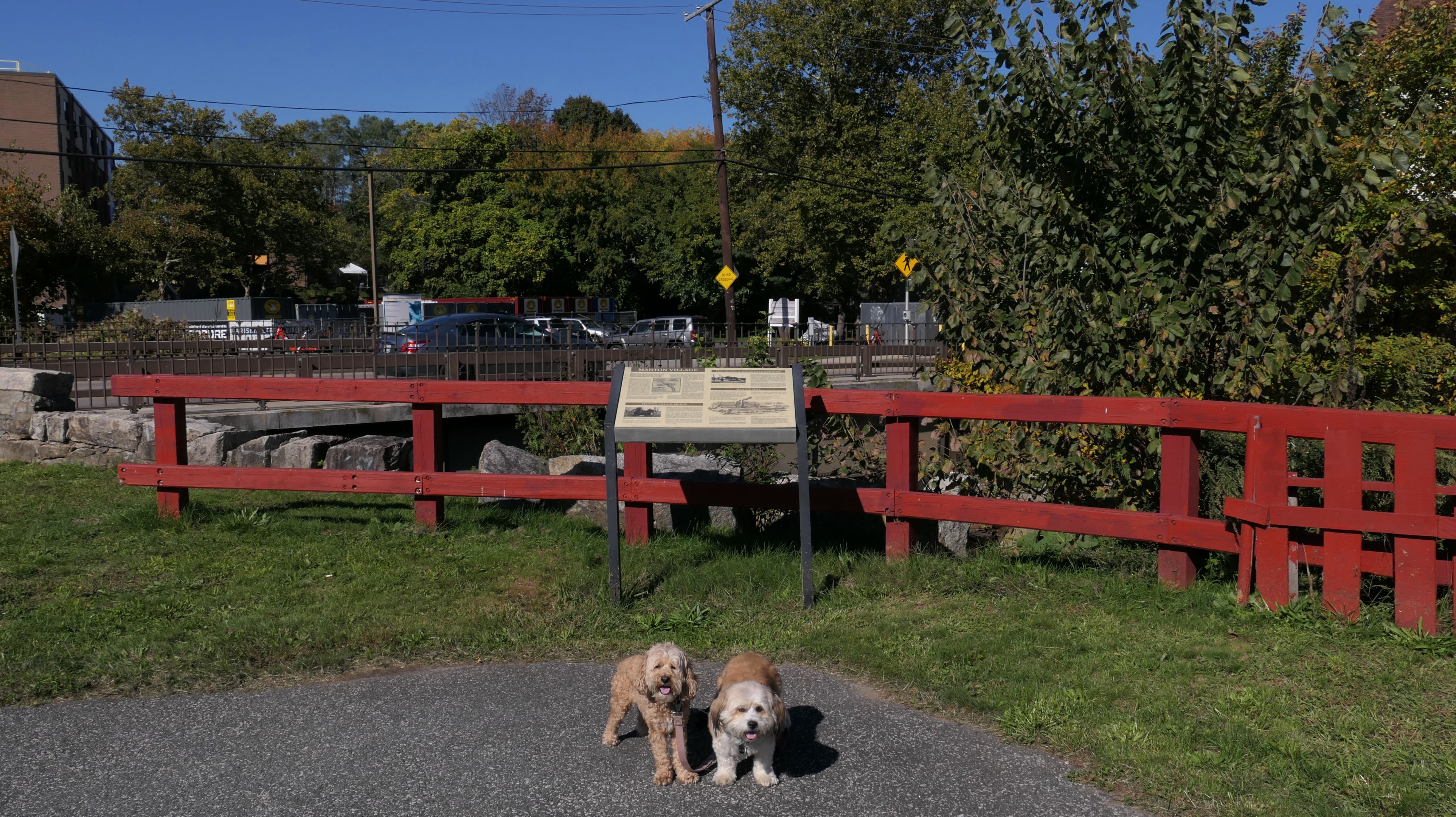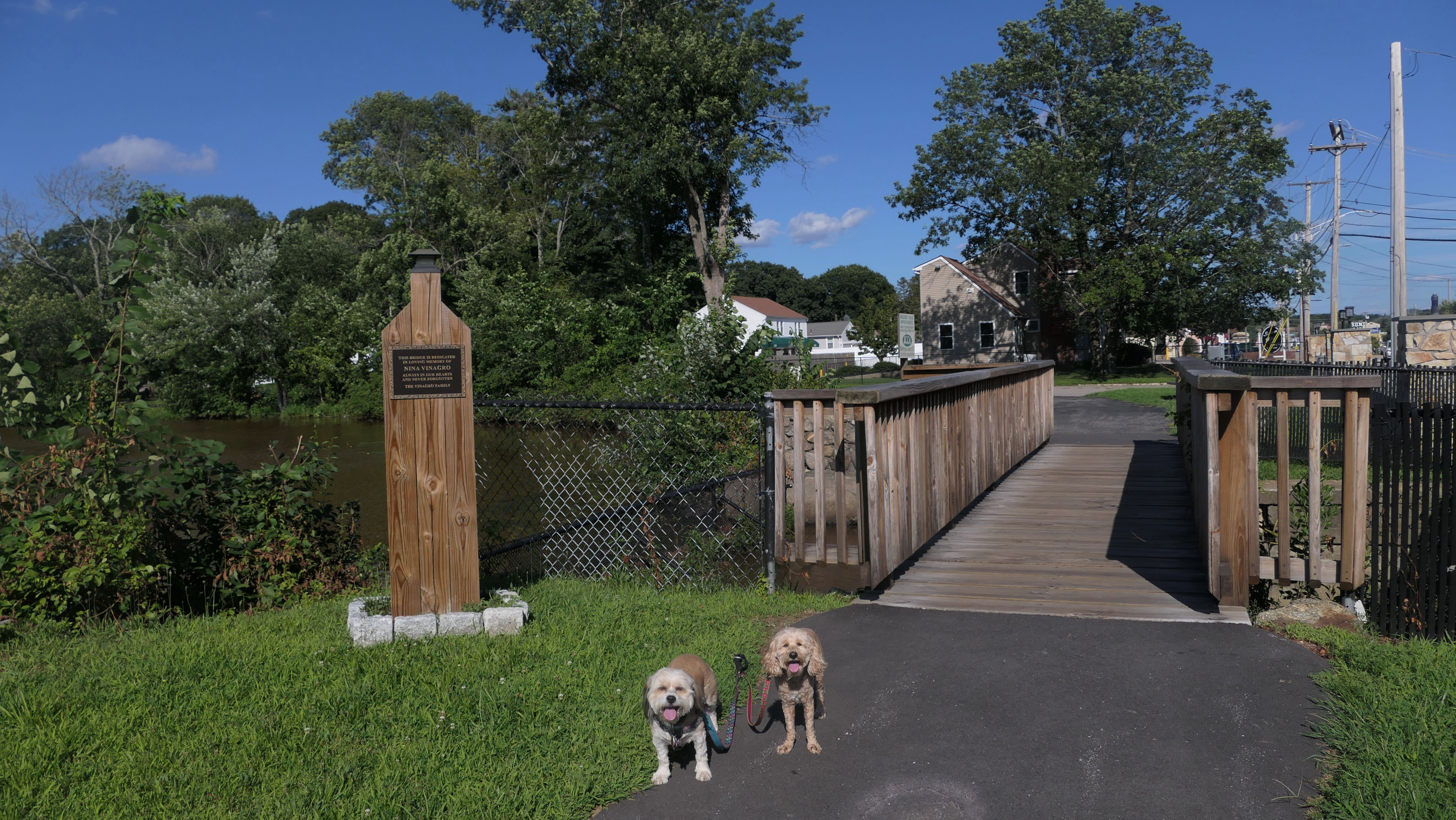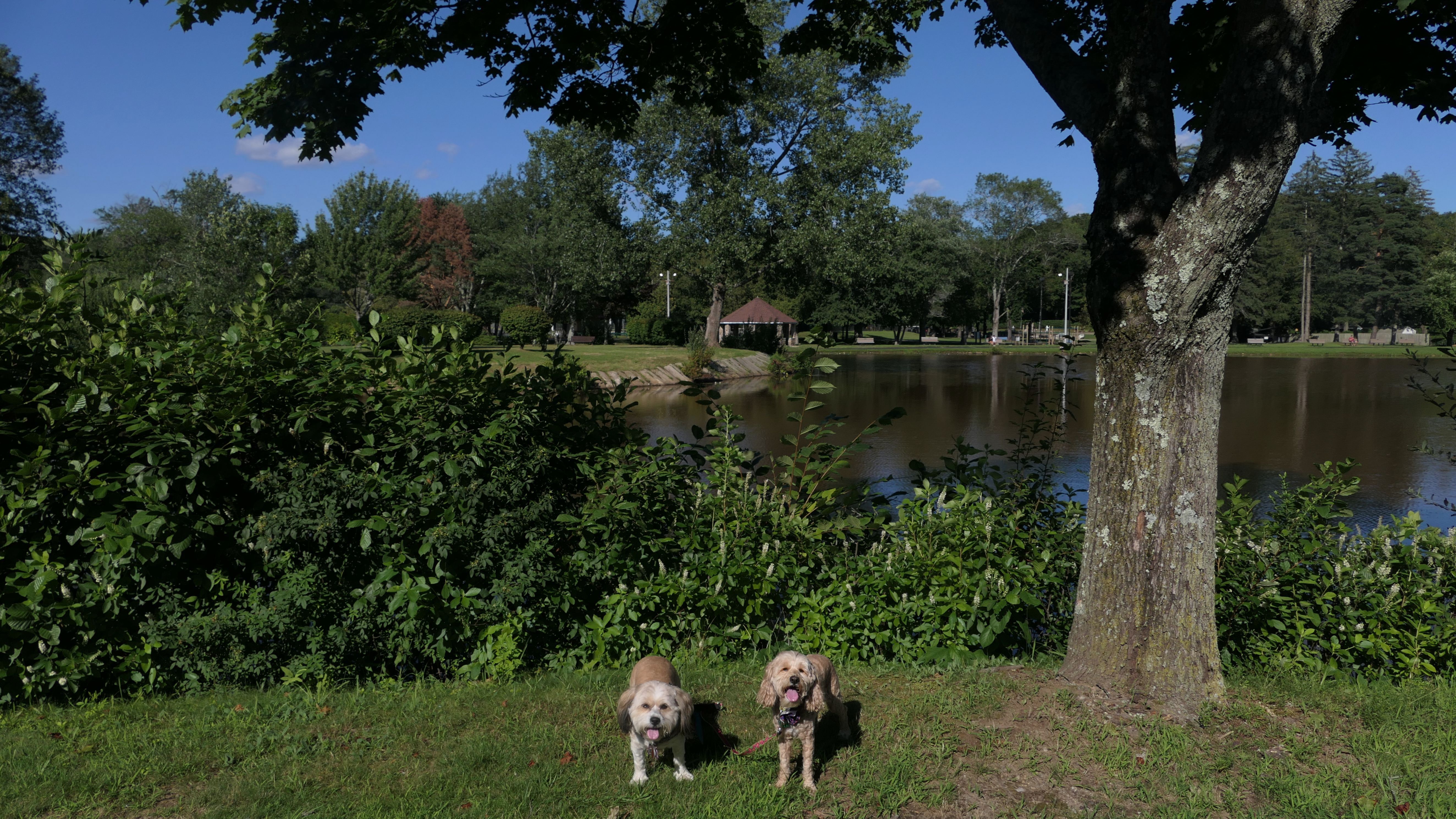 As you can see from the very large red sign below, dogs are not allowed in the actual park. The Johnston Memorial Park Nature Trail is across the street. I think the dogs are allowed on the trail, at least there was no sign or anything at the trail head. We checked out the trail. It doesn't look that bad in the photos, but believe me, it wasn't great. The Pocasset River runs along side part of the trail. It might be the brownest river I have ever seen. Mandy wanted to go into the river, but I did not let her. There was a lot of trash on the trail, and as we proceeded further along the trail was overgrown. We took a different path, which was okay for a bit, but then it was washed out. So the Nature Trail was a bust! We decided to walk around the outskirts of the actual park. There is a paved loop trail through the park, which looked real nice from the outside looking in. We actually did walk on the part of the trail between the pond and Hartford Avenue (US Route 6A). It was unclear if this section was actually part of the park or not, but it kept us away from the busy road. There just is something inherently wrong with a park that does not allow dogs. I mean, parks are made for dogs! We may have snuck on to the outskirts of the property for some photos, but overall, this is not a good place to bring your dog.