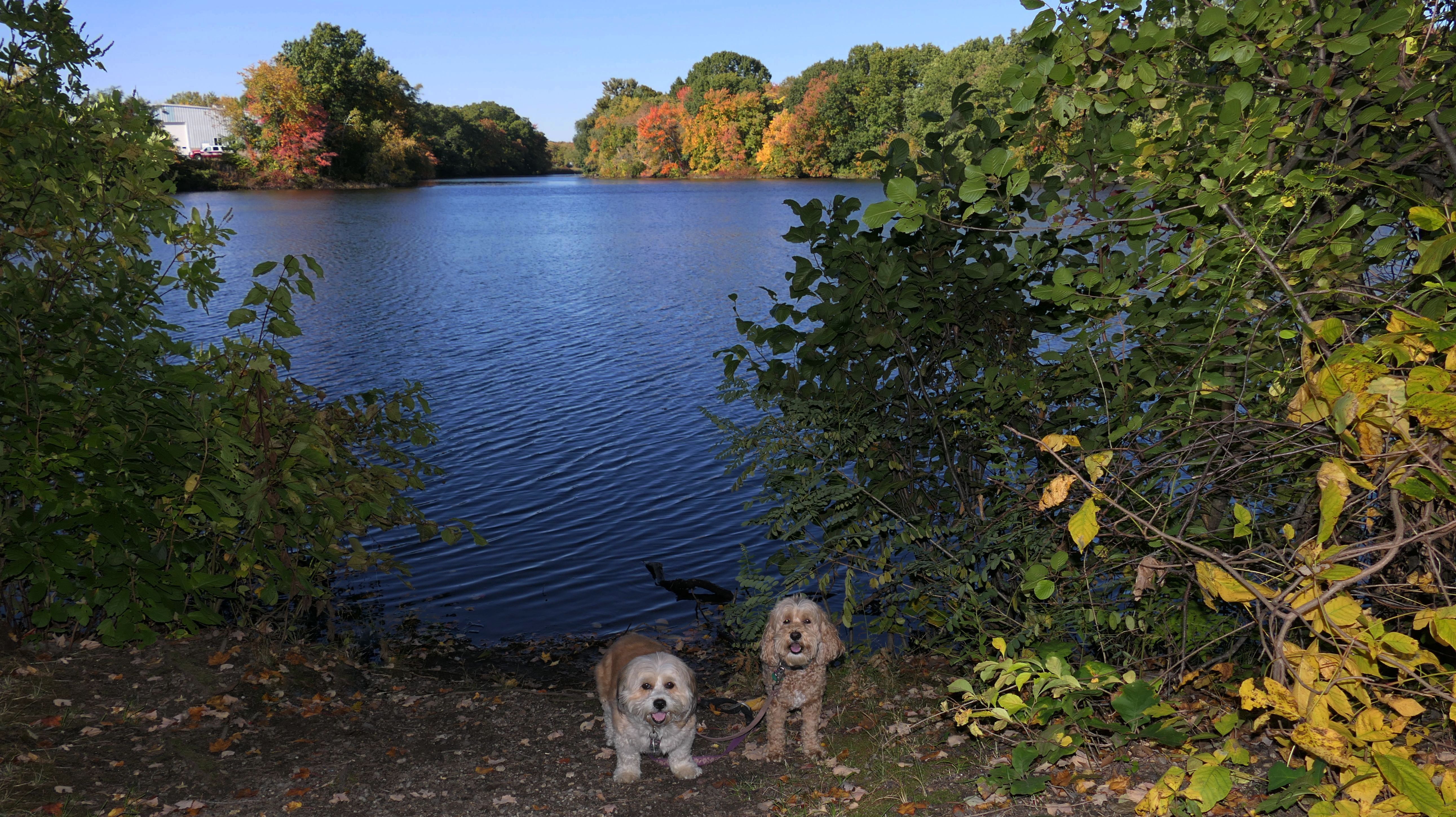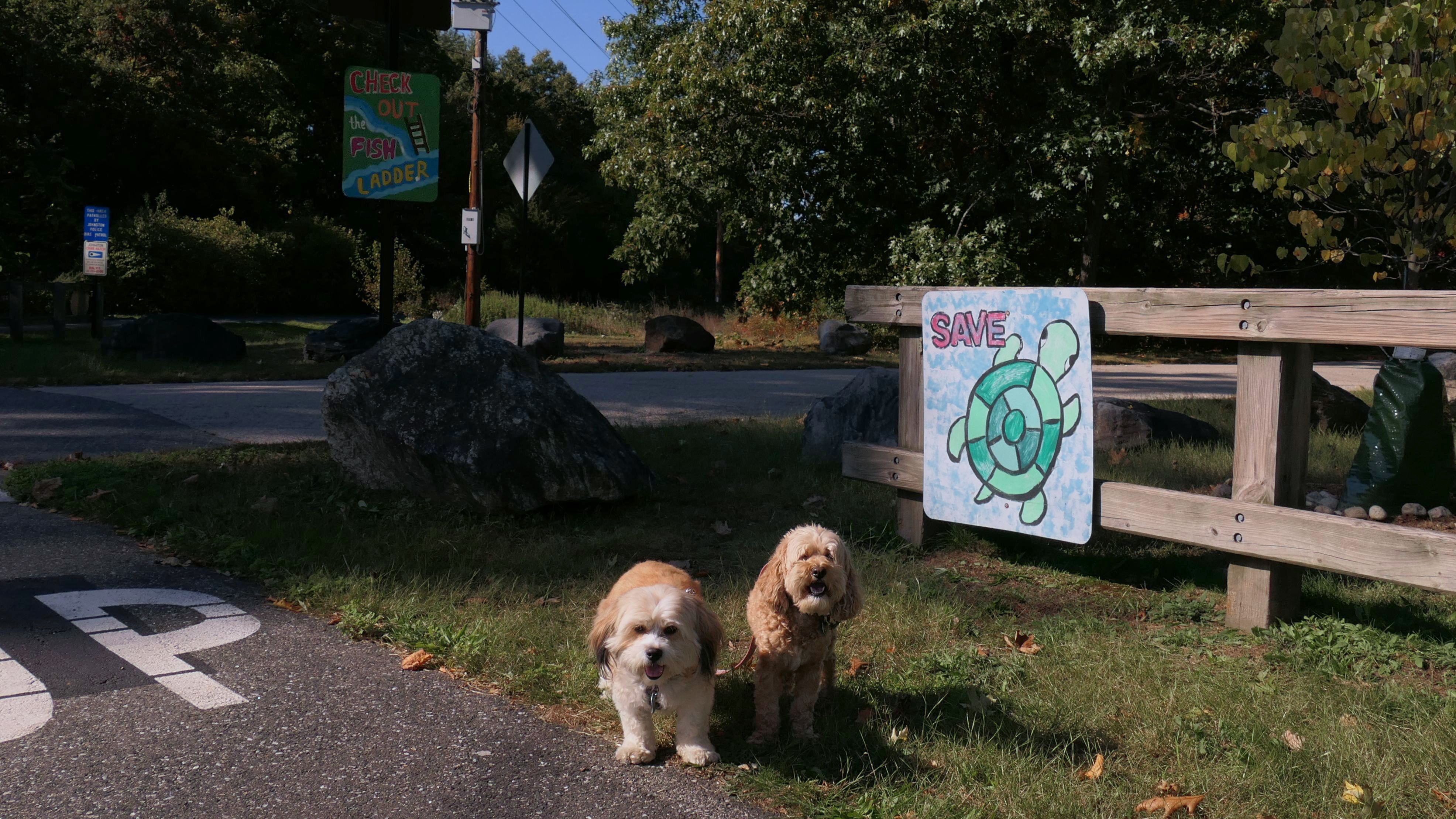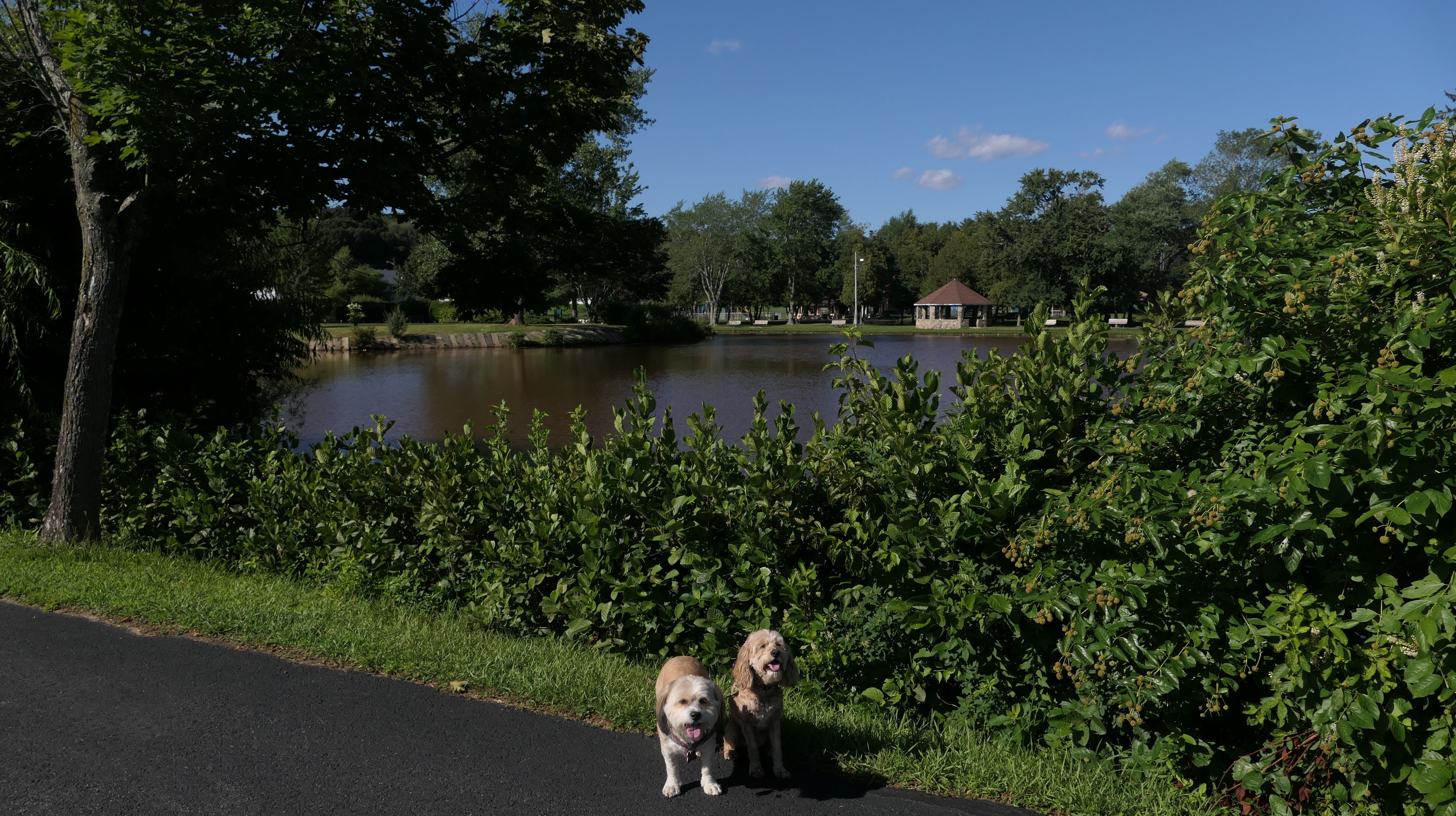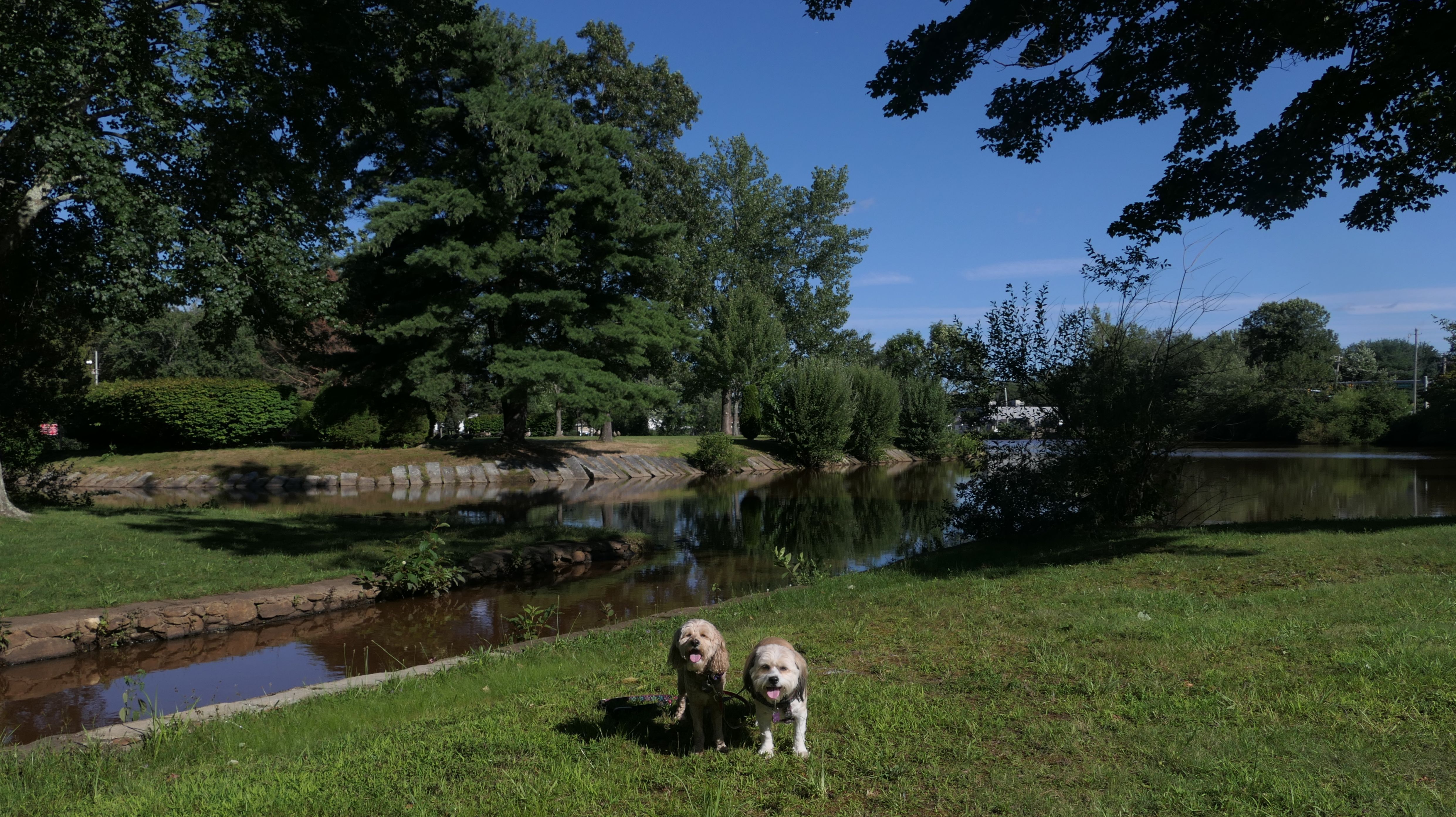 As you can see from the very large red sign below, dogs are not allowed in the actual park. The Johnston Memorial Park Nature Trail is across the street. I think the dogs are allowed on the trail, at least there was no sign or anything at the trail head. We checked out the trail. It doesn't look that bad in the photos, but believe me, it wasn't great. The Pocasset River runs along side part of the trail. It might be the brownest river I have ever seen. Mandy wanted to go into the river, but I did not let her. There was a lot of trash on the trail, and as we proceeded further along the trail was overgrown. We took a different path, which was okay for a bit, but then it was washed out. So the Nature Trail was a bust! We decided to walk around the outskirts of the actual park. There is a paved loop trail through the park, which looked real nice from the outside looking in. We actually did walk on the part of the trail between the pond and Hartford Avenue (US Route 6A). It was unclear if this section was actually part of the park or not, but it kept us away from the busy road. There just is something inherently wrong with a park that does not allow dogs. I mean, parks are made for dogs! We may have snuck on to the outskirts of the property for some photos, but overall, this is not a good place to bring your dog.