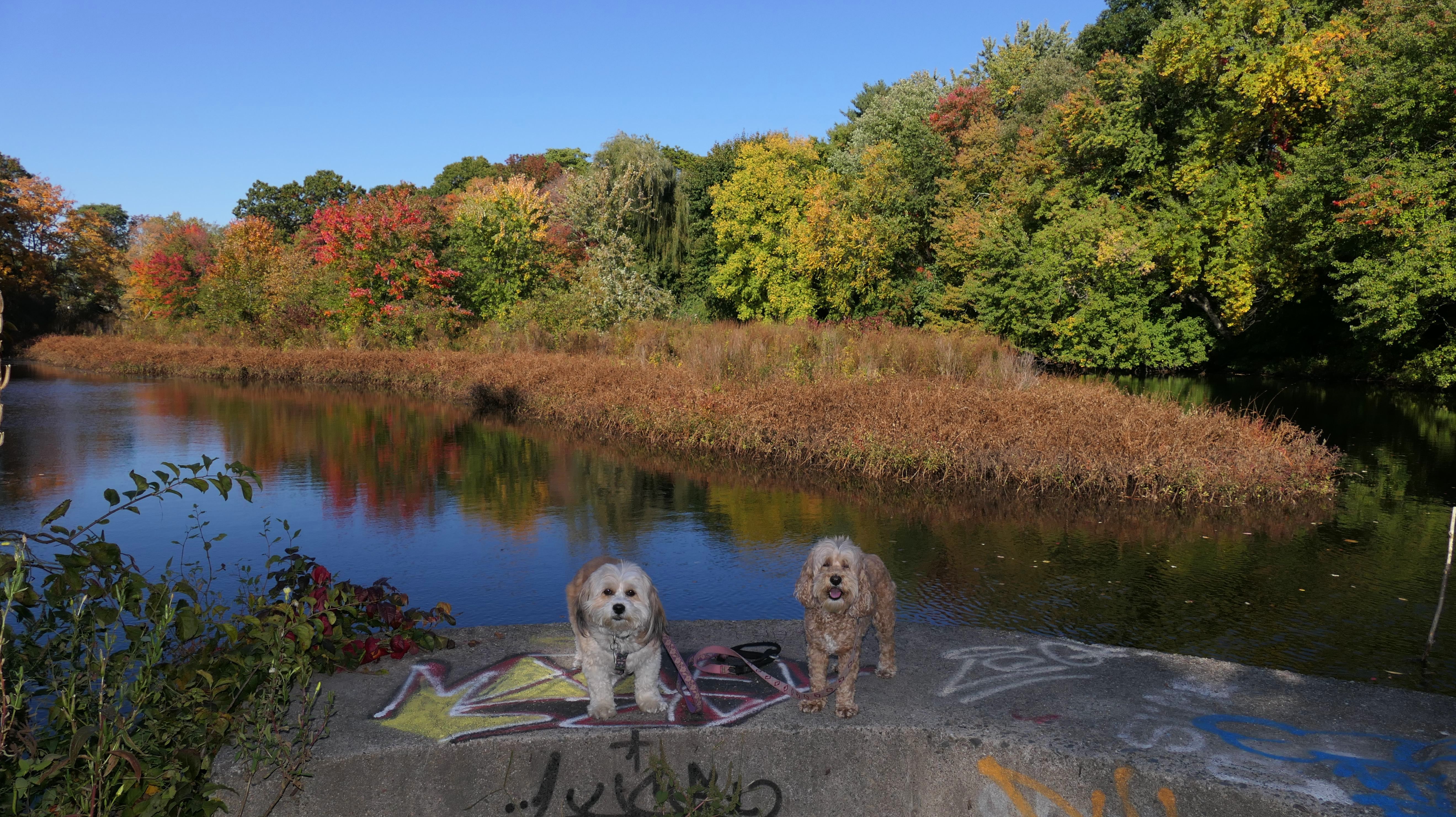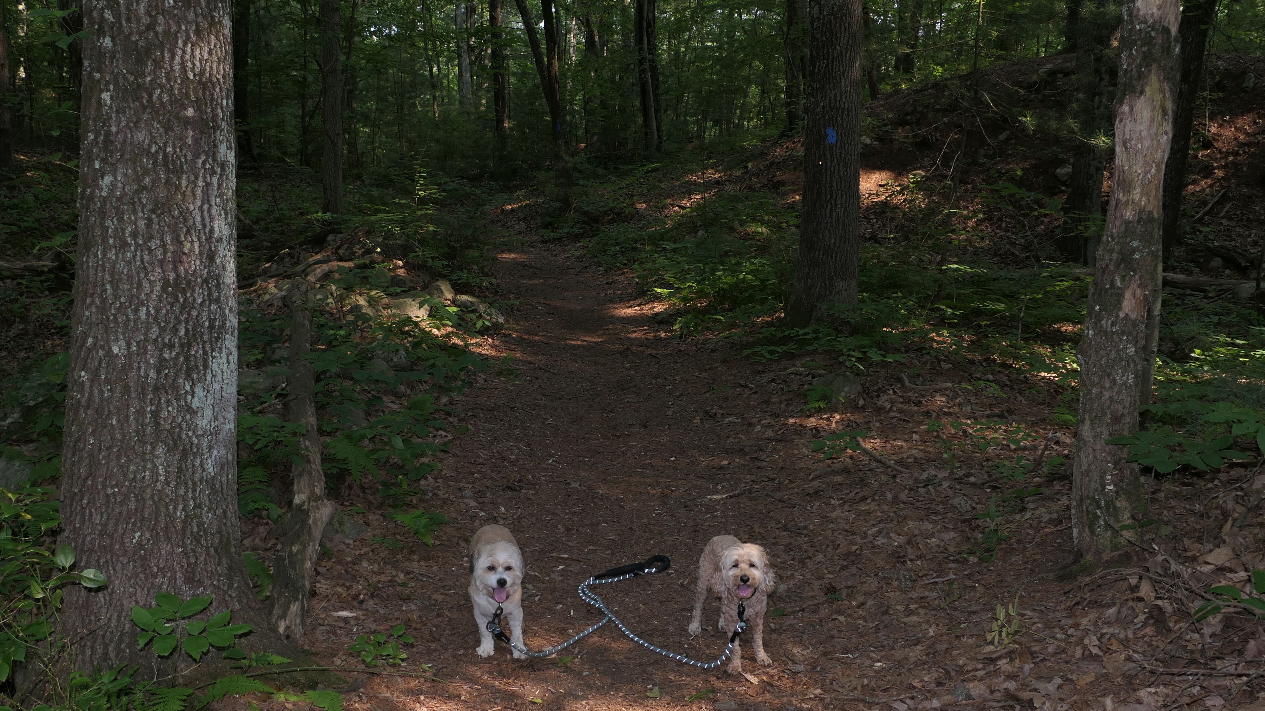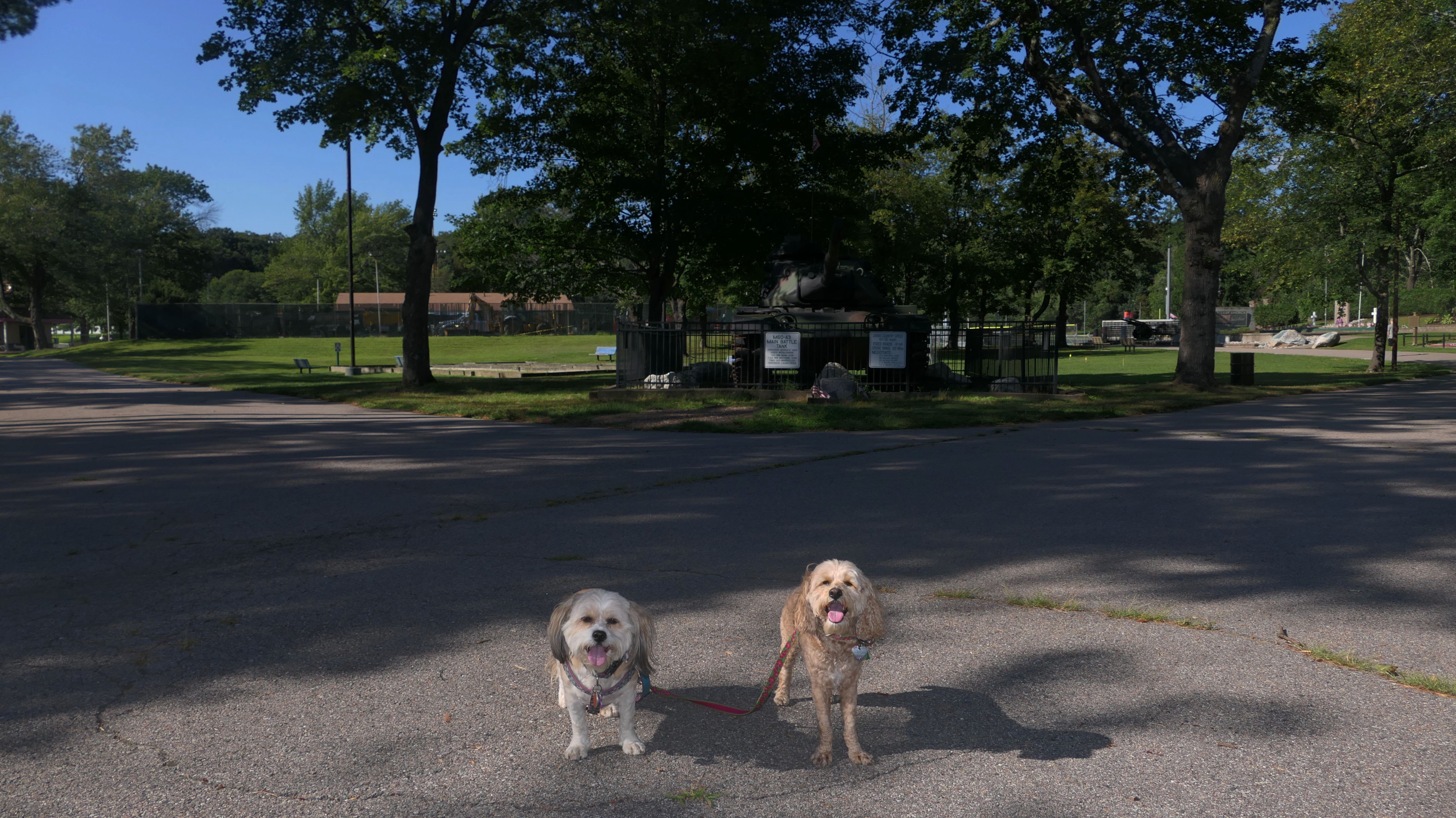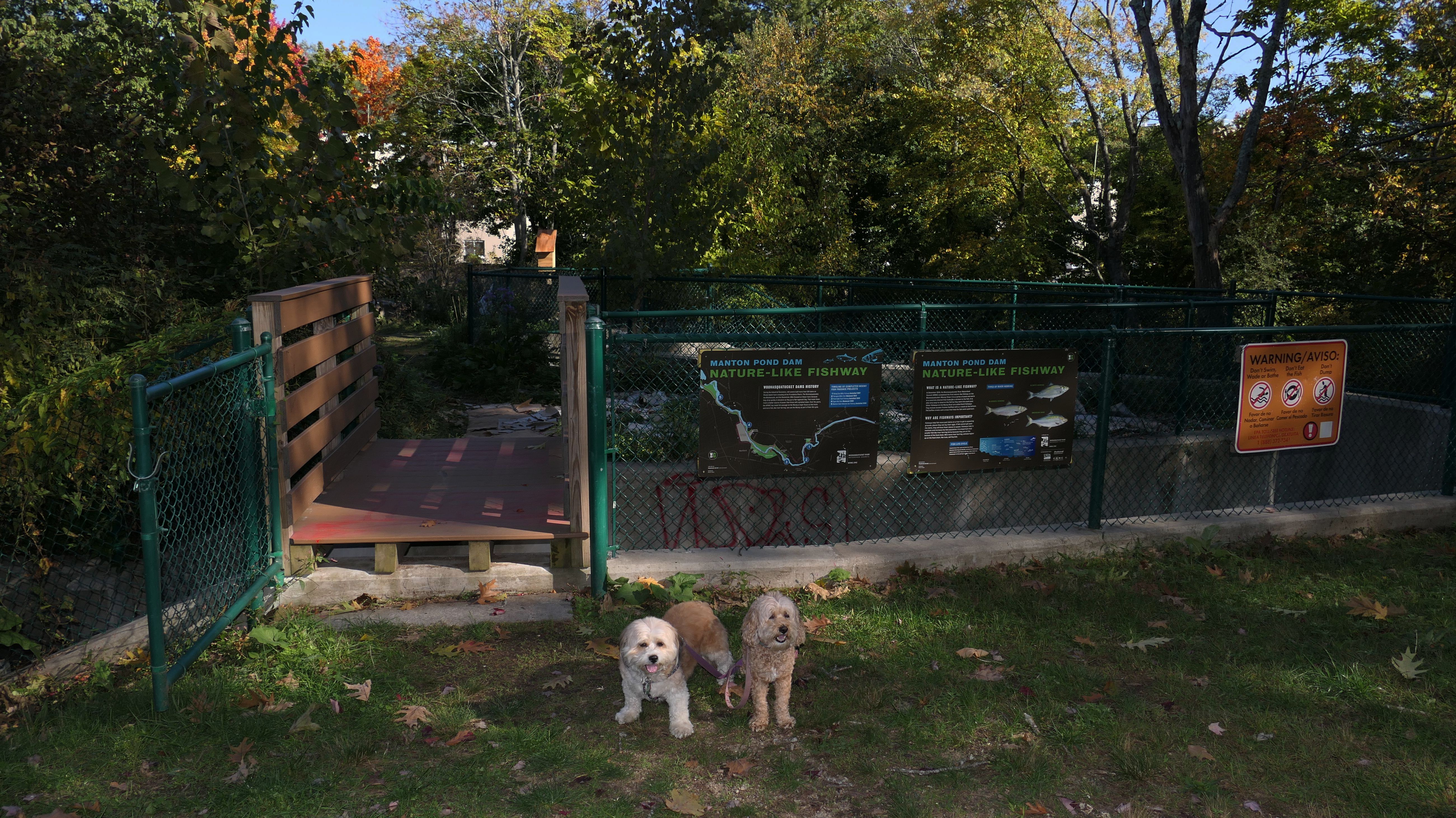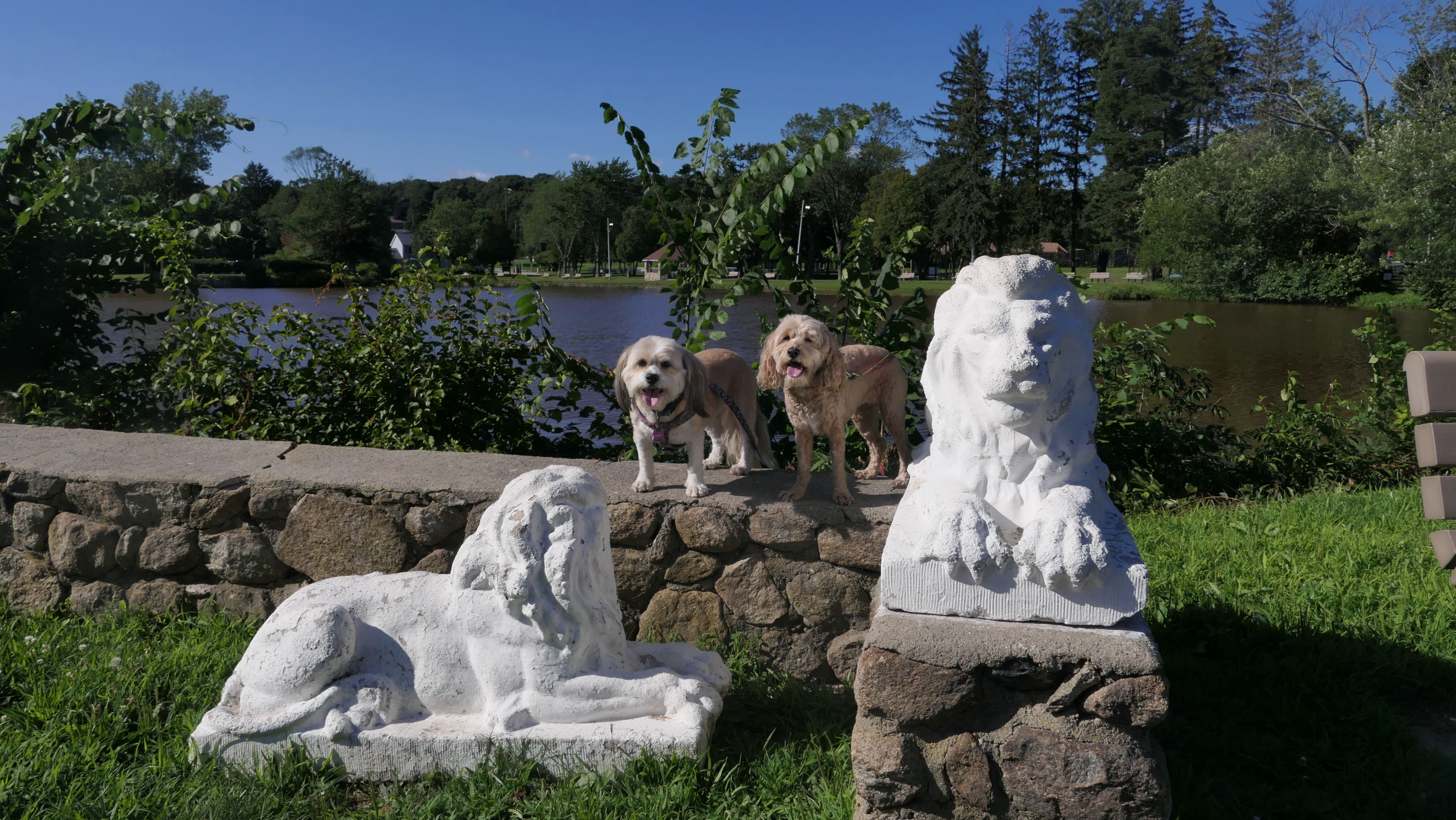 As you can see from the very large red sign below, dogs are not allowed in the actual park. The Johnston Memorial Park Nature Trail is across the street. I think the dogs are allowed on the trail, at least there was no sign or anything at the trail head. We checked out the trail. It doesn't look that bad in the photos, but believe me, it wasn't great. The Pocasset River runs along side part of the trail. It might be the brownest river I have ever seen. Mandy wanted to go into the river, but I did not let her. There was a lot of trash on the trail, and as we proceeded further along the trail was overgrown. We took a different path, which was okay for a bit, but then it was washed out. So the Nature Trail was a bust! We decided to walk around the outskirts of the actual park. There is a paved loop trail through the park, which looked real nice from the outside looking in. We actually did walk on the part of the trail between the pond and Hartford Avenue (US Route 6A). It was unclear if this section was actually part of the park or not, but it kept us away from the busy road. There just is something inherently wrong with a park that does not allow dogs. I mean, parks are made for dogs! We may have snuck on to the outskirts of the property for some photos, but overall, this is not a good place to bring your dog.
