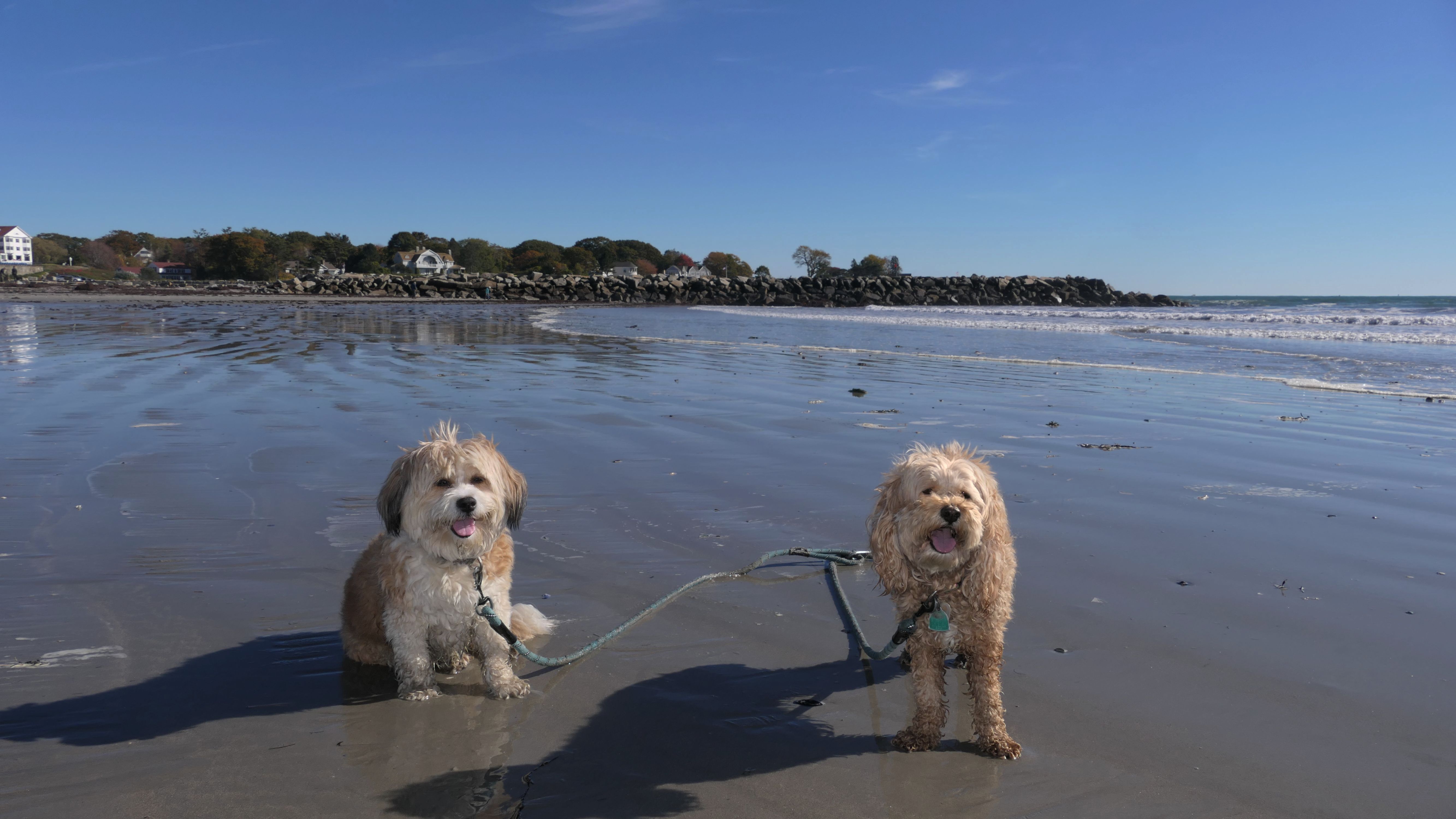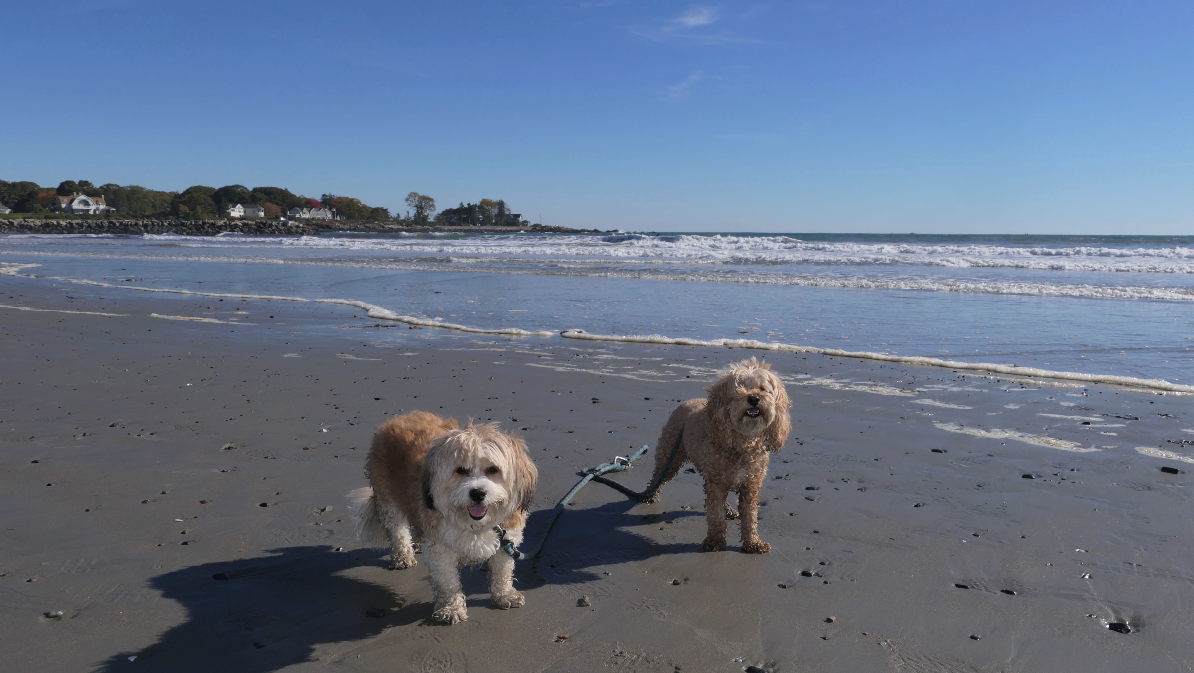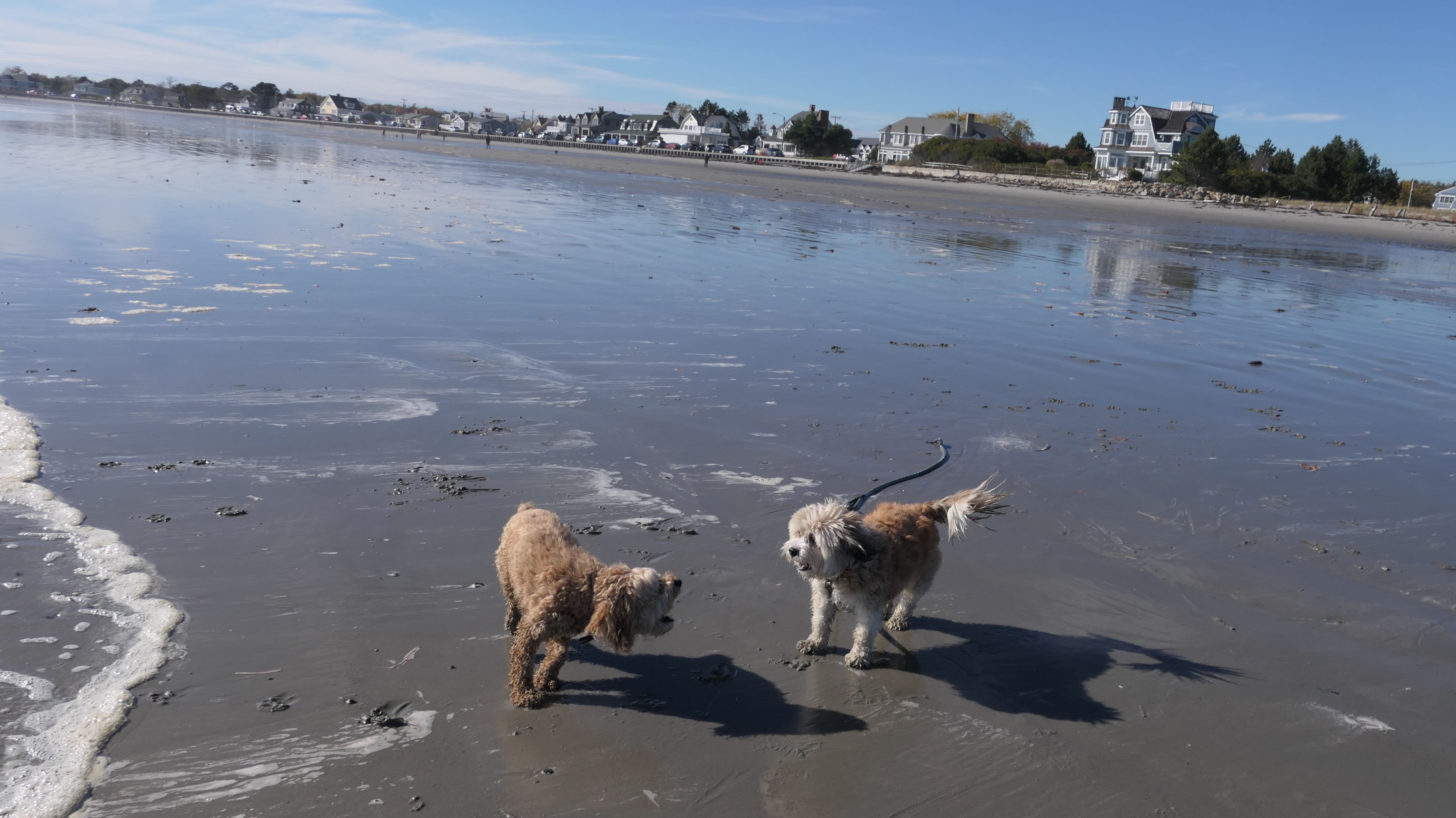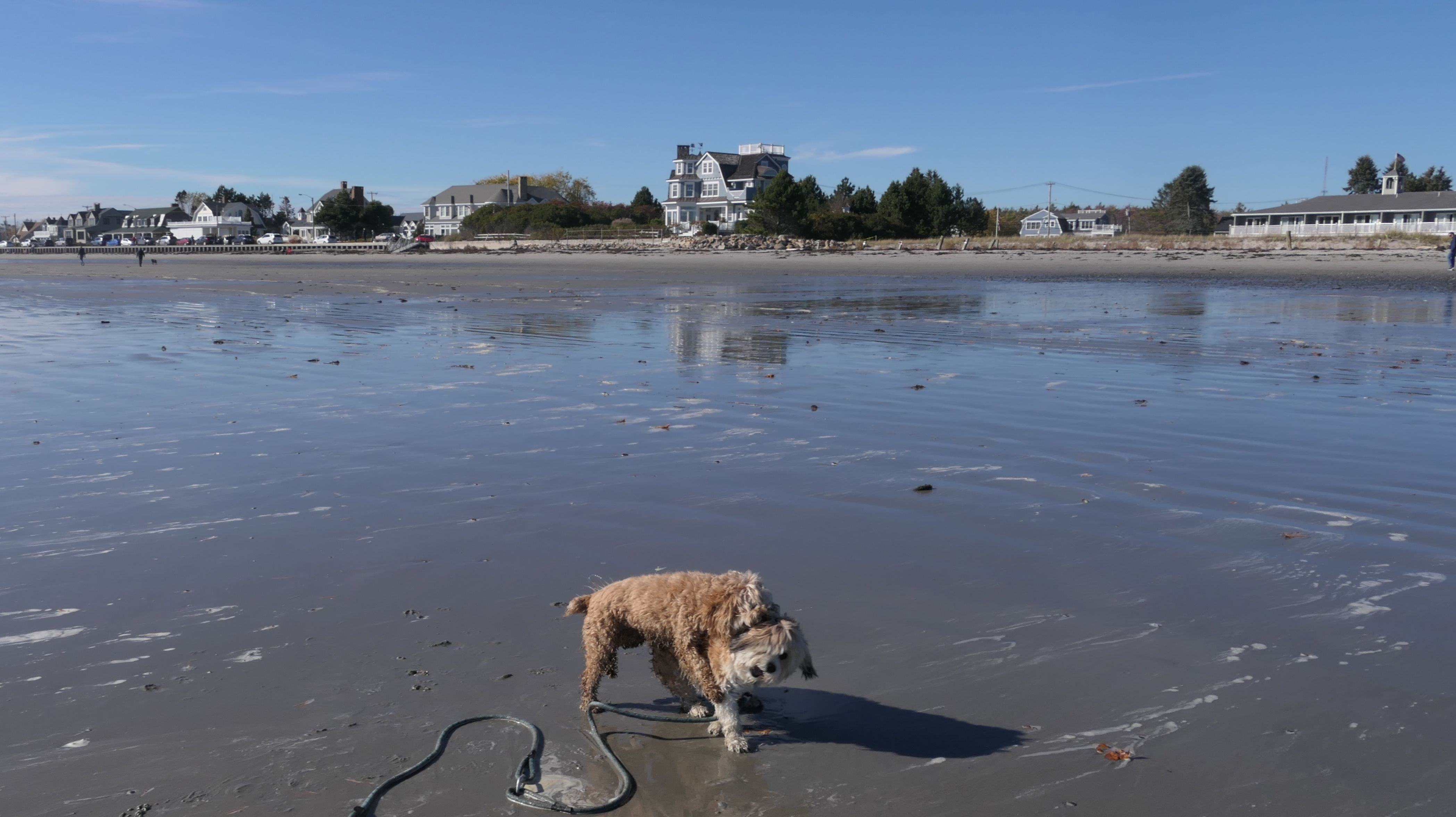 This is a pretty decent beach, located in Kennebunk Maine. Dogs are allowed before 9AM and after 5PM from June 15th to Labor Day, and allowed any time outside of those dates. They also only need to be under voice control, and don't need to be on a leash. We started by the rocky area on the west end of the beach, and made our way to the Kennebunk River breachway on the east end. The whole thing is about a mile long. On our way back, the dogs played a bit off-leash. Lexi always loves running on the beach! It was low tide, but there were still some pretty nice waves. There was a number of surfers taking advantage of them. This beach kind of reminds me of Easton's Beach in Newport. It's sort of the same shape, tucked in a cove but with nice waves. This was a pleasant beach walk on a sunny autumn afternoon.