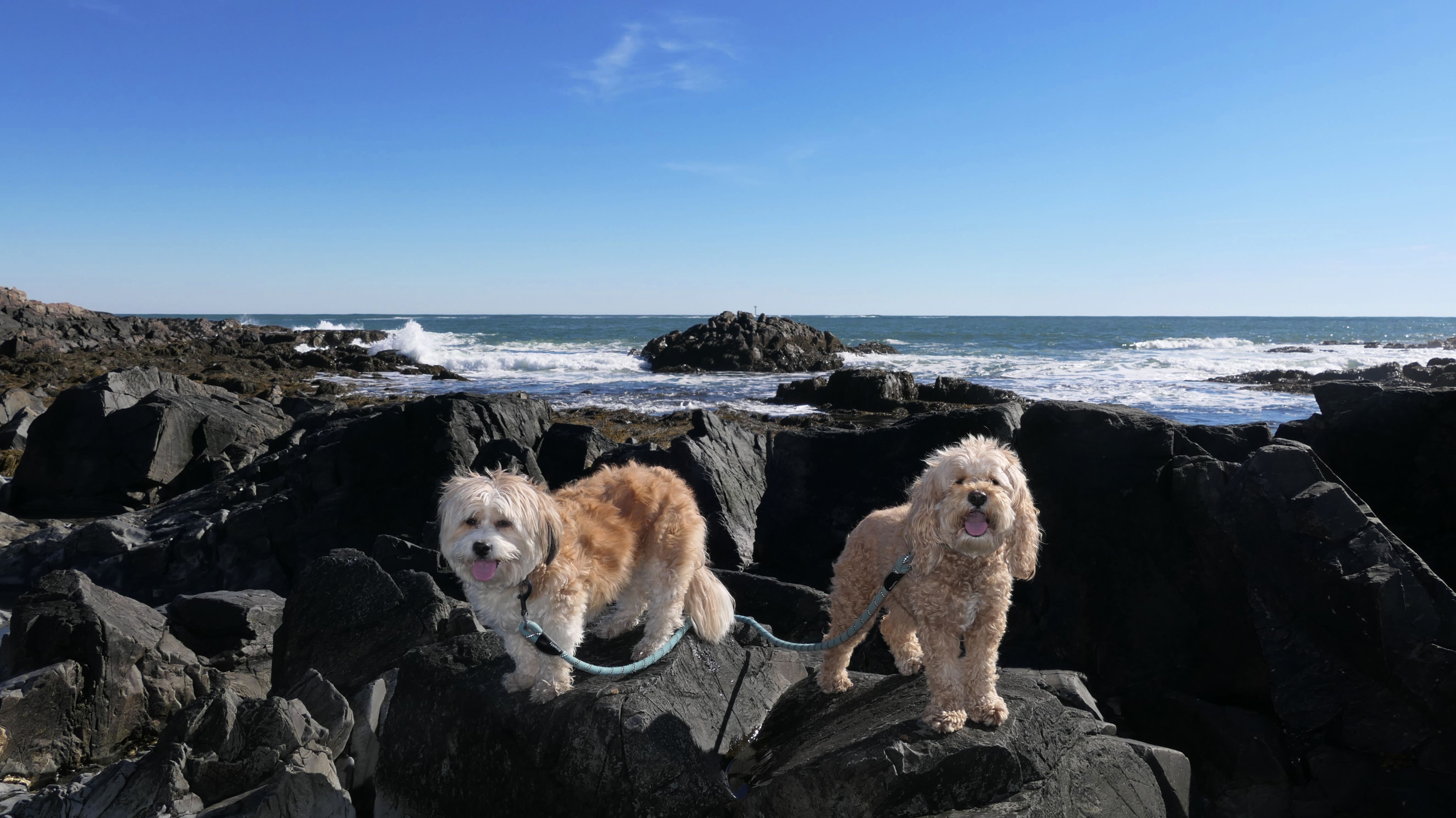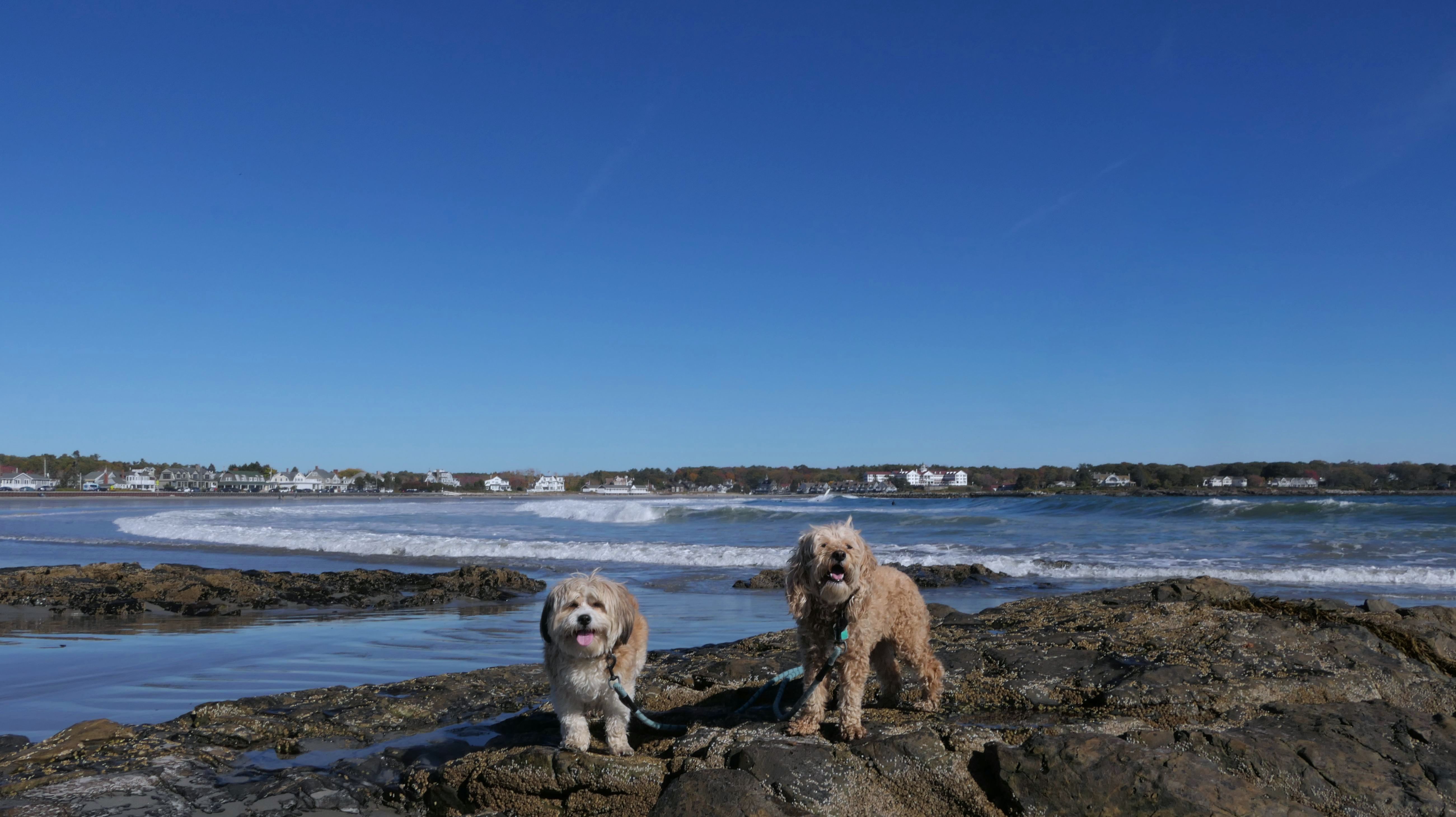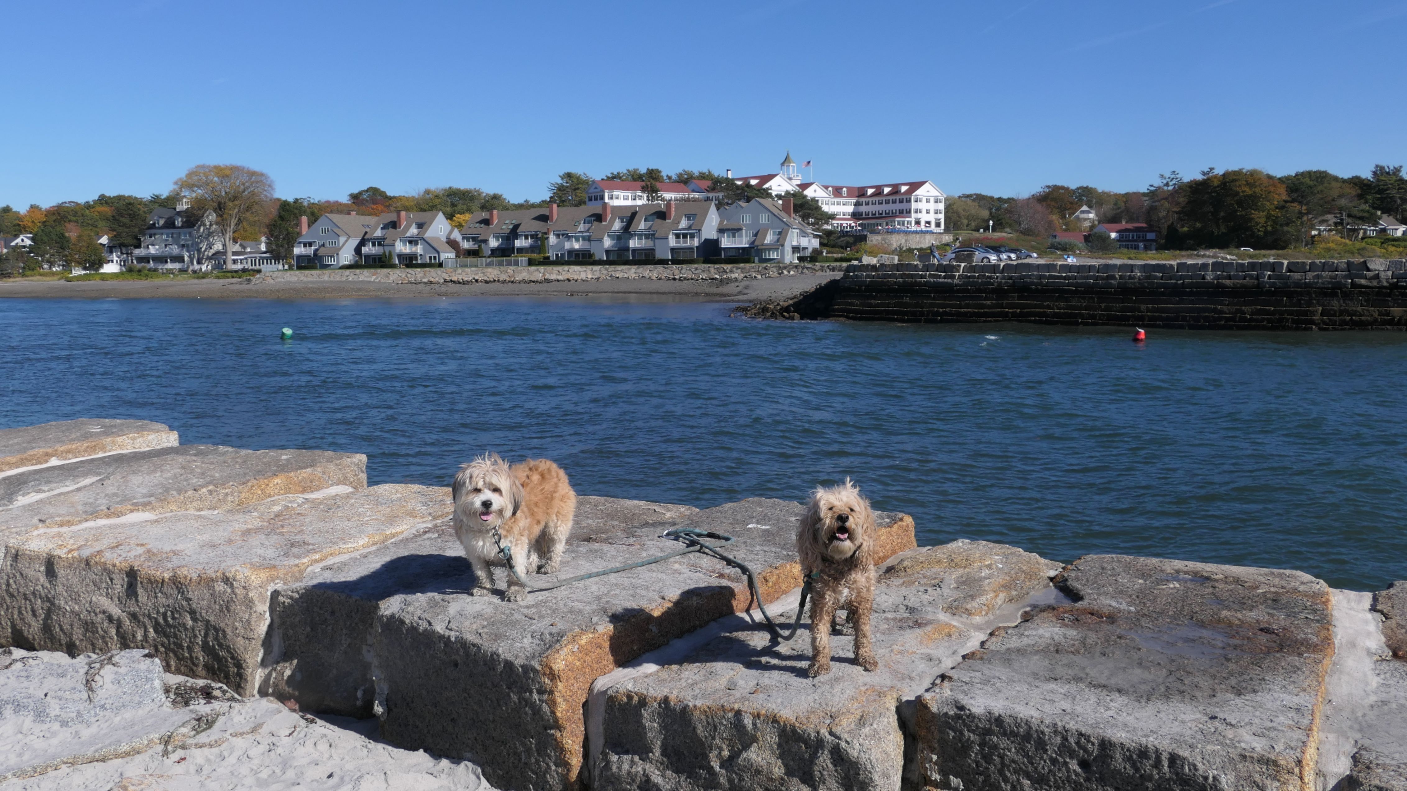 This is a pretty decent beach, located in Kennebunk Maine. Dogs are allowed before 9AM and after 5PM from June 15th to Labor Day, and allowed any time outside of those dates. They also only need to be under voice control, and don't need to be on a leash. We started by the rocky area on the west end of the beach, and made our way to the Kennebunk River breachway on the east end. The whole thing is about a mile long. On our way back, the dogs played a bit off-leash. Lexi always loves running on the beach! It was low tide, but there were still some pretty nice waves. There was a number of surfers taking advantage of them. This beach kind of reminds me of Easton's Beach in Newport. It's sort of the same shape, tucked in a cove but with nice waves. This was a pleasant beach walk on a sunny autumn afternoon.