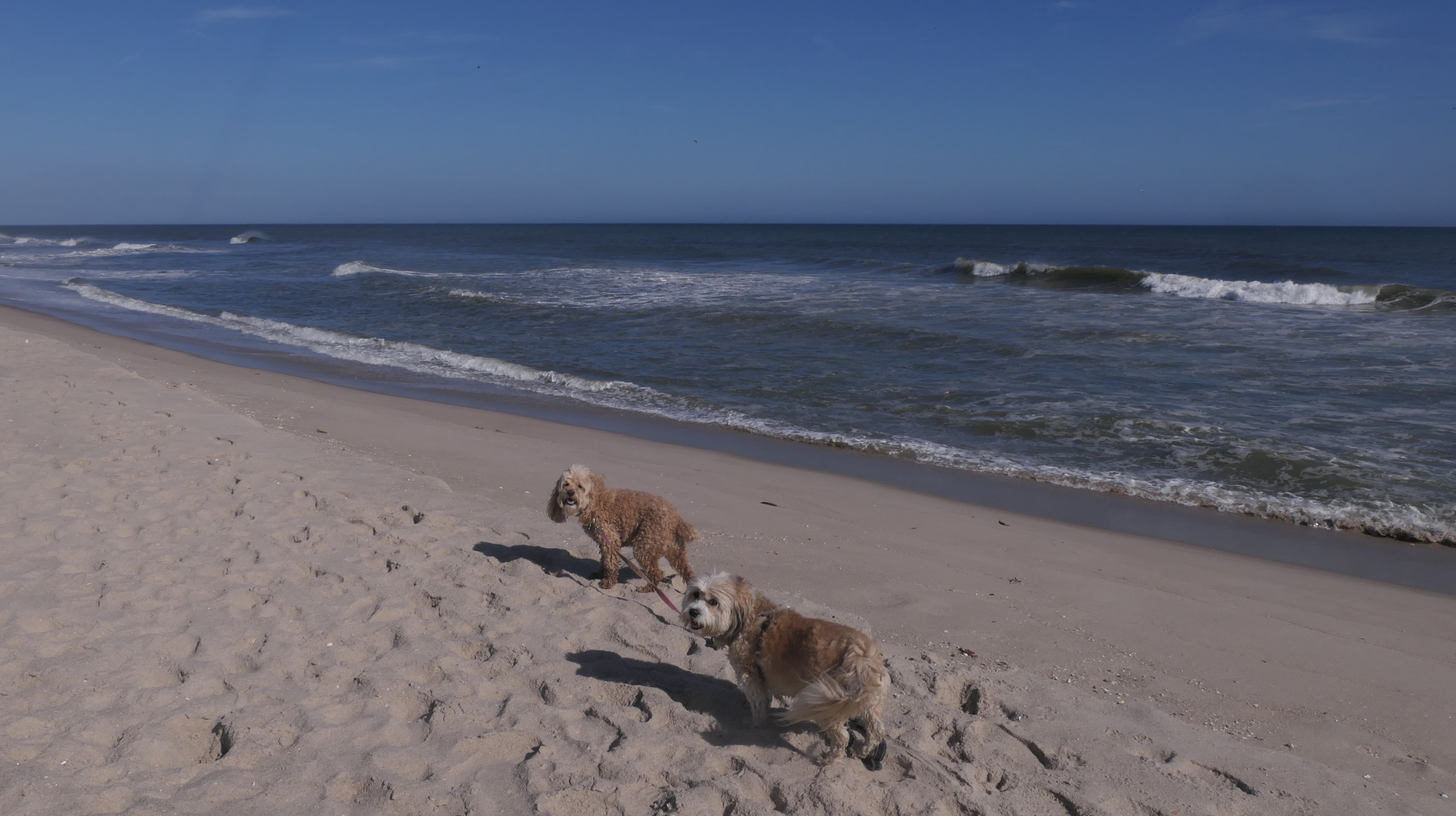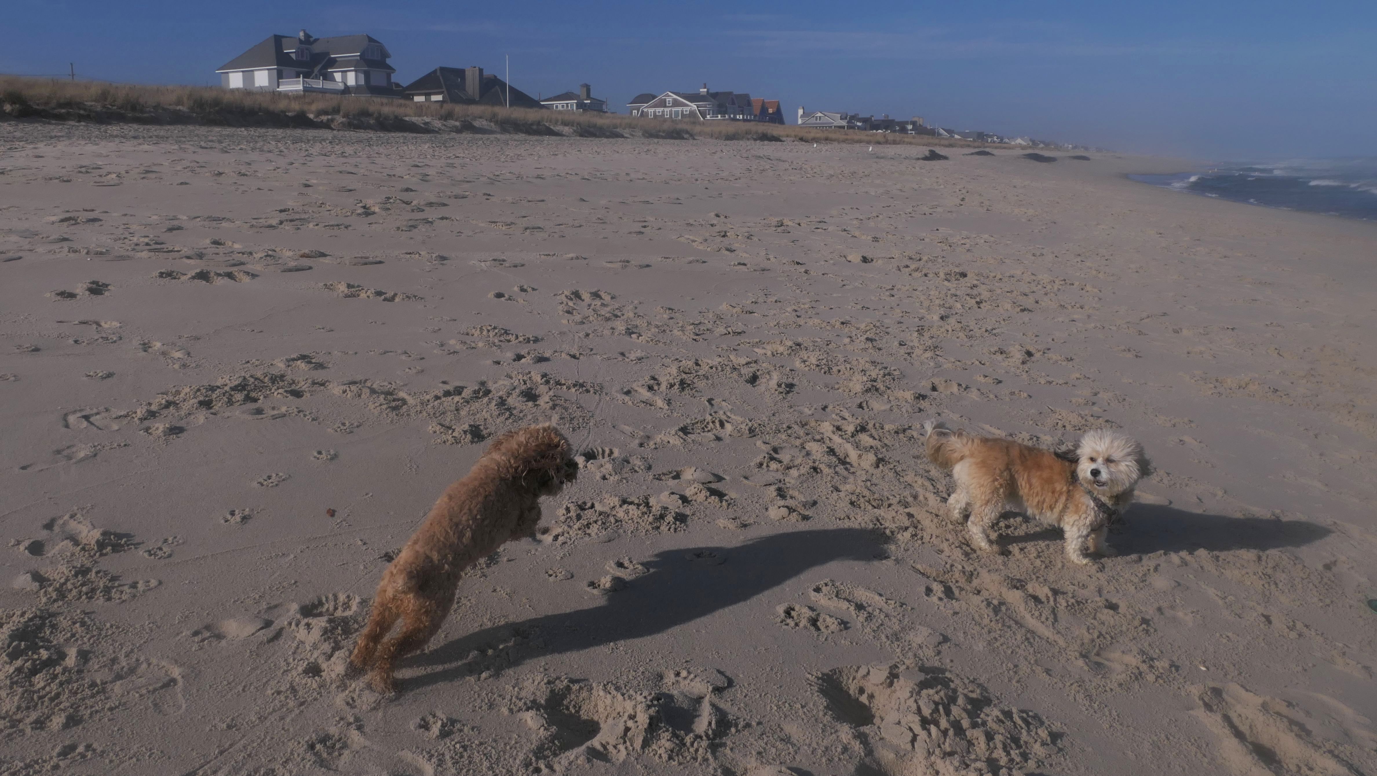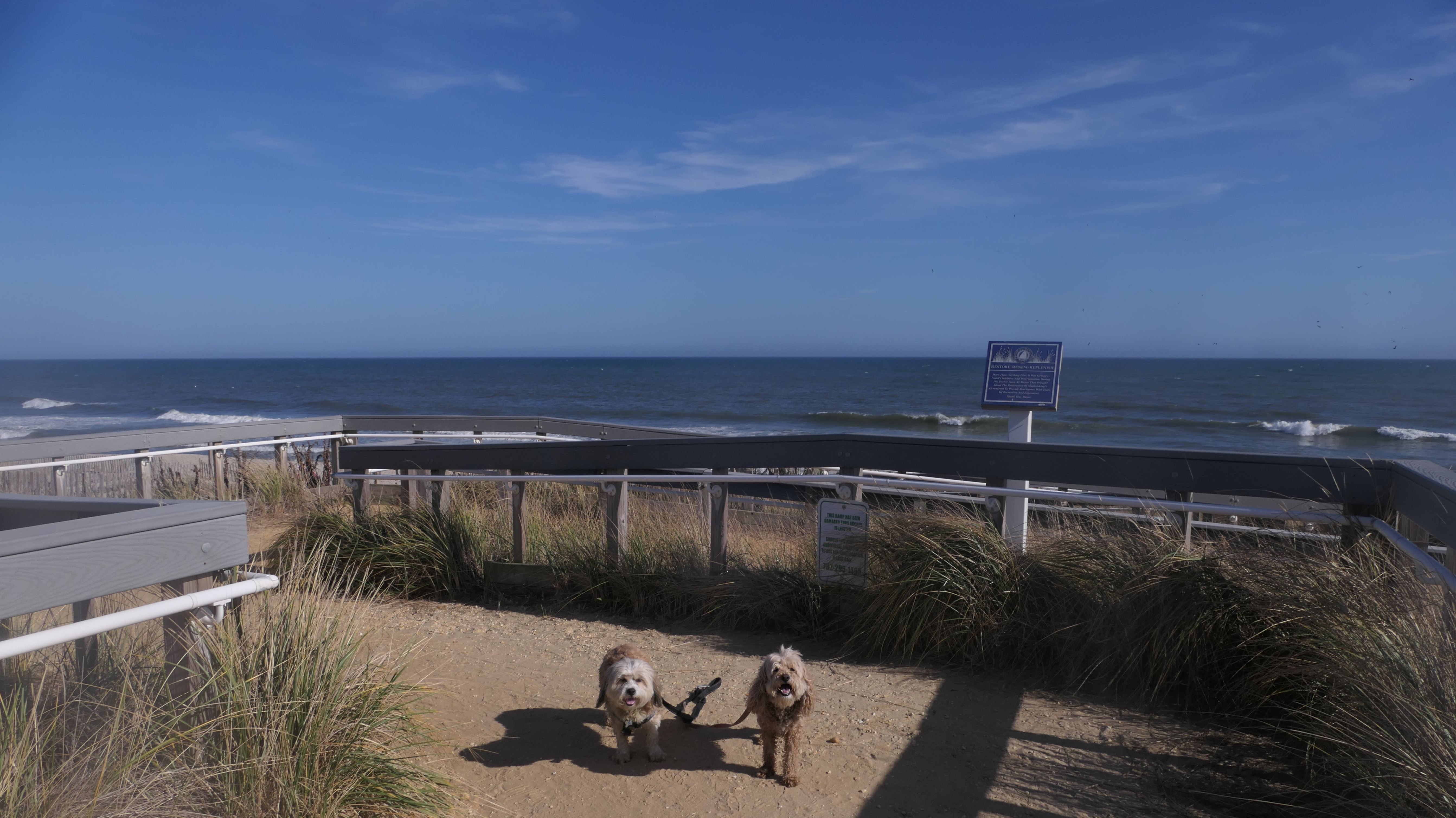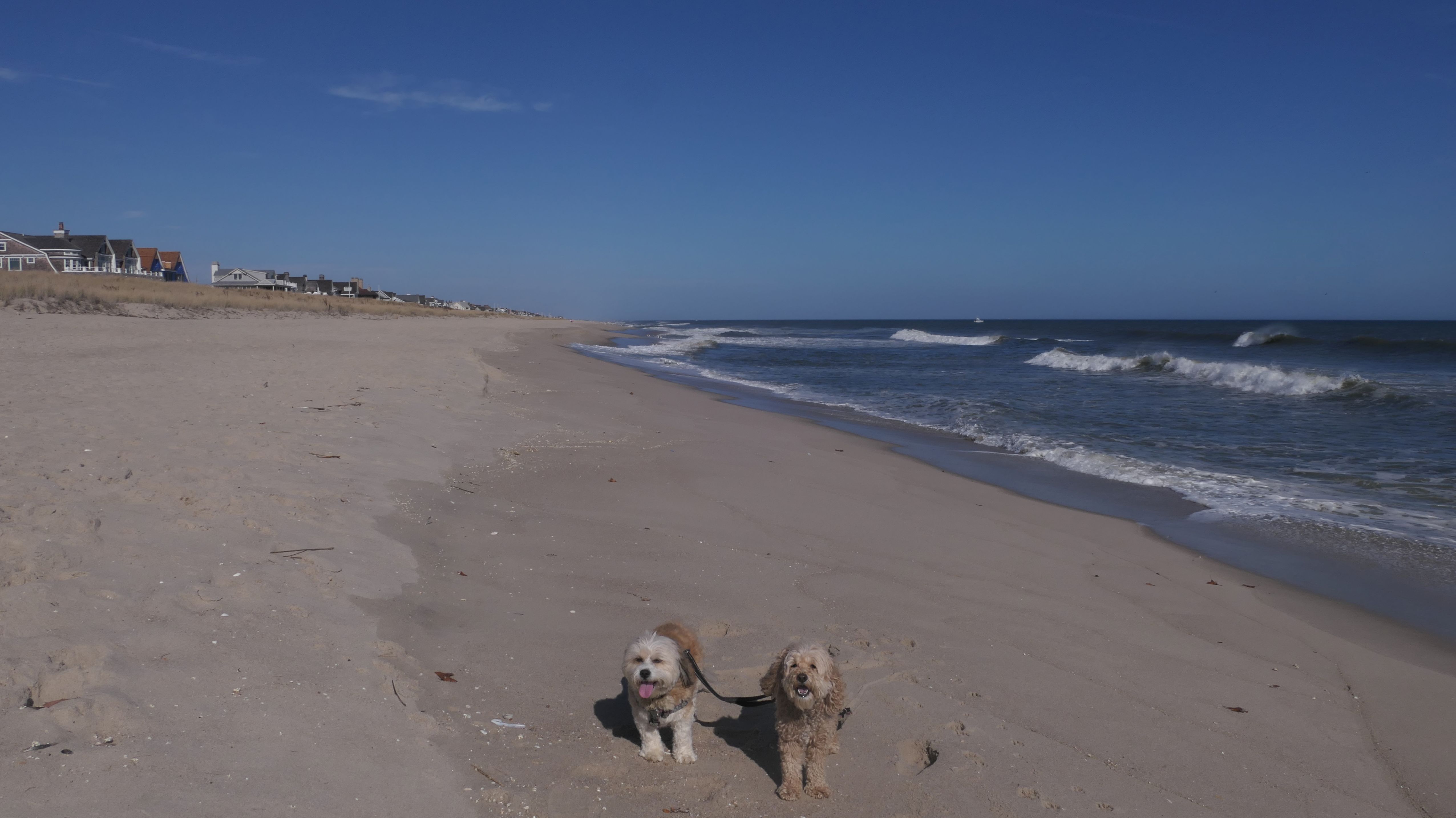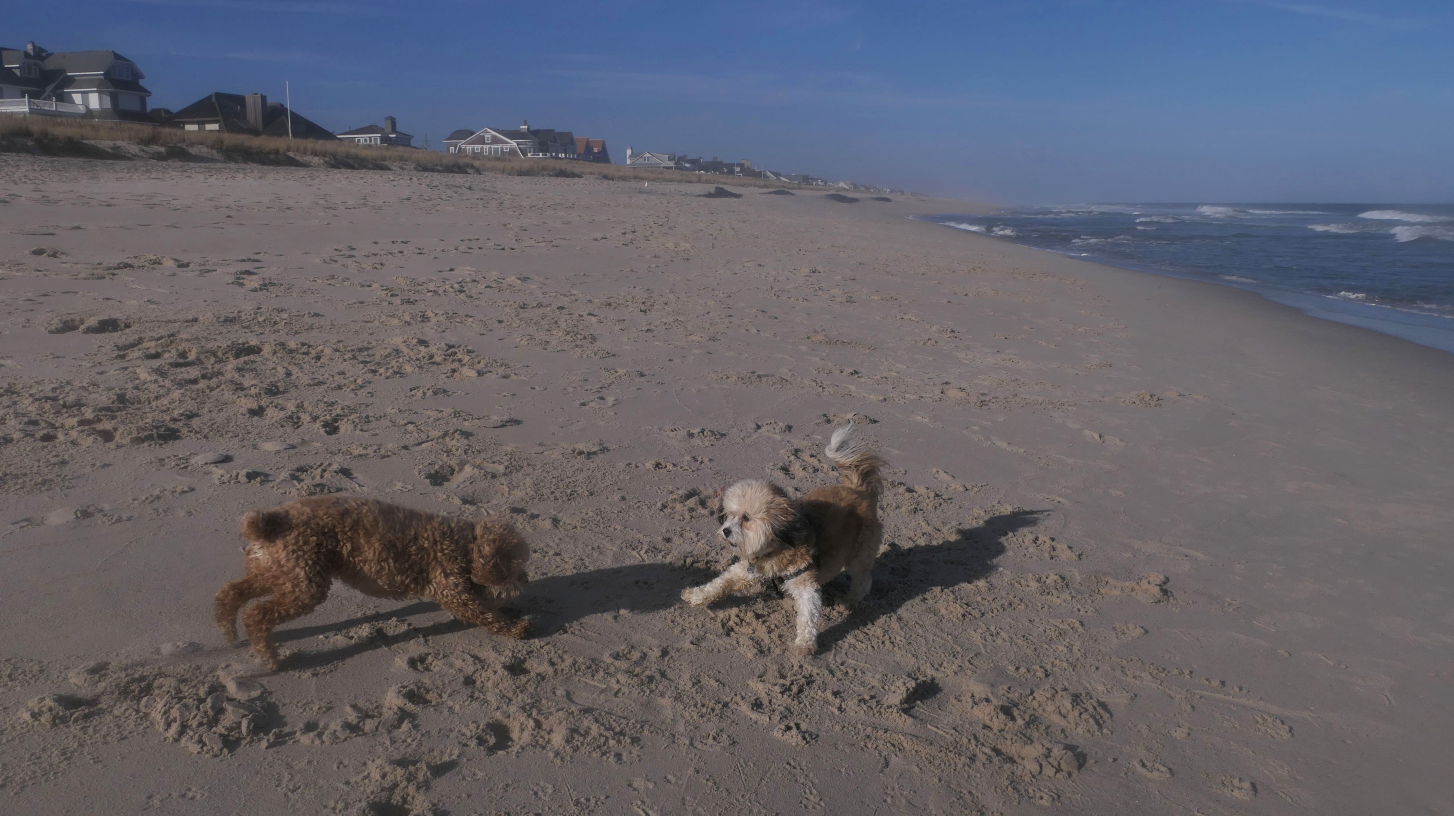 This was the final stop on our two day Jersey Shore adventure, which also included Mandy and Lexi's first night in a hotel, and beaches in Point Pleasant Beach and Bay Head. It was an unbelievably warm early November day. The beach got up to 78 degrees, while it was over 80 inland. There was a warm breeze, but it wasn't as windy as the day before. This beach was more dog-friendly than the others. There is a doggie waste station by the access point, with a poop bag dispenser. In the summer months (May 15th through October 1st) dogs are allowed between sunrise and 10AM, and from 6PM to sunset. In the off-season, they are allowed anytime, and are also allowed to be off-leash during the off-season as well! Since this was actually our second beach visit of the day, we kept the walk on the shorter side, but also took a brief detour to check out the town. Back at the beach, a dog with a dyed orange head arrived. Since the dogs could be off-leash, they had a new friend to play with. Even after that dog left, Mandy and Lexi ran around off-leash and did some of their patented doggie wrestling that they used to do frequently when they were younger! It was fun seeing them run around freely on a beautiful beach! This was a wonderful way to end our trip on a summer-like afternoon in November!