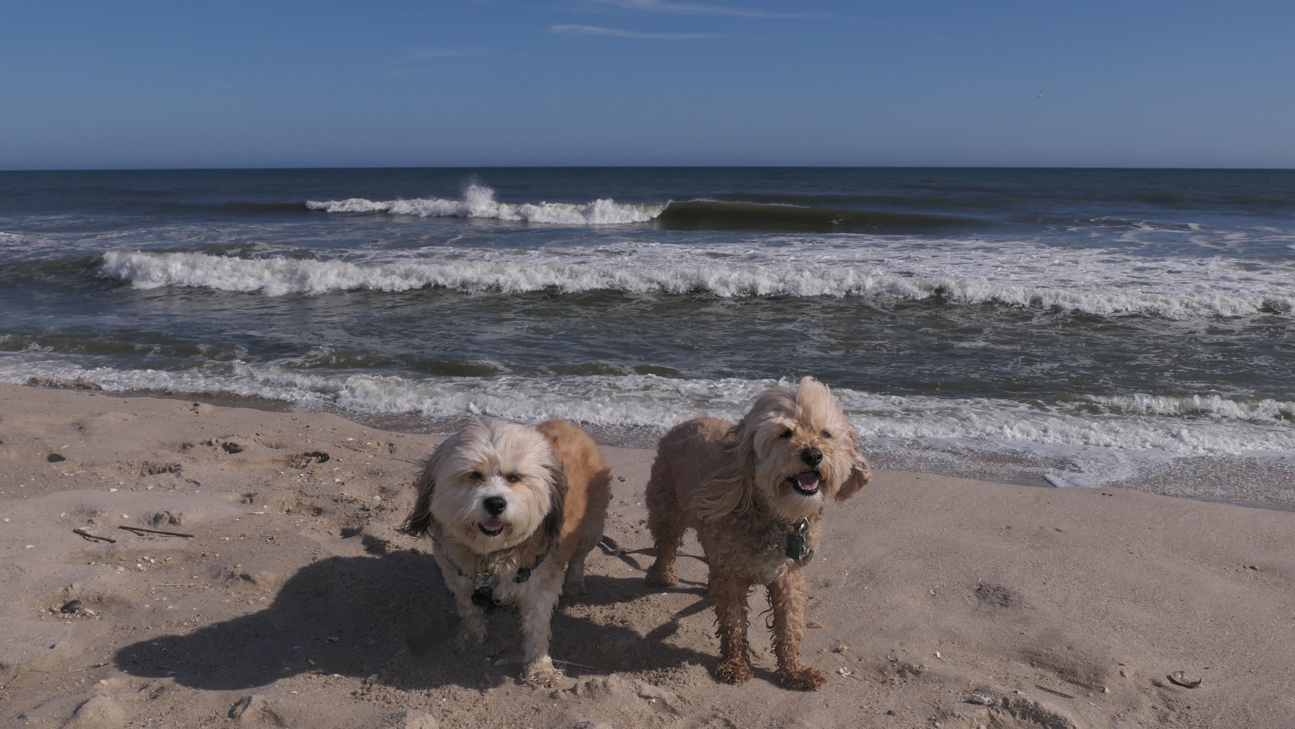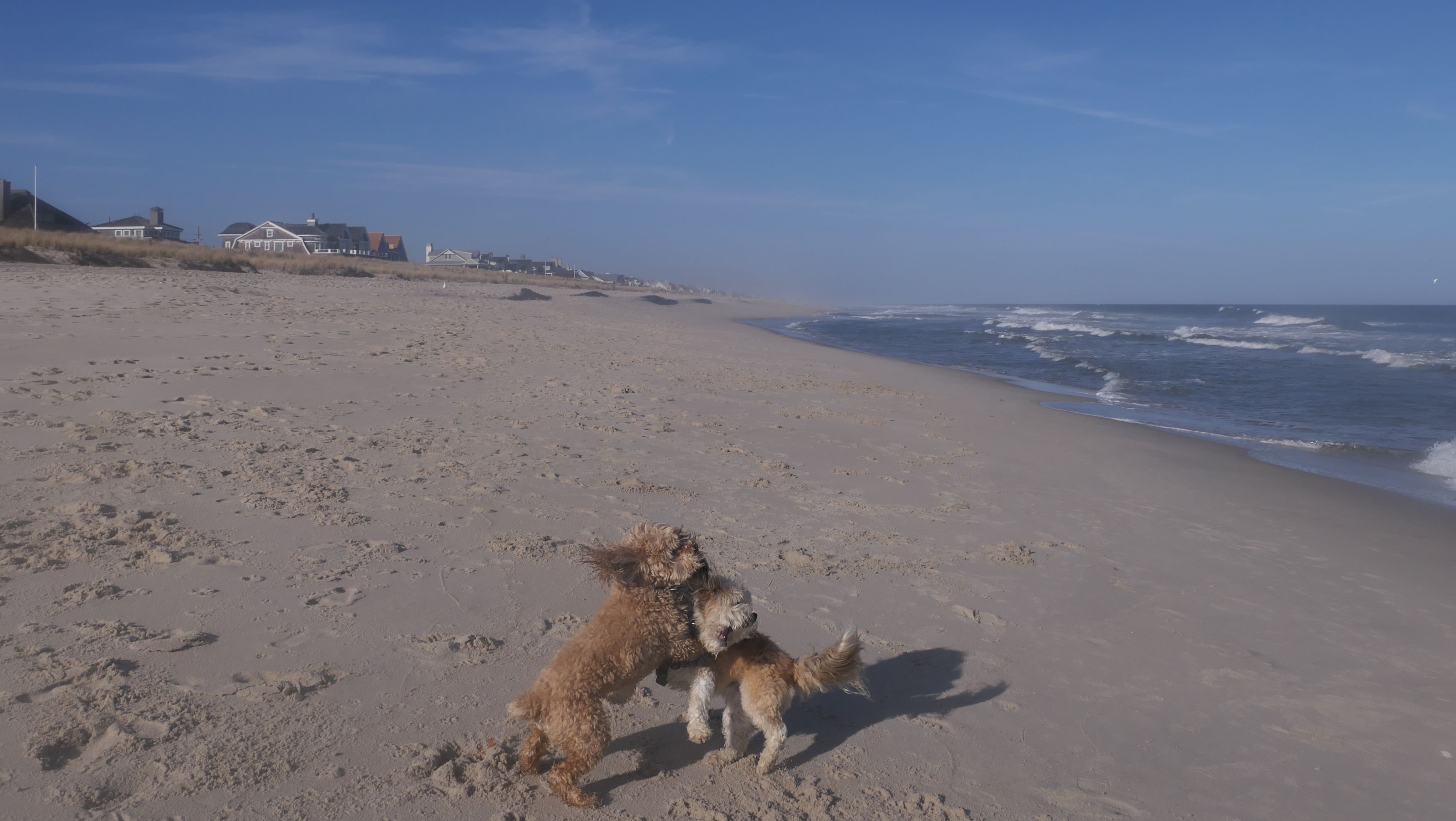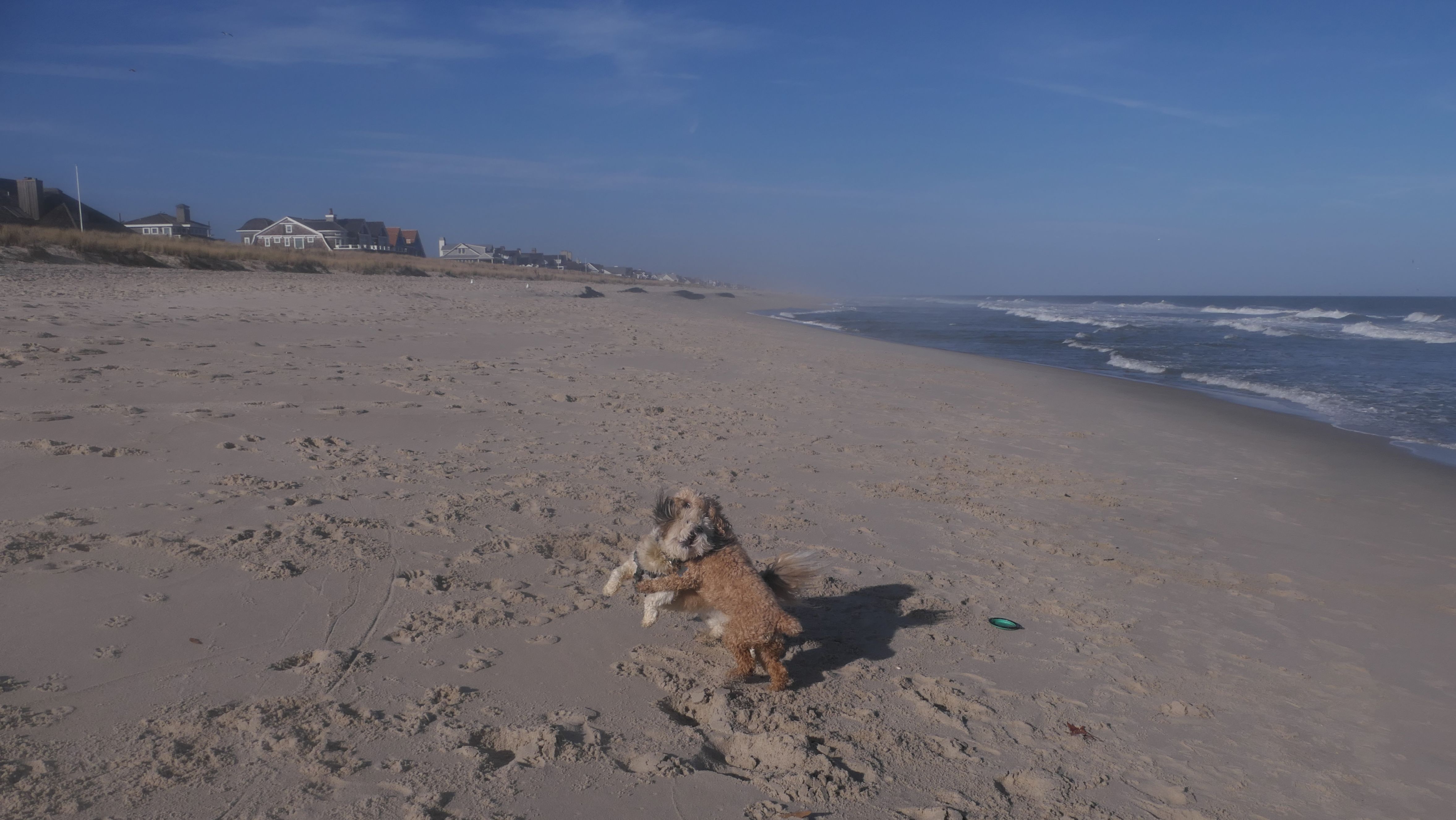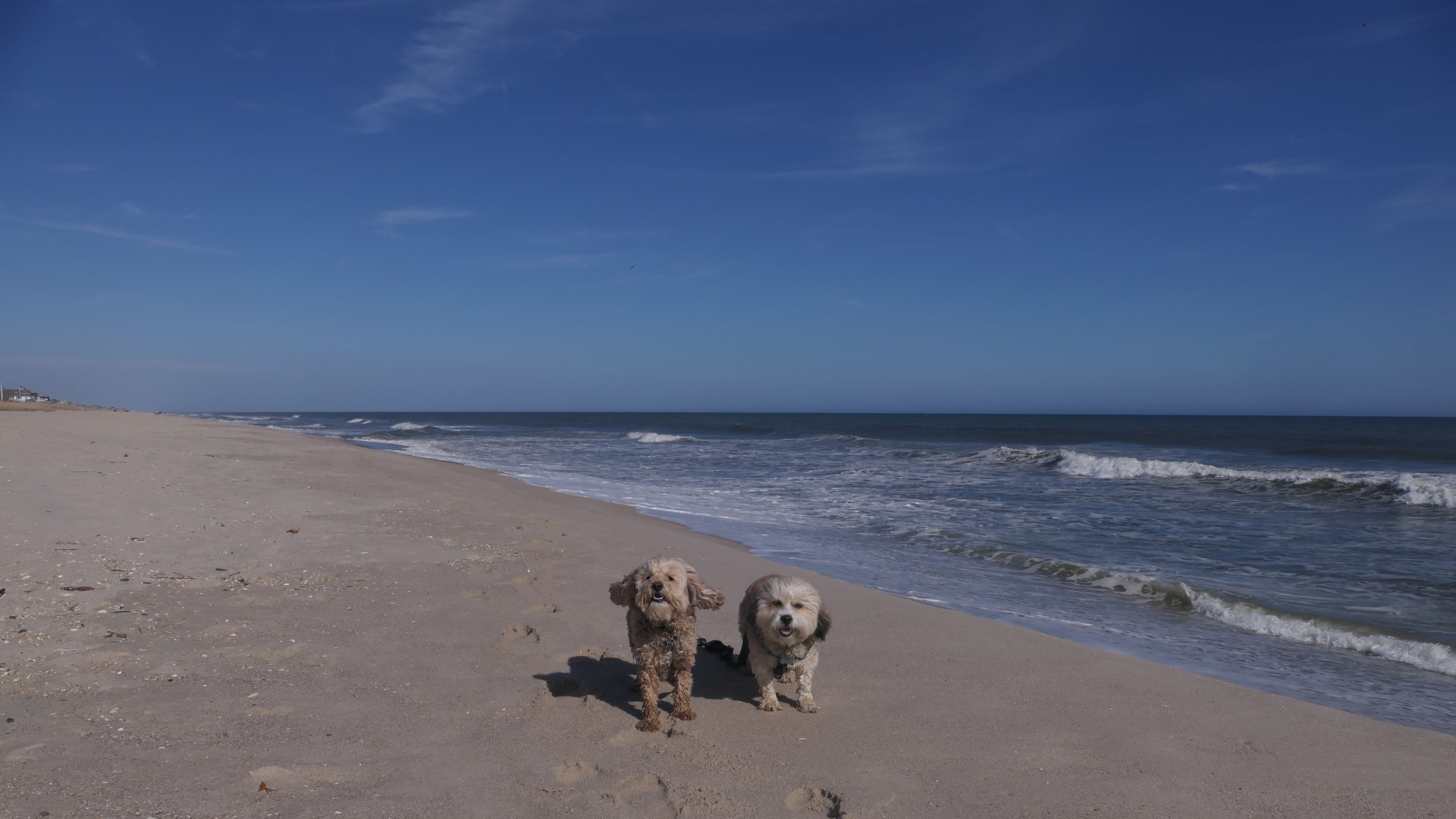 This was the final stop on our two day Jersey Shore adventure, which also included Mandy and Lexi's first night in a hotel, and beaches in Point Pleasant Beach and Bay Head. It was an unbelievably warm early November day. The beach got up to 78 degrees, while it was over 80 inland. There was a warm breeze, but it wasn't as windy as the day before. This beach was more dog-friendly than the others. There is a doggie waste station by the access point, with a poop bag dispenser. In the summer months (May 15th through October 1st) dogs are allowed between sunrise and 10AM, and from 6PM to sunset. In the off-season, they are allowed anytime, and are also allowed to be off-leash during the off-season as well! Since this was actually our second beach visit of the day, we kept the walk on the shorter side, but also took a brief detour to check out the town. Back at the beach, a dog with a dyed orange head arrived. Since the dogs could be off-leash, they had a new friend to play with. Even after that dog left, Mandy and Lexi ran around off-leash and did some of their patented doggie wrestling that they used to do frequently when they were younger! It was fun seeing them run around freely on a beautiful beach! This was a wonderful way to end our trip on a summer-like afternoon in November!