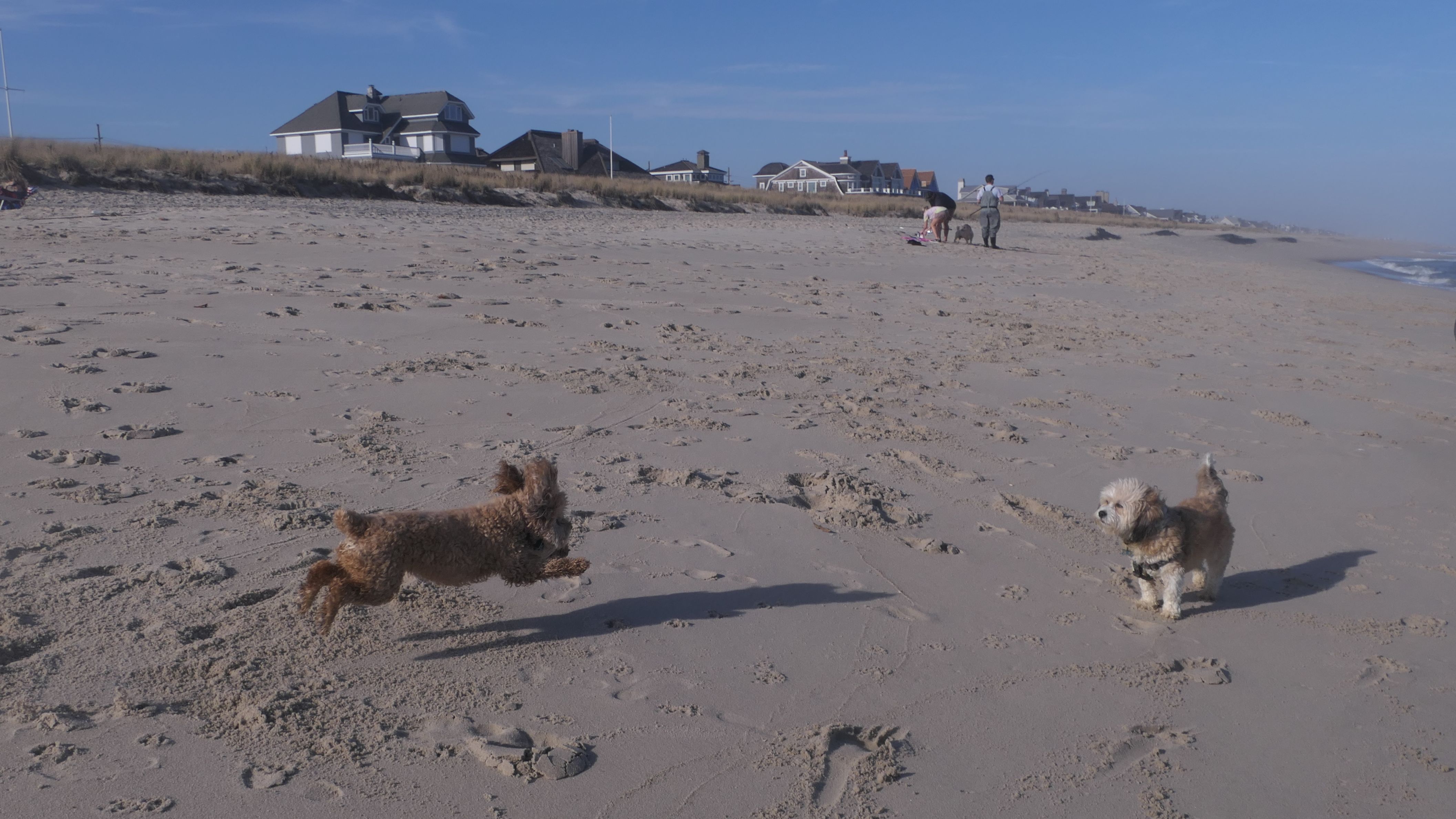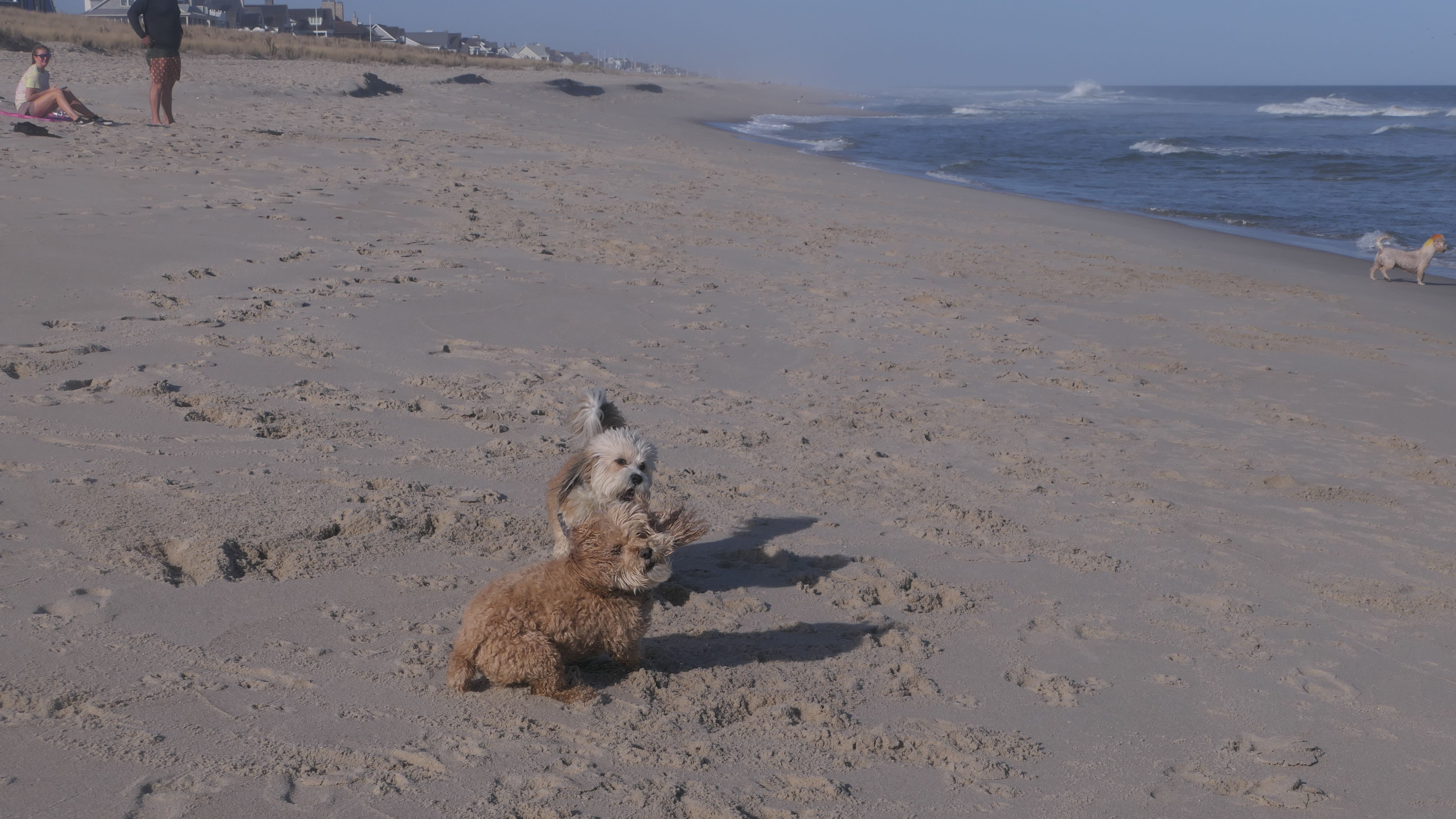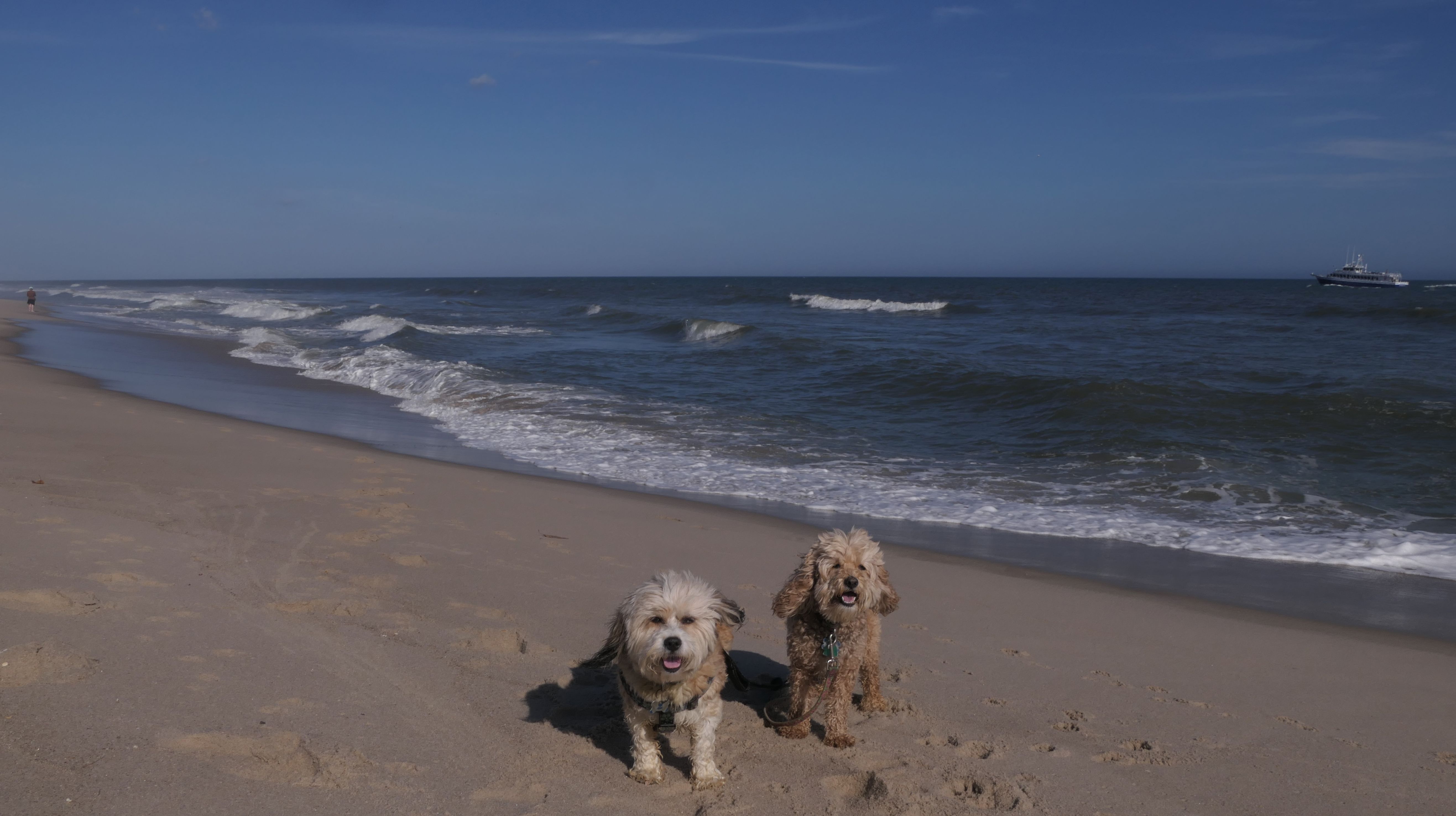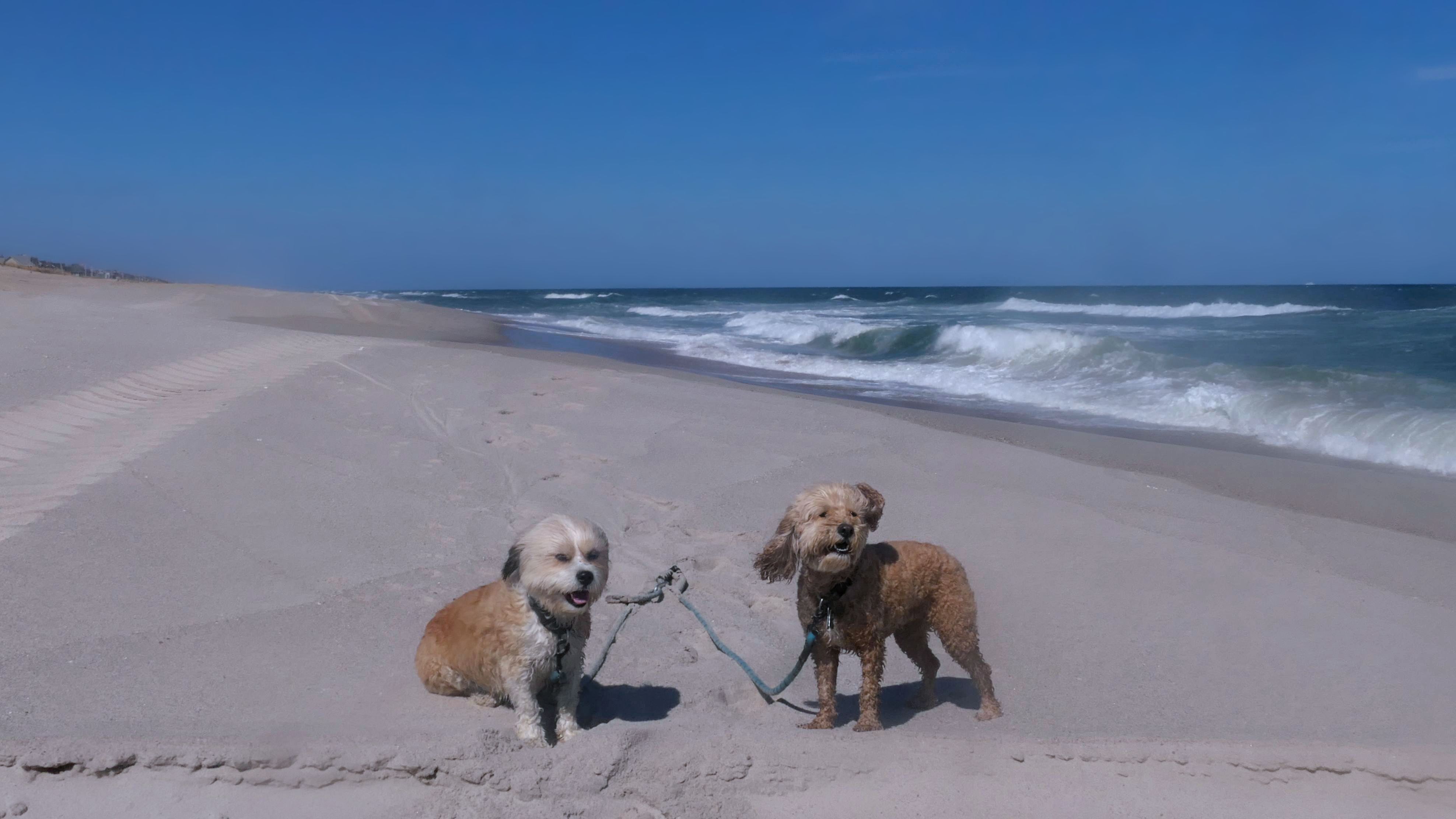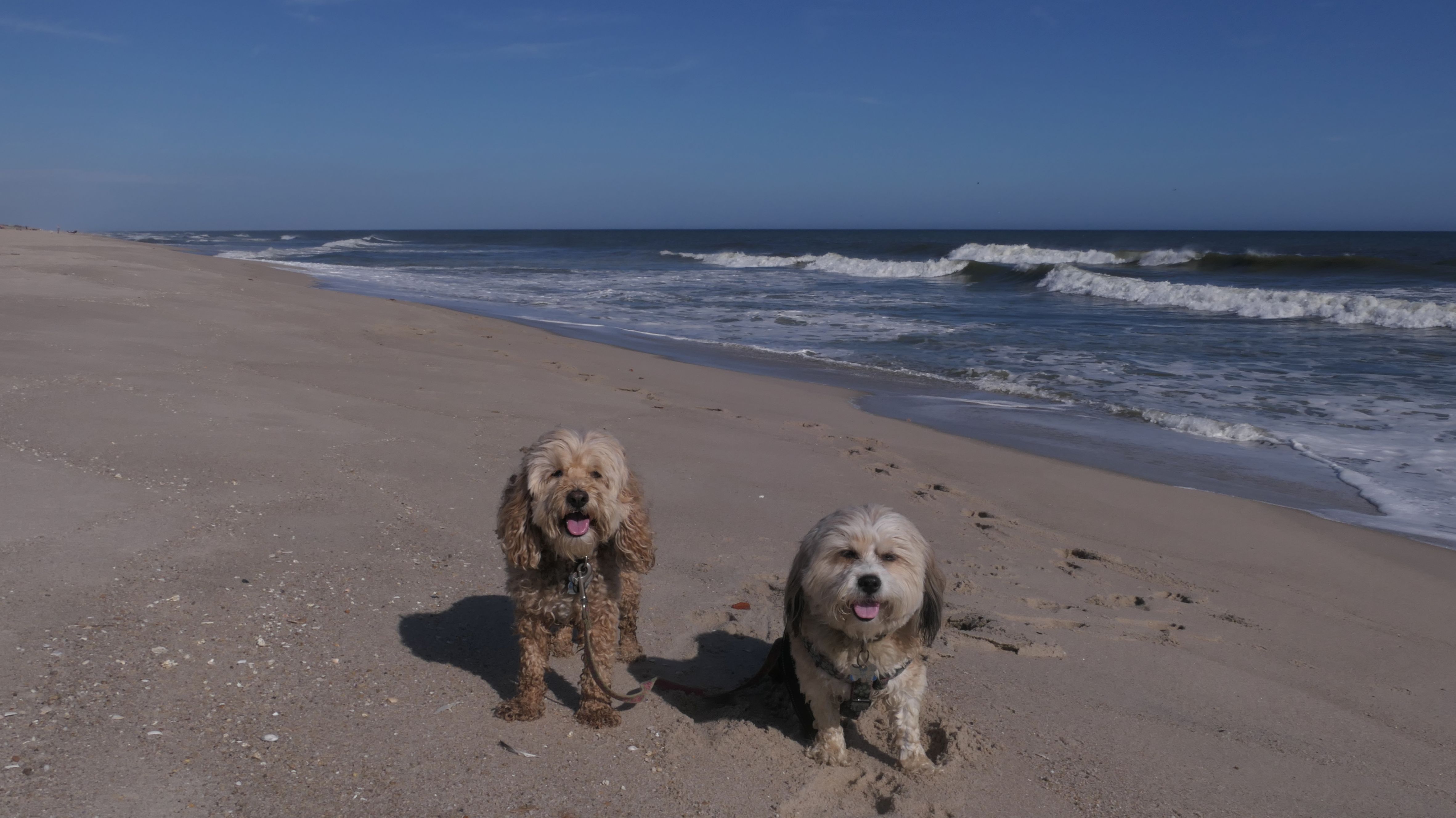 This was the final stop on our two day Jersey Shore adventure, which also included Mandy and Lexi's first night in a hotel, and beaches in Point Pleasant Beach and Bay Head. It was an unbelievably warm early November day. The beach got up to 78 degrees, while it was over 80 inland. There was a warm breeze, but it wasn't as windy as the day before. This beach was more dog-friendly than the others. There is a doggie waste station by the access point, with a poop bag dispenser. In the summer months (May 15th through October 1st) dogs are allowed between sunrise and 10AM, and from 6PM to sunset. In the off-season, they are allowed anytime, and are also allowed to be off-leash during the off-season as well! Since this was actually our second beach visit of the day, we kept the walk on the shorter side, but also took a brief detour to check out the town. Back at the beach, a dog with a dyed orange head arrived. Since the dogs could be off-leash, they had a new friend to play with. Even after that dog left, Mandy and Lexi ran around off-leash and did some of their patented doggie wrestling that they used to do frequently when they were younger! It was fun seeing them run around freely on a beautiful beach! This was a wonderful way to end our trip on a summer-like afternoon in November!
