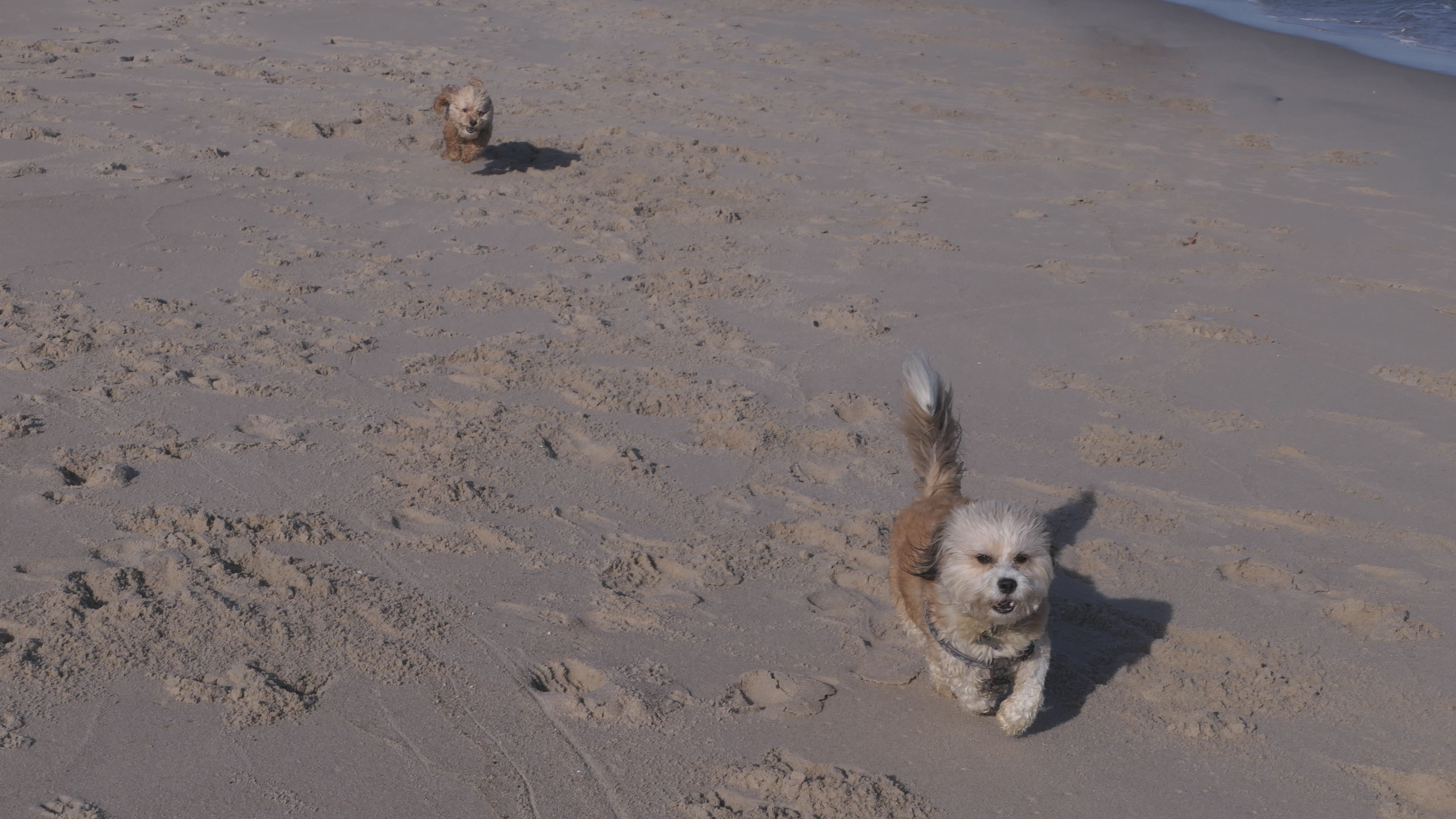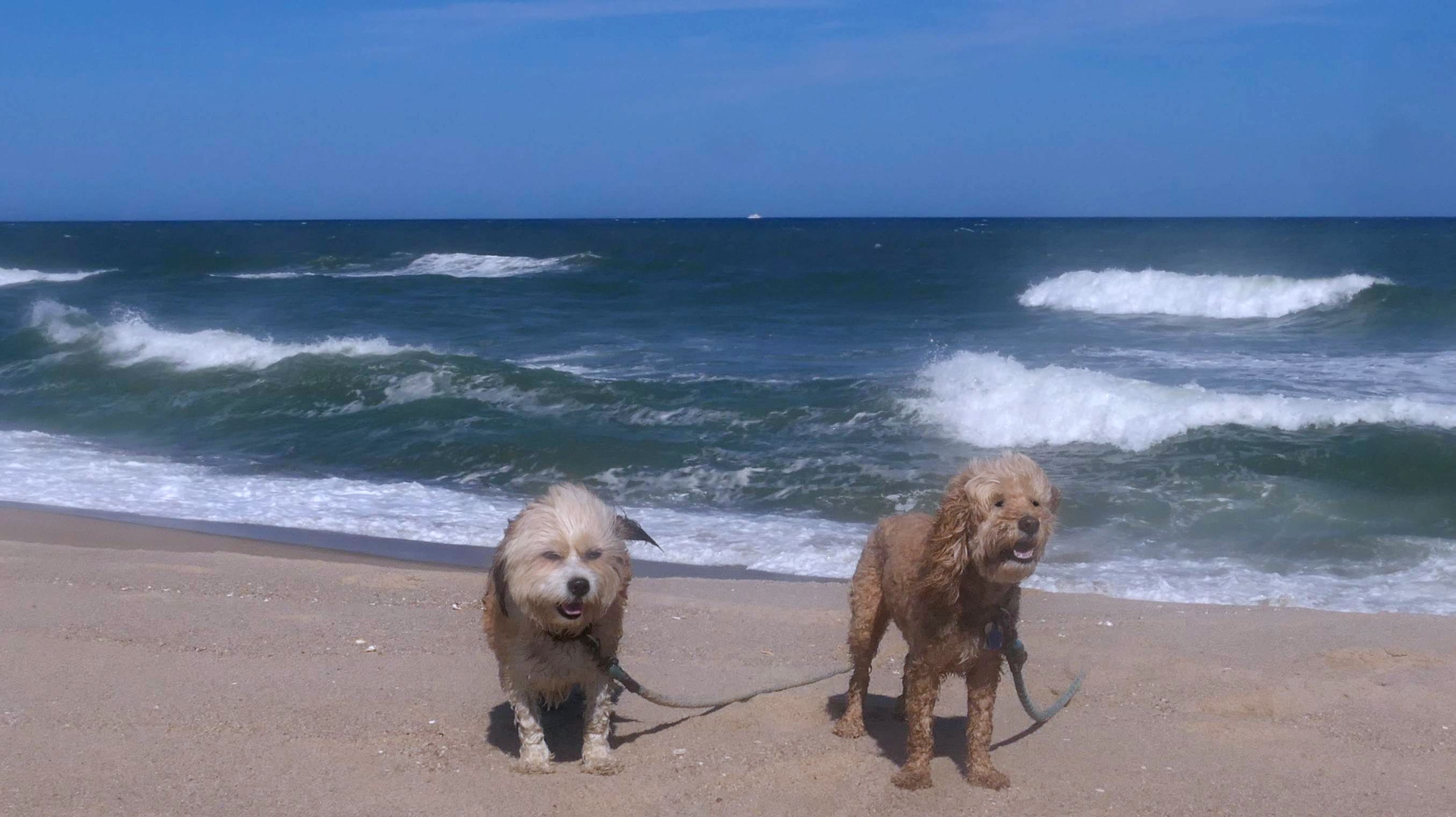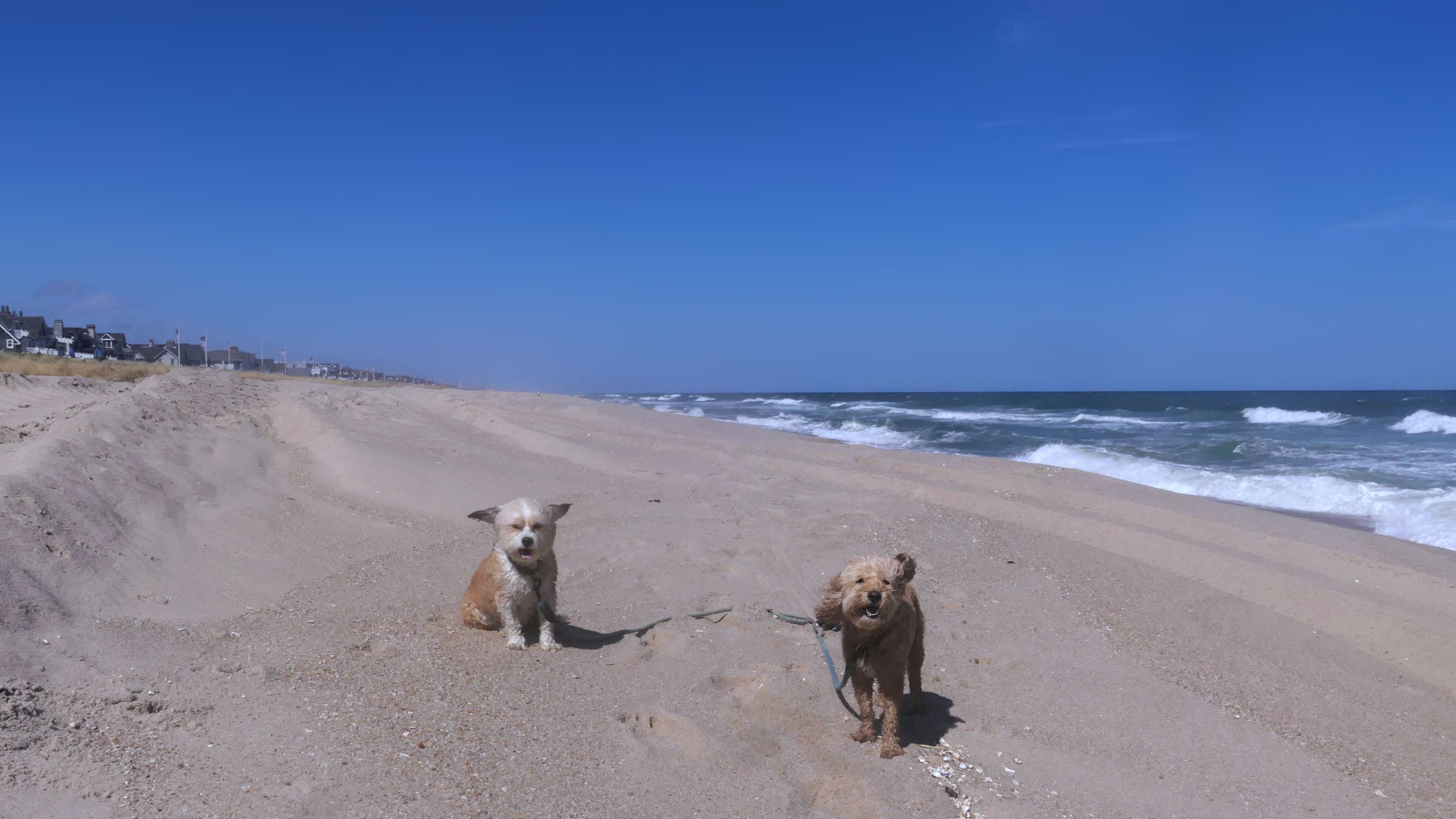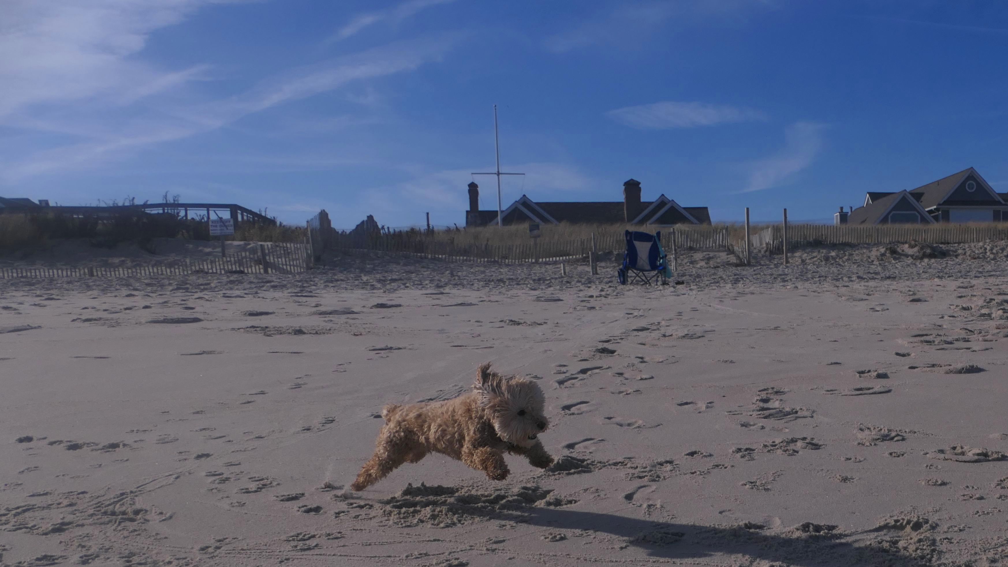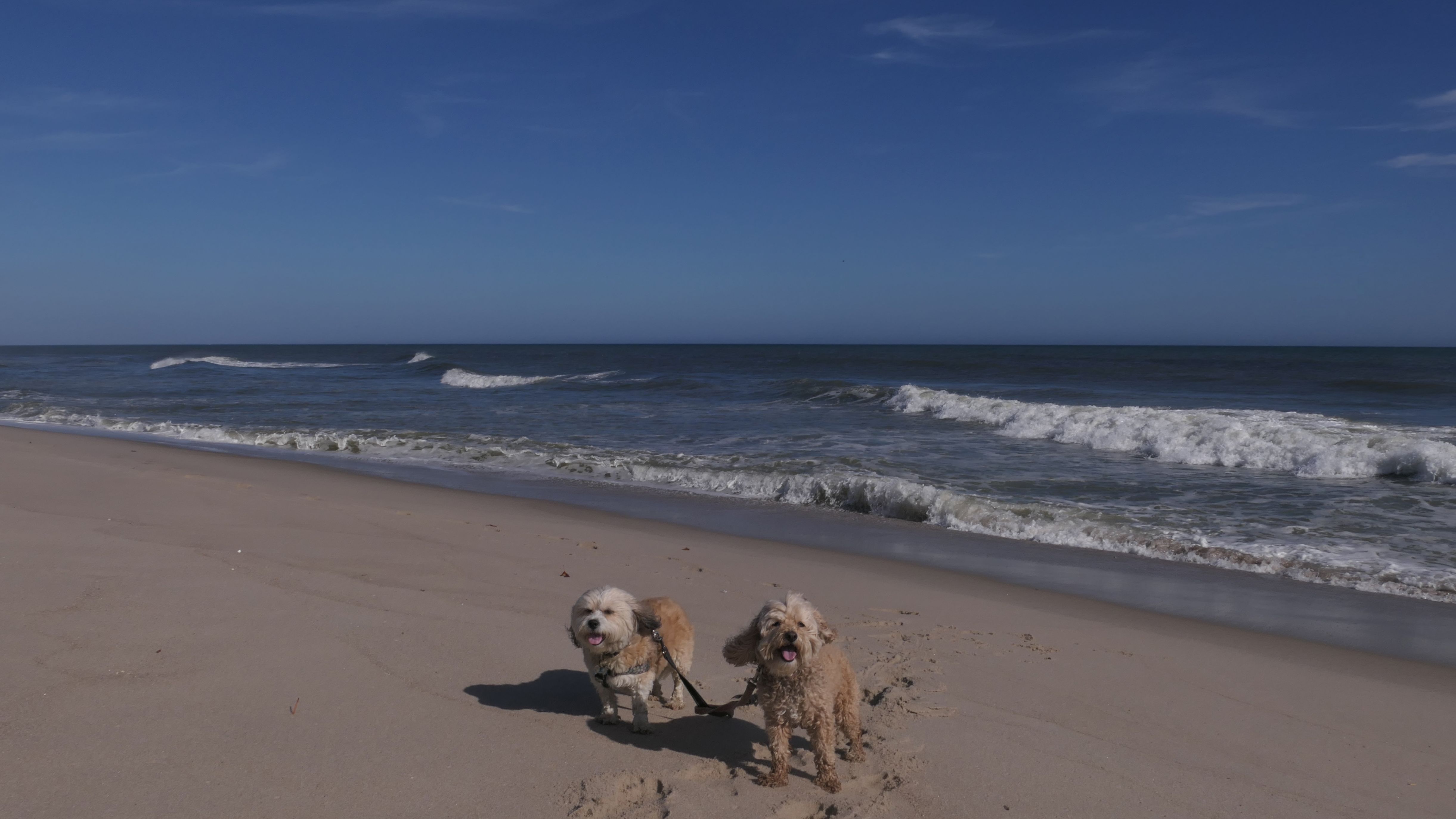 This was the final stop on our two day Jersey Shore adventure, which also included Mandy and Lexi's first night in a hotel, and beaches in Point Pleasant Beach and Bay Head. It was an unbelievably warm early November day. The beach got up to 78 degrees, while it was over 80 inland. There was a warm breeze, but it wasn't as windy as the day before. This beach was more dog-friendly than the others. There is a doggie waste station by the access point, with a poop bag dispenser. In the summer months (May 15th through October 1st) dogs are allowed between sunrise and 10AM, and from 6PM to sunset. In the off-season, they are allowed anytime, and are also allowed to be off-leash during the off-season as well! Since this was actually our second beach visit of the day, we kept the walk on the shorter side, but also took a brief detour to check out the town. Back at the beach, a dog with a dyed orange head arrived. Since the dogs could be off-leash, they had a new friend to play with. Even after that dog left, Mandy and Lexi ran around off-leash and did some of their patented doggie wrestling that they used to do frequently when they were younger! It was fun seeing them run around freely on a beautiful beach! This was a wonderful way to end our trip on a summer-like afternoon in November!