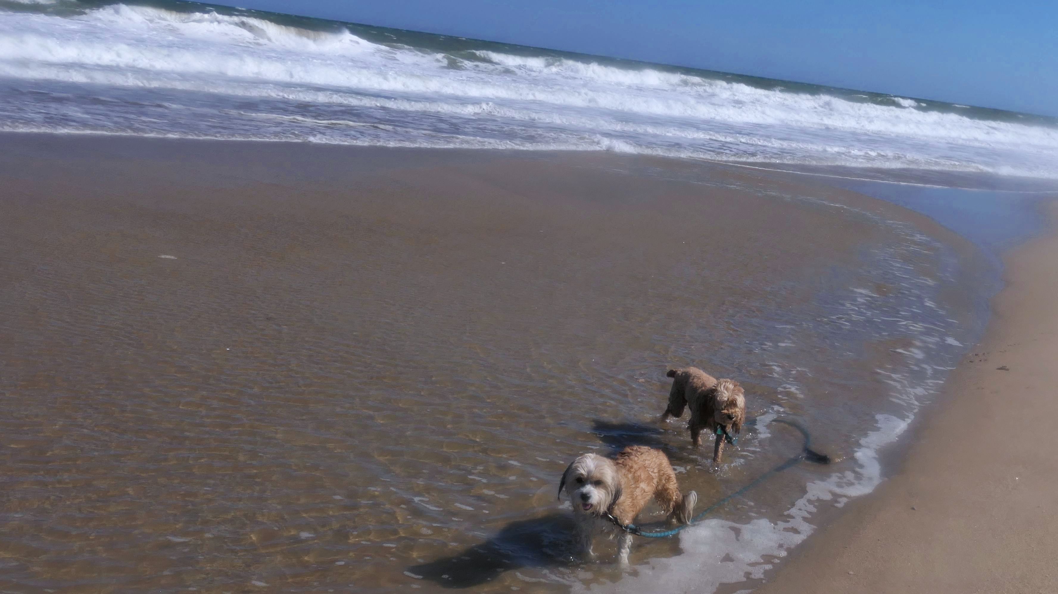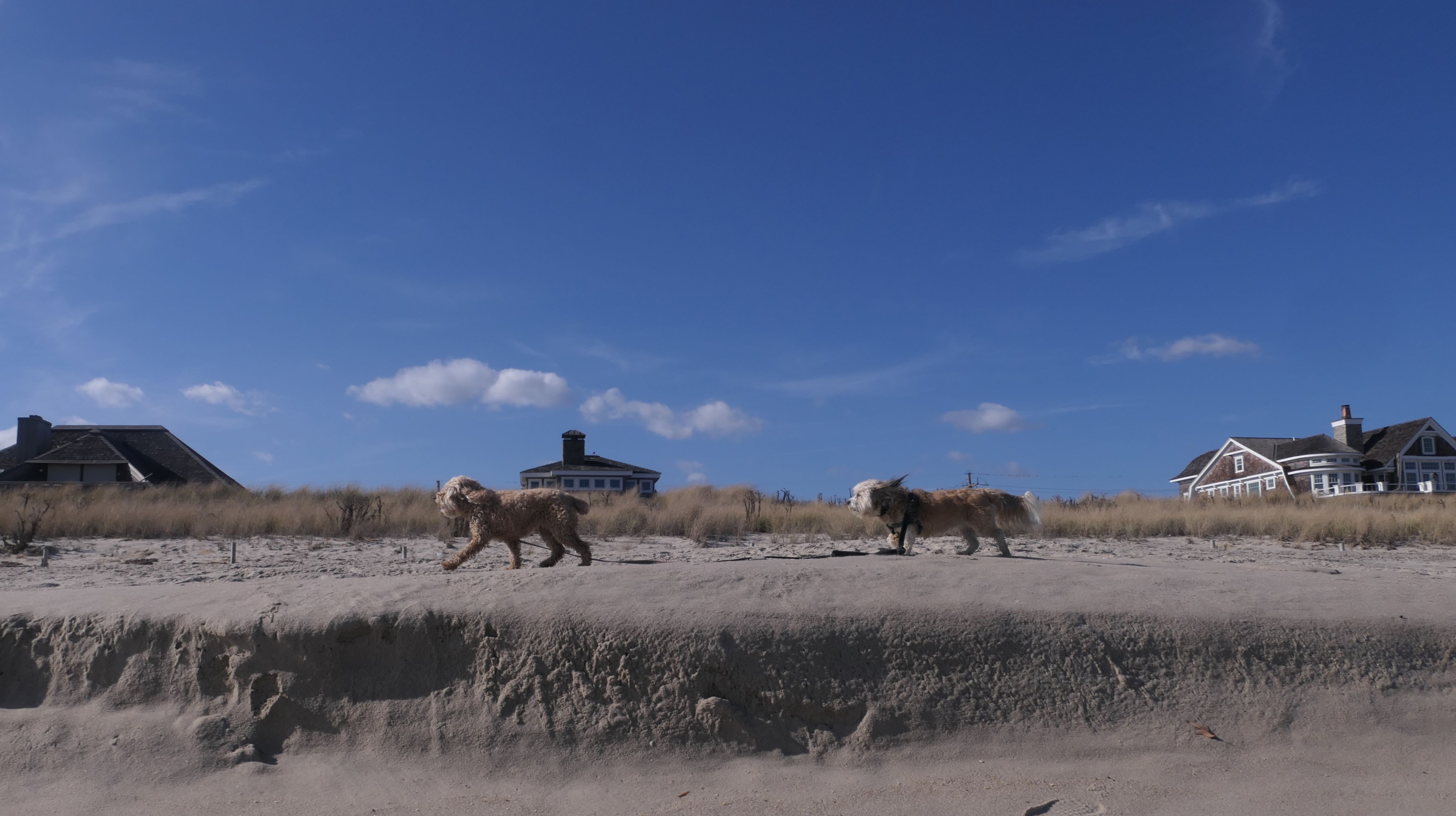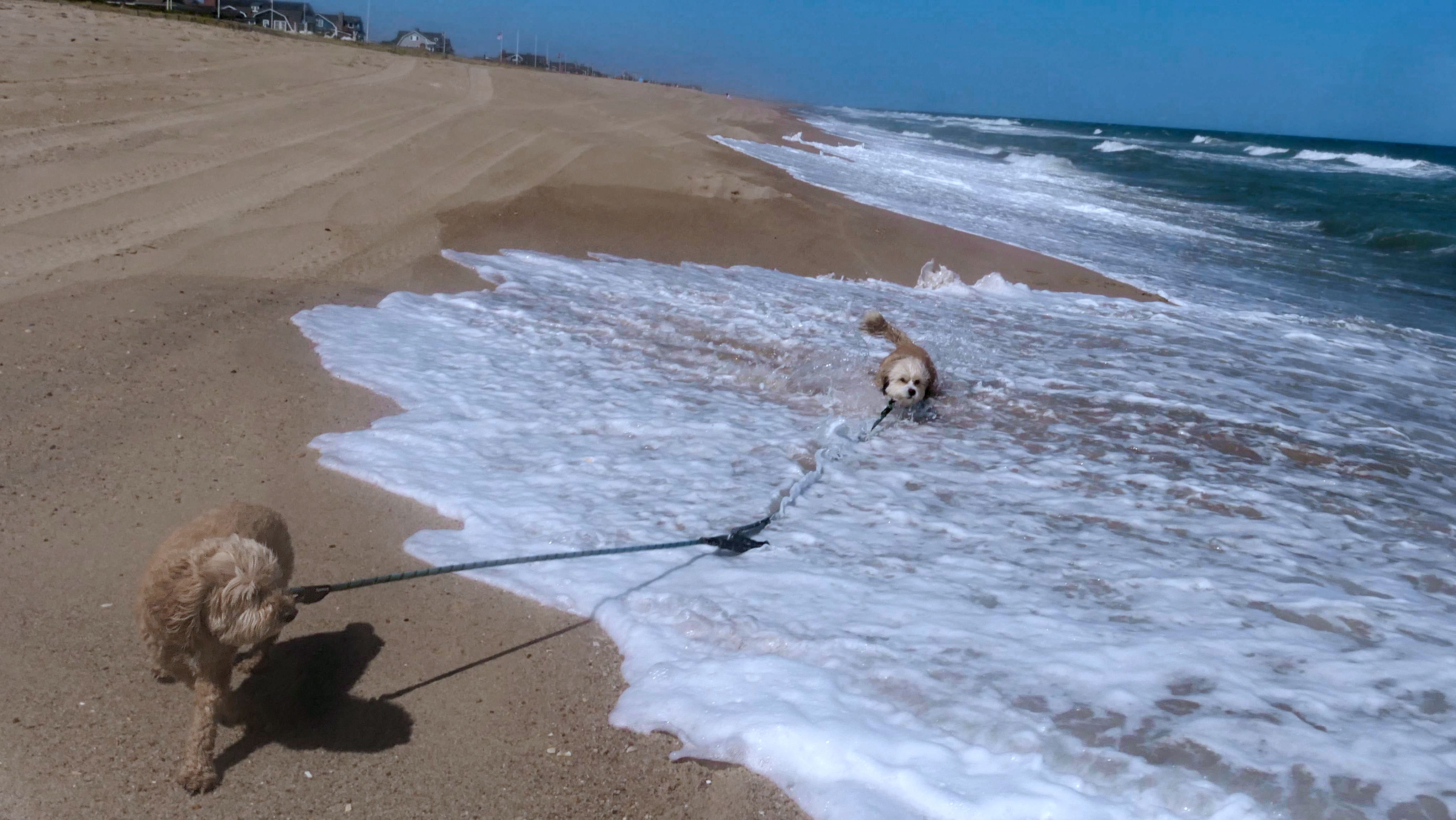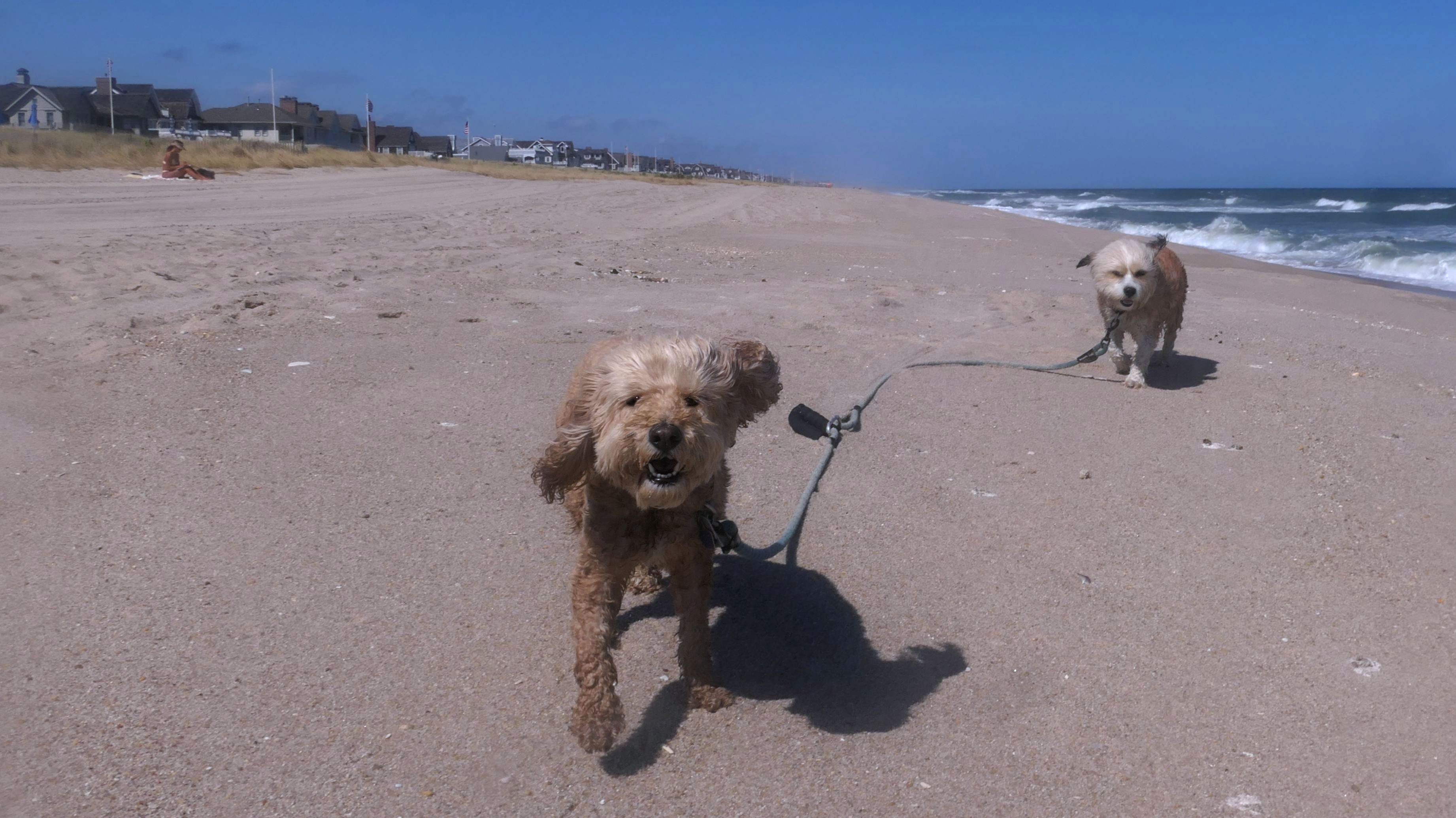 This was the final stop on our two day Jersey Shore adventure, which also included Mandy and Lexi's first night in a hotel, and beaches in Point Pleasant Beach and Bay Head. It was an unbelievably warm early November day. The beach got up to 78 degrees, while it was over 80 inland. There was a warm breeze, but it wasn't as windy as the day before. This beach was more dog-friendly than the others. There is a doggie waste station by the access point, with a poop bag dispenser. In the summer months (May 15th through October 1st) dogs are allowed between sunrise and 10AM, and from 6PM to sunset. In the off-season, they are allowed anytime, and are also allowed to be off-leash during the off-season as well! Since this was actually our second beach visit of the day, we kept the walk on the shorter side, but also took a brief detour to check out the town. Back at the beach, a dog with a dyed orange head arrived. Since the dogs could be off-leash, they had a new friend to play with. Even after that dog left, Mandy and Lexi ran around off-leash and did some of their patented doggie wrestling that they used to do frequently when they were younger! It was fun seeing them run around freely on a beautiful beach! This was a wonderful way to end our trip on a summer-like afternoon in November!