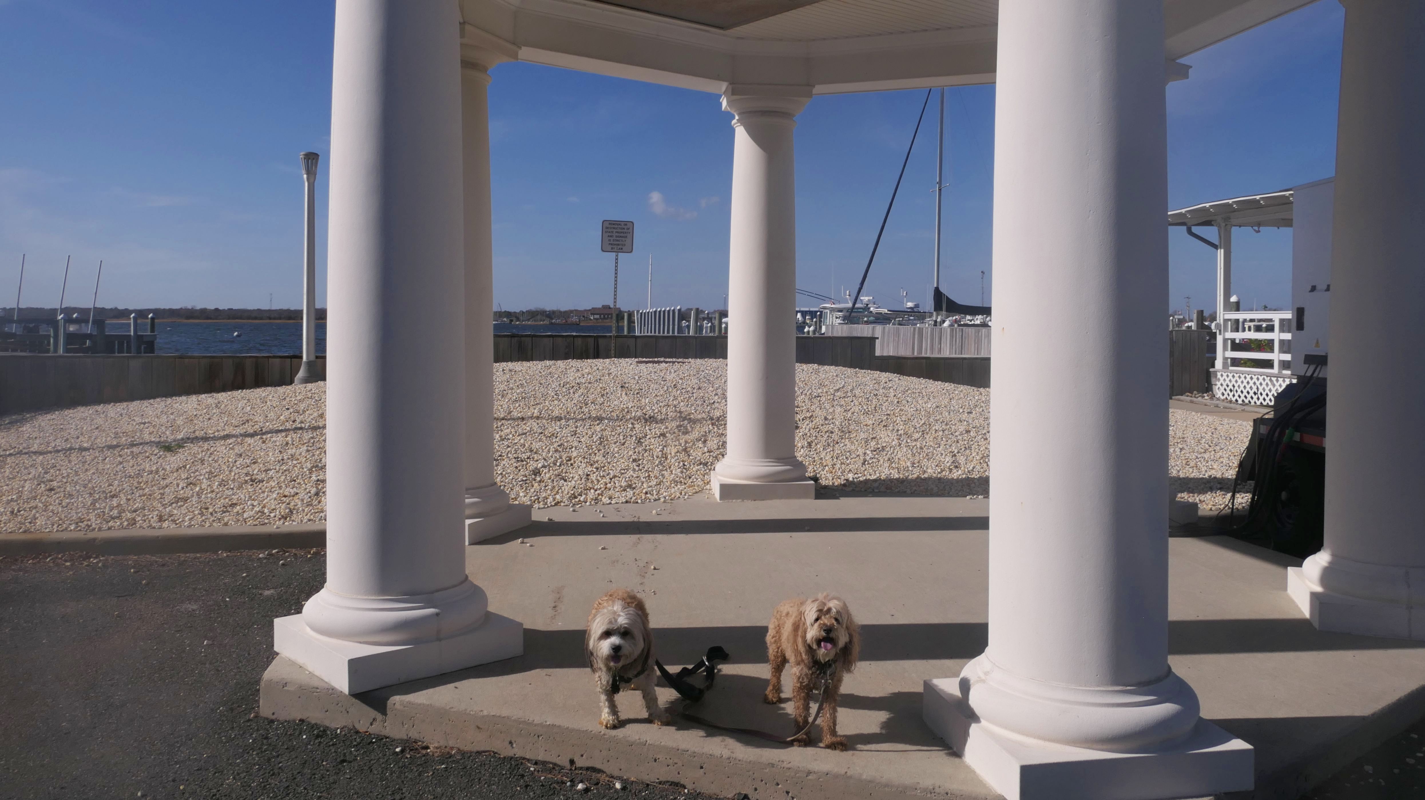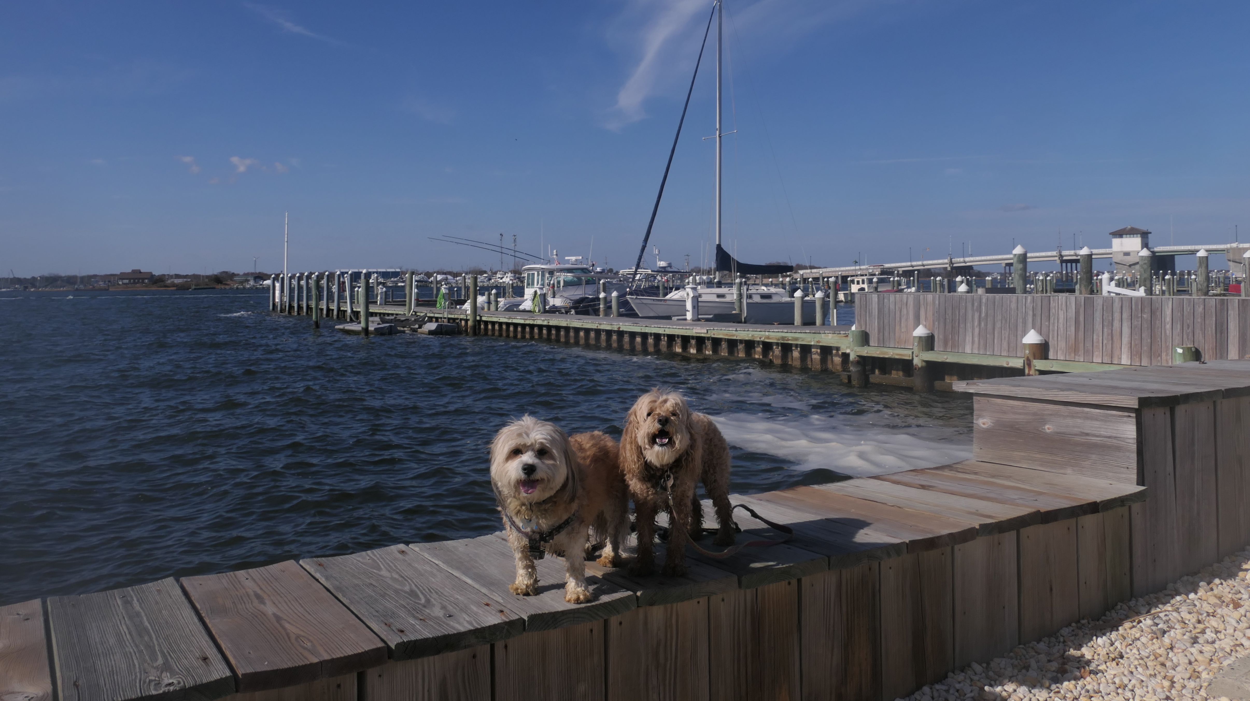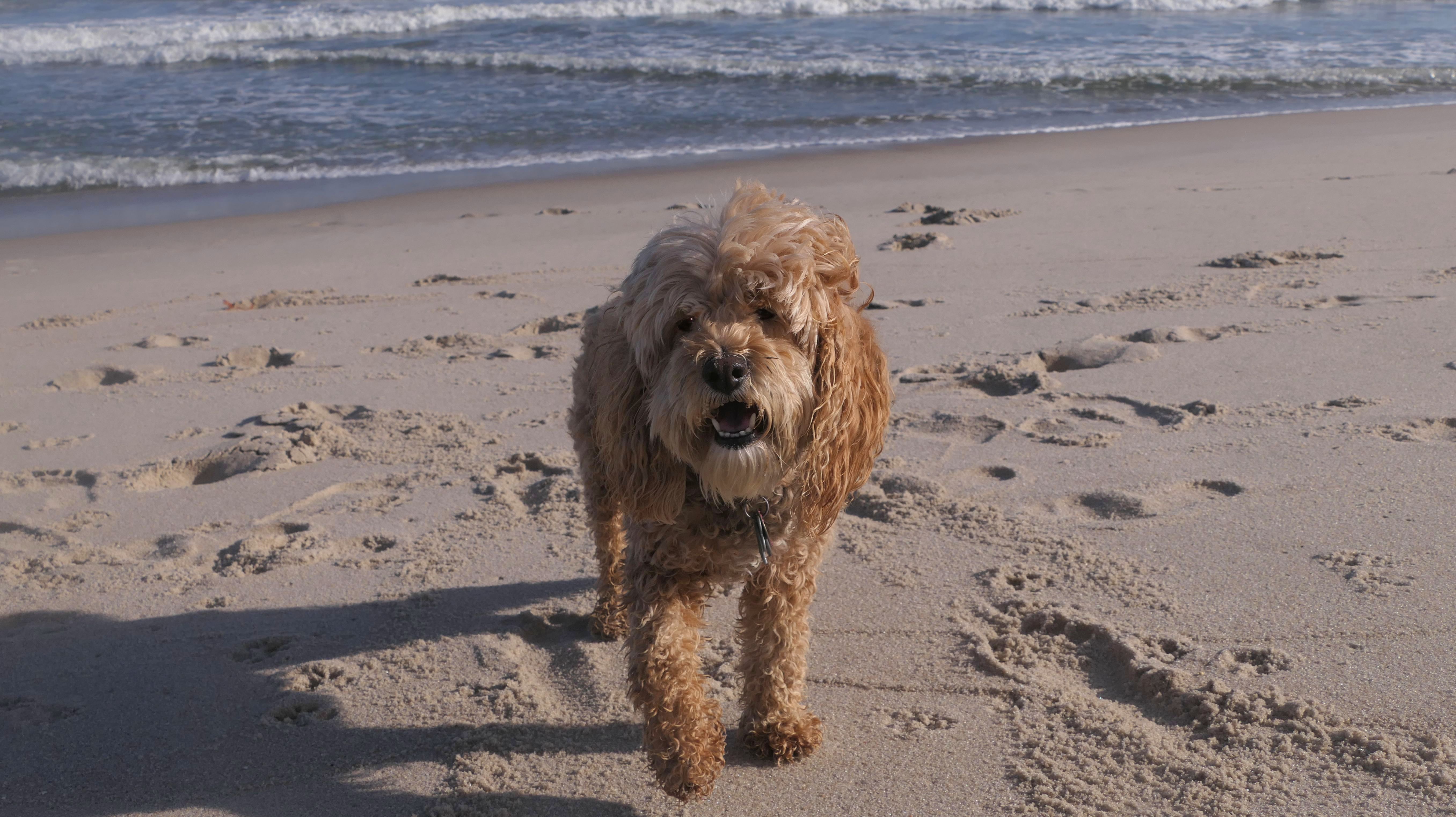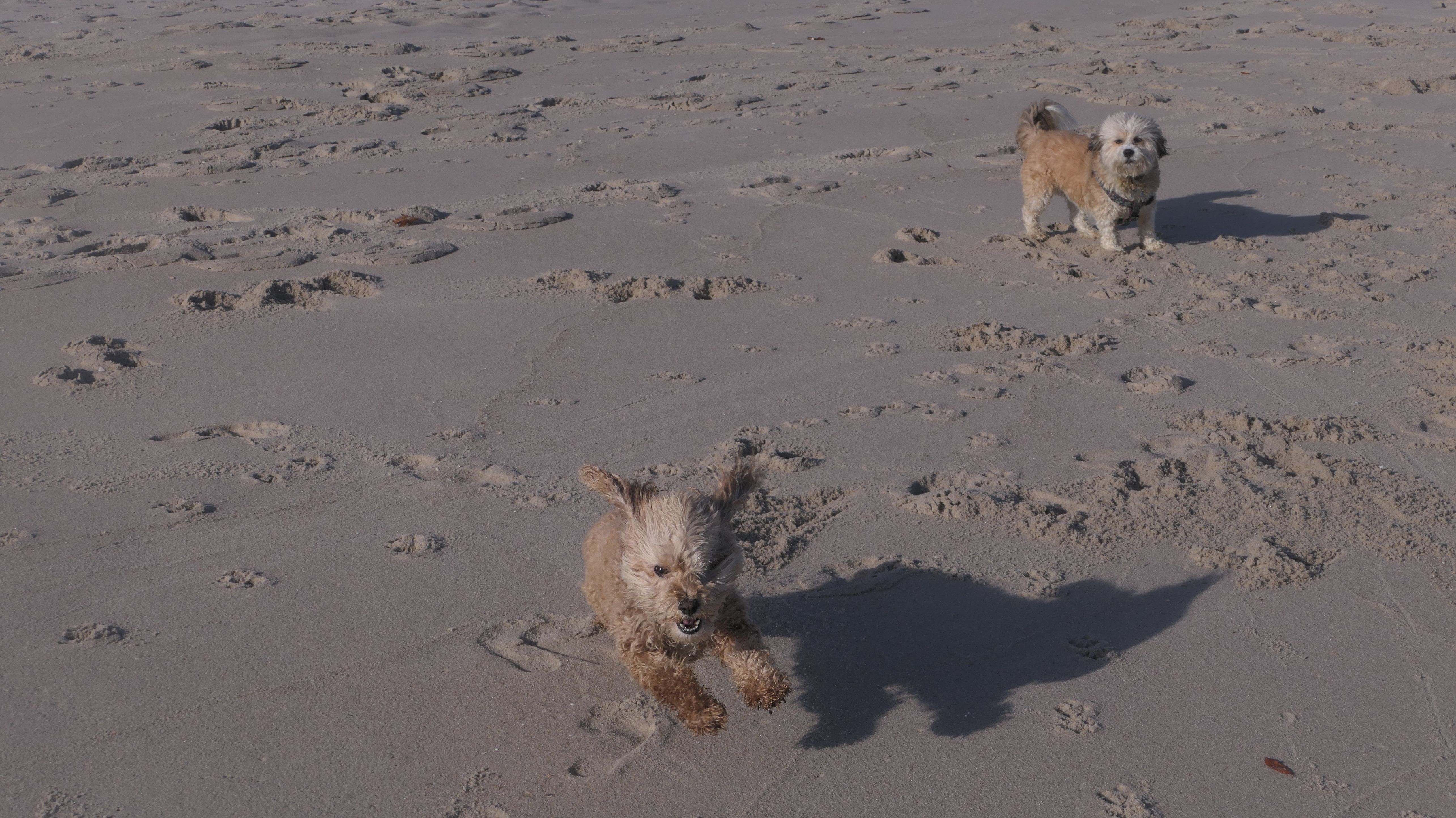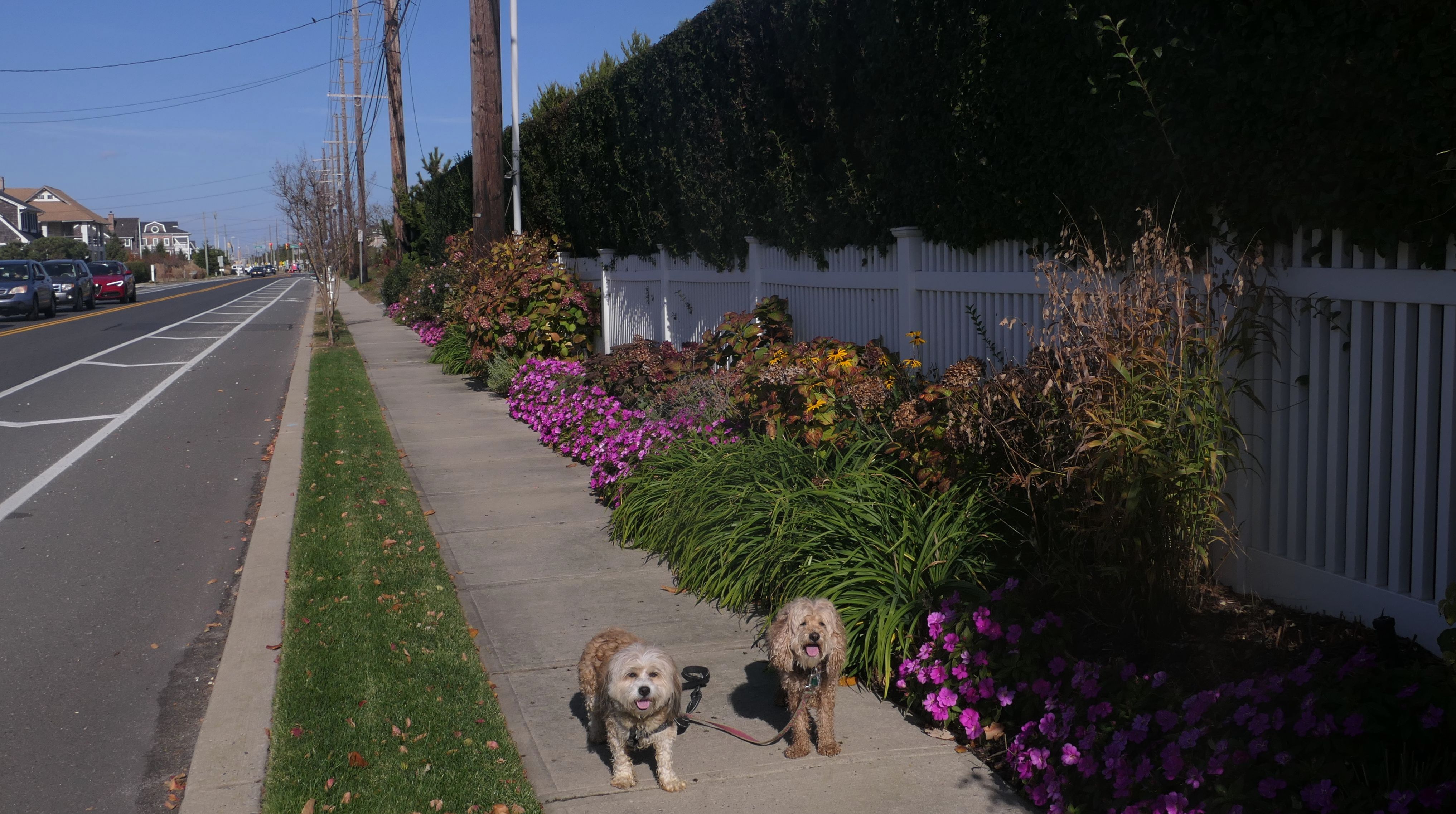 This was the final stop on our two day Jersey Shore adventure, which also included Mandy and Lexi's first night in a hotel, and beaches in Point Pleasant Beach and Bay Head. It was an unbelievably warm early November day. The beach got up to 78 degrees, while it was over 80 inland. There was a warm breeze, but it wasn't as windy as the day before. This beach was more dog-friendly than the others. There is a doggie waste station by the access point, with a poop bag dispenser. In the summer months (May 15th through October 1st) dogs are allowed between sunrise and 10AM, and from 6PM to sunset. In the off-season, they are allowed anytime, and are also allowed to be off-leash during the off-season as well! Since this was actually our second beach visit of the day, we kept the walk on the shorter side, but also took a brief detour to check out the town. Back at the beach, a dog with a dyed orange head arrived. Since the dogs could be off-leash, they had a new friend to play with. Even after that dog left, Mandy and Lexi ran around off-leash and did some of their patented doggie wrestling that they used to do frequently when they were younger! It was fun seeing them run around freely on a beautiful beach! This was a wonderful way to end our trip on a summer-like afternoon in November!