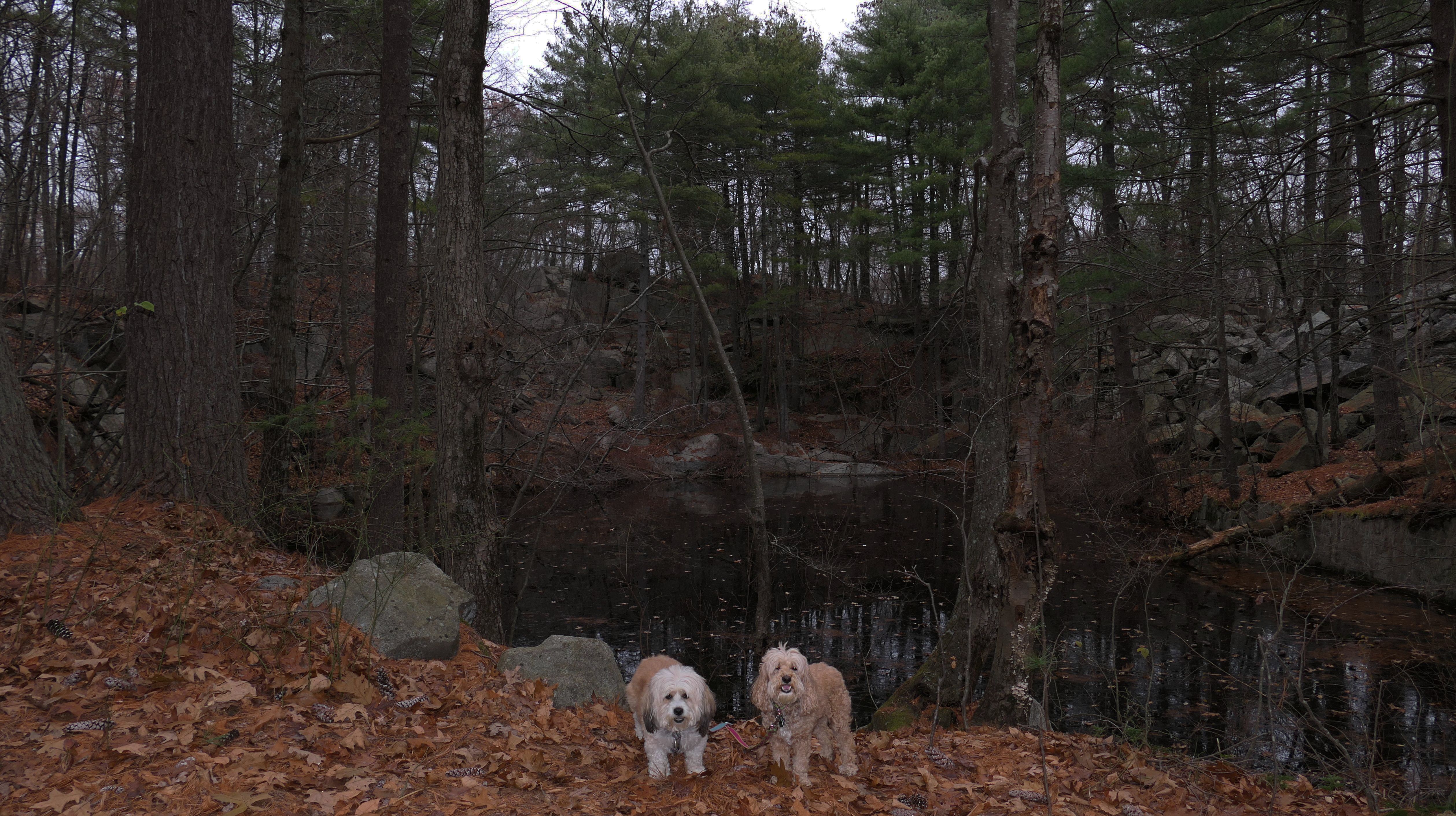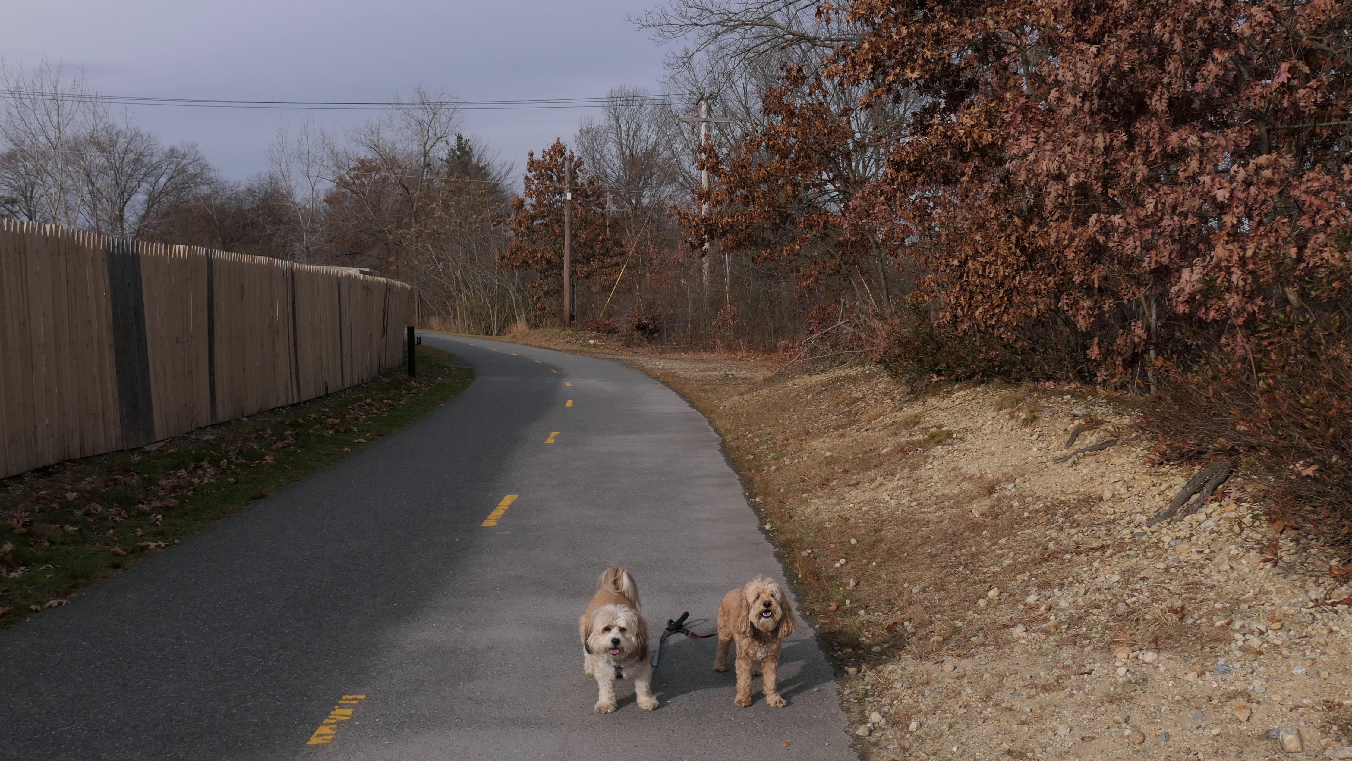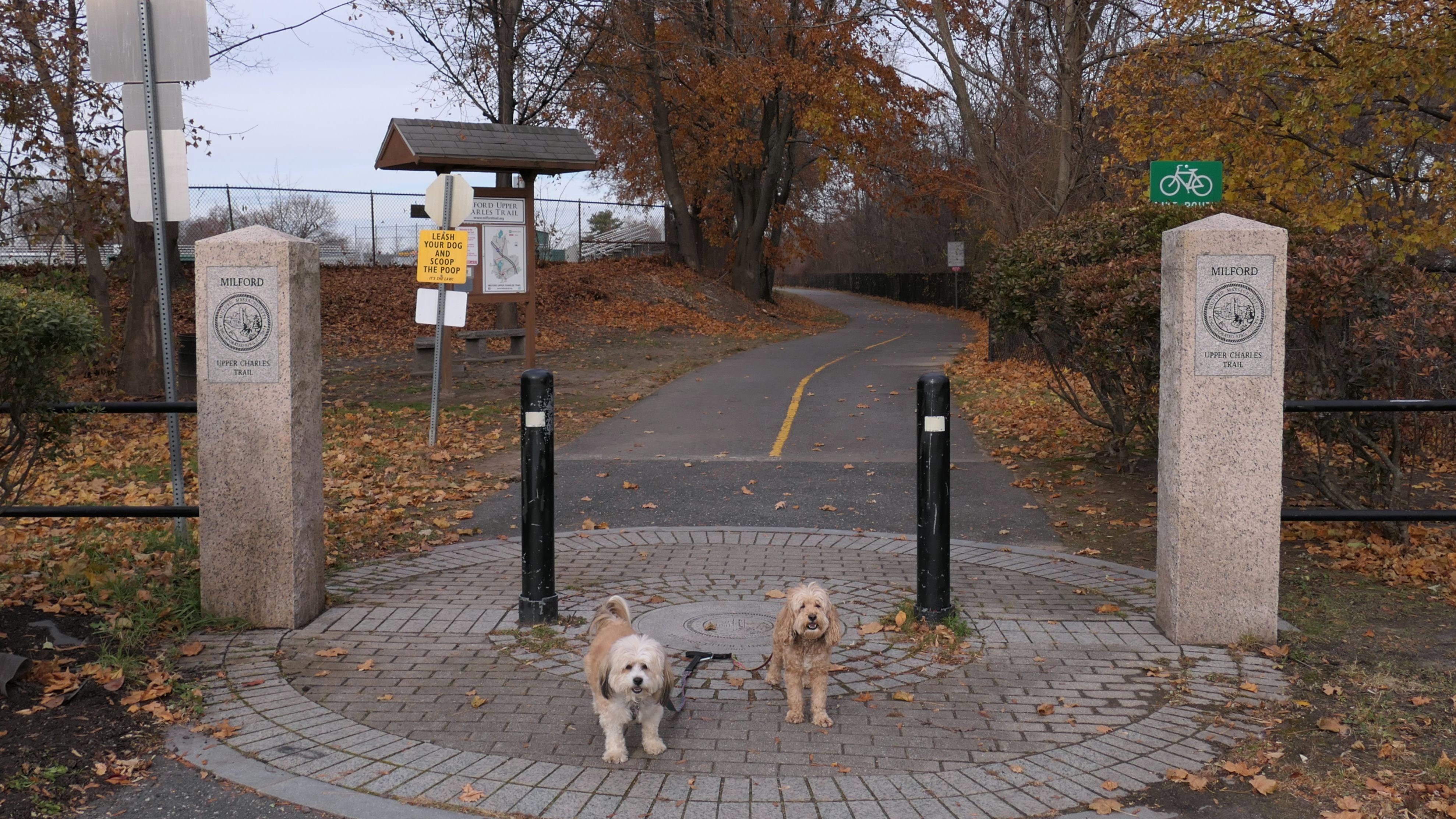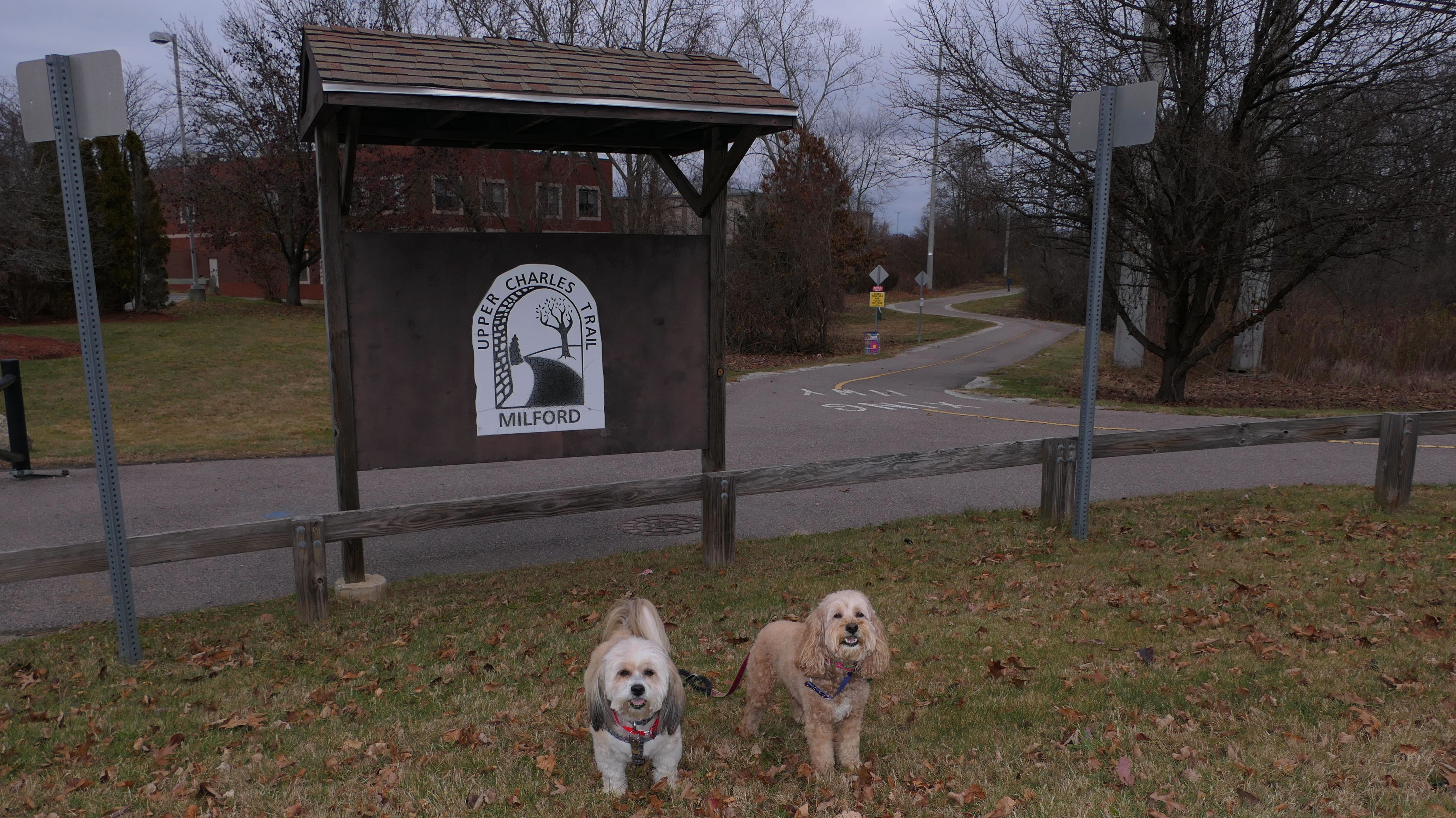 Here is another rail trail in Central Massachusetts. We started at the commuter lot on Main Street, and headed north past Fino Field. We crossed Dilla Street where the trail passes through Louisa Lake Park. Continuing north past the lake, the trail heads into Milford State Forest. We continued until the trail reached the intersection of I-495 and Route 85, where we turned around and headed back. We walked about five and a half miles total. The highlight of the trail was the section near the lake, and those photos are under Louisa Lake Park section. Also of note, is the section through the forest. There was one spot just off the trail where a little pond lies amongst an outcropping of rocks. It was pretty cool looking, and the photo I took of Mandy and Lexi in front of it doesn't do it justice. Also of note, after stopping for a short water and snack break, Lexi went nuts and pounced on Mandy right on the trail. I guess she was in a feisty mood!