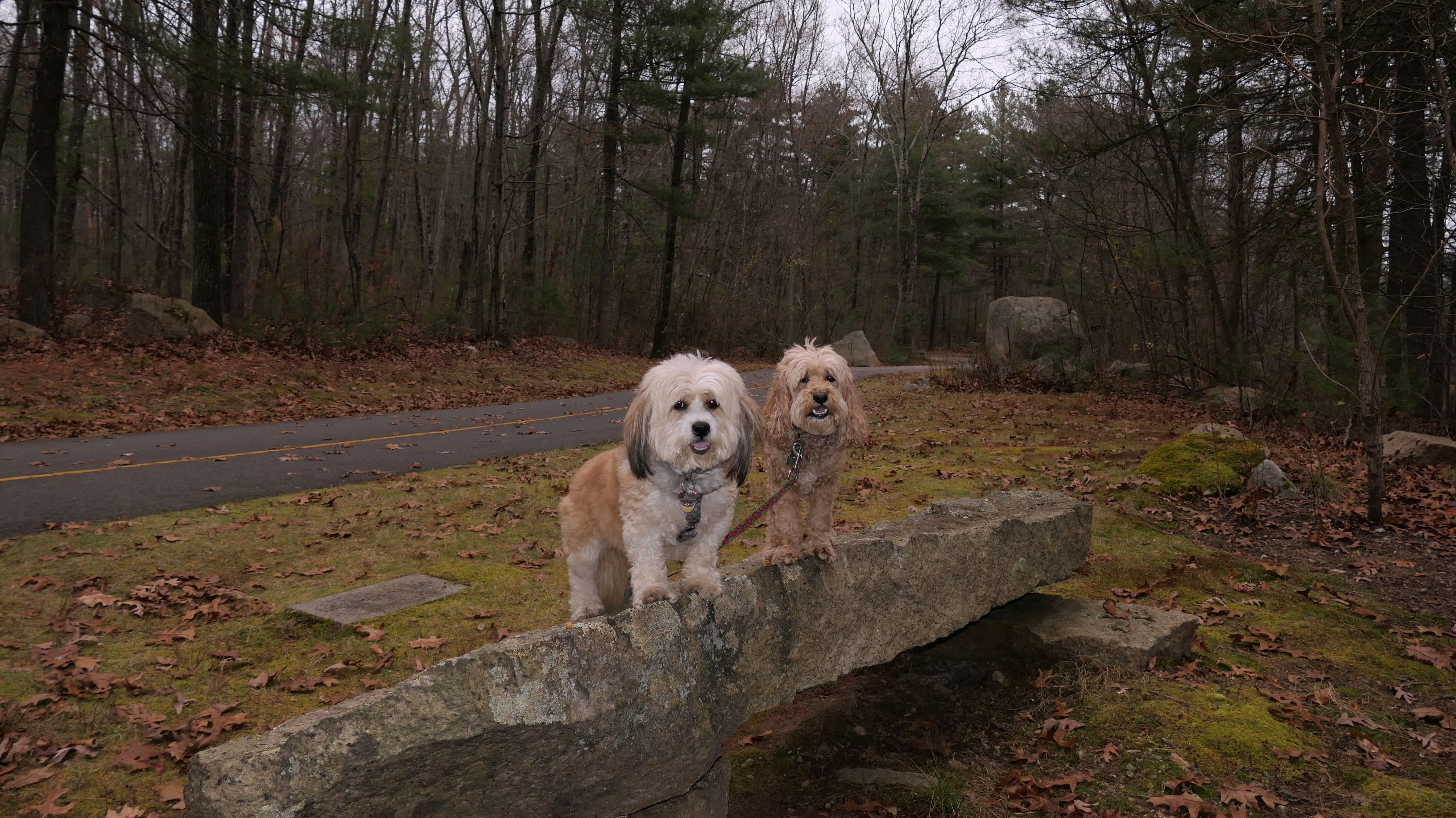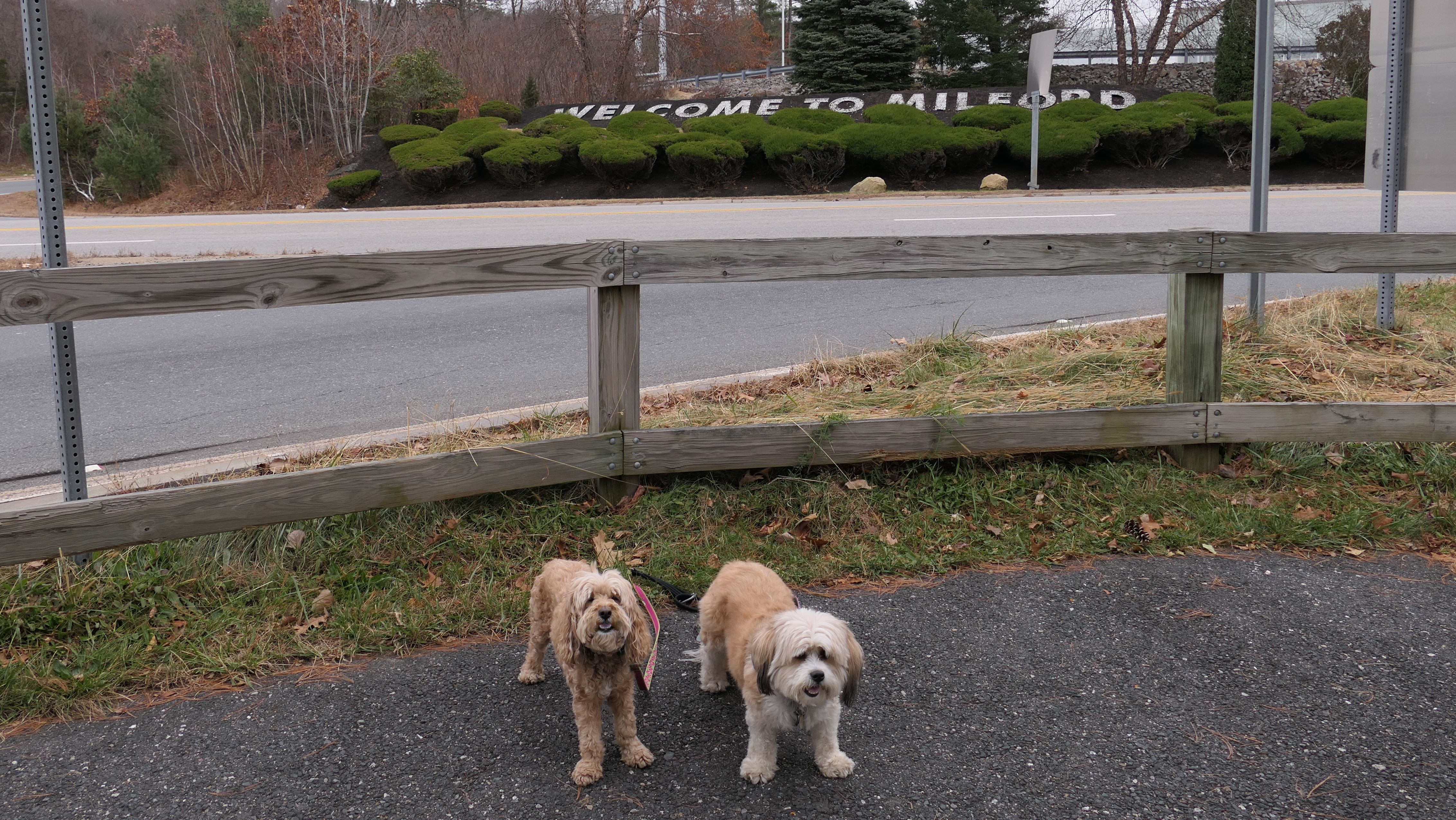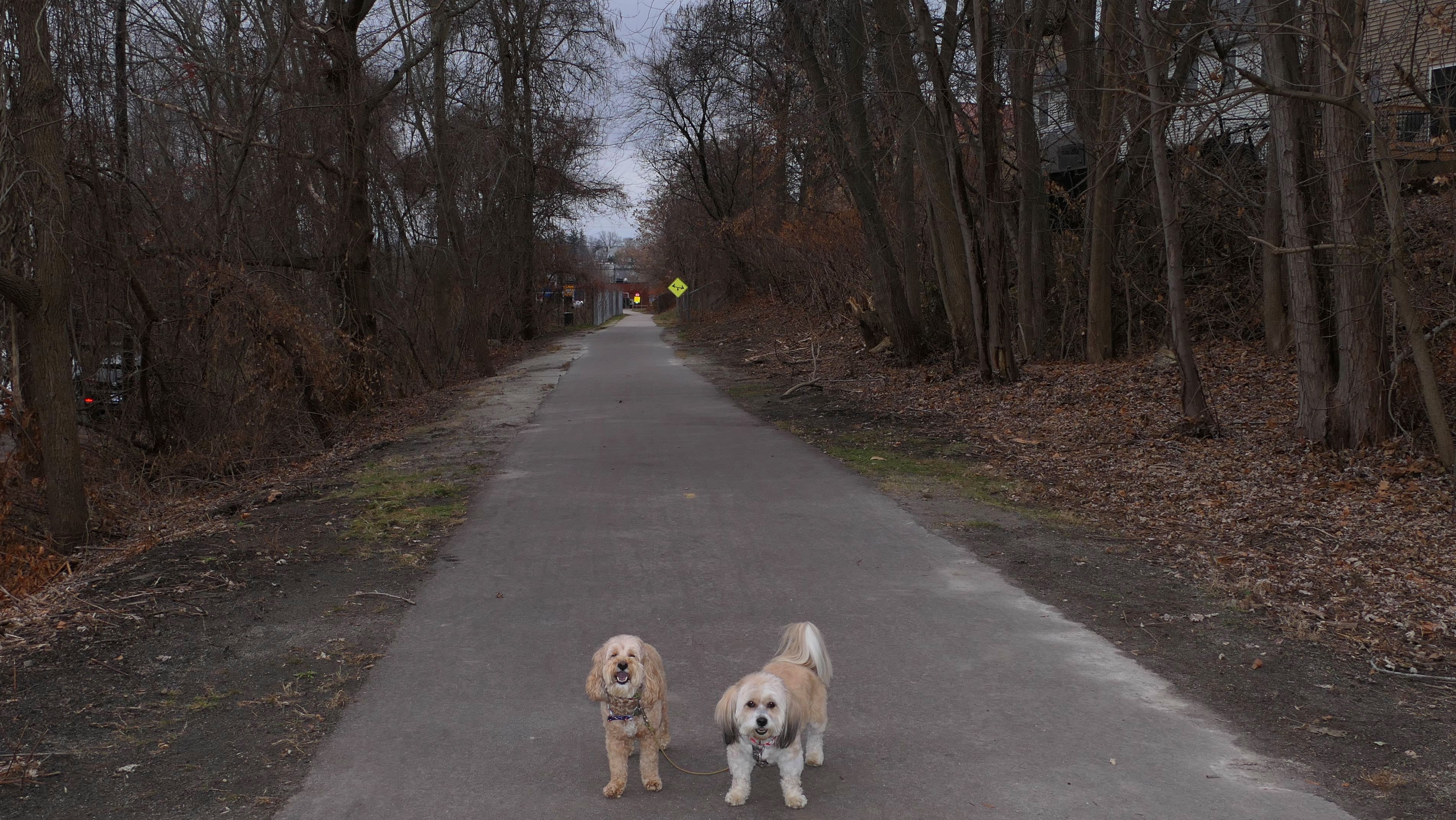 Here is another rail trail in Central Massachusetts. We started at the commuter lot on Main Street, and headed north past Fino Field. We crossed Dilla Street where the trail passes through Louisa Lake Park. Continuing north past the lake, the trail heads into Milford State Forest. We continued until the trail reached the intersection of I-495 and Route 85, where we turned around and headed back. We walked about five and a half miles total. The highlight of the trail was the section near the lake, and those photos are under Louisa Lake Park section. Also of note, is the section through the forest. There was one spot just off the trail where a little pond lies amongst an outcropping of rocks. It was pretty cool looking, and the photo I took of Mandy and Lexi in front of it doesn't do it justice. Also of note, after stopping for a short water and snack break, Lexi went nuts and pounced on Mandy right on the trail. I guess she was in a feisty mood!
