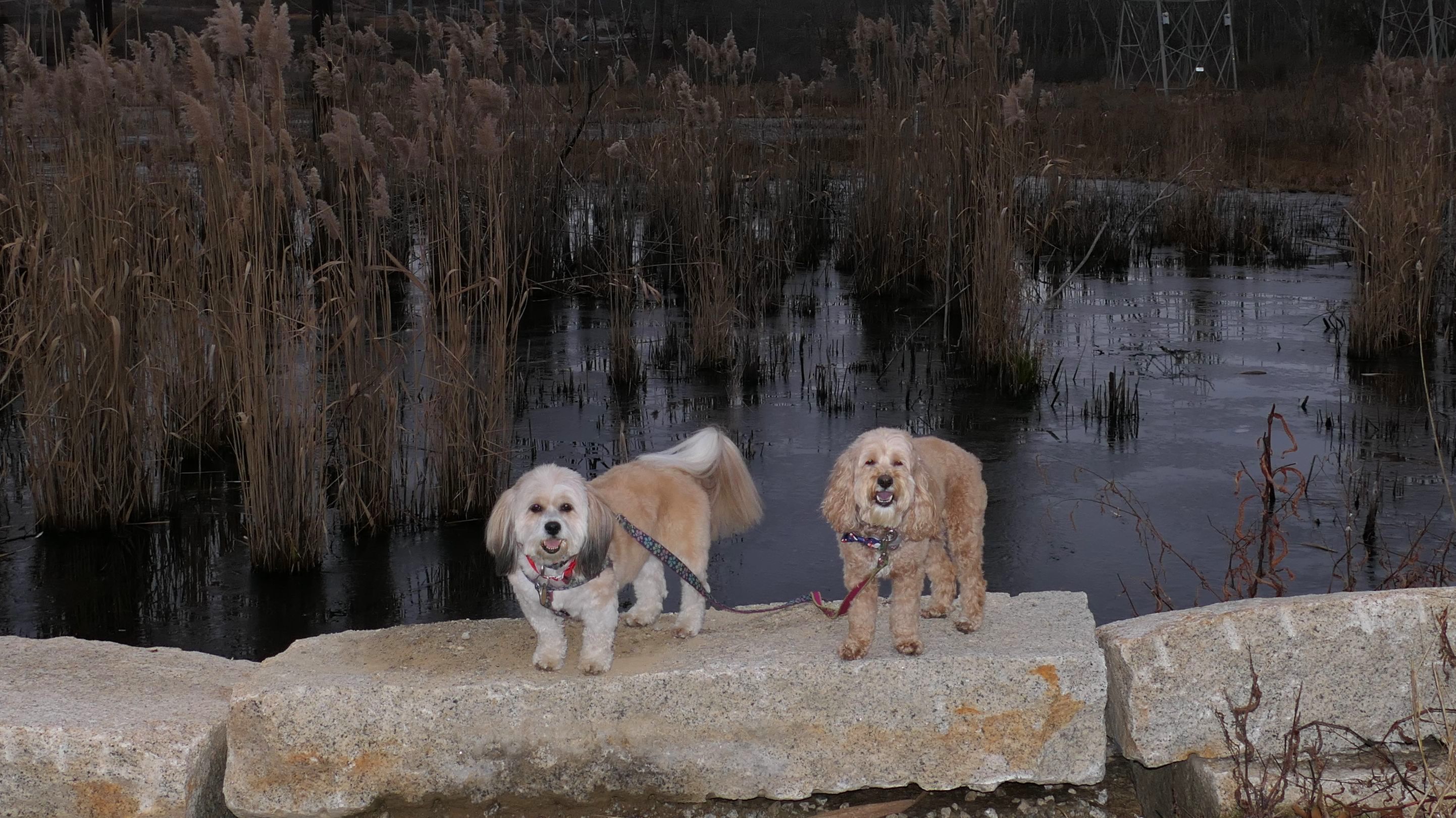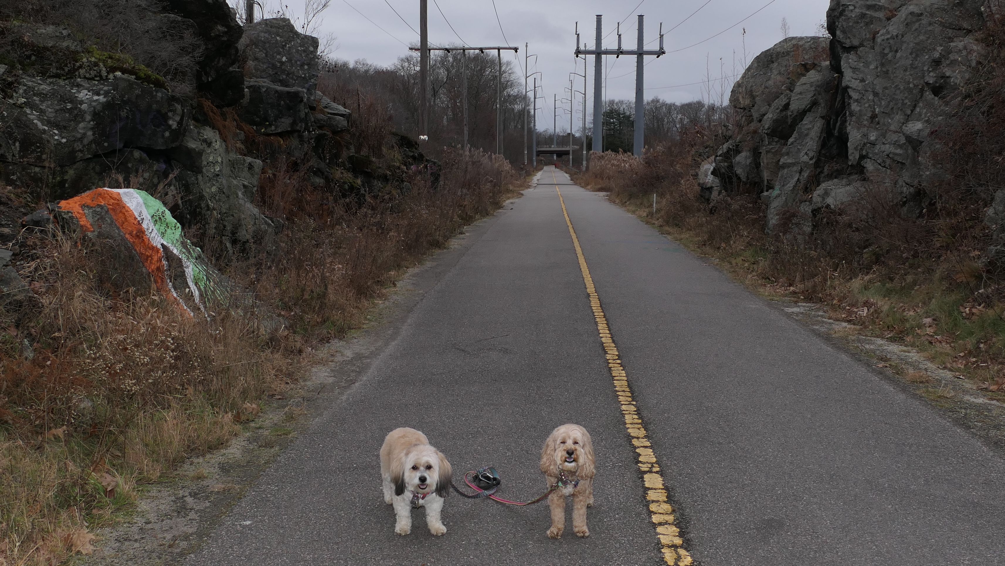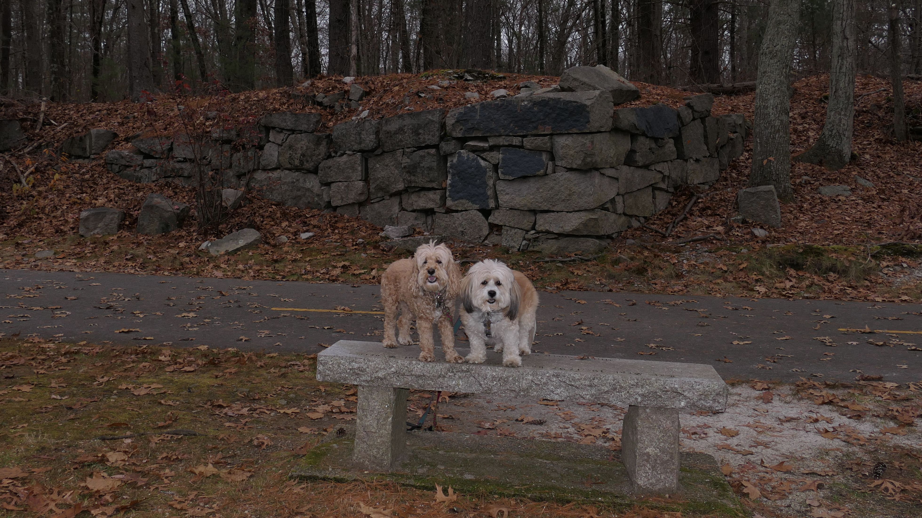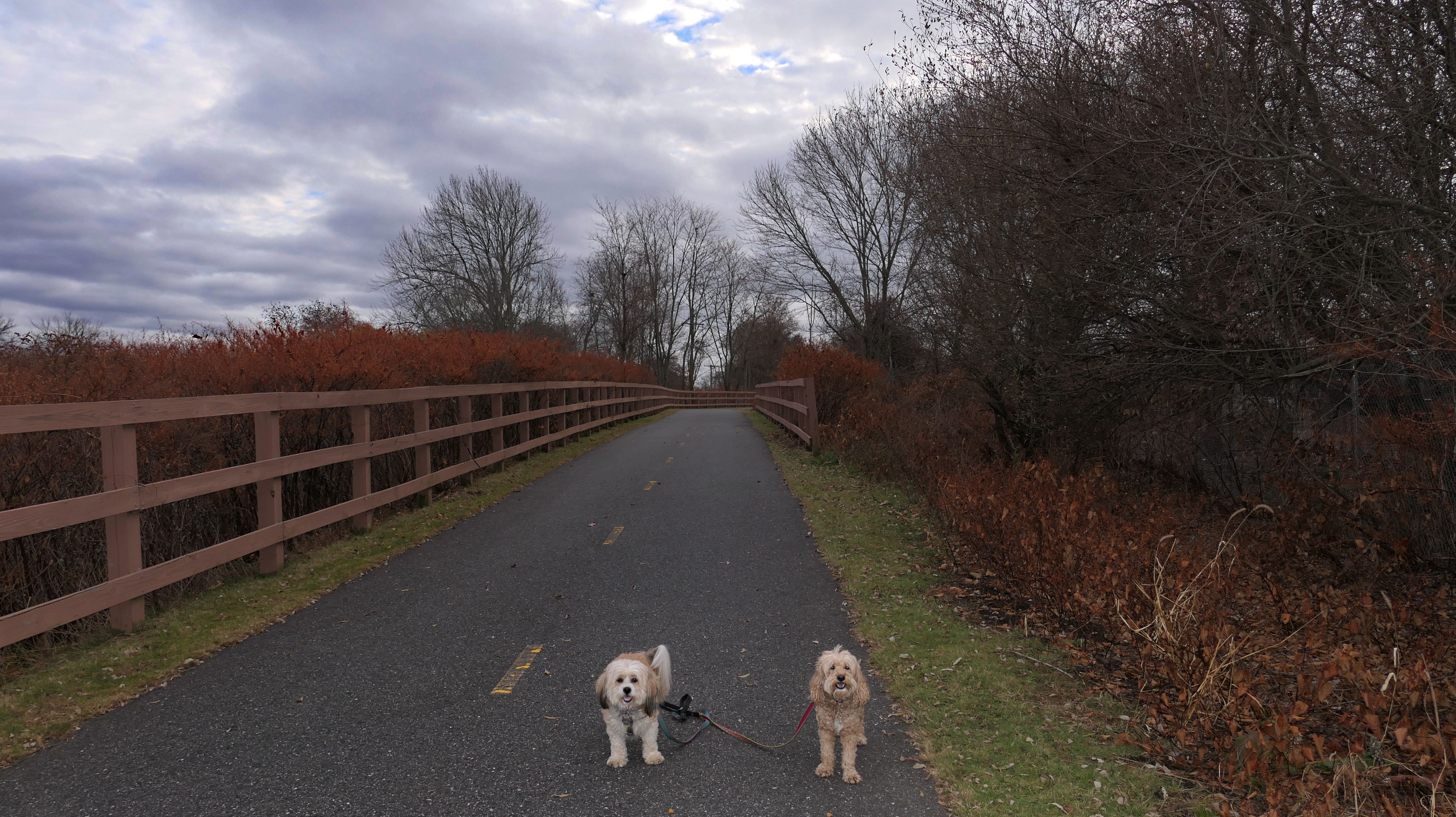 Here is another rail trail in Central Massachusetts. We started at the commuter lot on Main Street, and headed north past Fino Field. We crossed Dilla Street where the trail passes through Louisa Lake Park. Continuing north past the lake, the trail heads into Milford State Forest. We continued until the trail reached the intersection of I-495 and Route 85, where we turned around and headed back. We walked about five and a half miles total. The highlight of the trail was the section near the lake, and those photos are under Louisa Lake Park section. Also of note, is the section through the forest. There was one spot just off the trail where a little pond lies amongst an outcropping of rocks. It was pretty cool looking, and the photo I took of Mandy and Lexi in front of it doesn't do it justice. Also of note, after stopping for a short water and snack break, Lexi went nuts and pounced on Mandy right on the trail. I guess she was in a feisty mood!