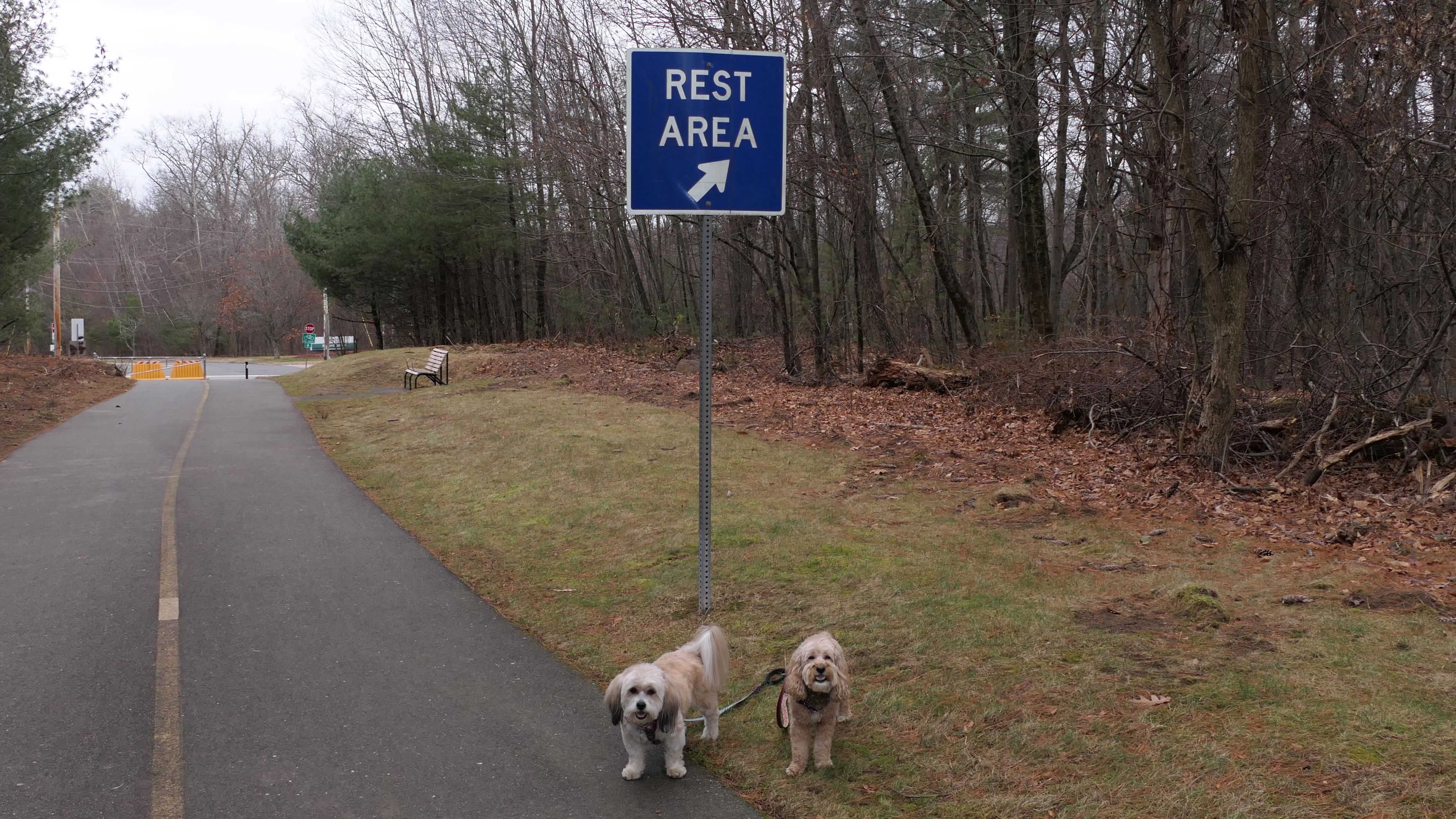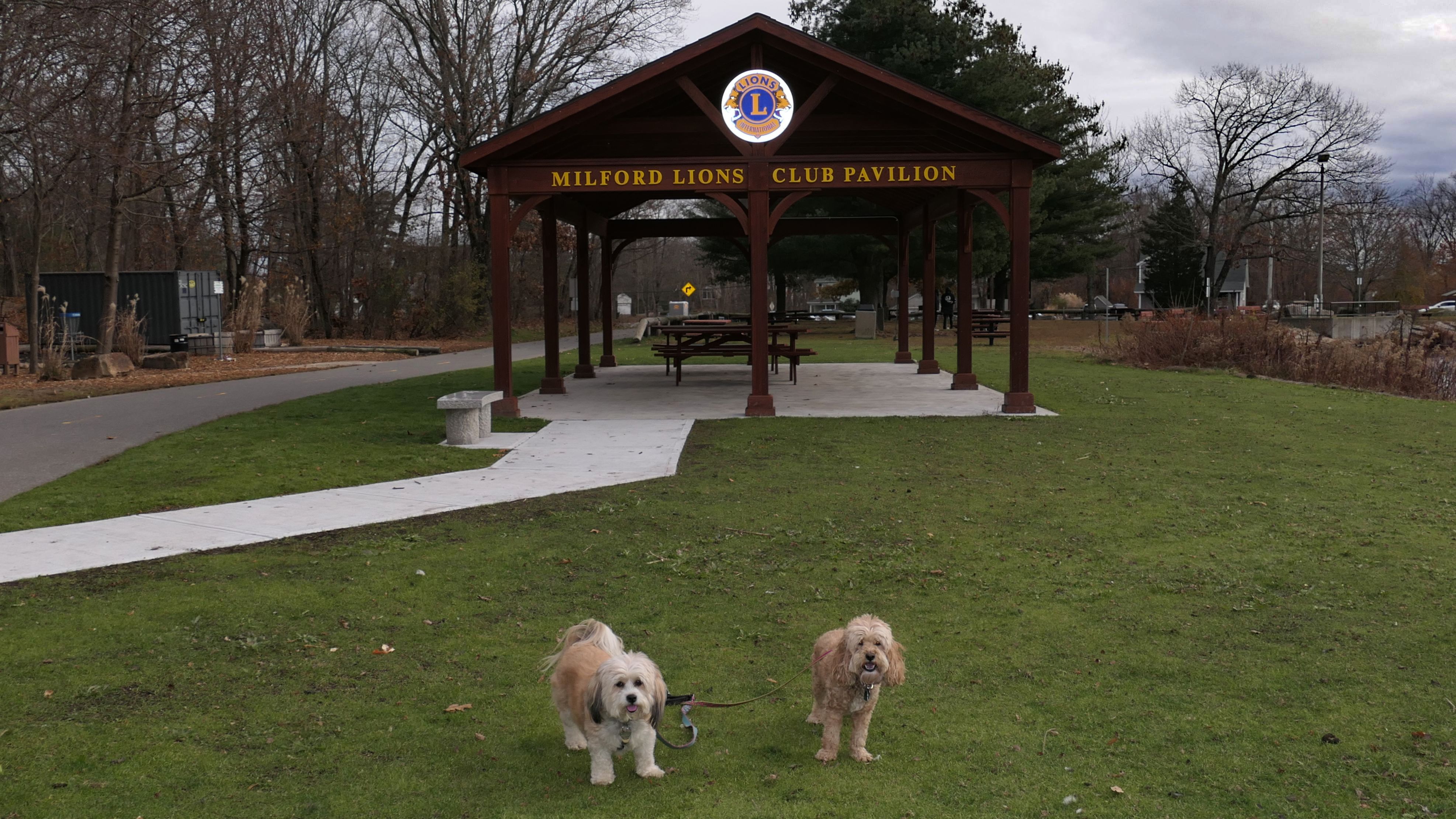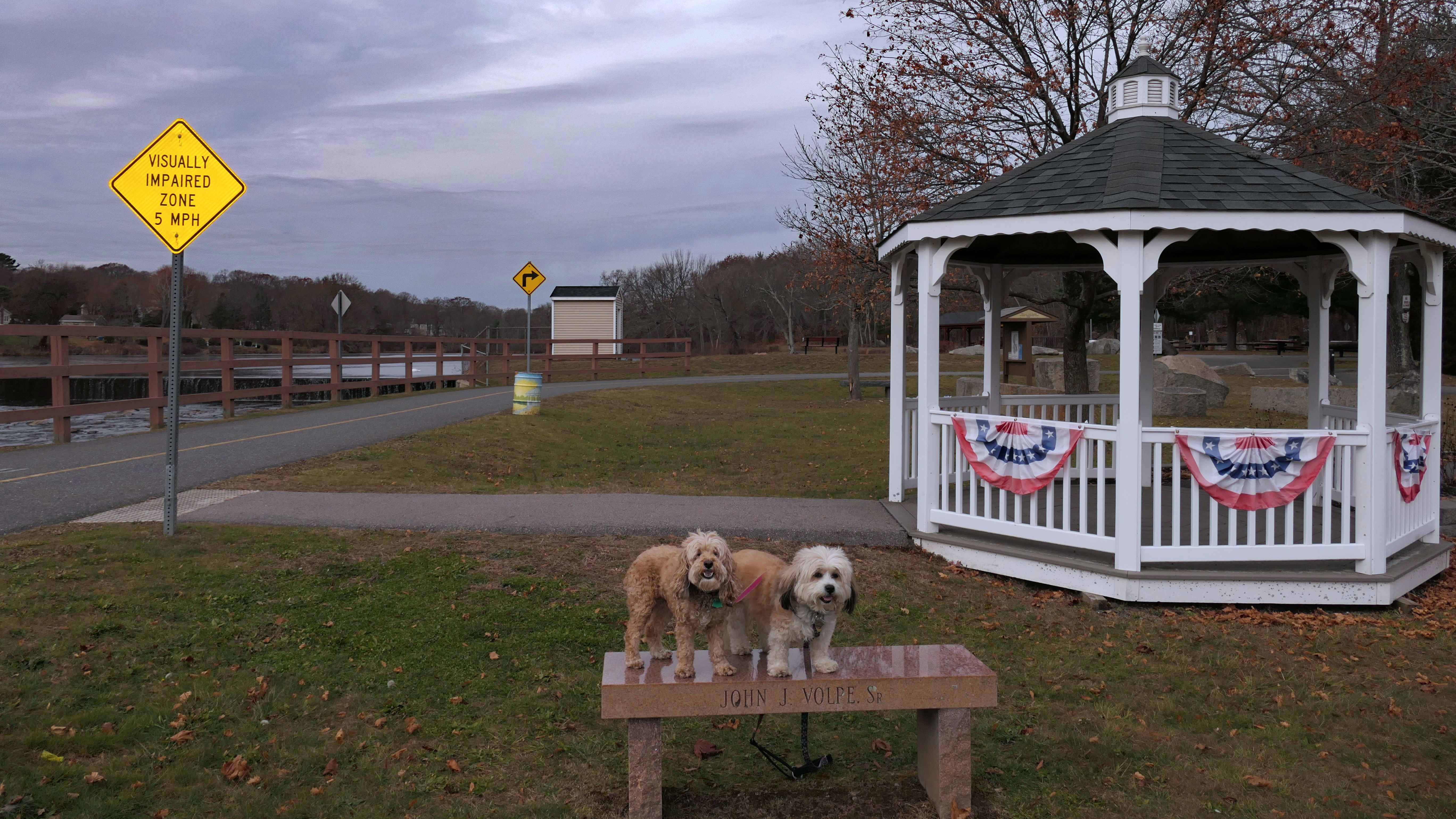 The Upper Charles Rail Trail runs through this park. The park features a pavilion, a gazebo, picnic tables, benches, a disc golf course and a fishing area. It's a nice spot to stop for a break along the trail. Lexi found the swans in the lake very interesting.
