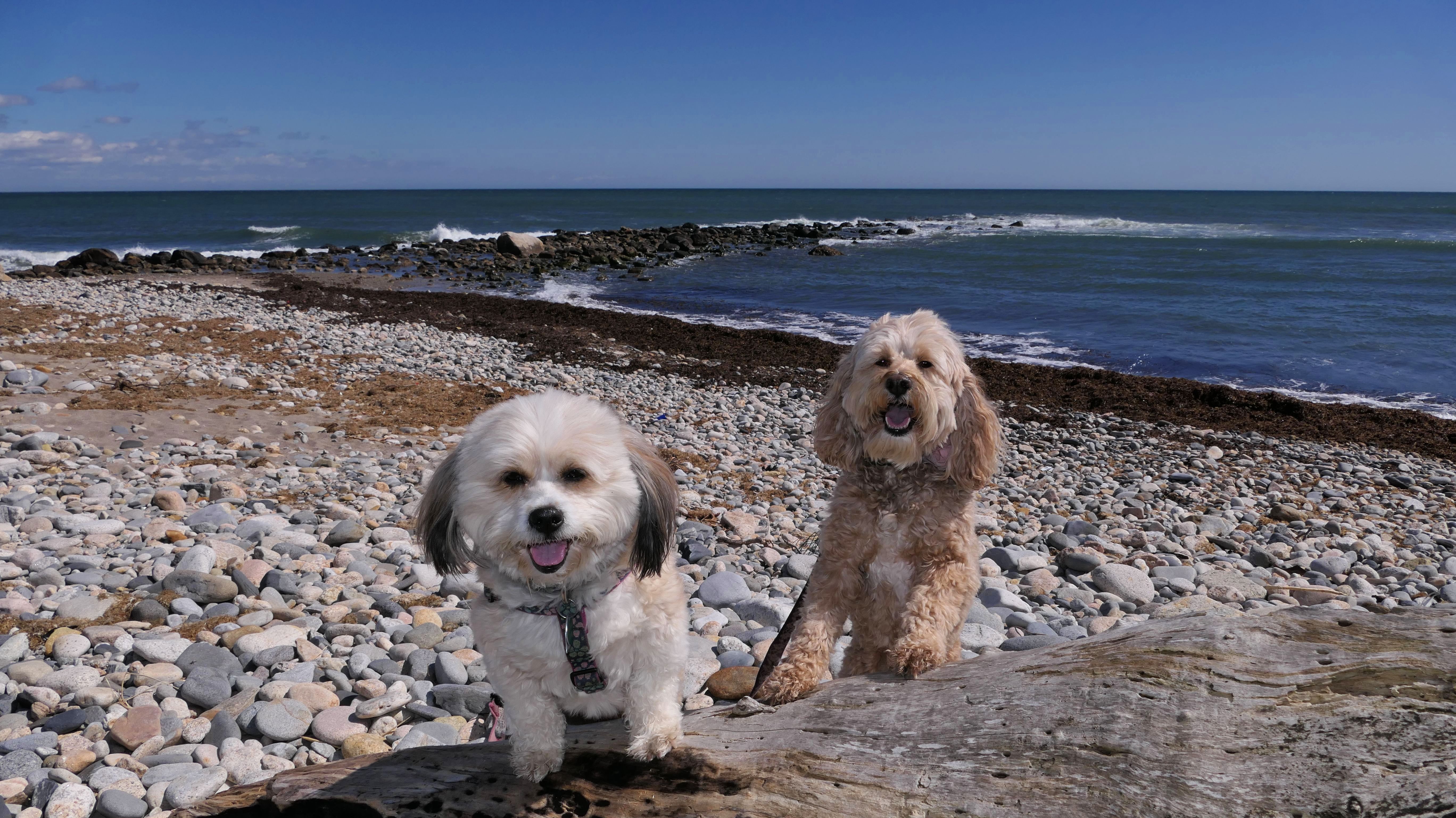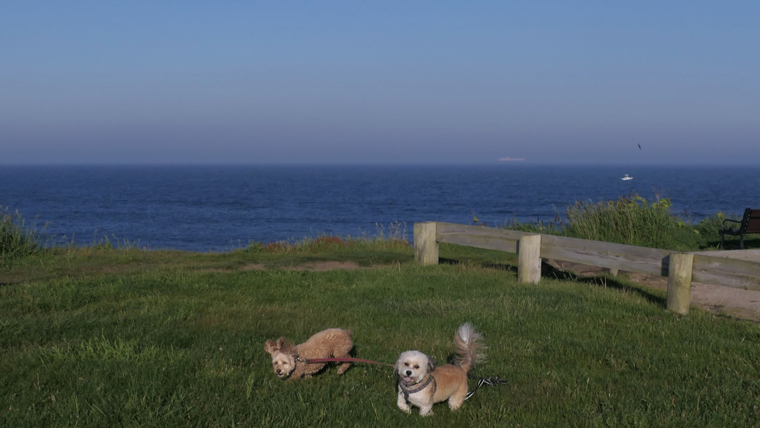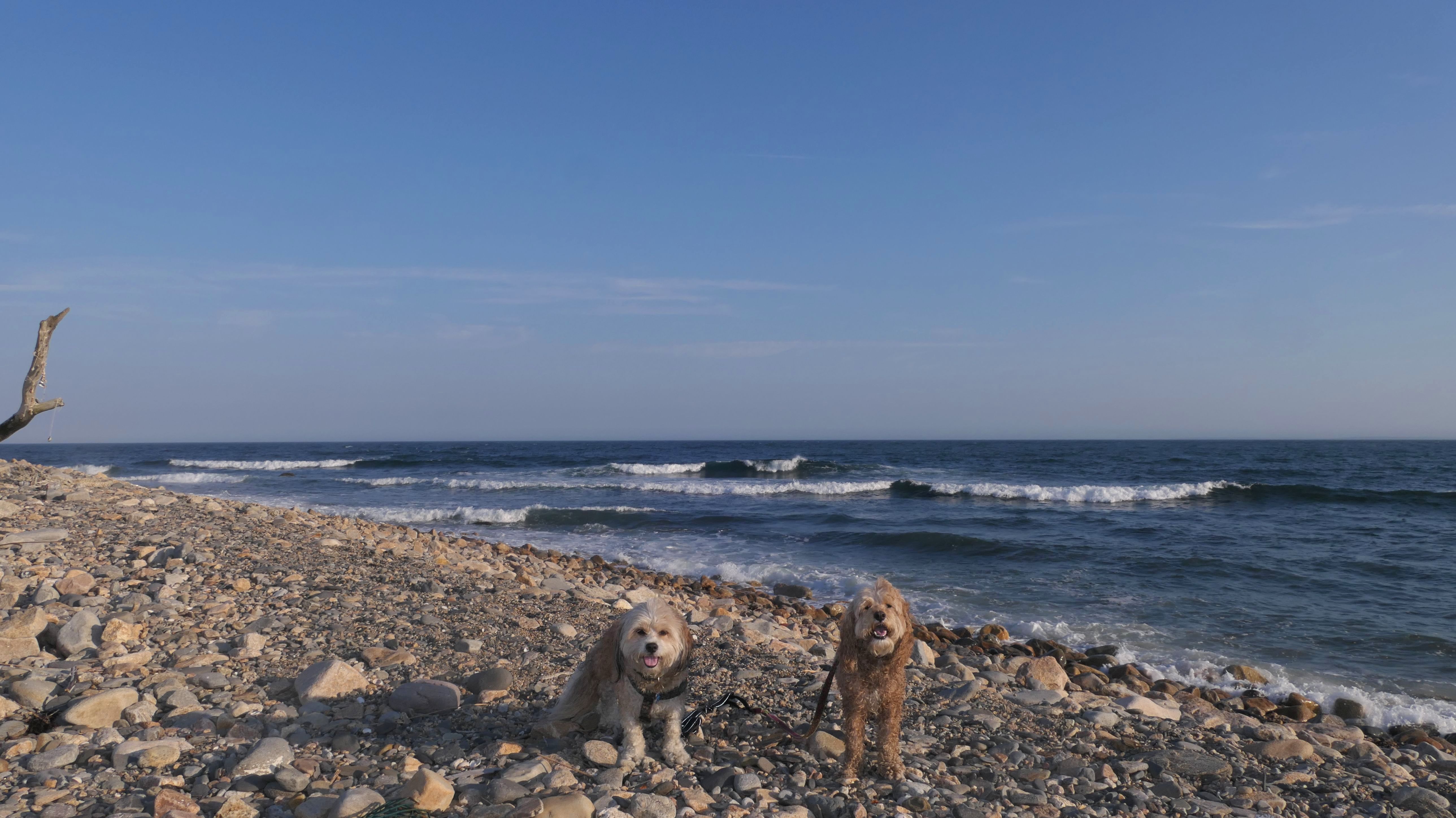 This is one of our favorite spots in the area. For this visit, there was wildfire smoke in the upper atmosphere that really dimmed the sunlight. We walked on the jetty a bit, the dogs cooled off, and then they played on the beach. We also took a walk to Rose Nulman Park and back.
