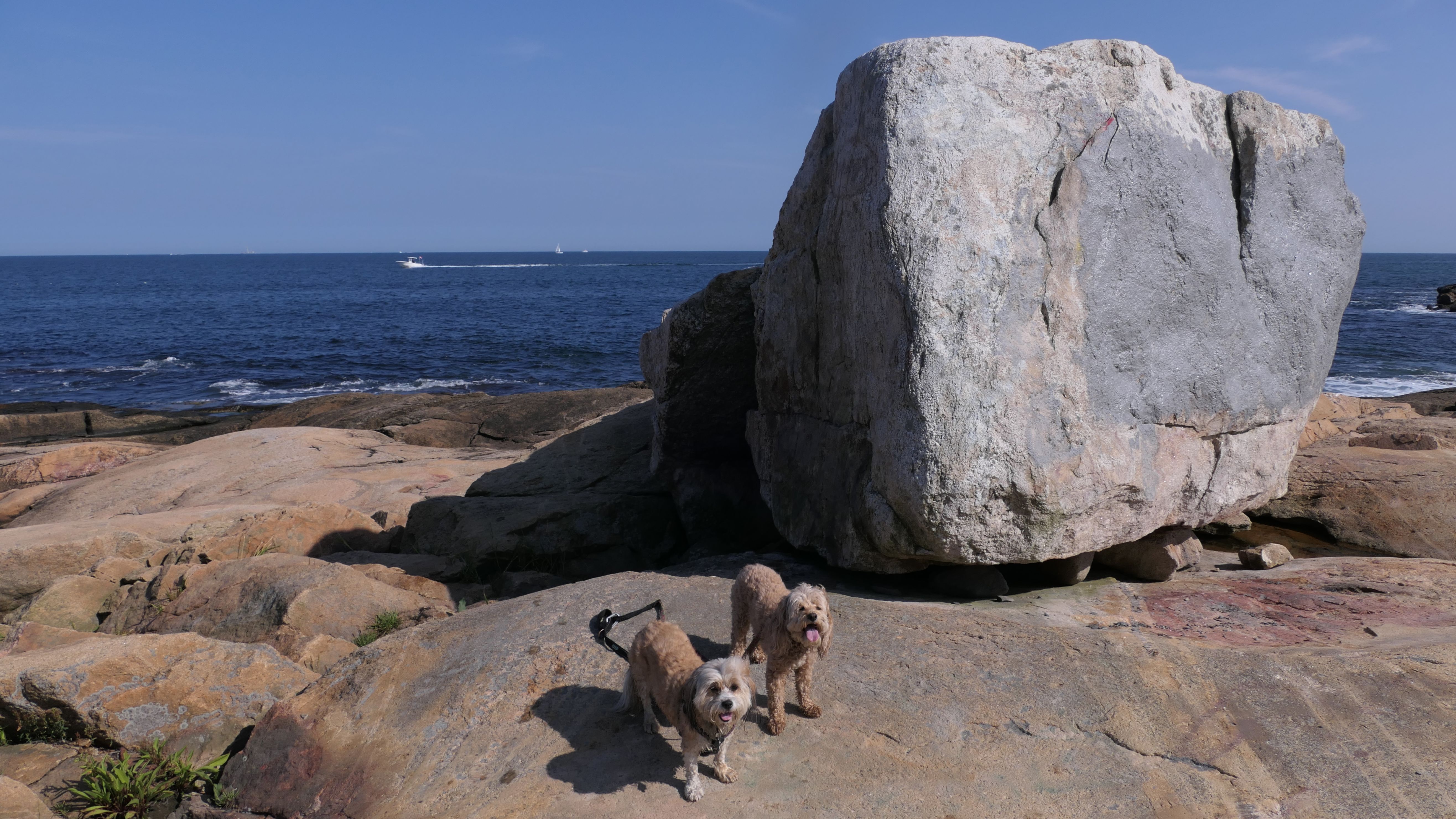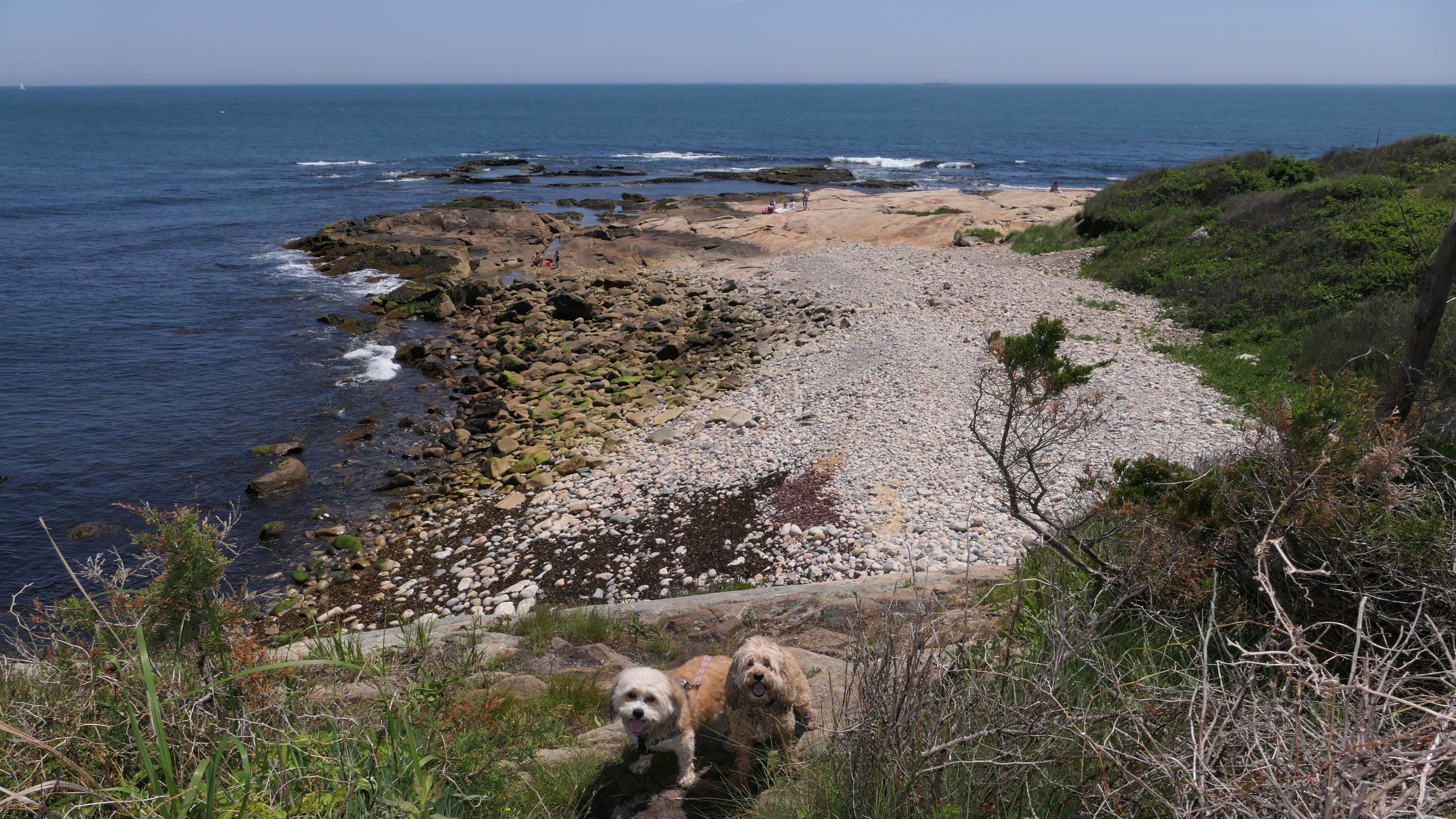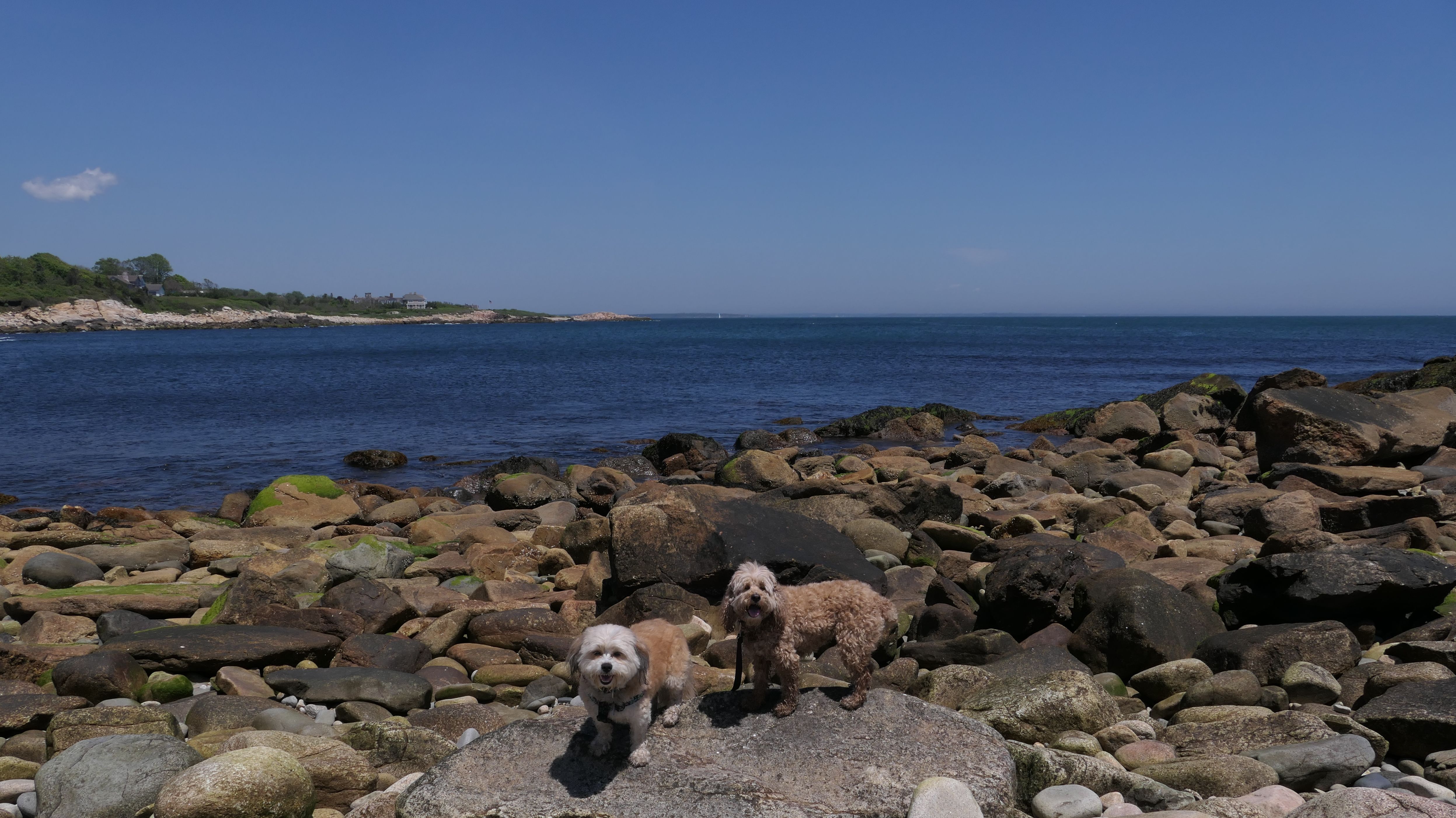This is the second of the three public waterfront access areas that we visited on this day. Like Bass Rock, it also features a steep trail that leads down to the rocks on the shoreline. The rocks are easier to access here. In addtion to the people fishing, there were also groups of people sun-bathing here, and even another dog! I learned the hard way that despite the rocks looking easier to traverse, they can be slippery. Mandy wanted to go down to the water, and kind of pulled me along and I slipped and landed on my rear! Ultimately I was okay, and we made our way to Hazard Rock later in the day.