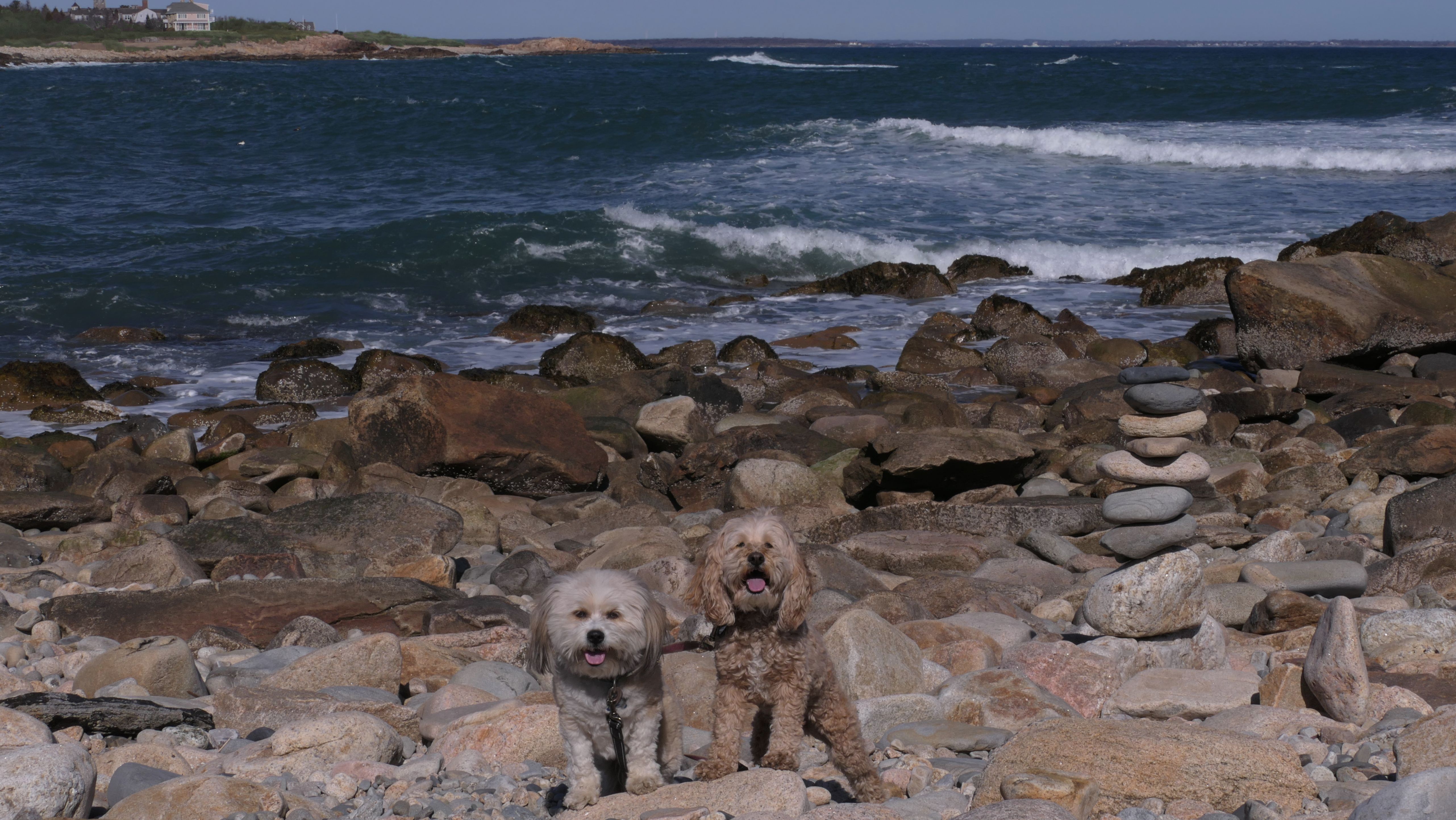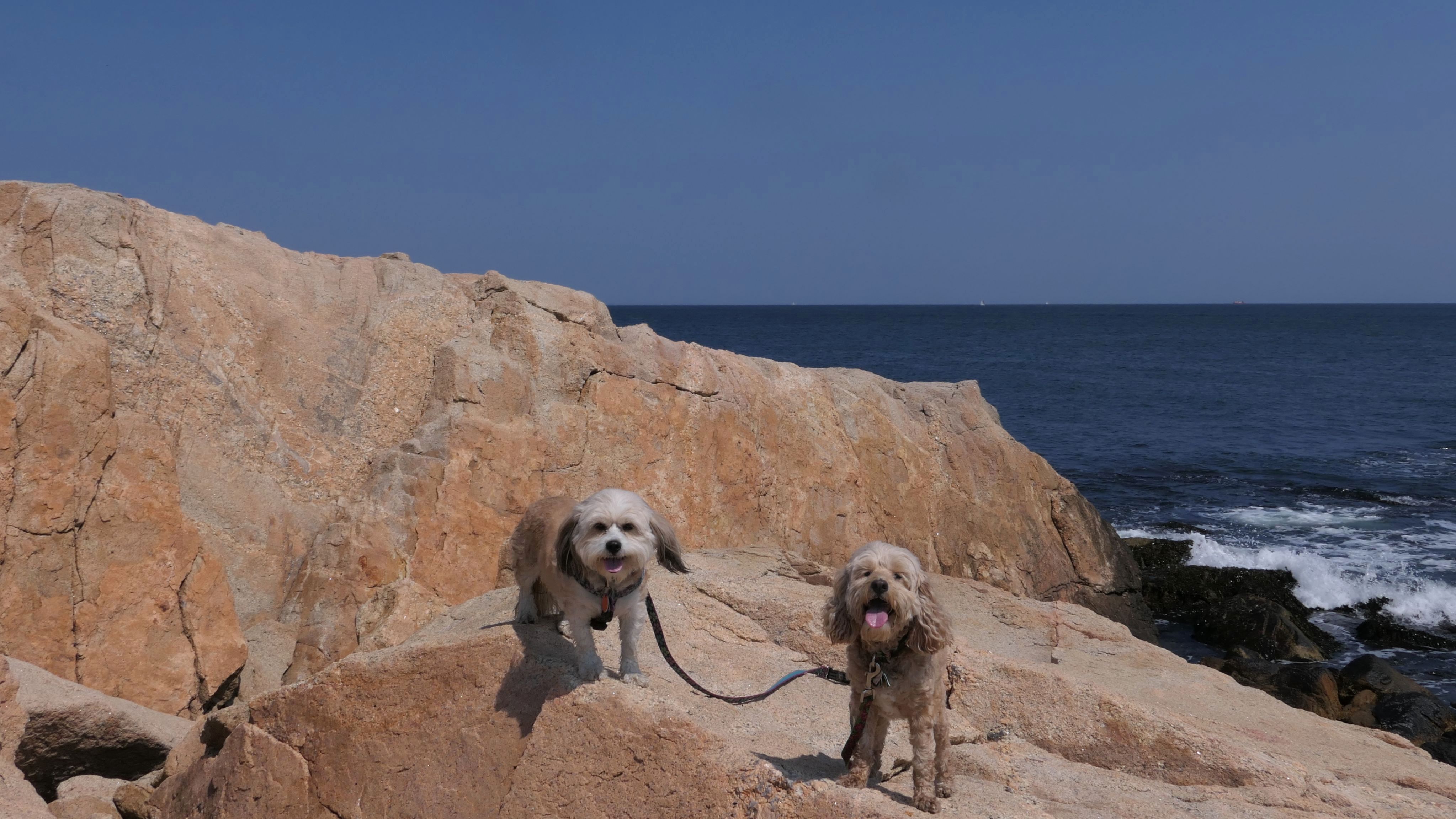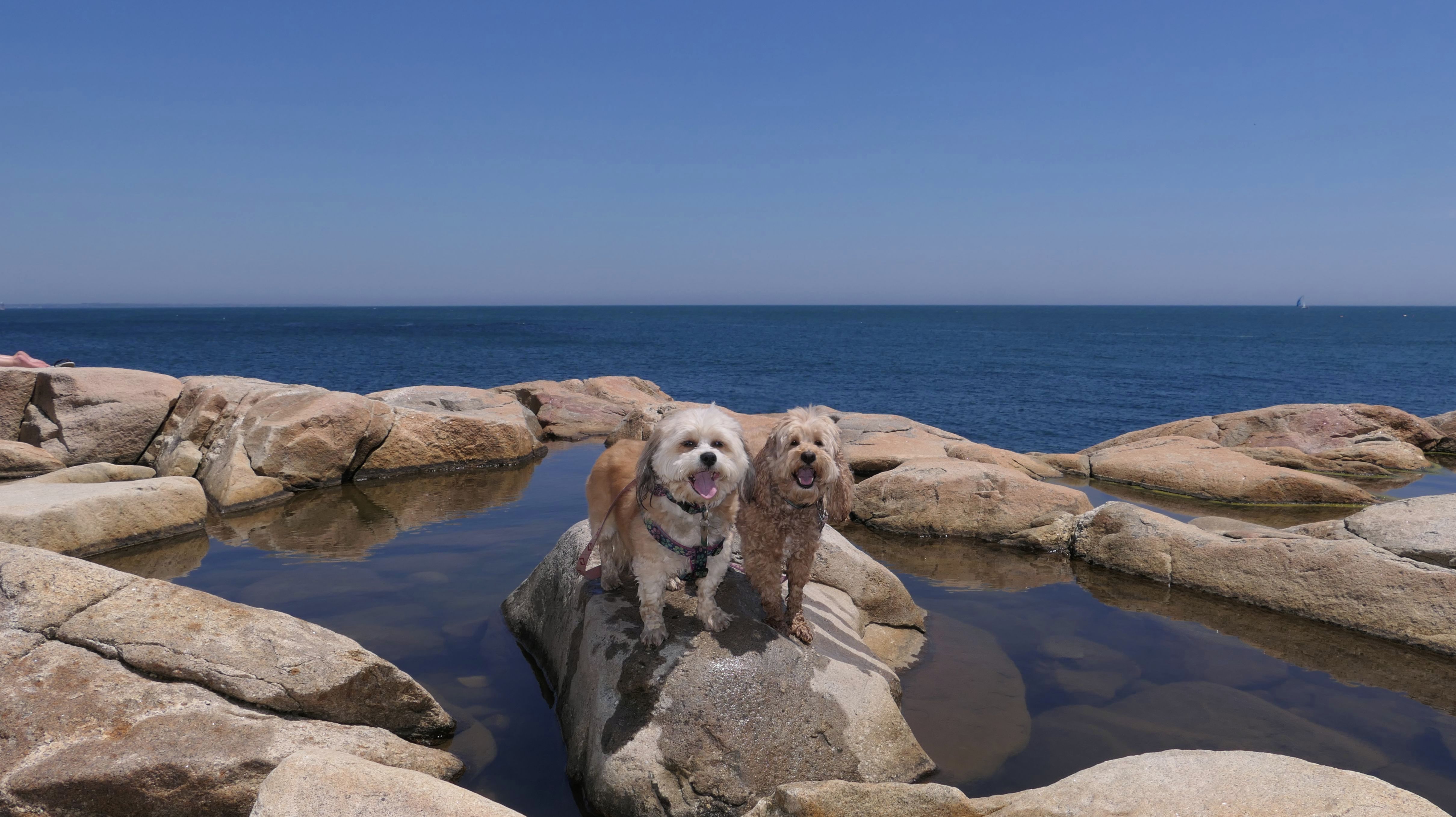 This is the second of the three public waterfront access areas that we visited on this day. Like Bass Rock, it also features a steep trail that leads down to the rocks on the shoreline. The rocks are easier to access here. In addtion to the people fishing, there were also groups of people sun-bathing here, and even another dog! I learned the hard way that despite the rocks looking easier to traverse, they can be slippery. Mandy wanted to go down to the water, and kind of pulled me along and I slipped and landed on my rear! Ultimately I was okay, and we made our way to Hazard Rock later in the day.