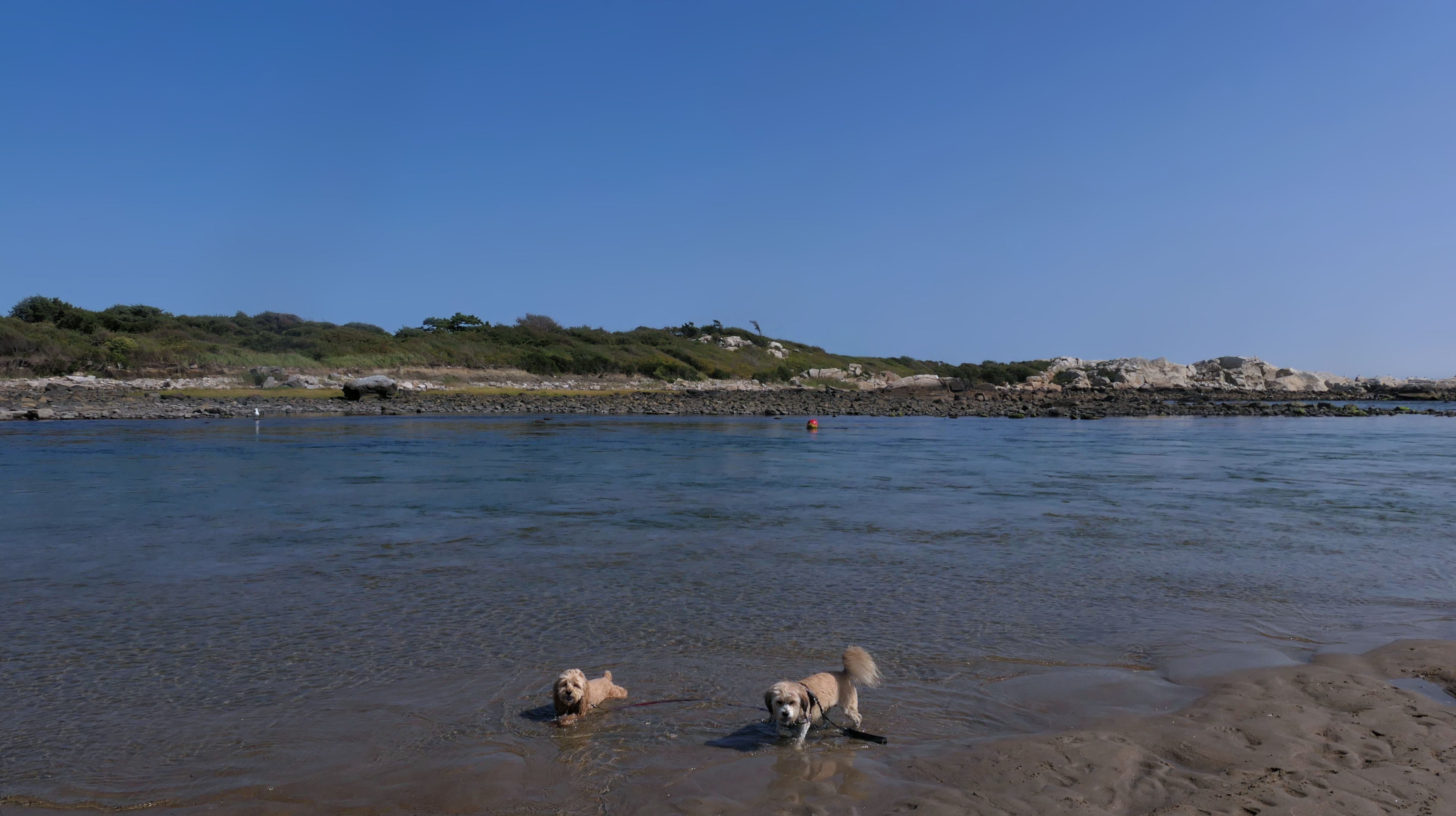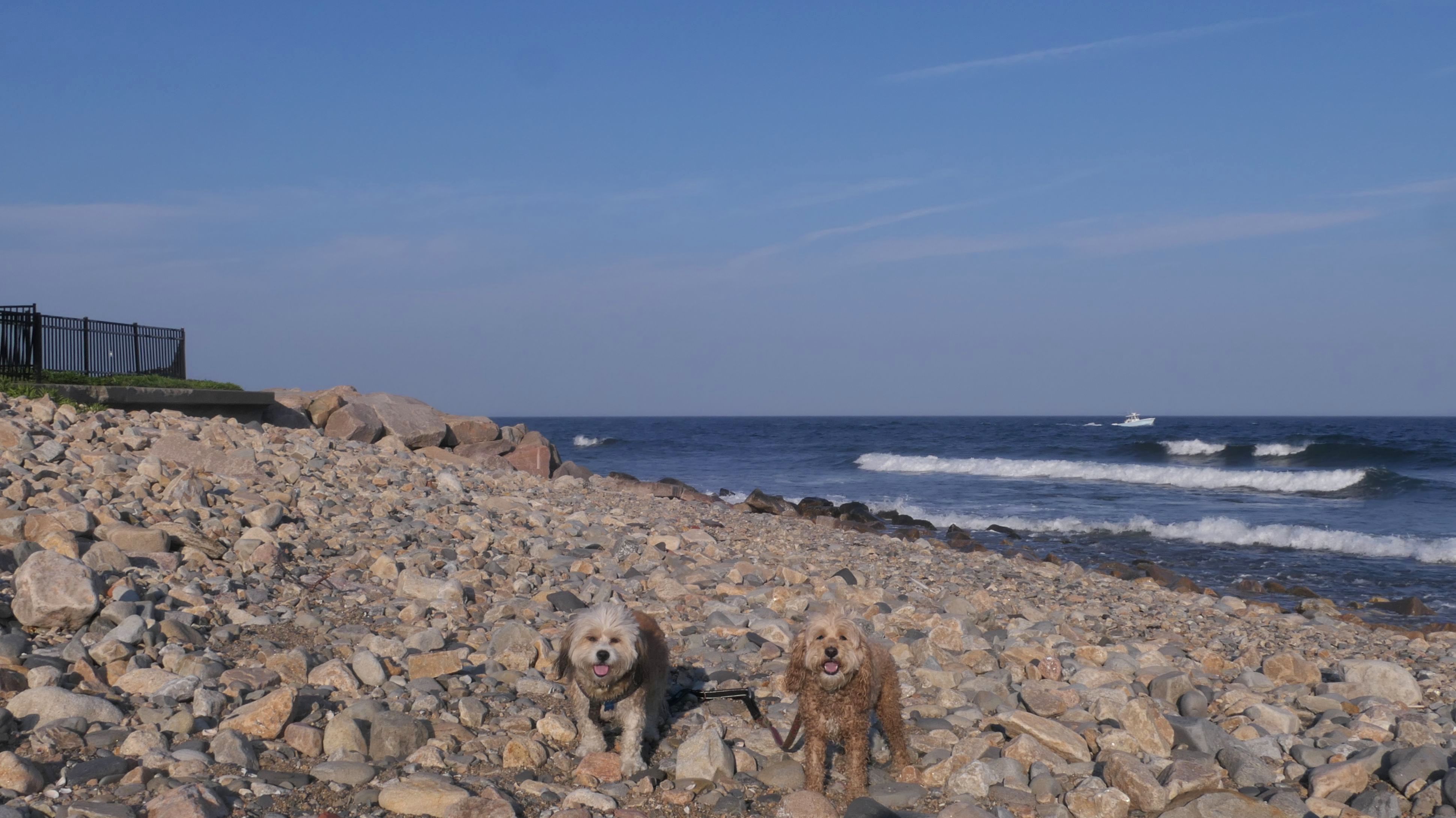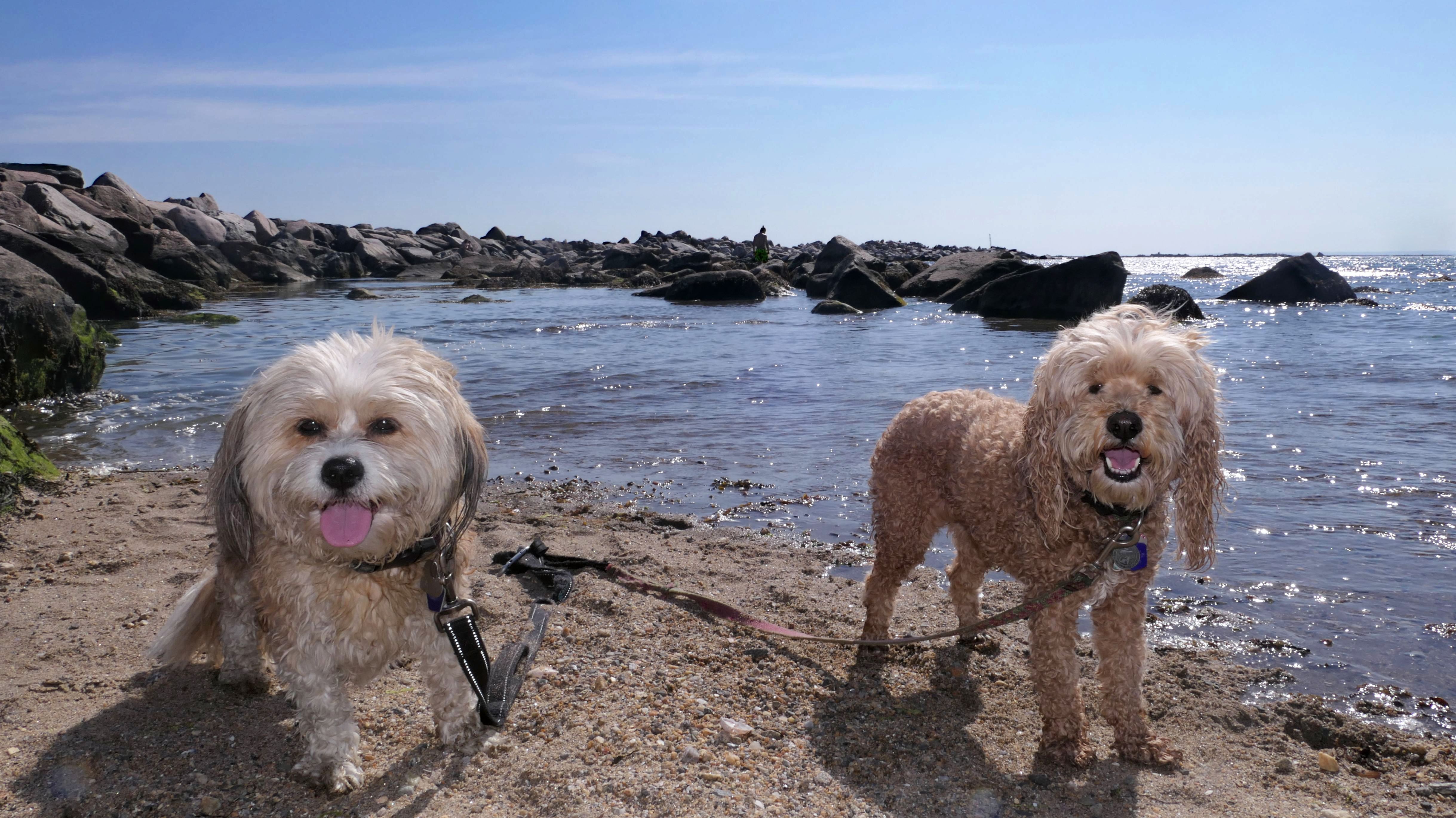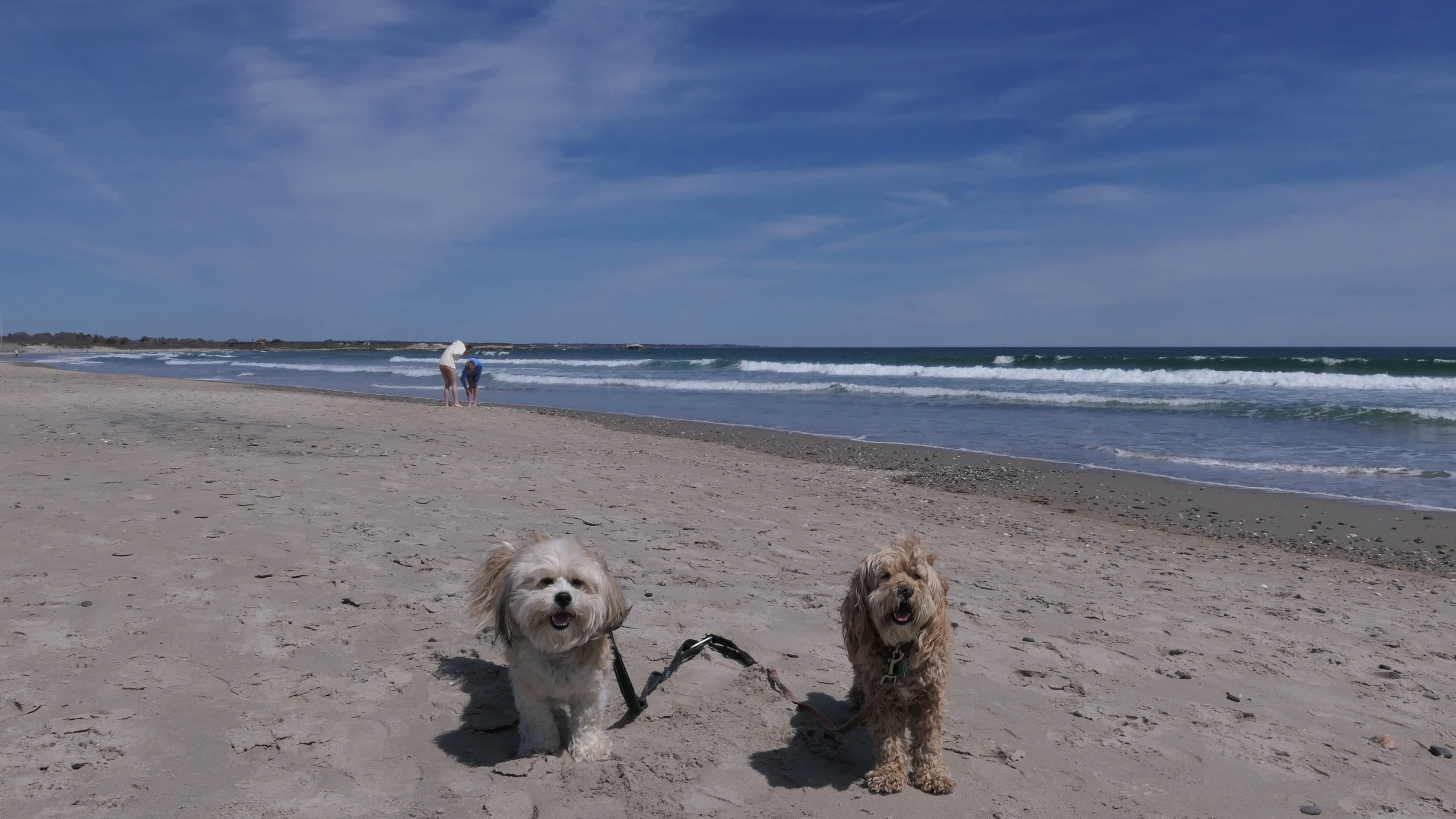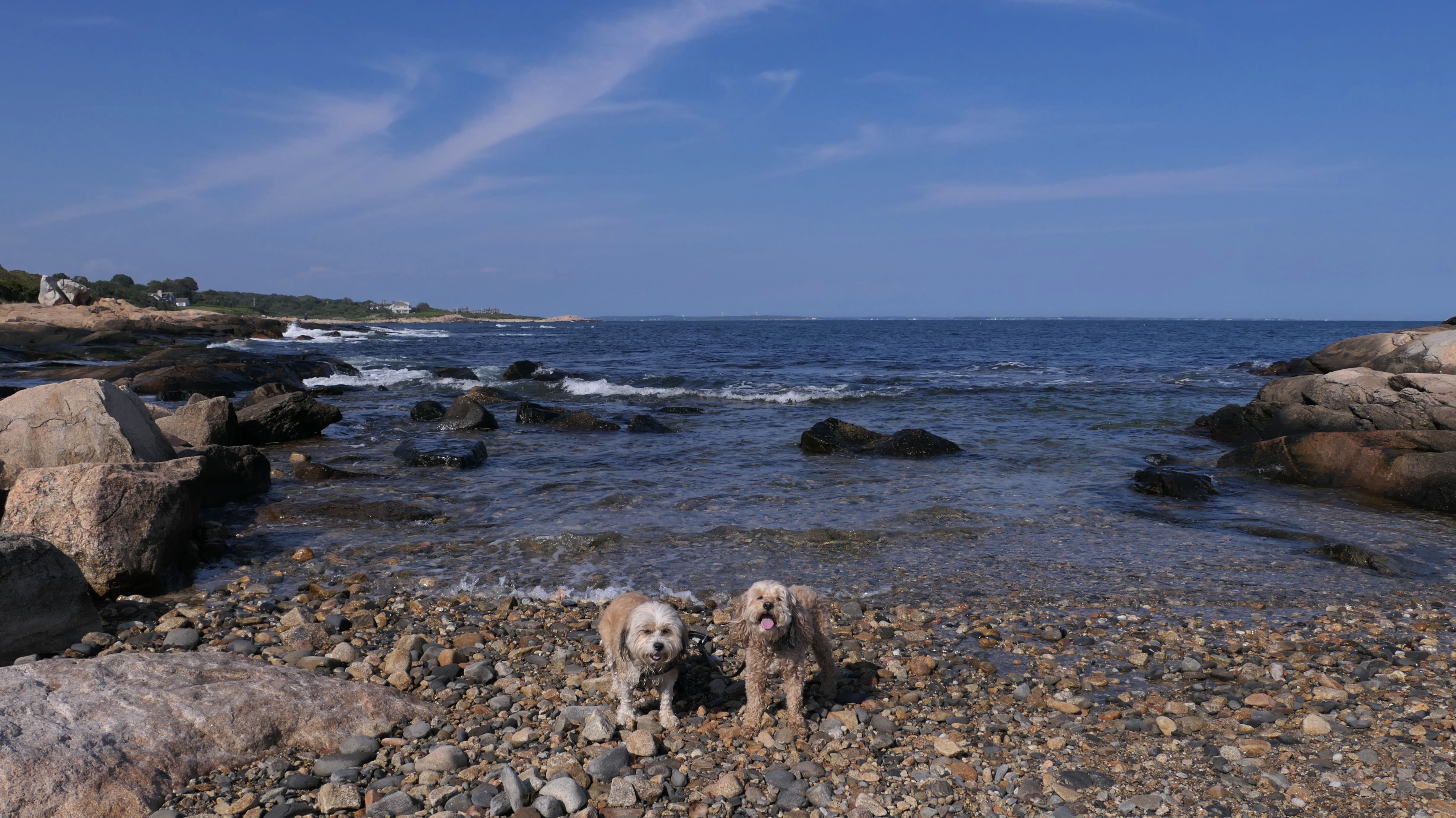 Due to the long weekend, we were let out of work early. I quickly decided to come to this beach, since we had only walked this stretch of sand once before. We started at Roger Wheeler State Beach and walked to Camp Cronin Beach and back. There's nothing new or noteworthy here. It's pretty much the same as last time we were here, except it was lower tide and we didn't have to climb over any large rocks. Waves are mild here, as breakwaters protect this area. It was cooler than it has been, but the dogs still went into the water toward the end of our walk.