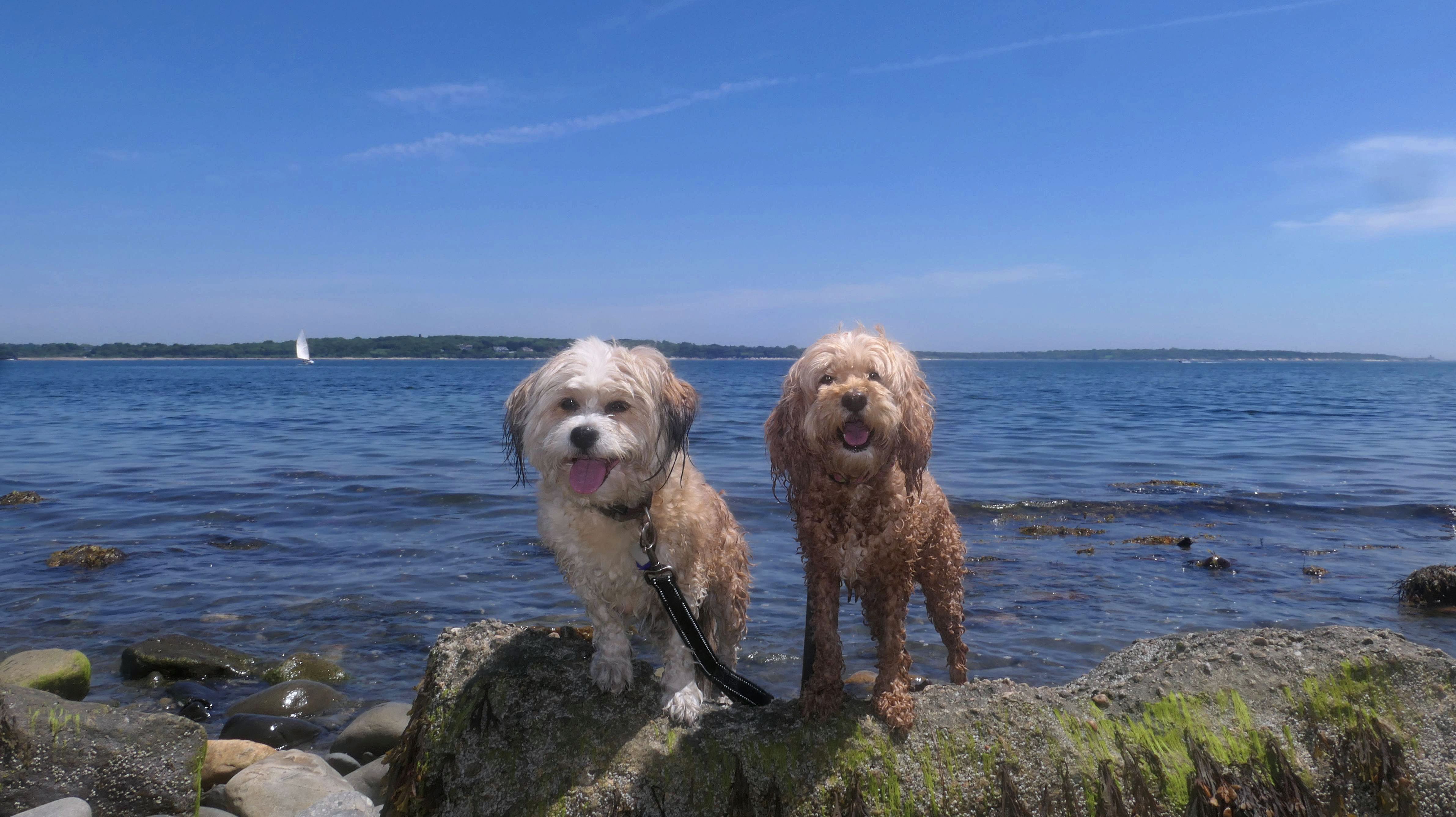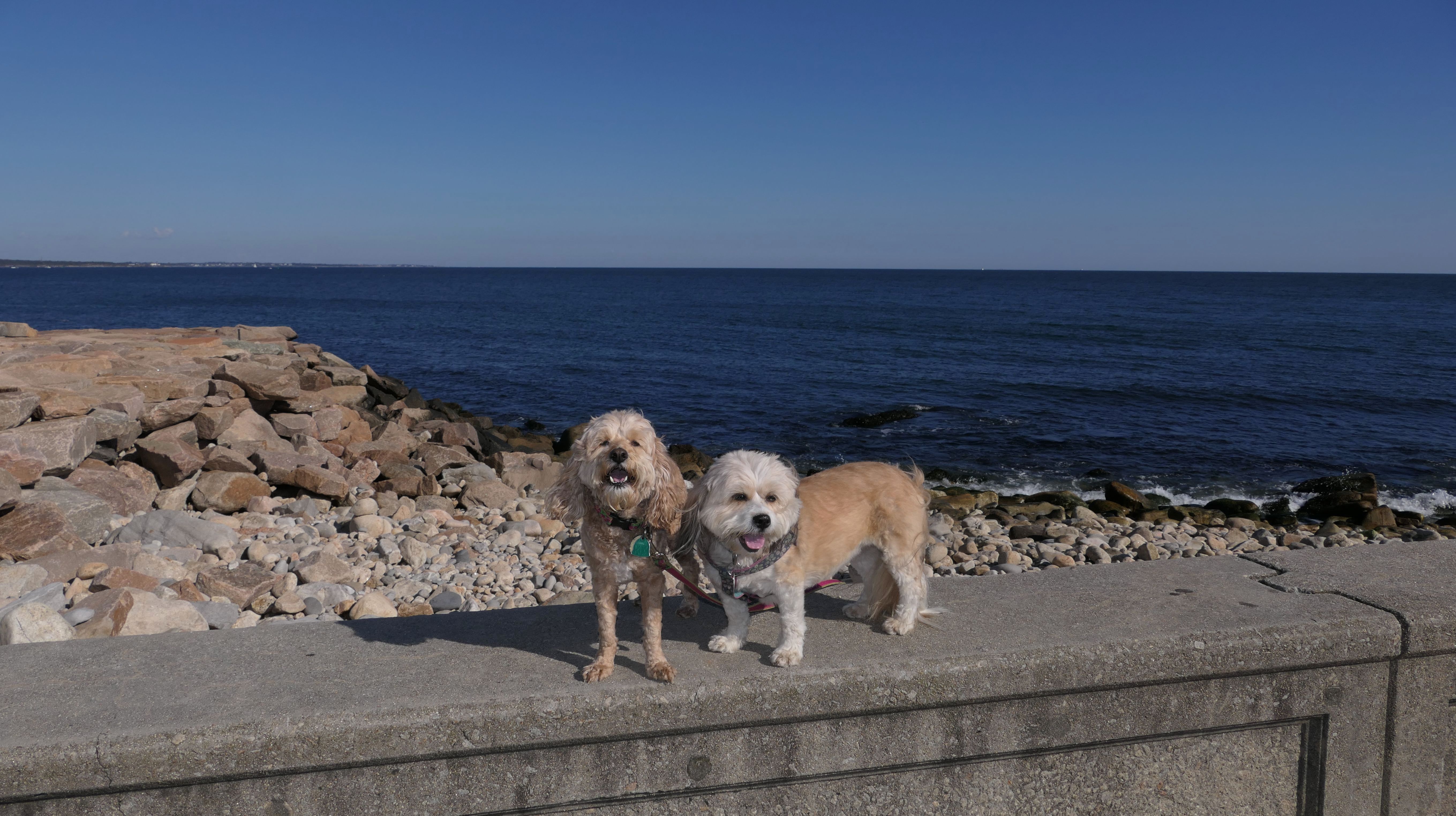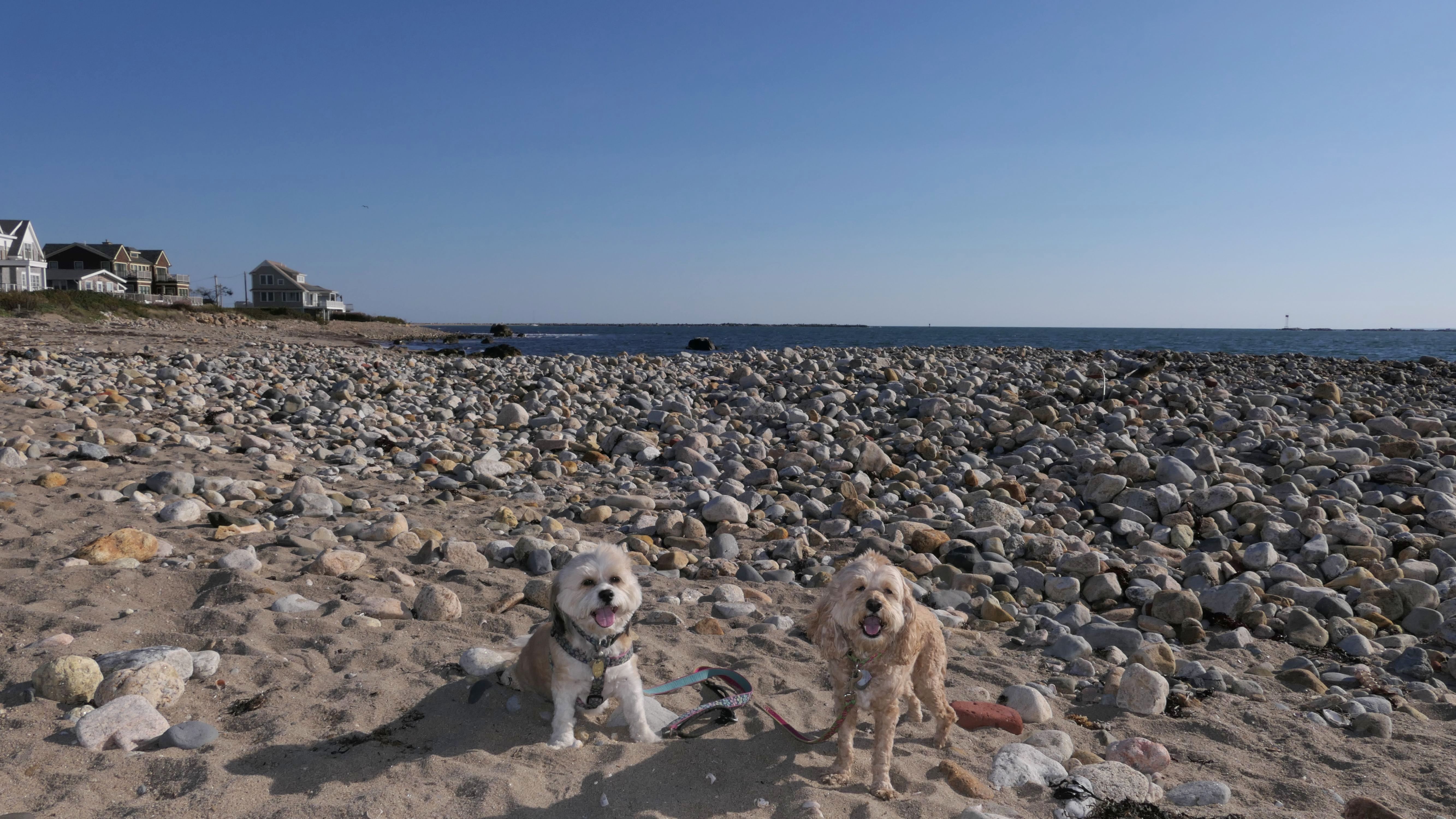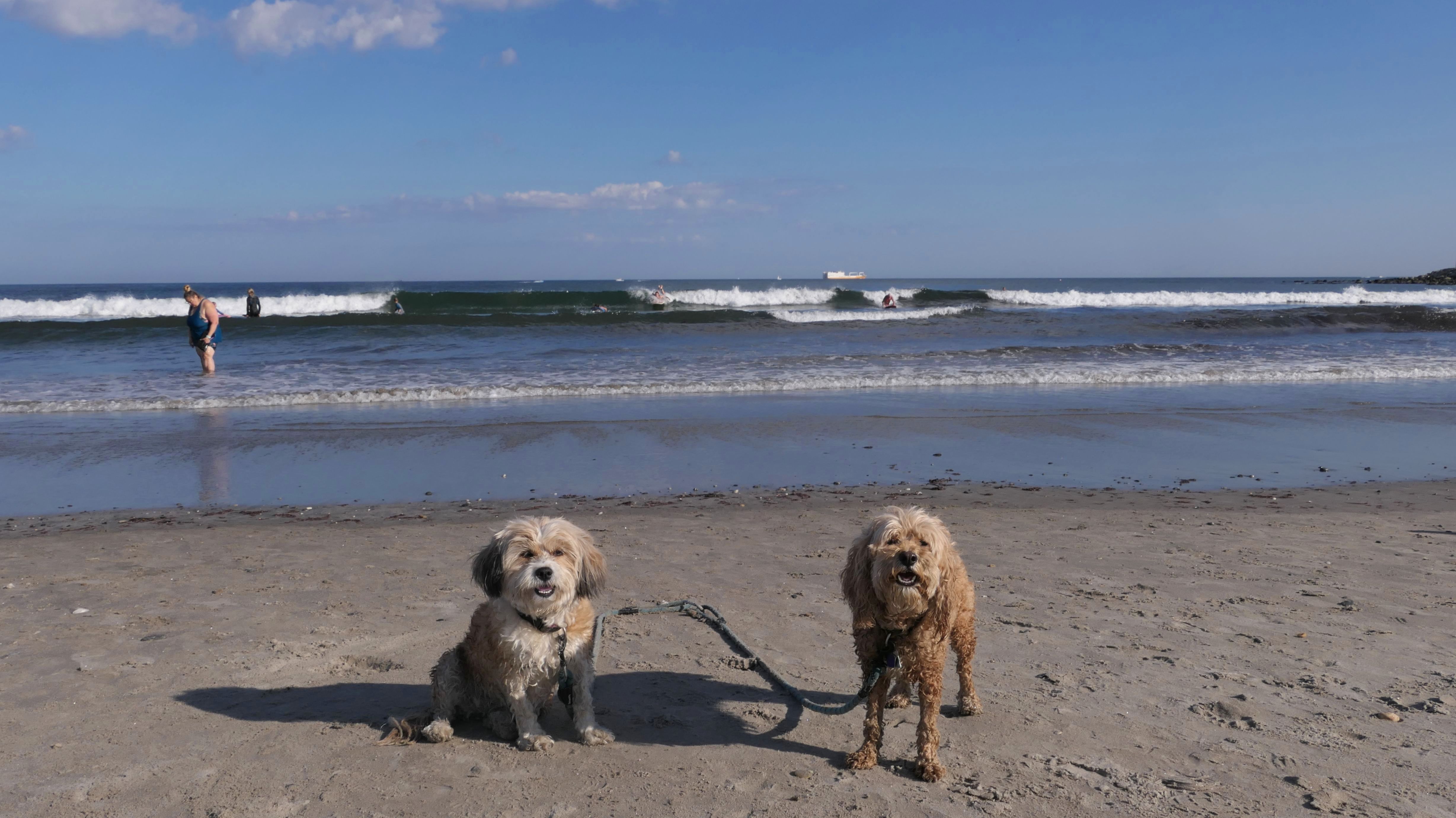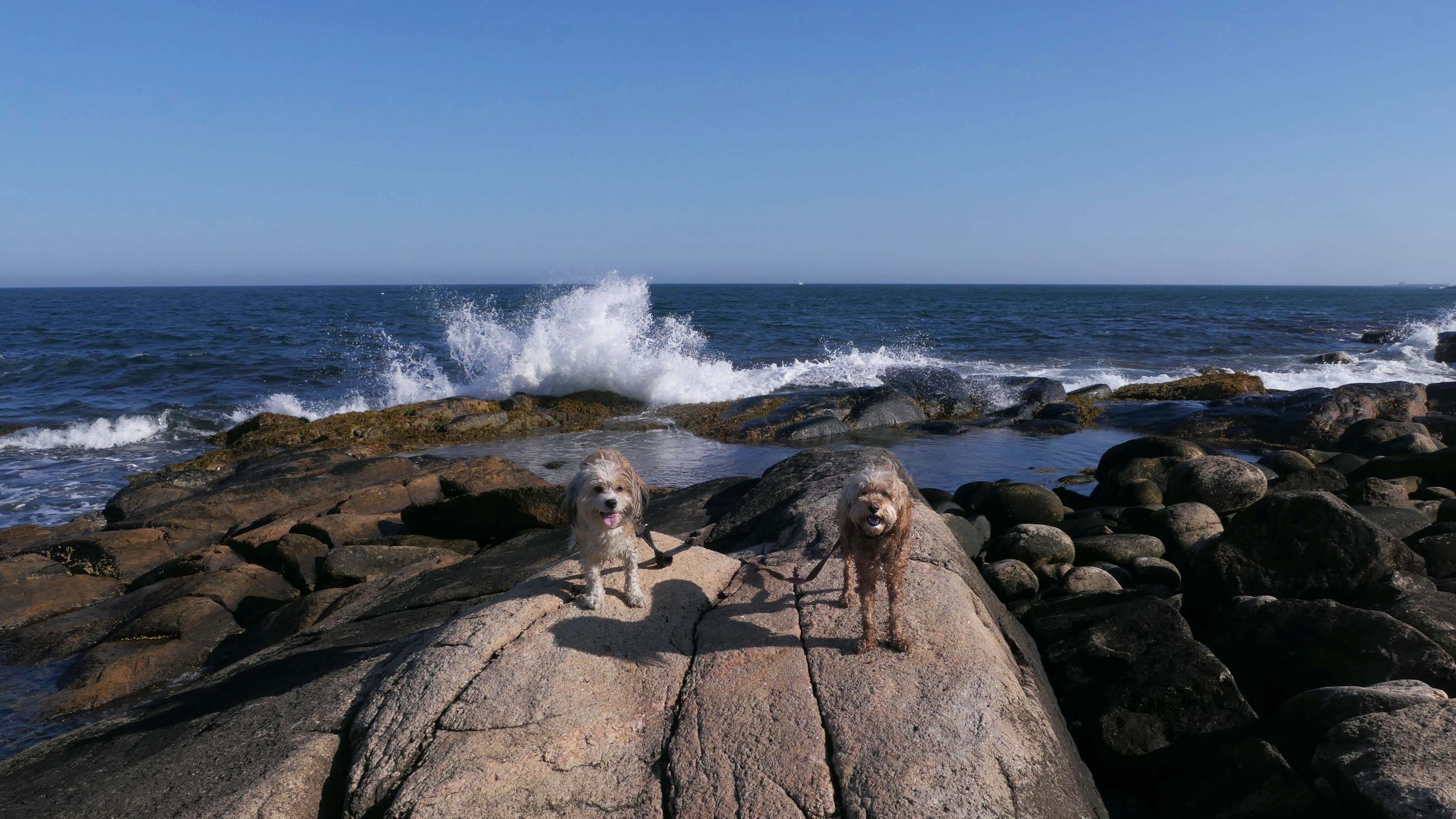 Due to the long weekend, we were let out of work early. I quickly decided to come to this beach, since we had only walked this stretch of sand once before. We started at Roger Wheeler State Beach and walked to Camp Cronin Beach and back. There's nothing new or noteworthy here. It's pretty much the same as last time we were here, except it was lower tide and we didn't have to climb over any large rocks. Waves are mild here, as breakwaters protect this area. It was cooler than it has been, but the dogs still went into the water toward the end of our walk.