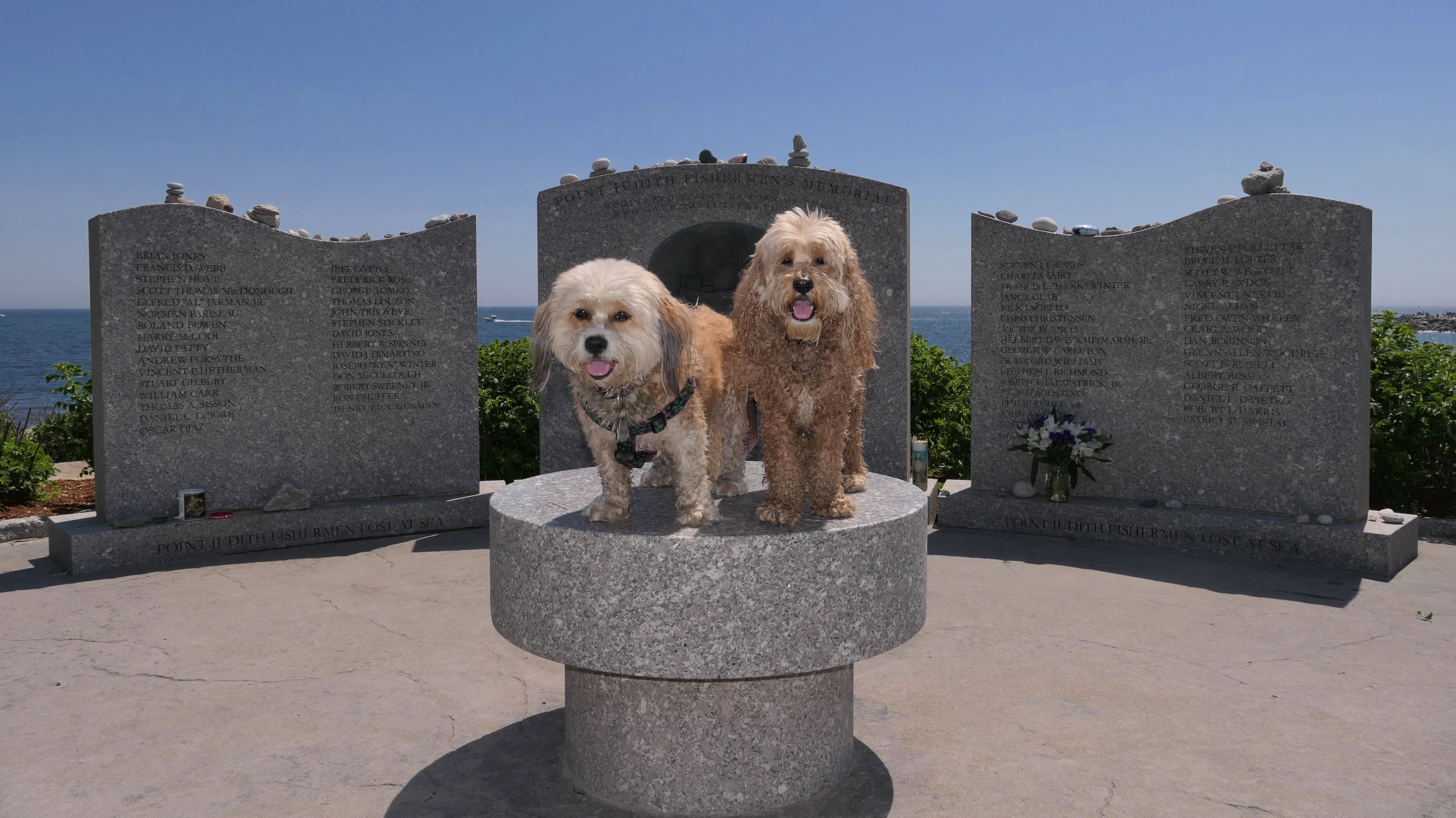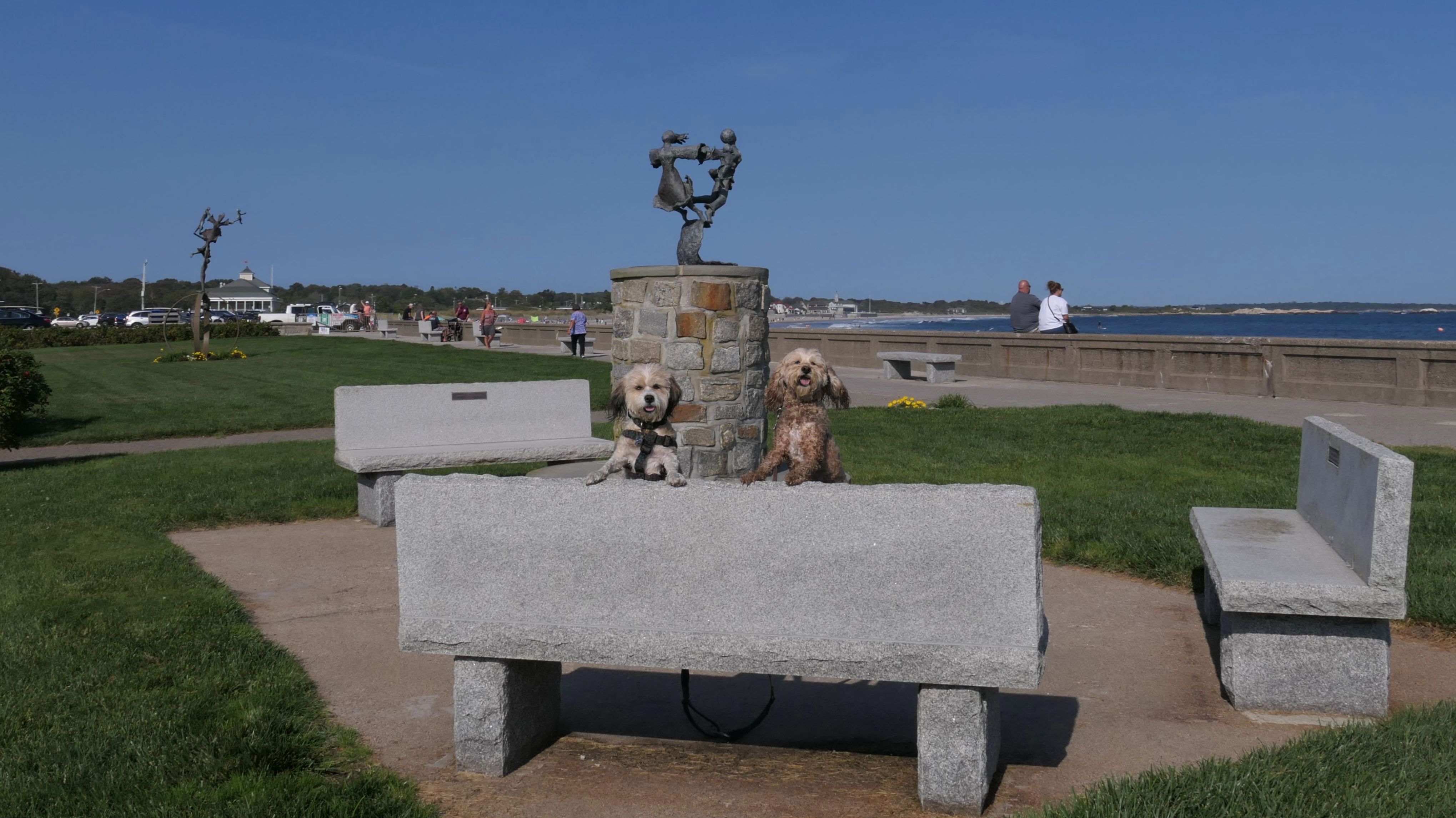 This might be the best beach we visited yet! Dogs are only allowed from September 16 through May 15. The beach is techincally "closed" from the day after Labor Day until Memorial Day Weekend, but that just means there are no life guards I guess, because the place was packed. It was another great day weather-wise. It seemed like it was a bit cool for humans on the beach. It was only in the upper 60's, but that didn't seem to stop anyone. There were plenty of people in the water, sunbathing, and walking their dogs. It looks like they stop collecting parking fees at the main lot after Labor Day, so that may have led to the amount of people as well. We arrived just before 3PM, and had to park on a nearby road because the lot was full. We walked the length of the beach and back. The sand was very nice here. Not rocky like some of the beaches. There were less people at the north end of the beach, so it was easier to get pictures of the dogs with less distractions. I guess that part of the beach is "Conochet Club Beach". There was some sort of event going on near the North Beach Clubhouse. There was a band playing and food trucks. There is also a small grassy area in front of the beach labeled "Pettaquamscutt Park" on some maps. This area is the home of the "Canonchet Memorial", which includes two statues. The dogs got to cool off in the water too! A good time was had by all!