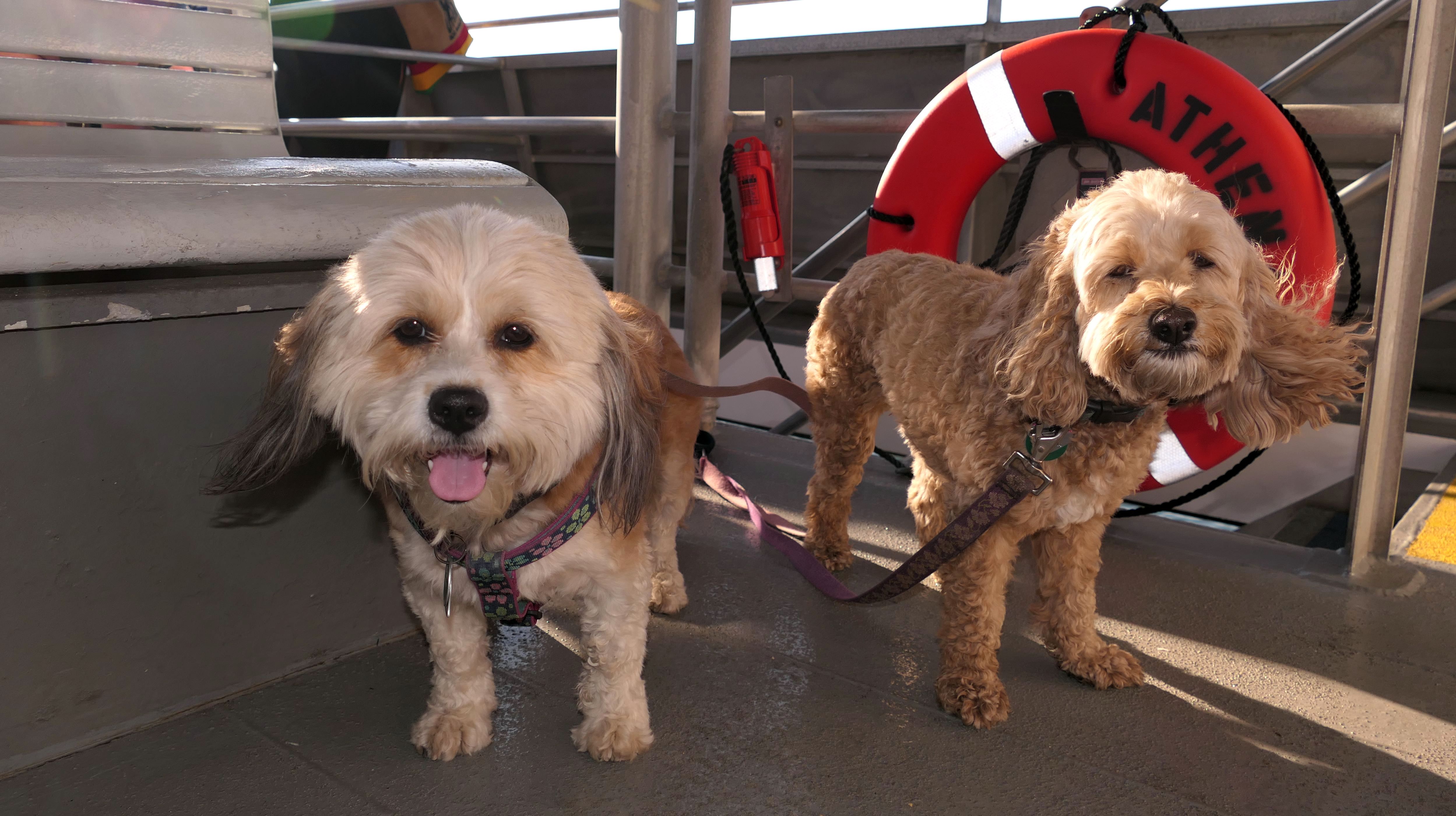 In order to visit every town in Rhode Island, we need to take a boat to get to New Shoreham (aka Block Island). So we arrived at Point Judith to take the Block Island Ferry to New Shoreham. This was the dogs first trip on a ferry, and Mandy didn't like it all. (No big deal for Lexi!) We took the high speed ferry, and it soon as it started to get moving, she started to shake. Dogs can only be on the outside deck of the ship, and they are not supposed to be on the benches, but I had to put Mandy on my lap to calm her down, which worked.