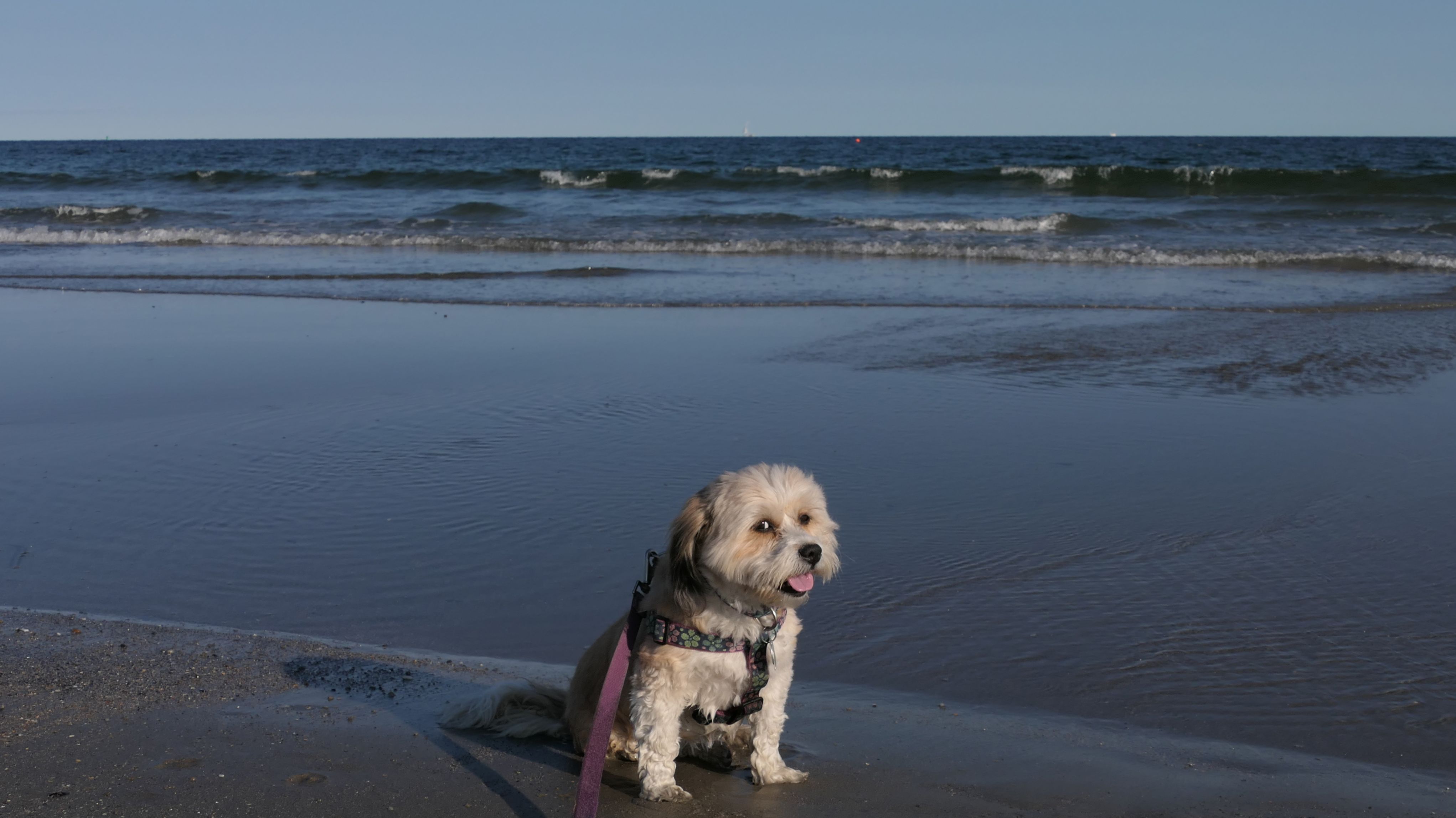 It was a hot day, so we came down to this beach. As mentioned previously on this page, dogs are allowed year round here, and there is no parking fee. The lot was almost full, and the beach was pretty busy. I'm not sure what was going on with the two guys holding woodwind instruments. They weren't playing the instruments, so maybe they were shooting a video. We only stayed about a half hour or so this time around, as it started to get cloudy, so we went somewhere sunnier.