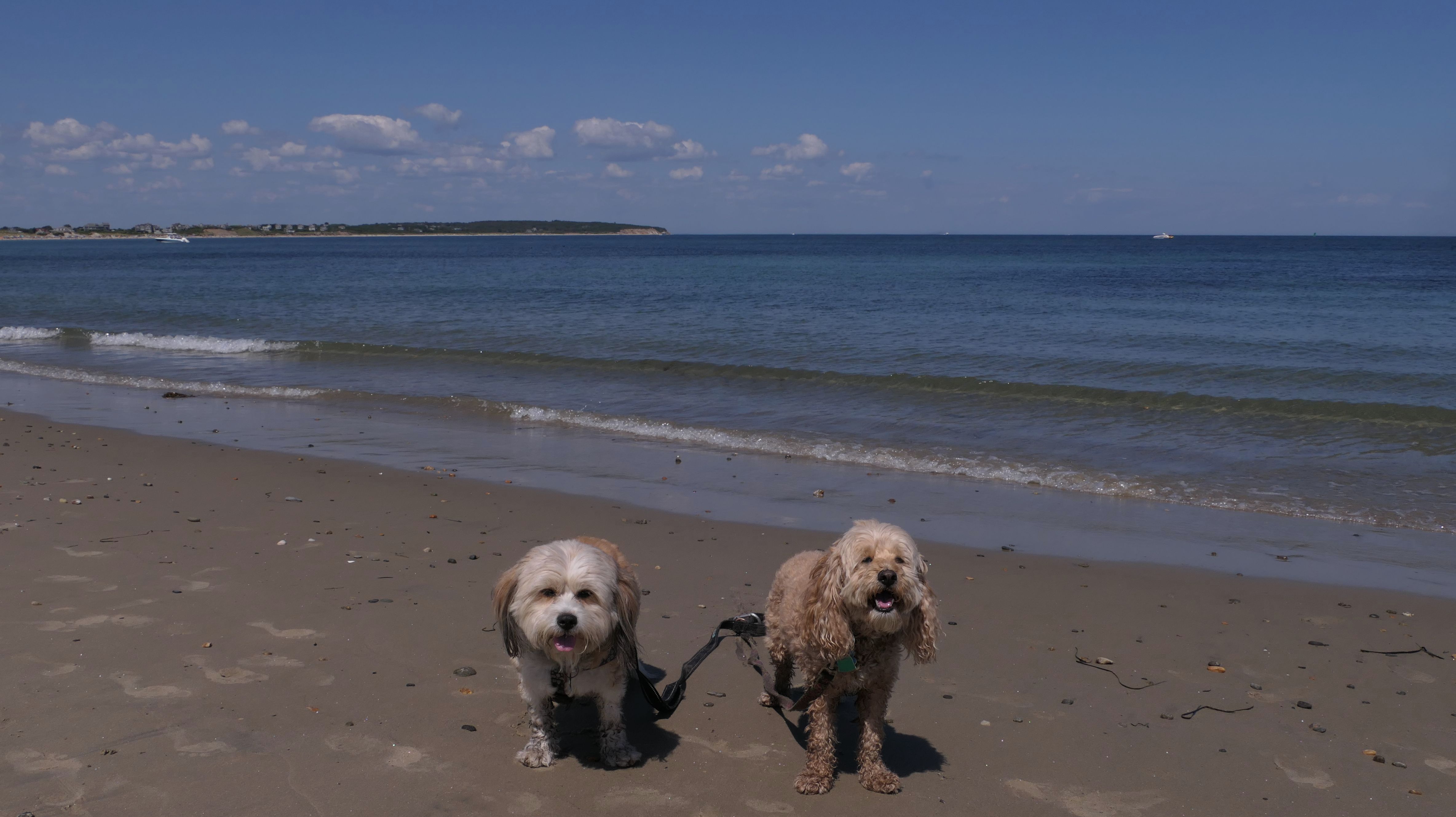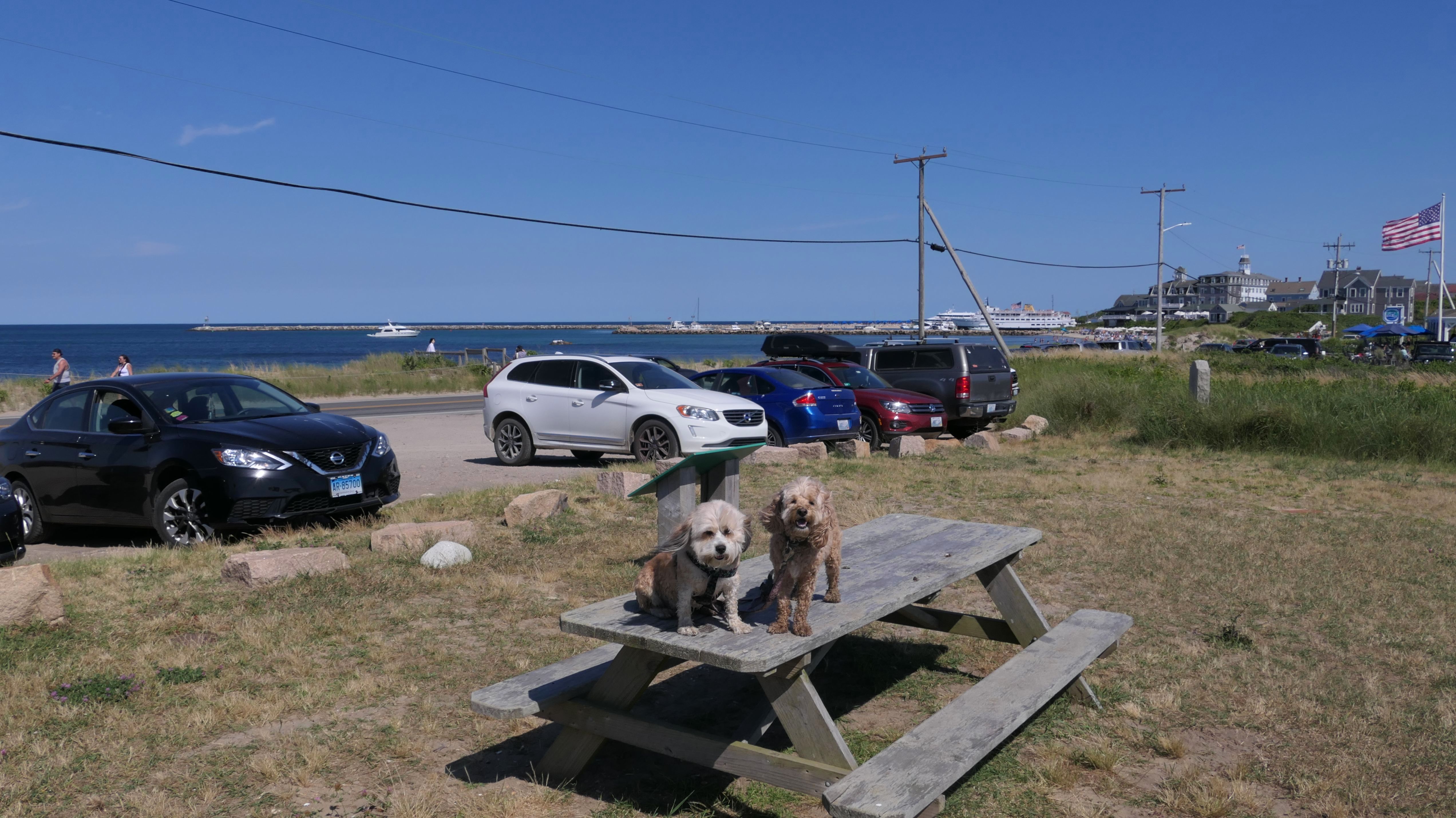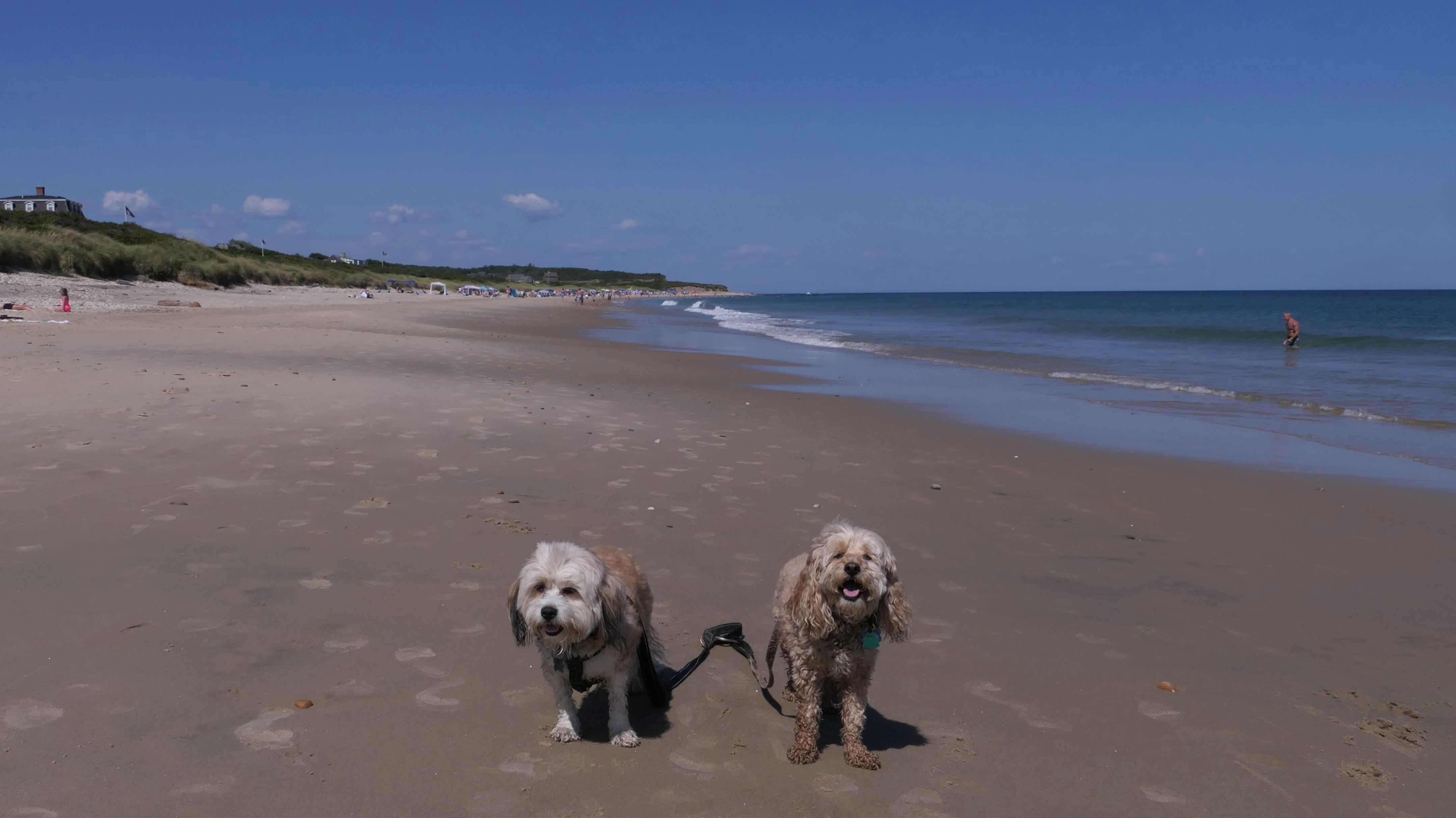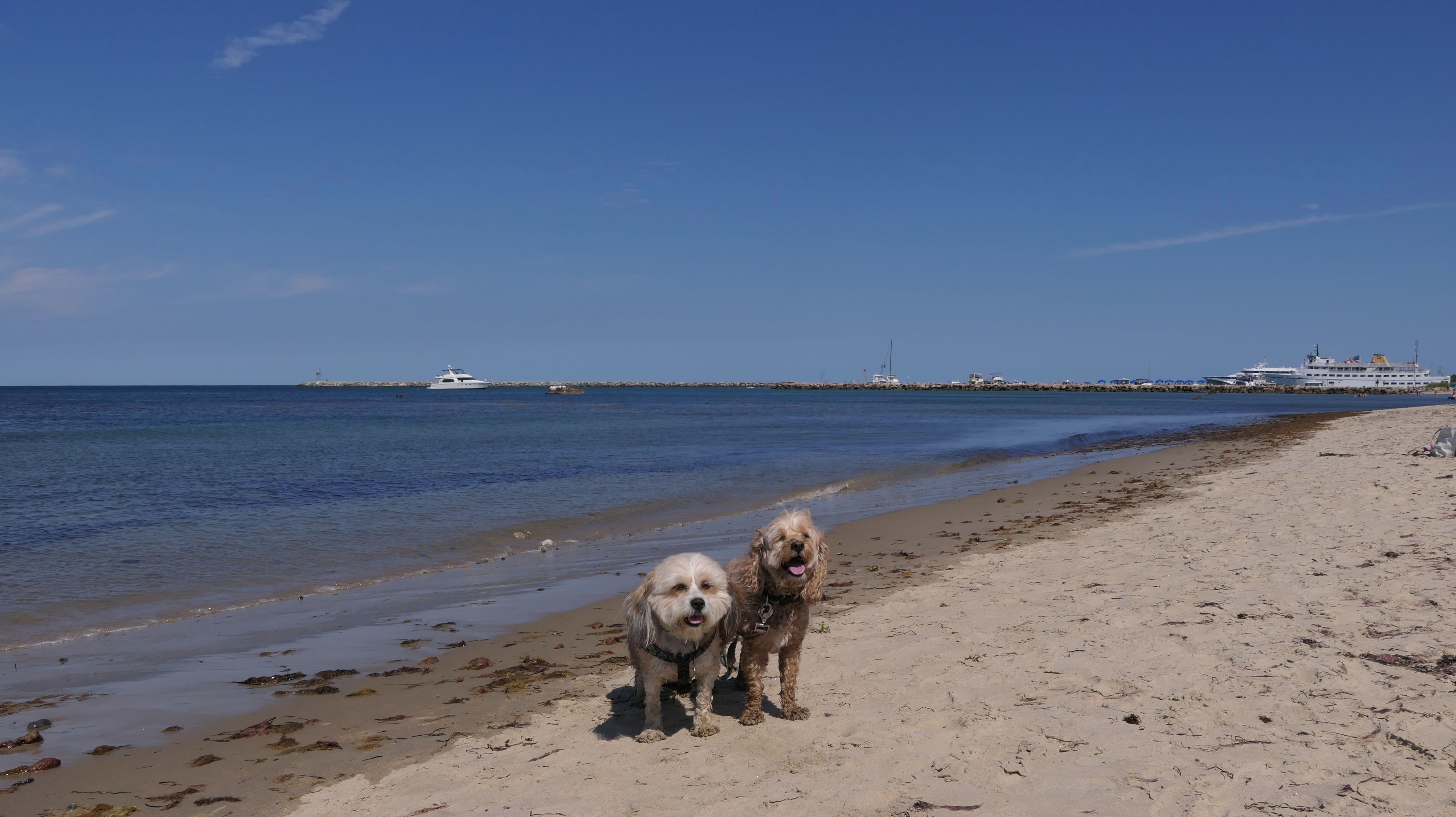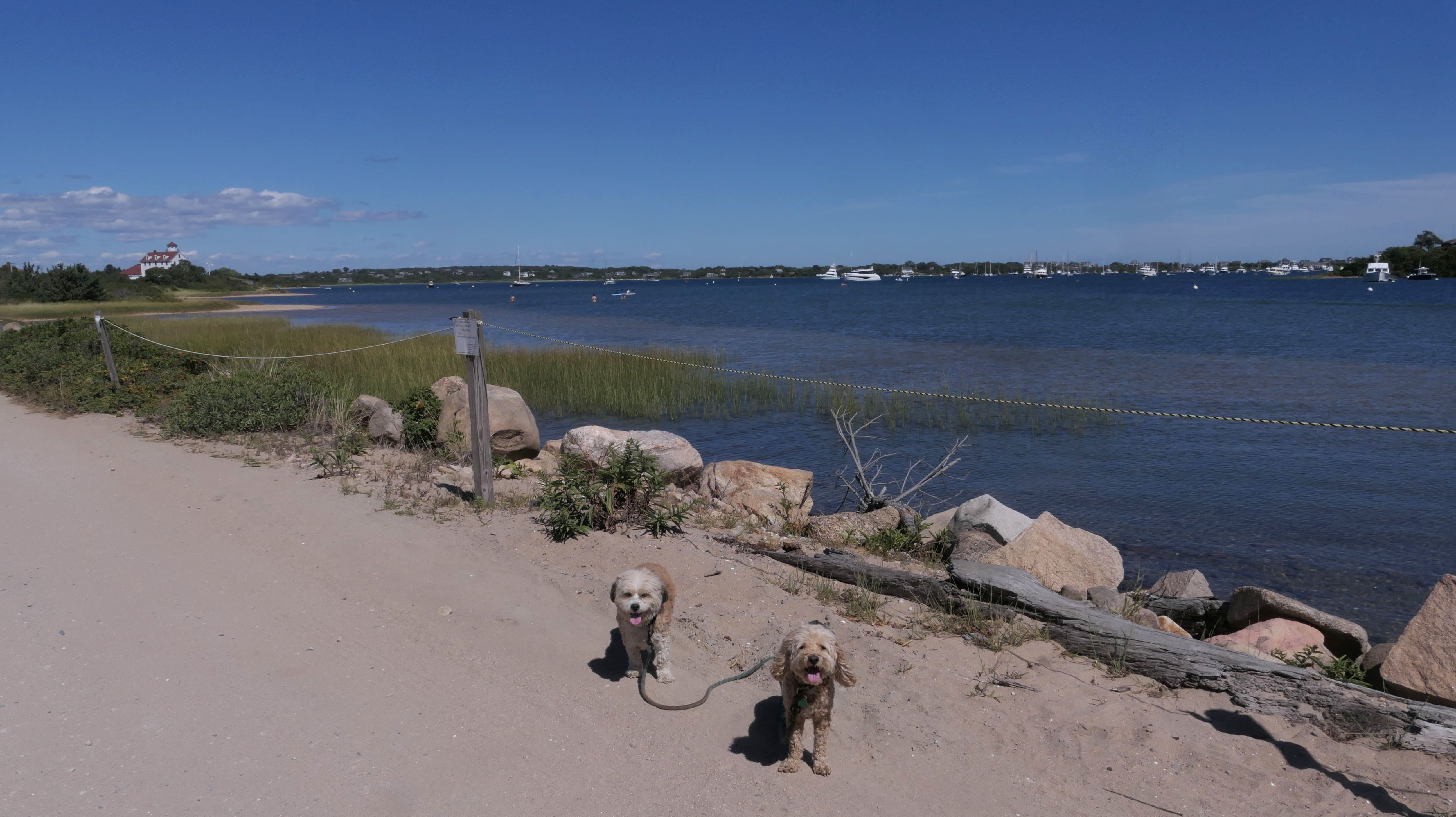 Since we rented a car for the day, I wanted to go to a beach that we couldn't get to on our previous trips. Some of the nicer beaches along the southern coast of the island require long climbs down steep dunes, so we settled for this beach along the northwest side of the island. It's remote and out of the way. We were the only ones there. It's rocky, with milder waves, which is the way the dogs like it! The informational sign near the ferry landing says this is a good spot to find beach glass, but all we found was broken glass from bottles near the entrance to the beach at the end of West Beach Road. Be careful with the dogs at the entrance! We found a trail that leads out toward the Great Salt Pond. We walked down that trail a short distance before turning around and heading back. This was a different experience from the tourist beaches along the northeast side of the island, but I didn't think it was quite as nice. Mandy and Lexi loved the water though, and in the end, isn't that all that counts!