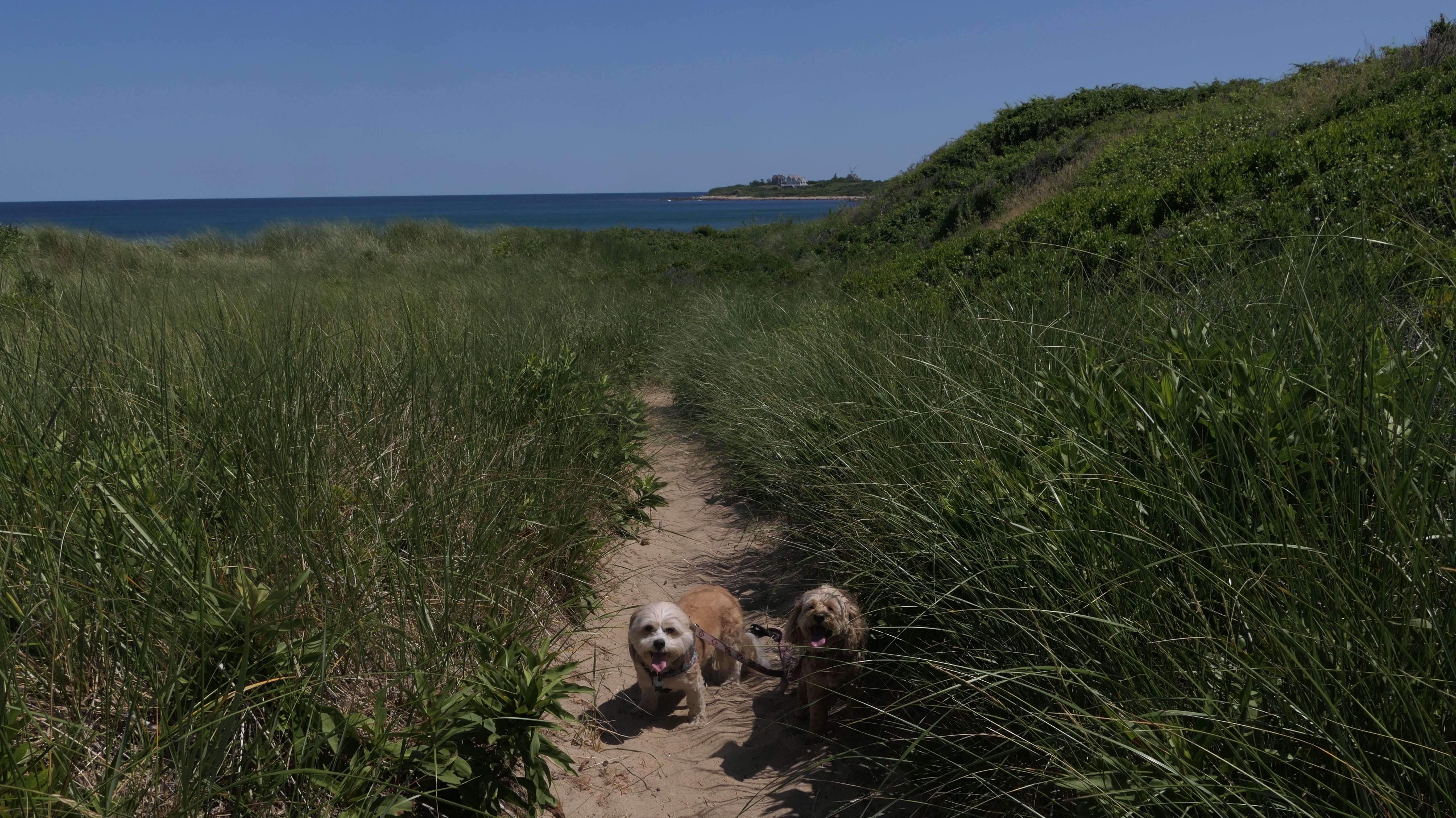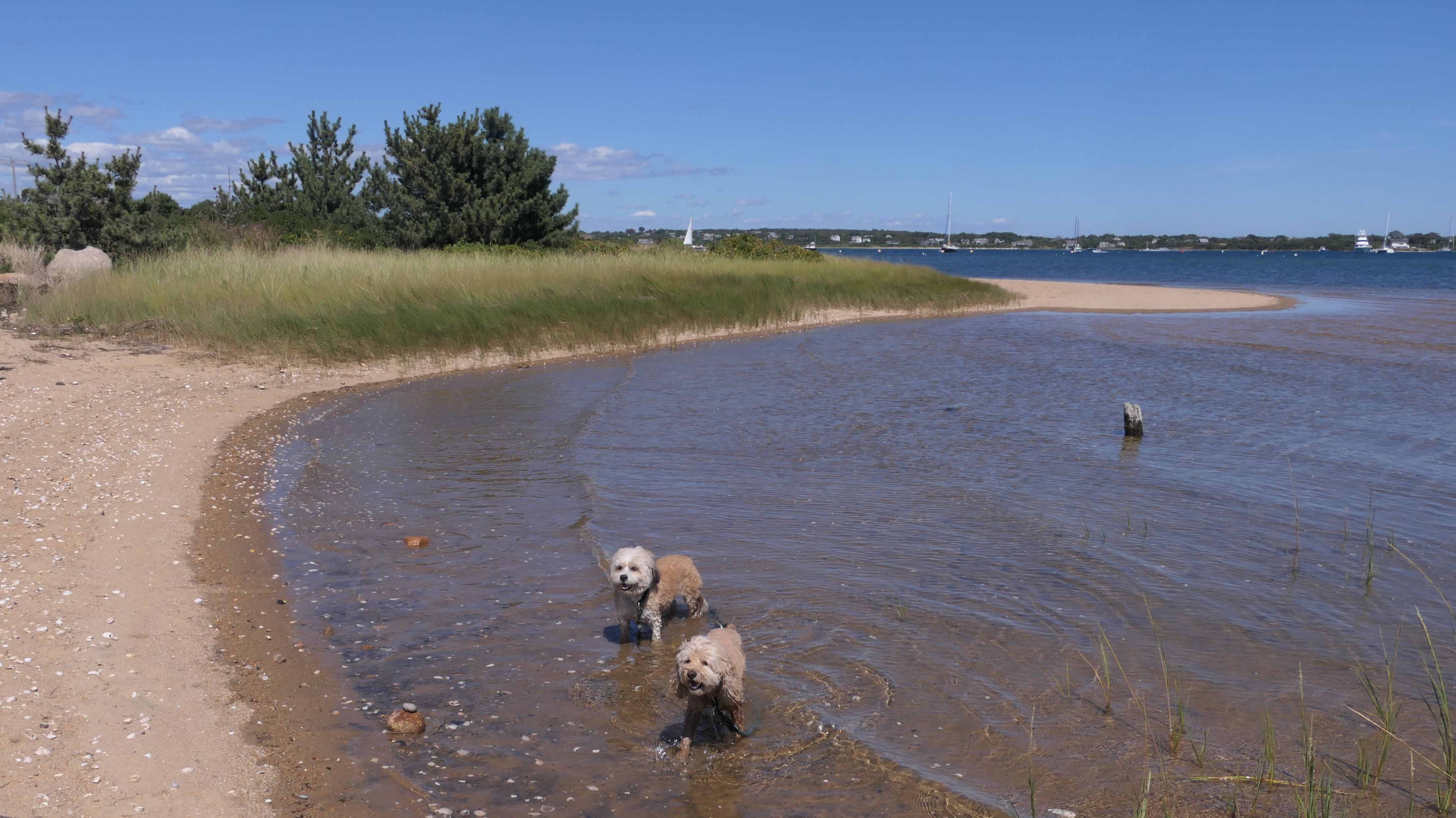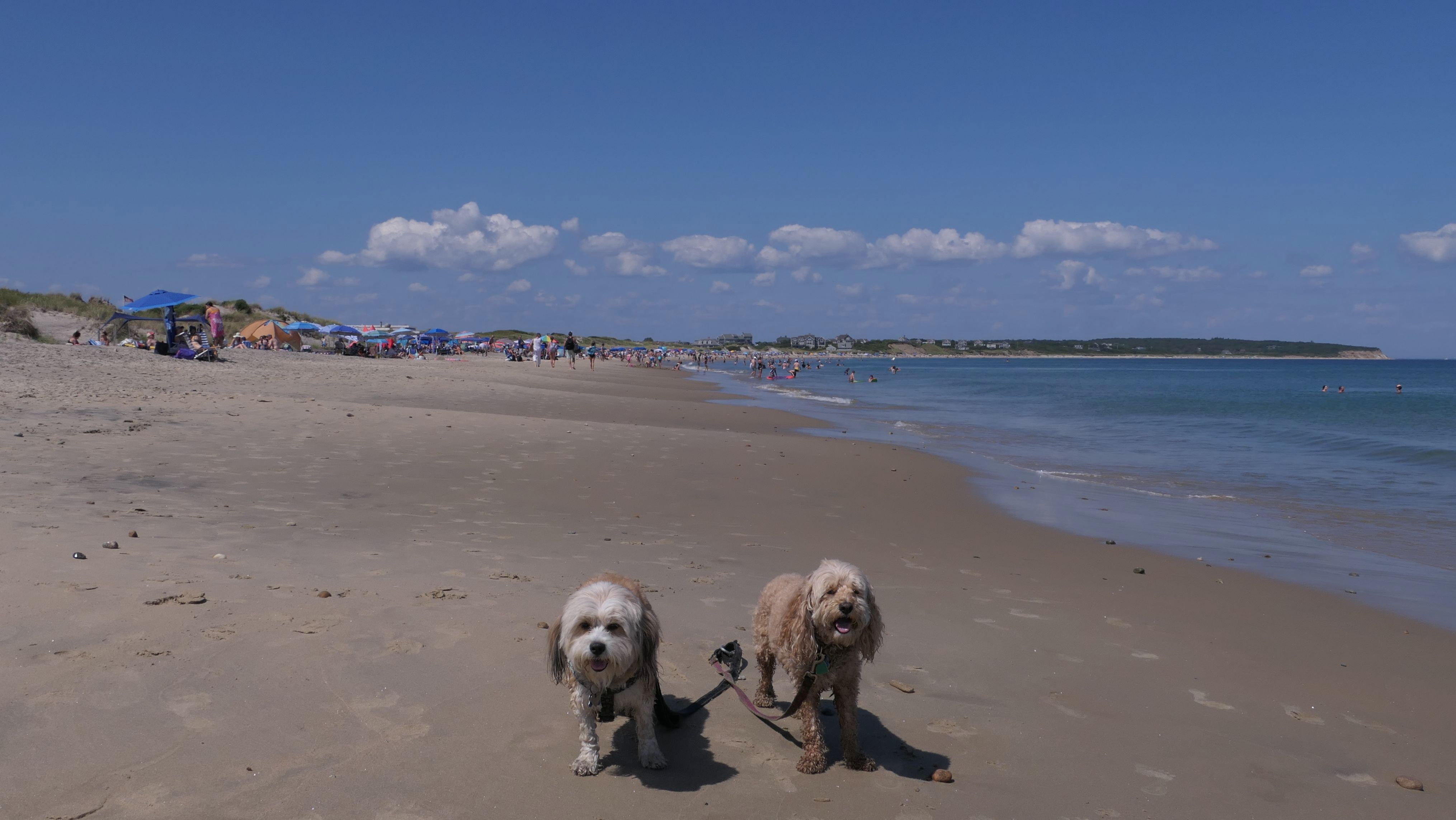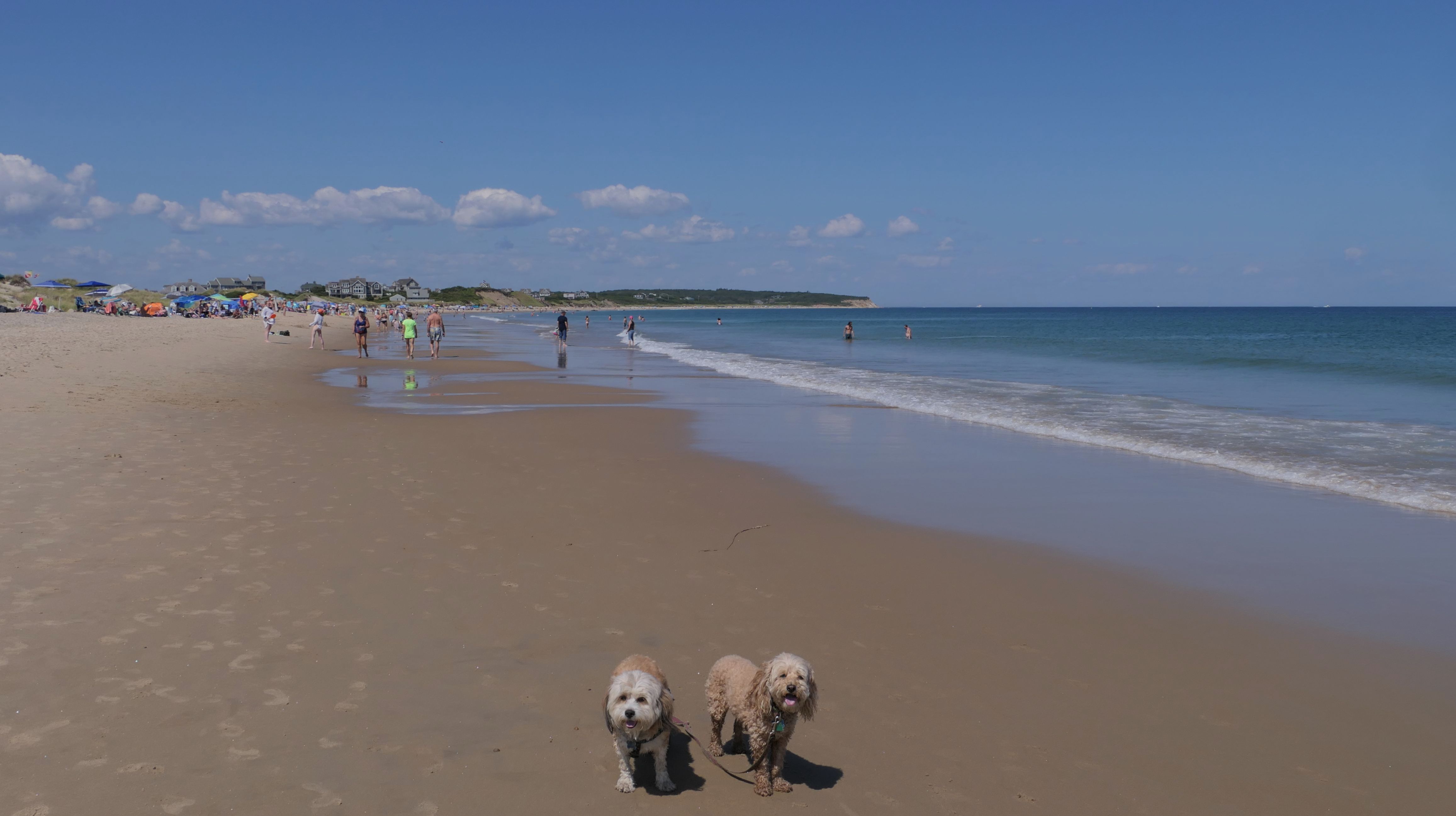 Since we rented a car for the day, I wanted to go to a beach that we couldn't get to on our previous trips. Some of the nicer beaches along the southern coast of the island require long climbs down steep dunes, so we settled for this beach along the northwest side of the island. It's remote and out of the way. We were the only ones there. It's rocky, with milder waves, which is the way the dogs like it! The informational sign near the ferry landing says this is a good spot to find beach glass, but all we found was broken glass from bottles near the entrance to the beach at the end of West Beach Road. Be careful with the dogs at the entrance! We found a trail that leads out toward the Great Salt Pond. We walked down that trail a short distance before turning around and heading back. This was a different experience from the tourist beaches along the northeast side of the island, but I didn't think it was quite as nice. Mandy and Lexi loved the water though, and in the end, isn't that all that counts!