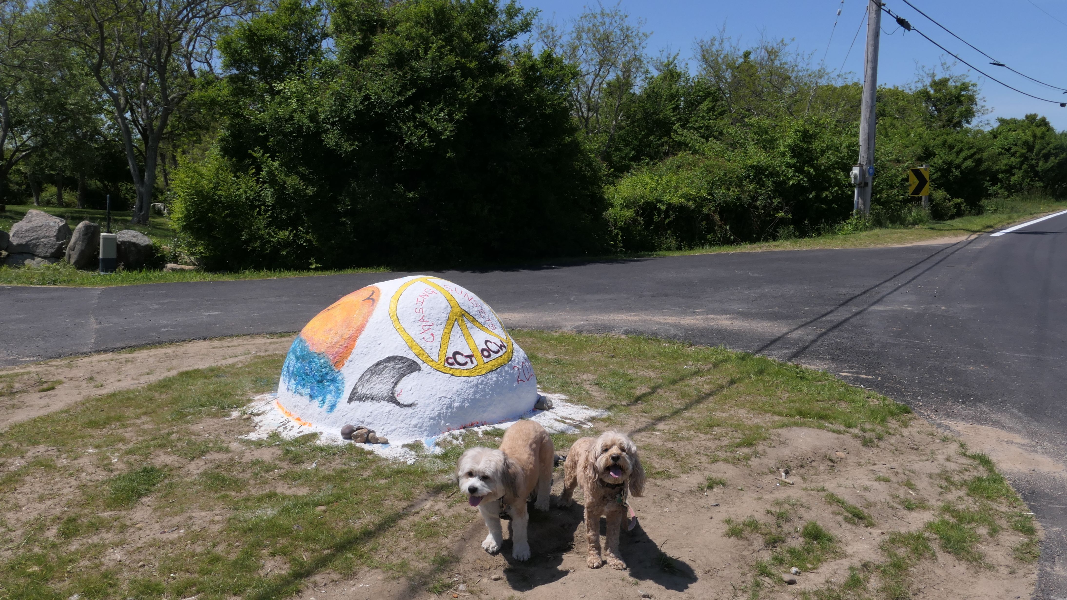 This is an overlook area with views of Mohegan Bluffs, not far from the Southeast Lighthouse. Besides the viewing platform, there is a stair case that leads down to the beach. There are 140+ steps and a 20 foot scramble on rocks required to reach the beach. We only went about half way down and took a photo at the mid point. The views are incredible here. I kind of regret not going all the way, but the climb back up would be really hard on Mandy, who has a bit of arthritis these days. There looks to be an alternate trail down without the steps that might work better, so perhaps we'll try again on a future trip. There is a second observation platform, about a quarter mile west from the main area. We took some photos from there too. I've also included a photo at "The Painted Rock", which shows up as a landmark on Google Maps and seems to be just a rock that gets painted differently each year.