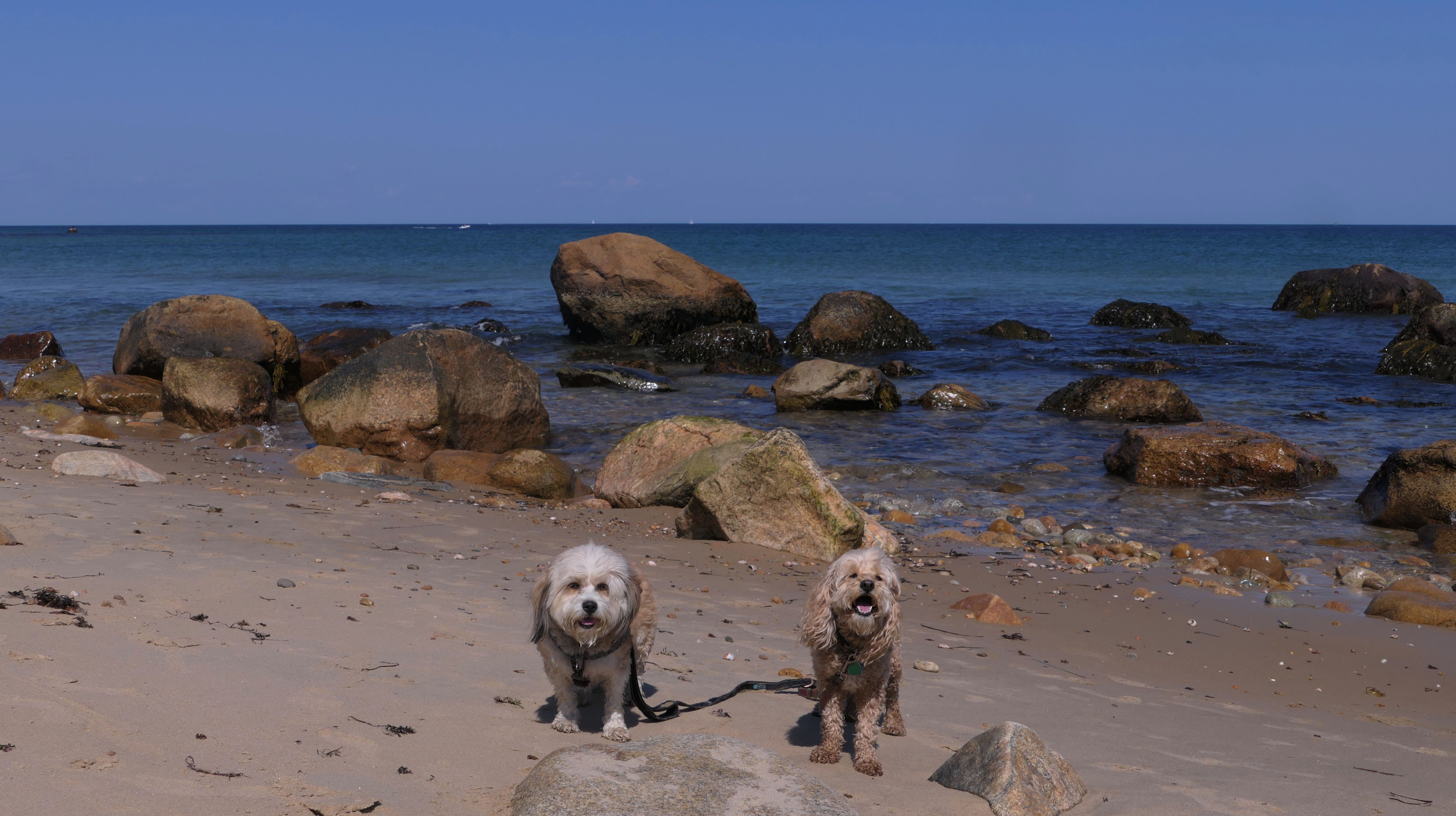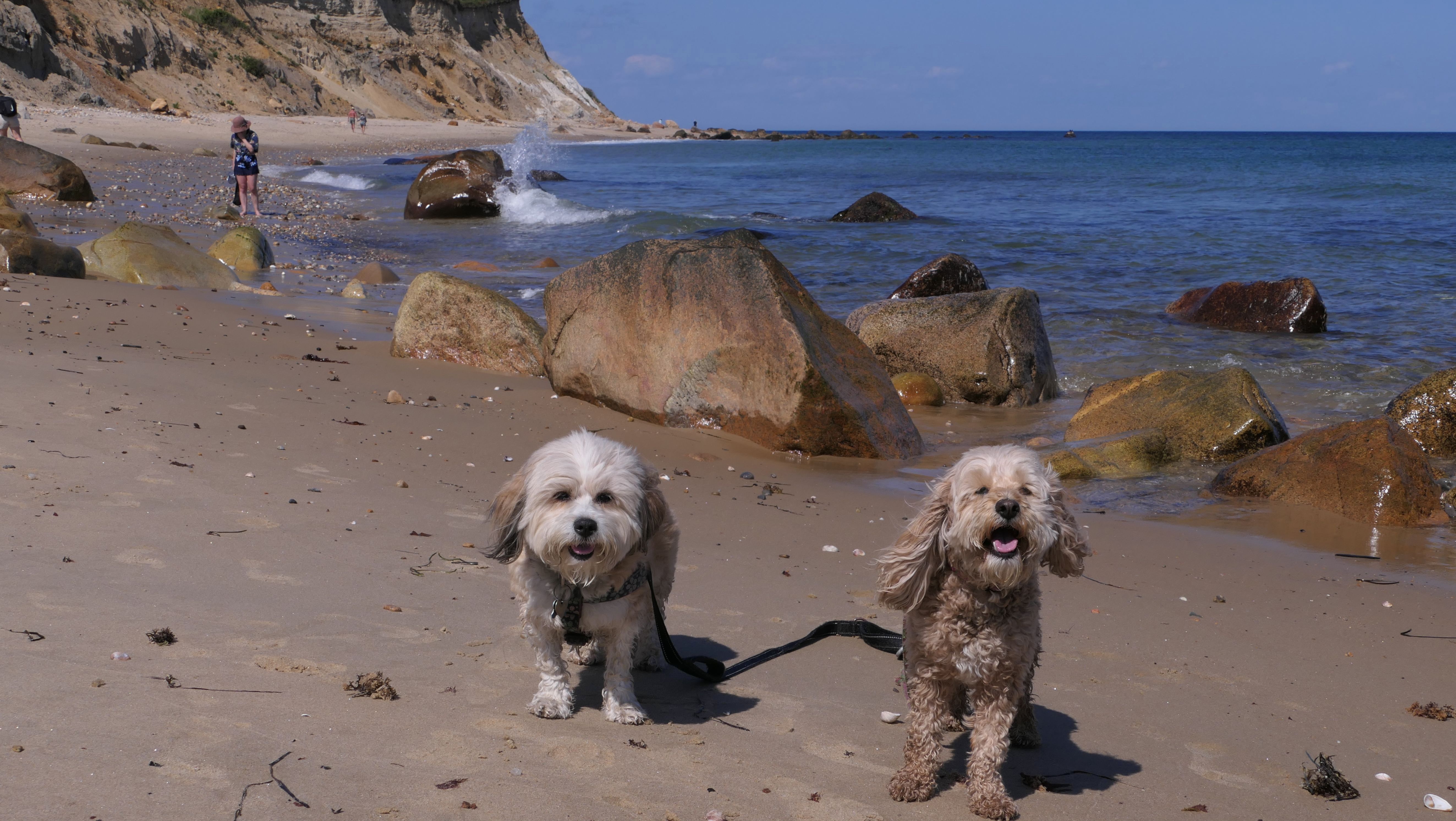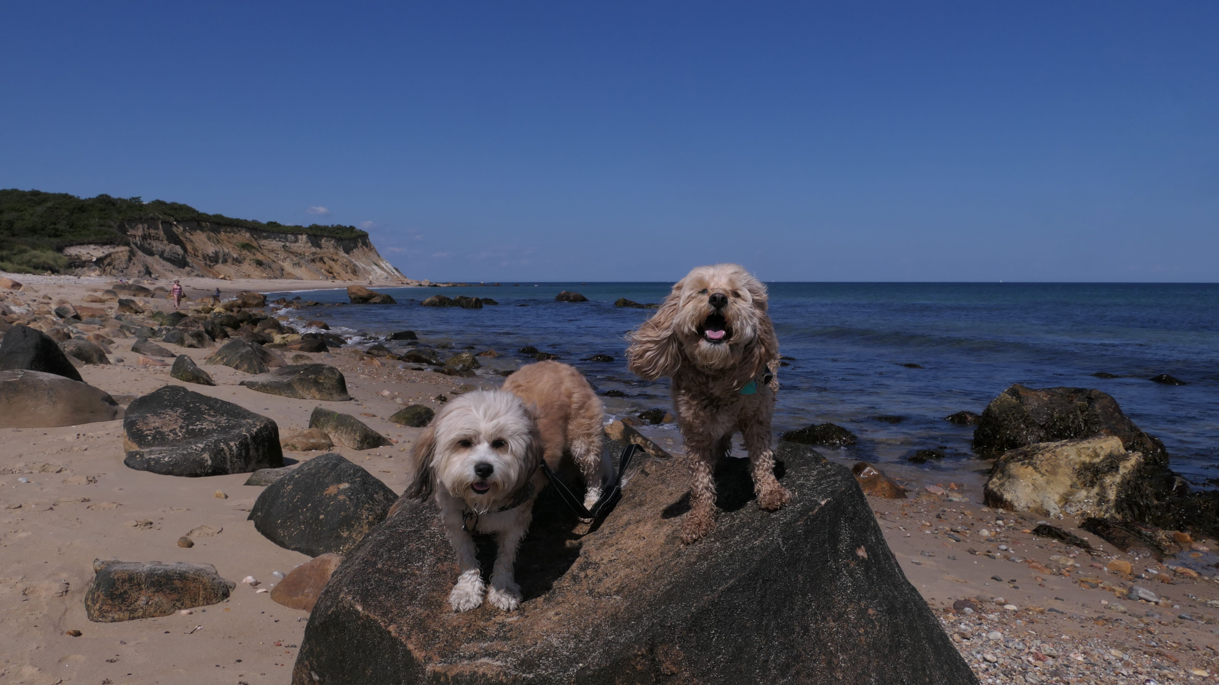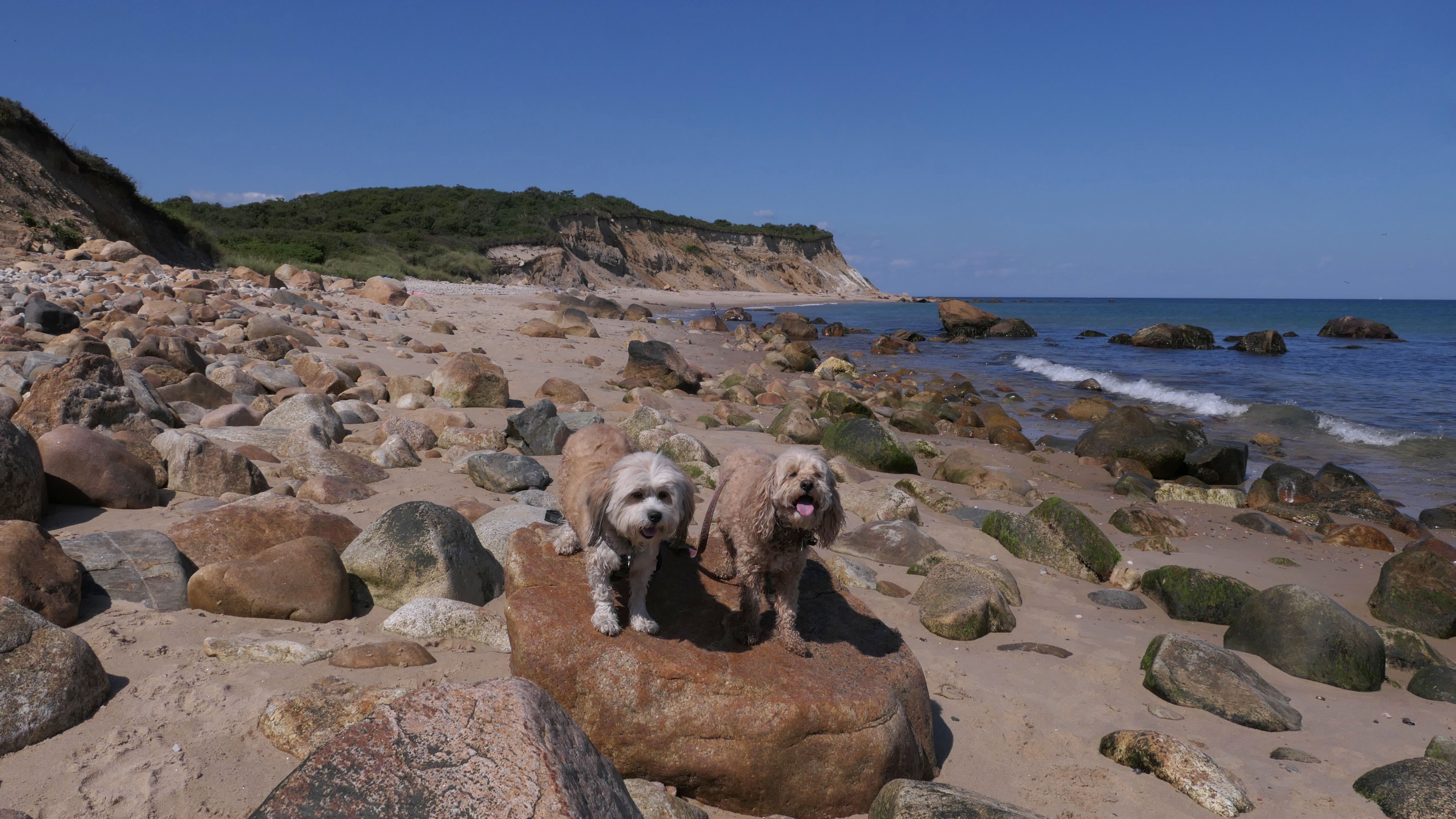 This was the highlight of this trip to Block Island. A couple months earlier we visited the Edward S Payne Overlook, and walked part way down the 141 steps, but did not go all the way down to the beach. This time, we were bound and determined to make it to the beach, so we went all the way down. At the bottom of the stairs is actually a series of rocks that have to be traversed carefully to get to the beach. Once at the bottom, we walked about a mile and a half along the beautiful shore, over to Vaill Beach before turning around and heading back. The views were gorgeous. The beach is a mix of sandy and rocky areas, with plenty of spots for great photos. One thing to be aware of, a section of the beach about a quarter mile from the stairs around the first bend, appears to be unofficially clothing optional. We encountered one nearly naked man sun bathing with his wife (he was wearing only a hat). His wife was wearing a bathing suit. Just something to be aware of. While we were walking back, I let the dogs off-leash to run around a bit. They always enjoy running free on the beach! We made it up the 141 steps on our way back with no issue. The hardest part was climbing over the rocks leading to the staircase. The area had gotten real busy, and there were people just sort of mulling around the rocks, making it difficult to get by. Once we got past that, the walk up wasn't too bad. I'm definitely glad we made it to this beach this time around. It was definitely worth the climb!