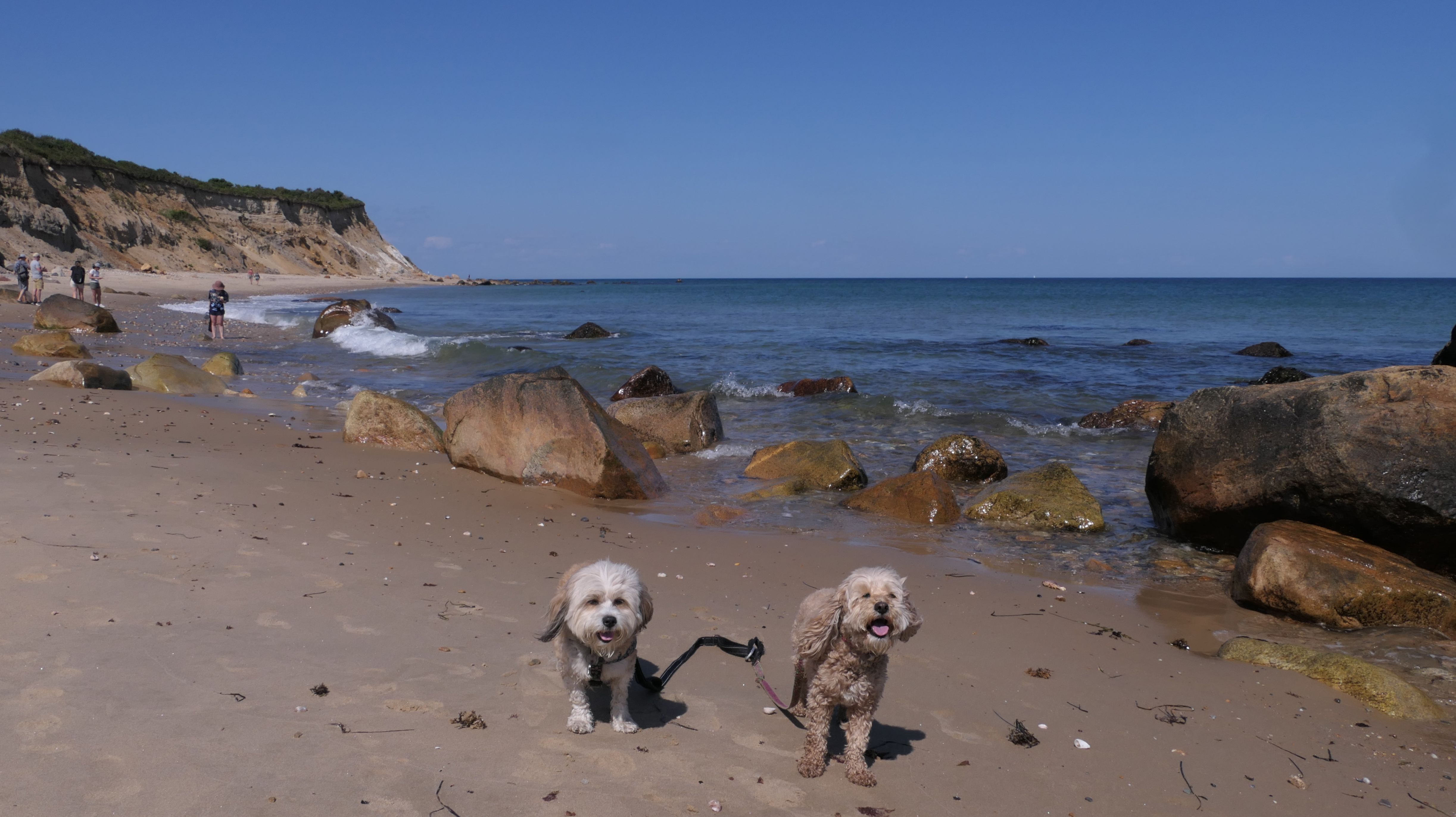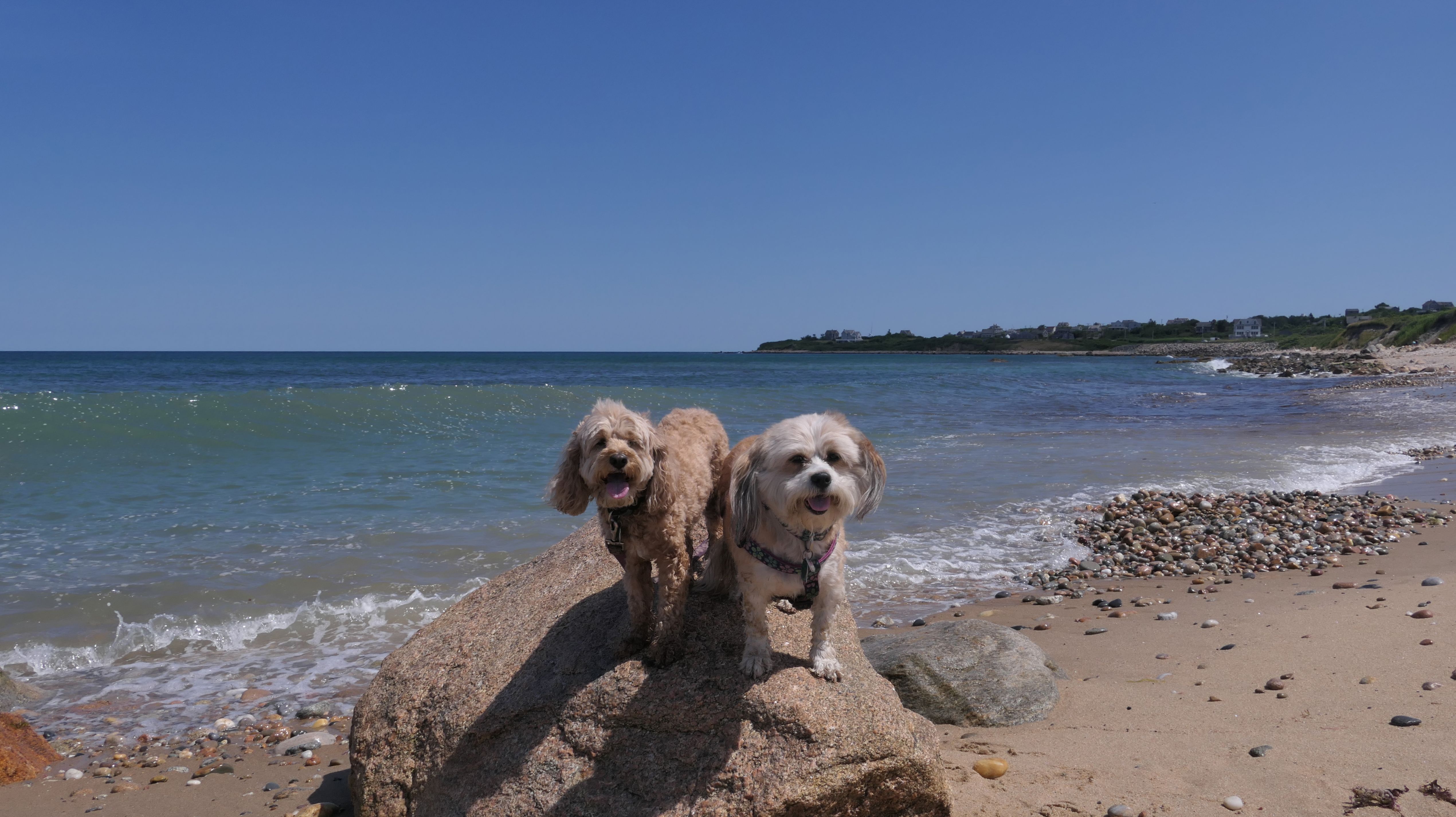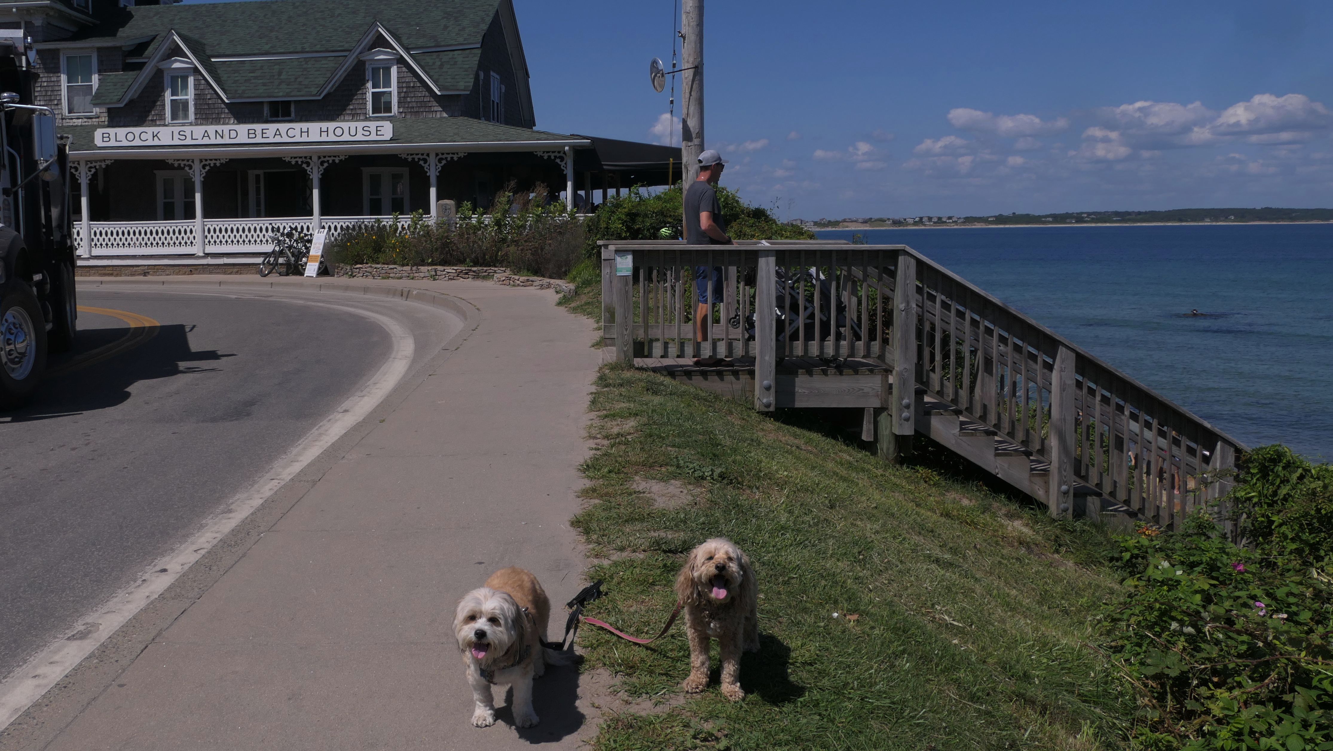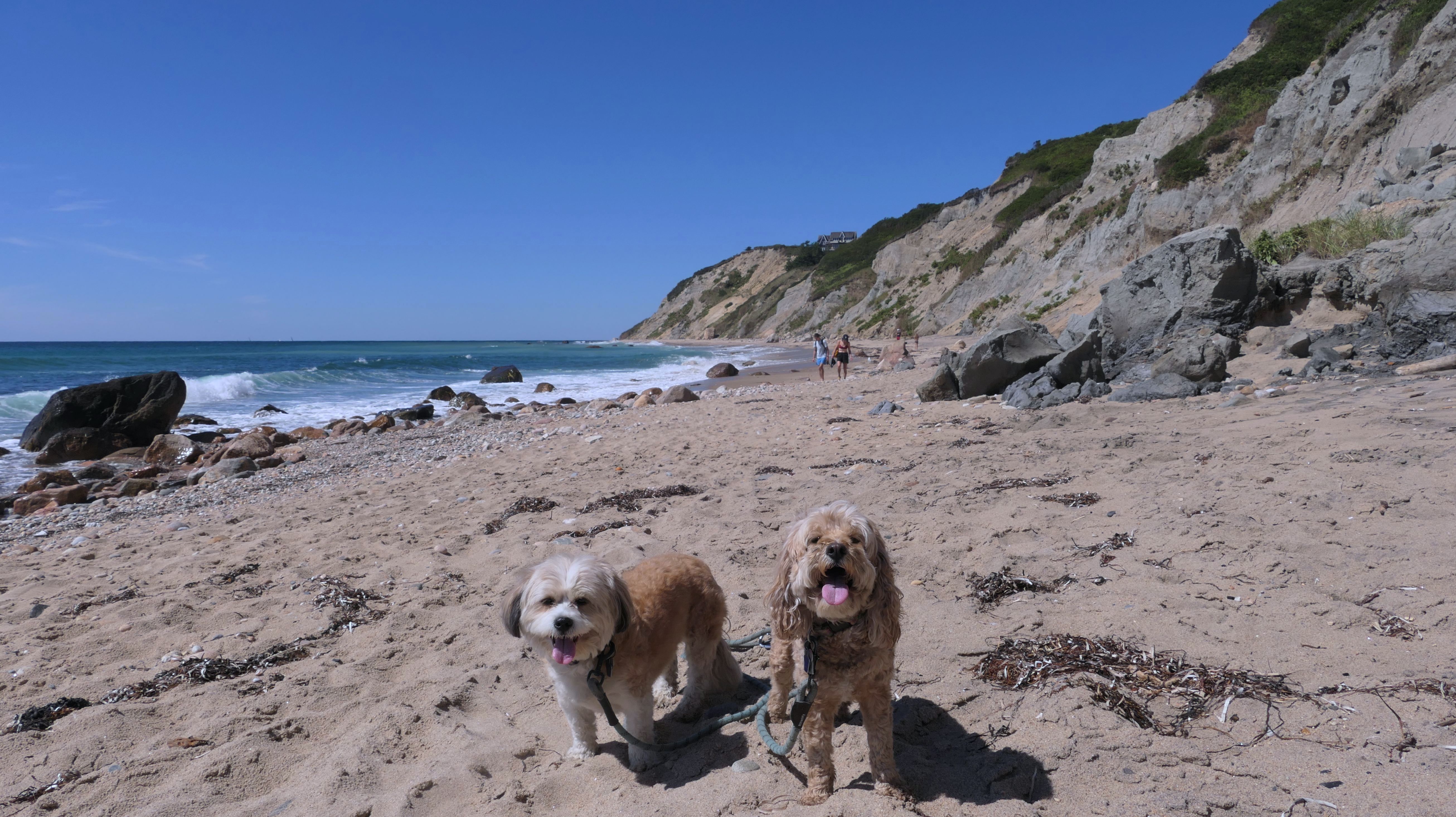 This was the highlight of this trip to Block Island. A couple months earlier we visited the Edward S Payne Overlook, and walked part way down the 141 steps, but did not go all the way down to the beach. This time, we were bound and determined to make it to the beach, so we went all the way down. At the bottom of the stairs is actually a series of rocks that have to be traversed carefully to get to the beach. Once at the bottom, we walked about a mile and a half along the beautiful shore, over to Vaill Beach before turning around and heading back. The views were gorgeous. The beach is a mix of sandy and rocky areas, with plenty of spots for great photos. One thing to be aware of, a section of the beach about a quarter mile from the stairs around the first bend, appears to be unofficially clothing optional. We encountered one nearly naked man sun bathing with his wife (he was wearing only a hat). His wife was wearing a bathing suit. Just something to be aware of. While we were walking back, I let the dogs off-leash to run around a bit. They always enjoy running free on the beach! We made it up the 141 steps on our way back with no issue. The hardest part was climbing over the rocks leading to the staircase. The area had gotten real busy, and there were people just sort of mulling around the rocks, making it difficult to get by. Once we got past that, the walk up wasn't too bad. I'm definitely glad we made it to this beach this time around. It was definitely worth the climb!