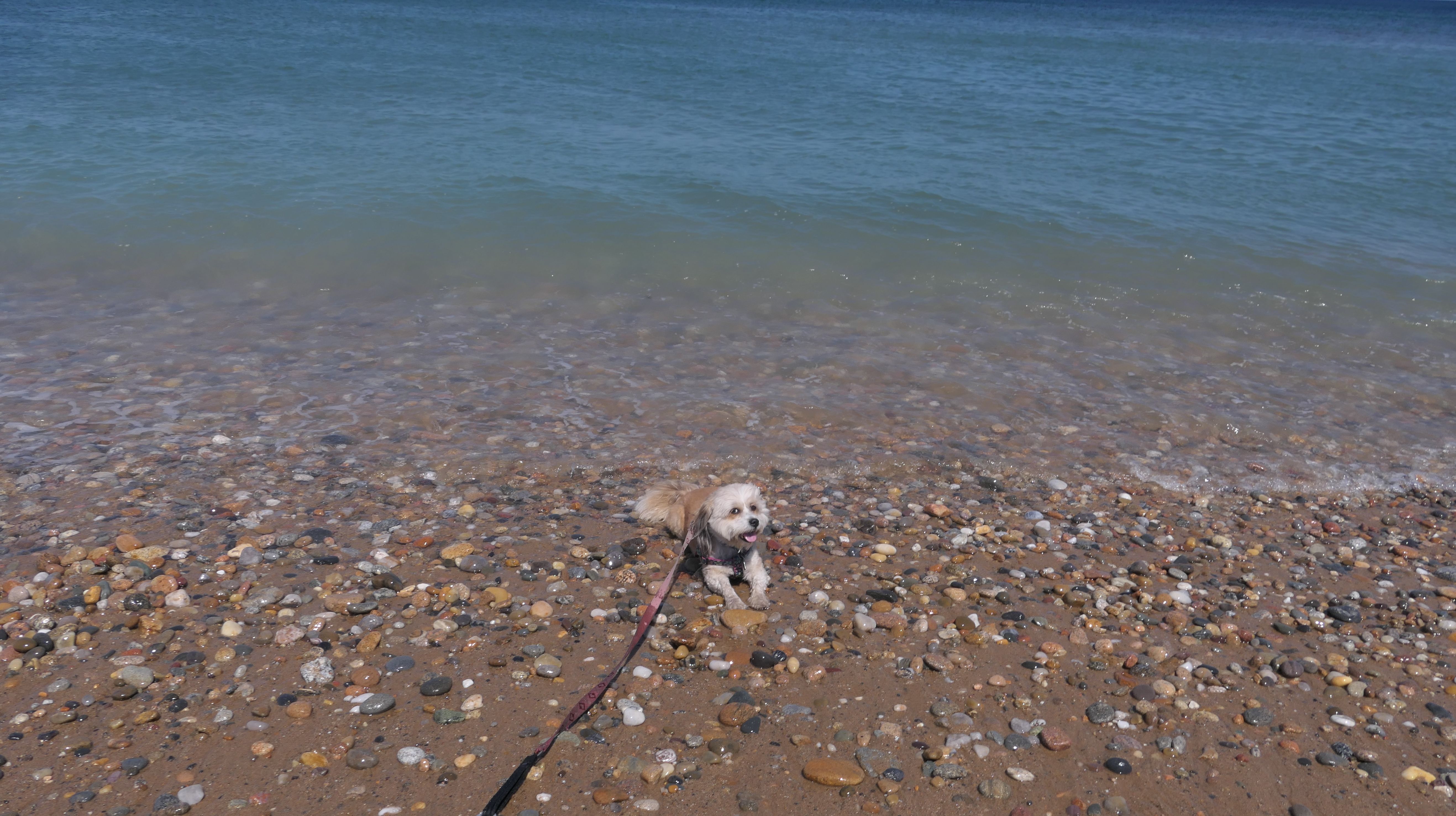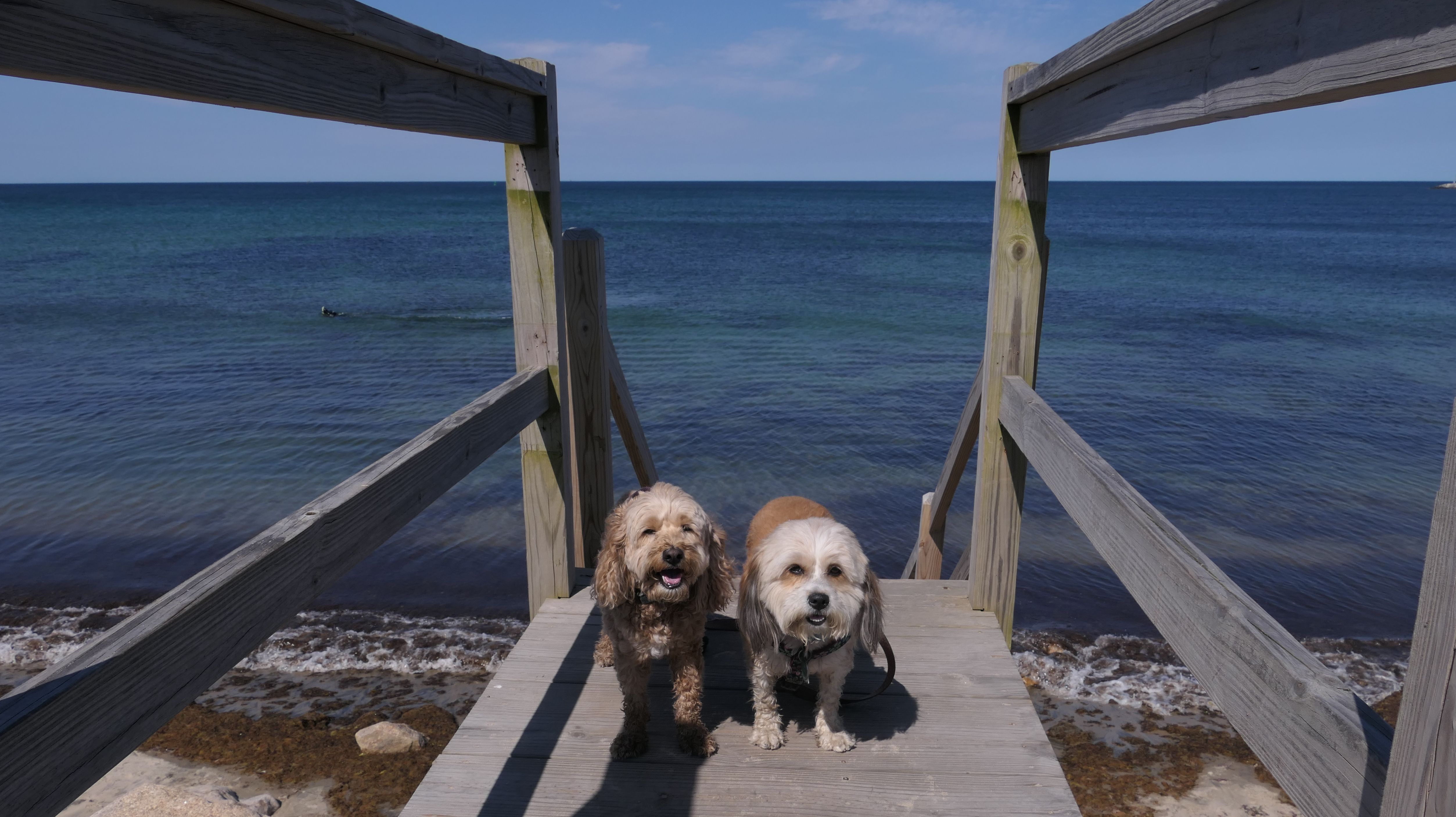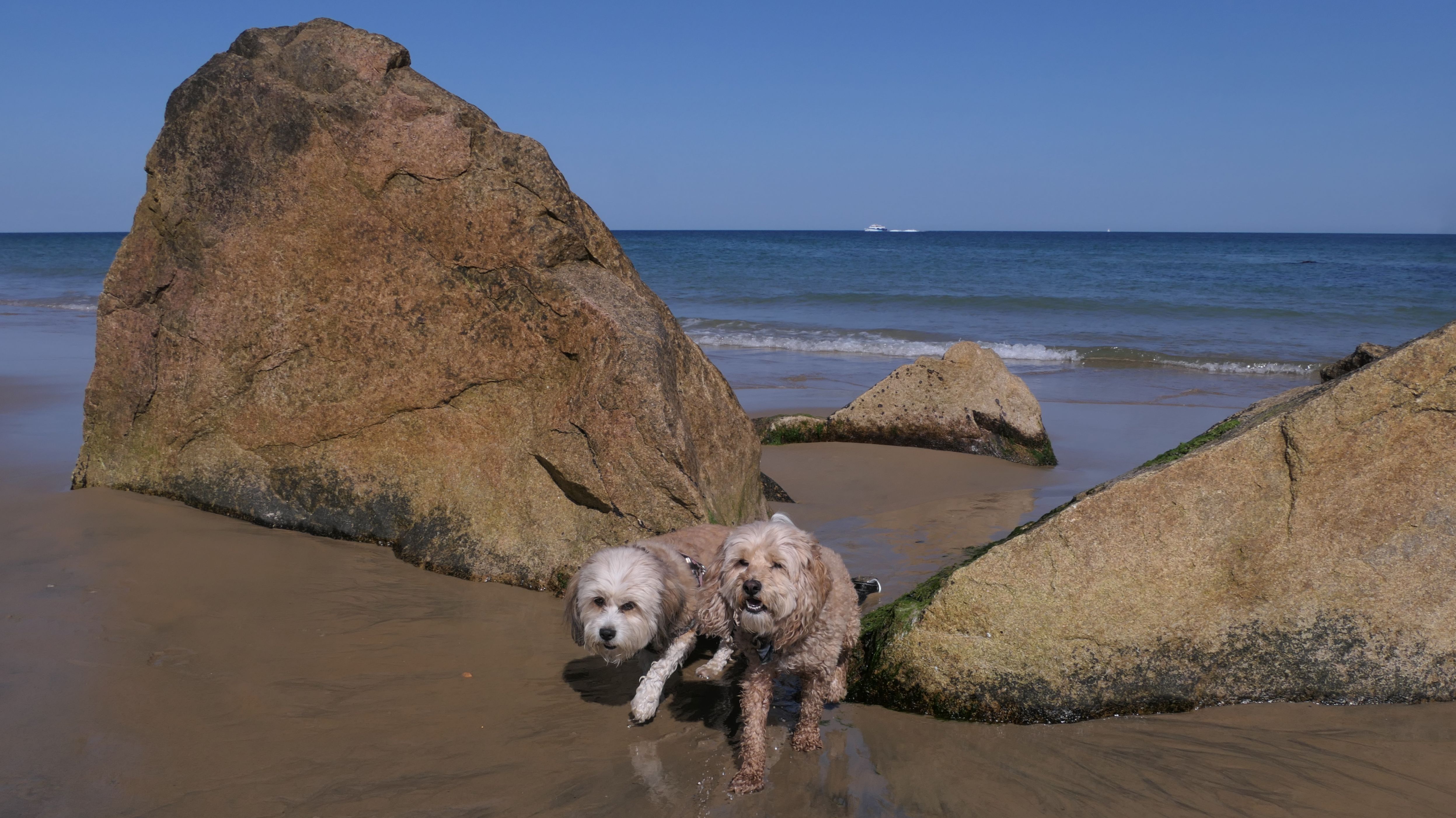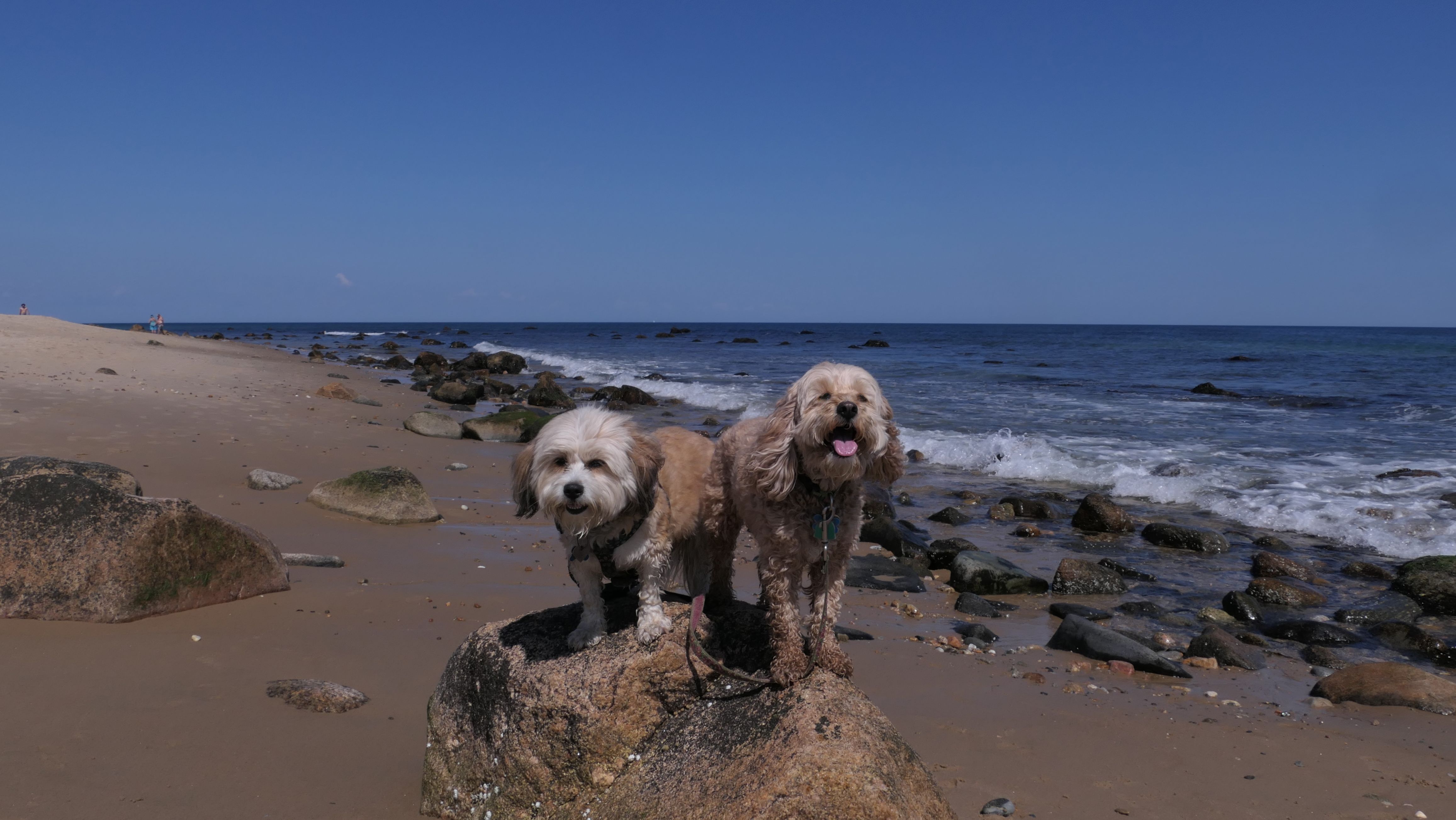 This was the highlight of this trip to Block Island. A couple months earlier we visited the Edward S Payne Overlook, and walked part way down the 141 steps, but did not go all the way down to the beach. This time, we were bound and determined to make it to the beach, so we went all the way down. At the bottom of the stairs is actually a series of rocks that have to be traversed carefully to get to the beach. Once at the bottom, we walked about a mile and a half along the beautiful shore, over to Vaill Beach before turning around and heading back. The views were gorgeous. The beach is a mix of sandy and rocky areas, with plenty of spots for great photos. One thing to be aware of, a section of the beach about a quarter mile from the stairs around the first bend, appears to be unofficially clothing optional. We encountered one nearly naked man sun bathing with his wife (he was wearing only a hat). His wife was wearing a bathing suit. Just something to be aware of. While we were walking back, I let the dogs off-leash to run around a bit. They always enjoy running free on the beach! We made it up the 141 steps on our way back with no issue. The hardest part was climbing over the rocks leading to the staircase. The area had gotten real busy, and there were people just sort of mulling around the rocks, making it difficult to get by. Once we got past that, the walk up wasn't too bad. I'm definitely glad we made it to this beach this time around. It was definitely worth the climb!