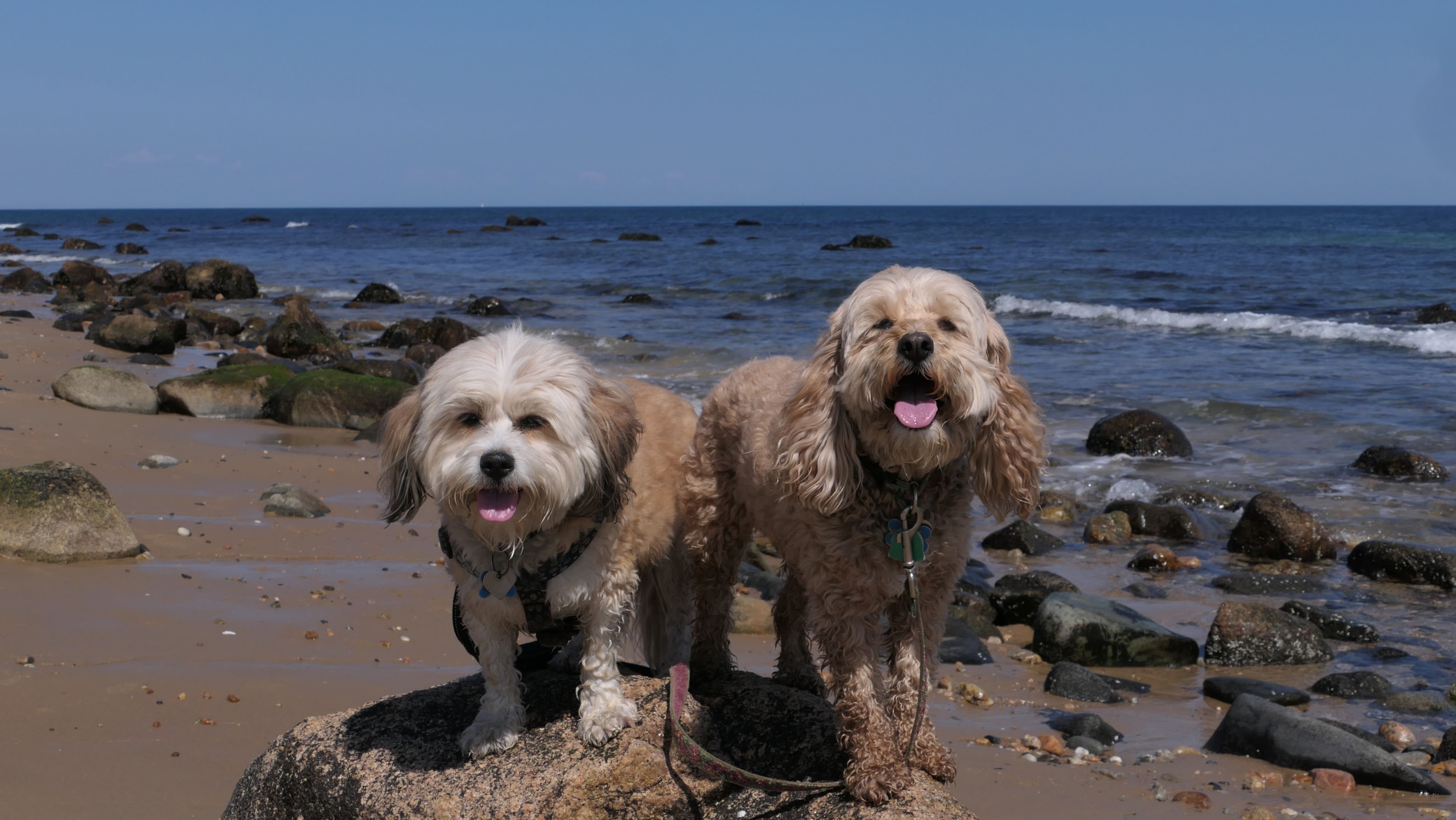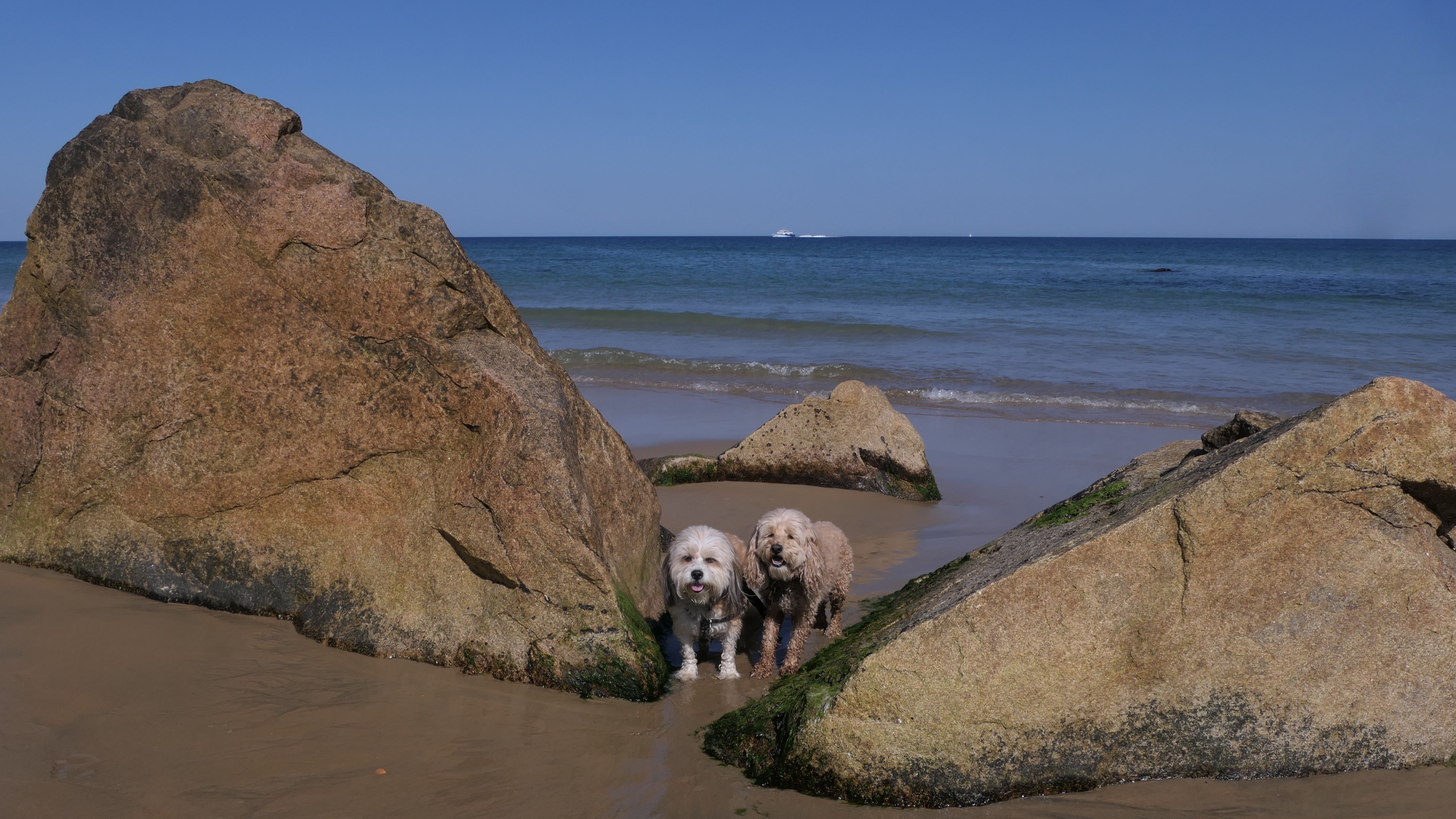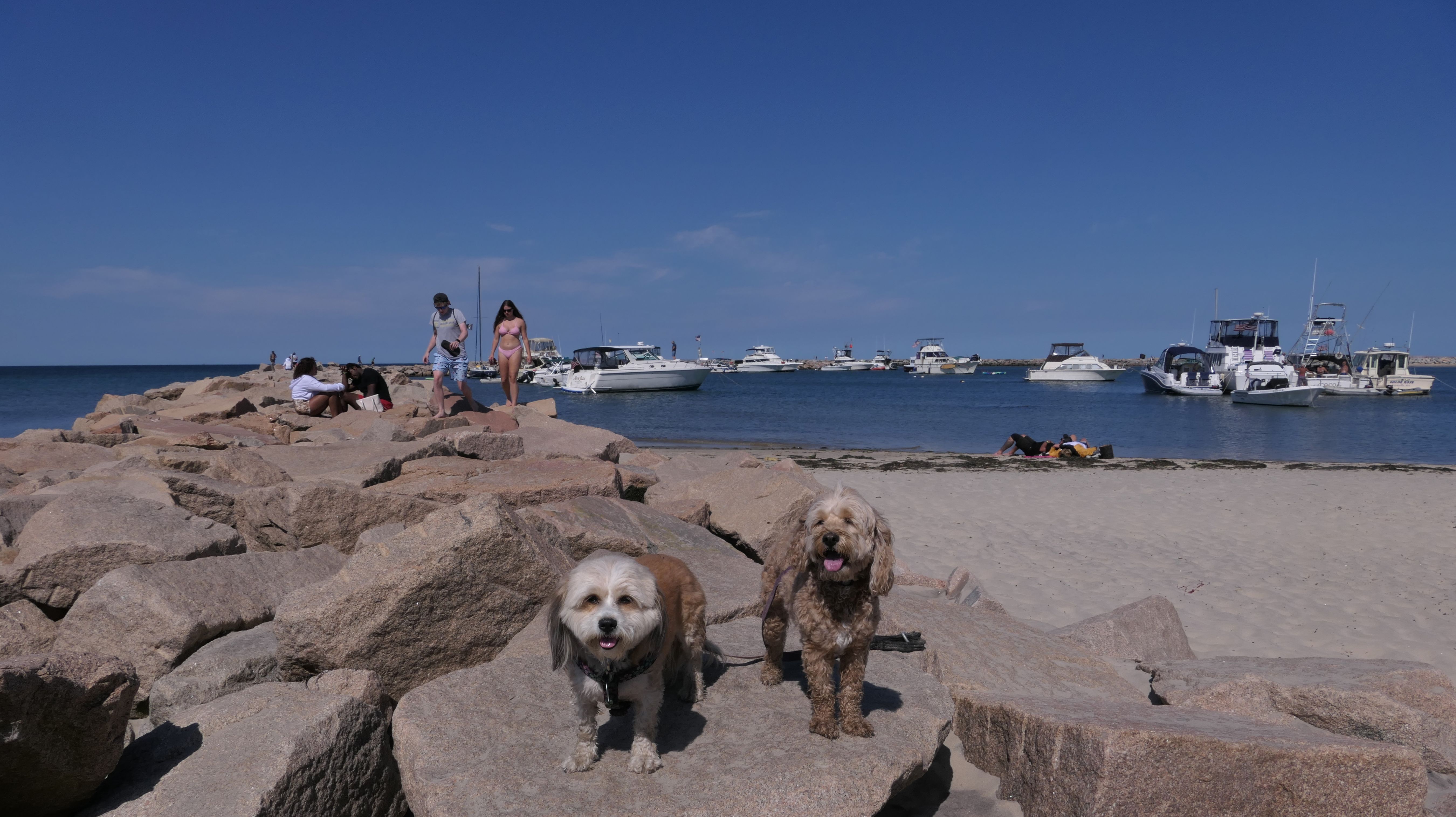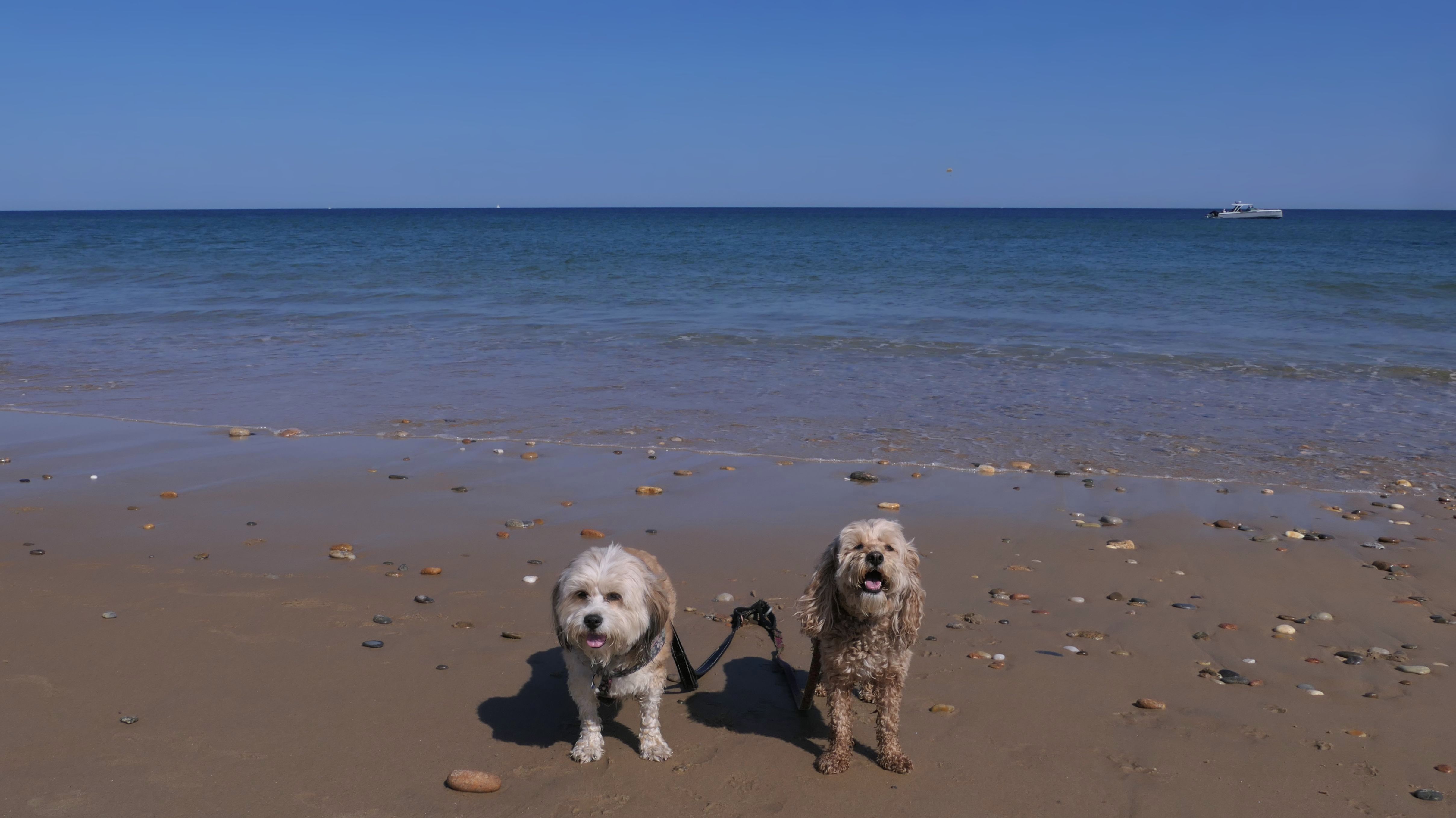 This was the highlight of this trip to Block Island. A couple months earlier we visited the Edward S Payne Overlook, and walked part way down the 141 steps, but did not go all the way down to the beach. This time, we were bound and determined to make it to the beach, so we went all the way down. At the bottom of the stairs is actually a series of rocks that have to be traversed carefully to get to the beach. Once at the bottom, we walked about a mile and a half along the beautiful shore, over to Vaill Beach before turning around and heading back. The views were gorgeous. The beach is a mix of sandy and rocky areas, with plenty of spots for great photos. One thing to be aware of, a section of the beach about a quarter mile from the stairs around the first bend, appears to be unofficially clothing optional. We encountered one nearly naked man sun bathing with his wife (he was wearing only a hat). His wife was wearing a bathing suit. Just something to be aware of. While we were walking back, I let the dogs off-leash to run around a bit. They always enjoy running free on the beach! We made it up the 141 steps on our way back with no issue. The hardest part was climbing over the rocks leading to the staircase. The area had gotten real busy, and there were people just sort of mulling around the rocks, making it difficult to get by. Once we got past that, the walk up wasn't too bad. I'm definitely glad we made it to this beach this time around. It was definitely worth the climb!