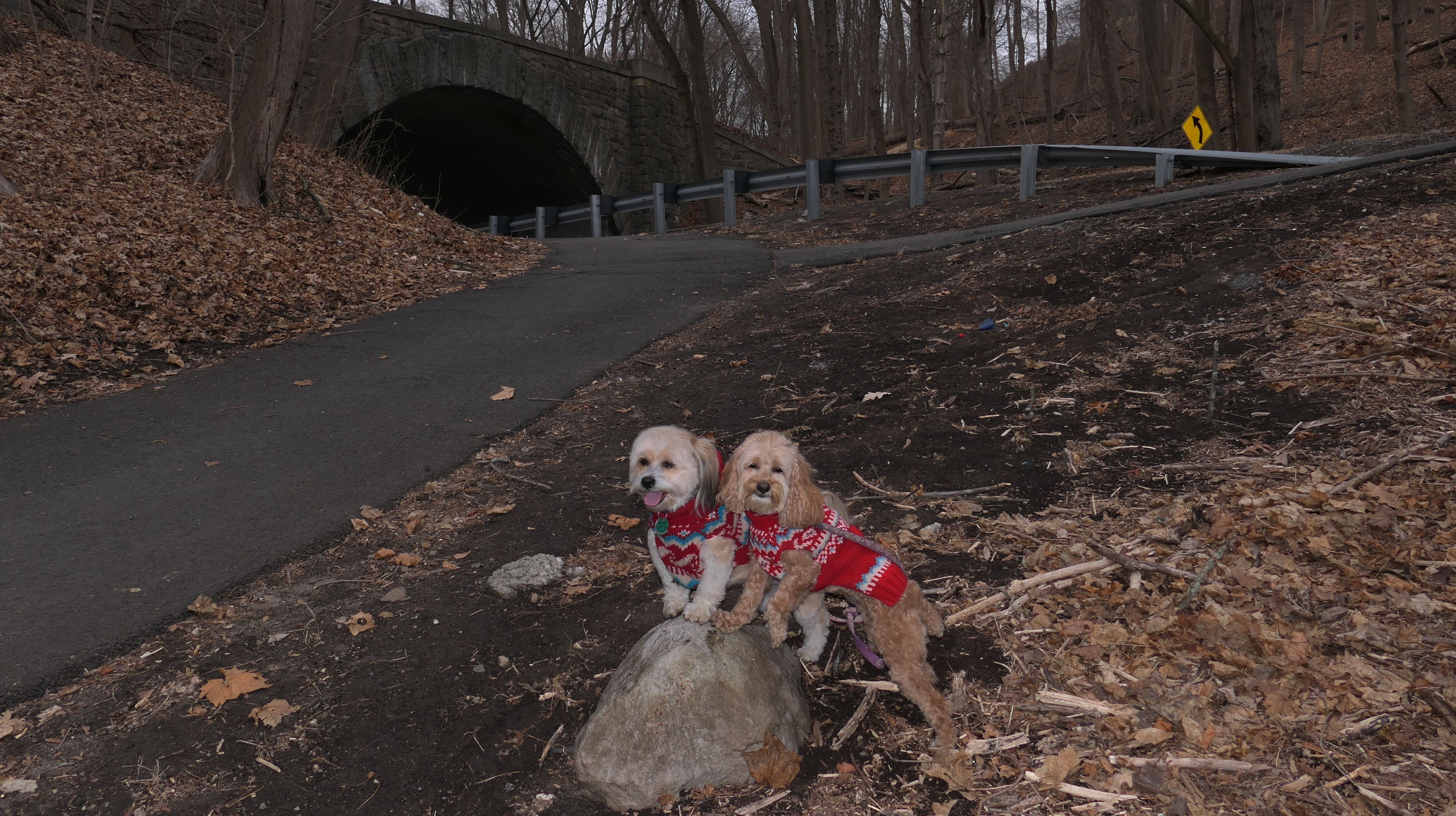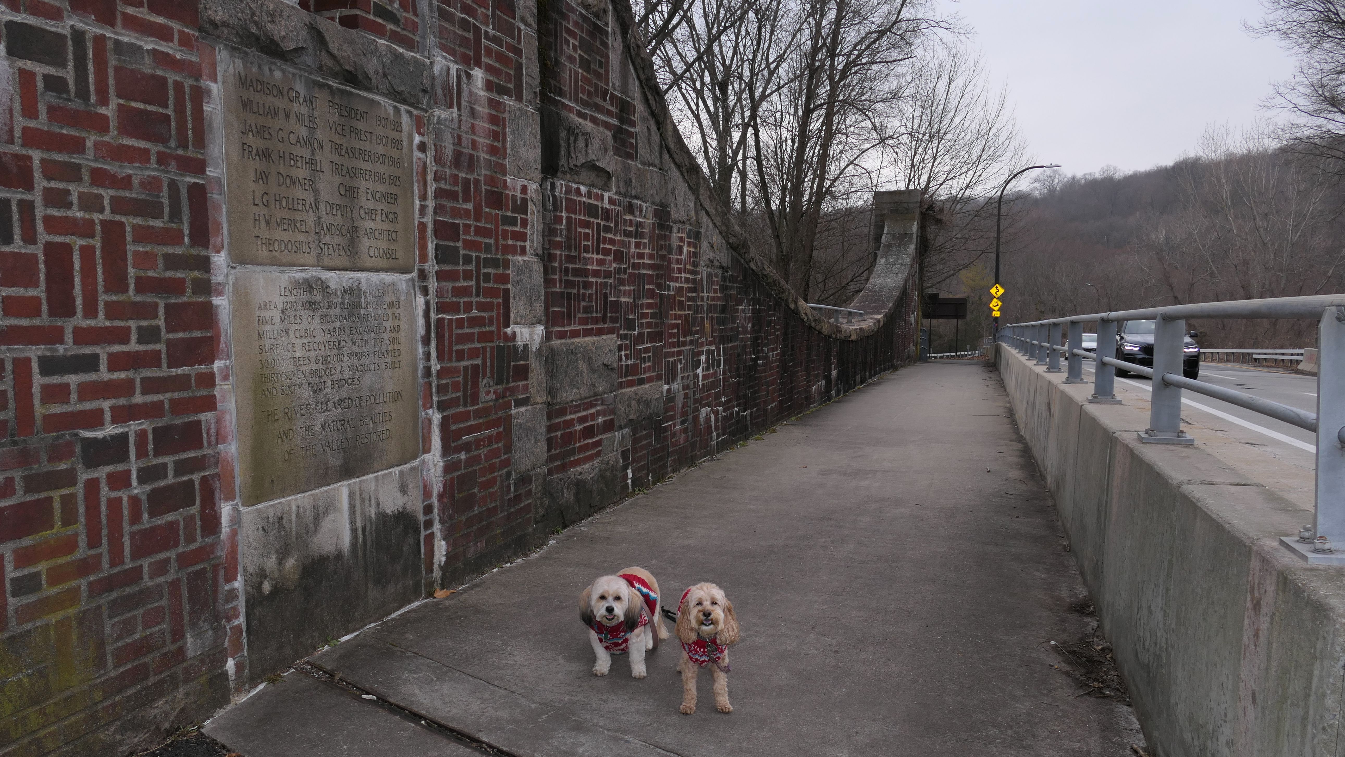 We hadn't been on an adventure in six days. Our wonderful February weather this year finally took a turn of the worse, and it was rainy and cold all week. It was warmer and sunnier in Westchester County New York, so we headed to this place. This is a really neat park that straddles the town line between the Valhalla section of Mount Pleasant and North Castle. There is an open grass area, and a promenade of sorts, in front of the very large dam. The west side of the park features a playground, while the east side of the park includes "The Rising", a 9/11 monument that honors the victims from Westchester County. Obviously, the main feature of the park is the dam. There are stairways on both sides of the dam, so we climbed to the top. There is an old road that runs right across the top of the dam that is closed to vehicular traffic. It is now just a pedestrian walk way. There are nice views from the top of the dam. I have to admit, climbing the stairs was a good workout. The climb is over 20 flights of the stairs. The dogs didn't really seem to have much issue with the climb. We did this after walking four miles on the Bronx River Pathway, that starts at this park. Needless to say, we made up for not being able to get out of the house in six days. Below are the pictures from the North Castle section of the park. Visit the Mount Pleasant page for pictures from that section.