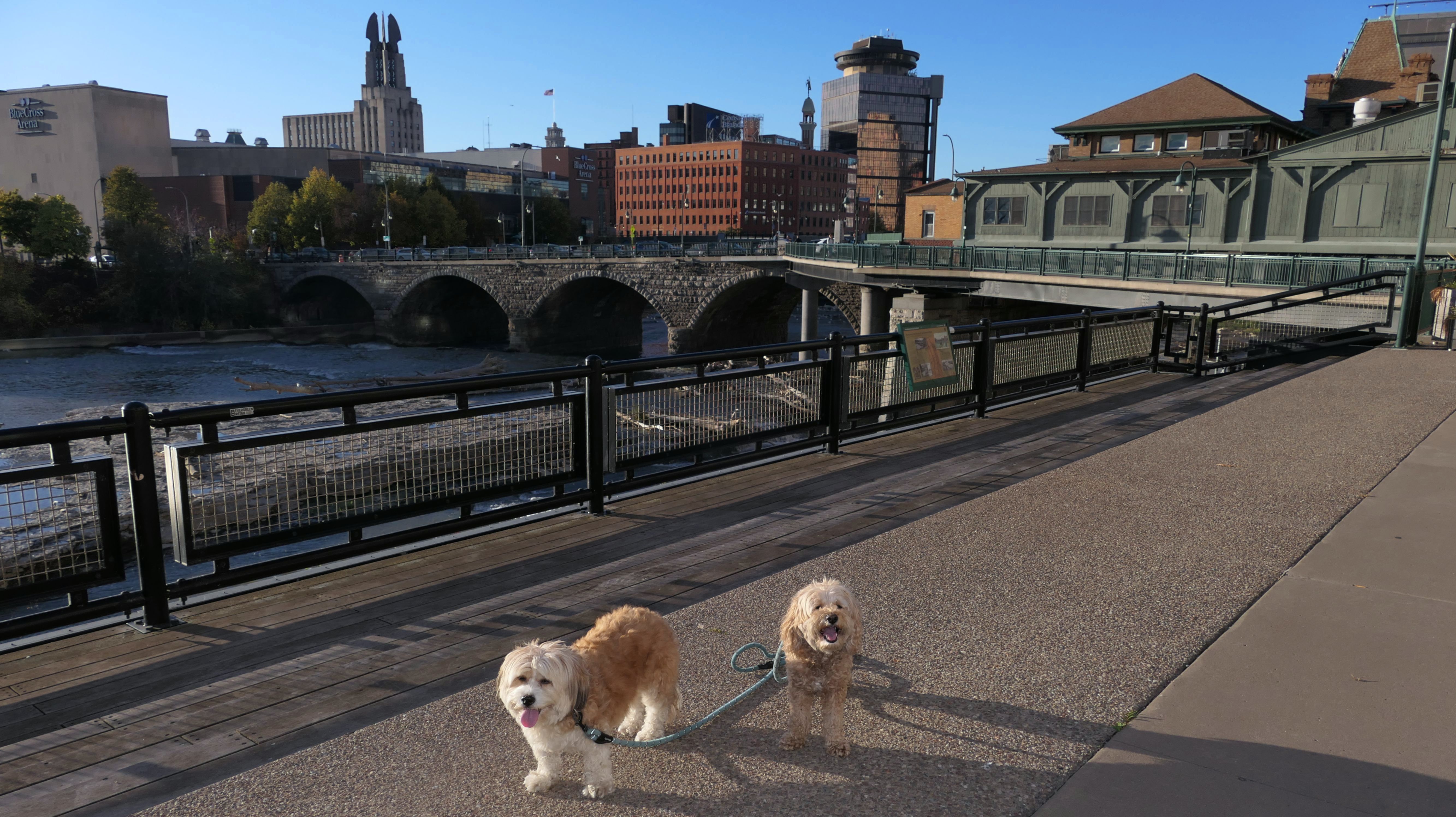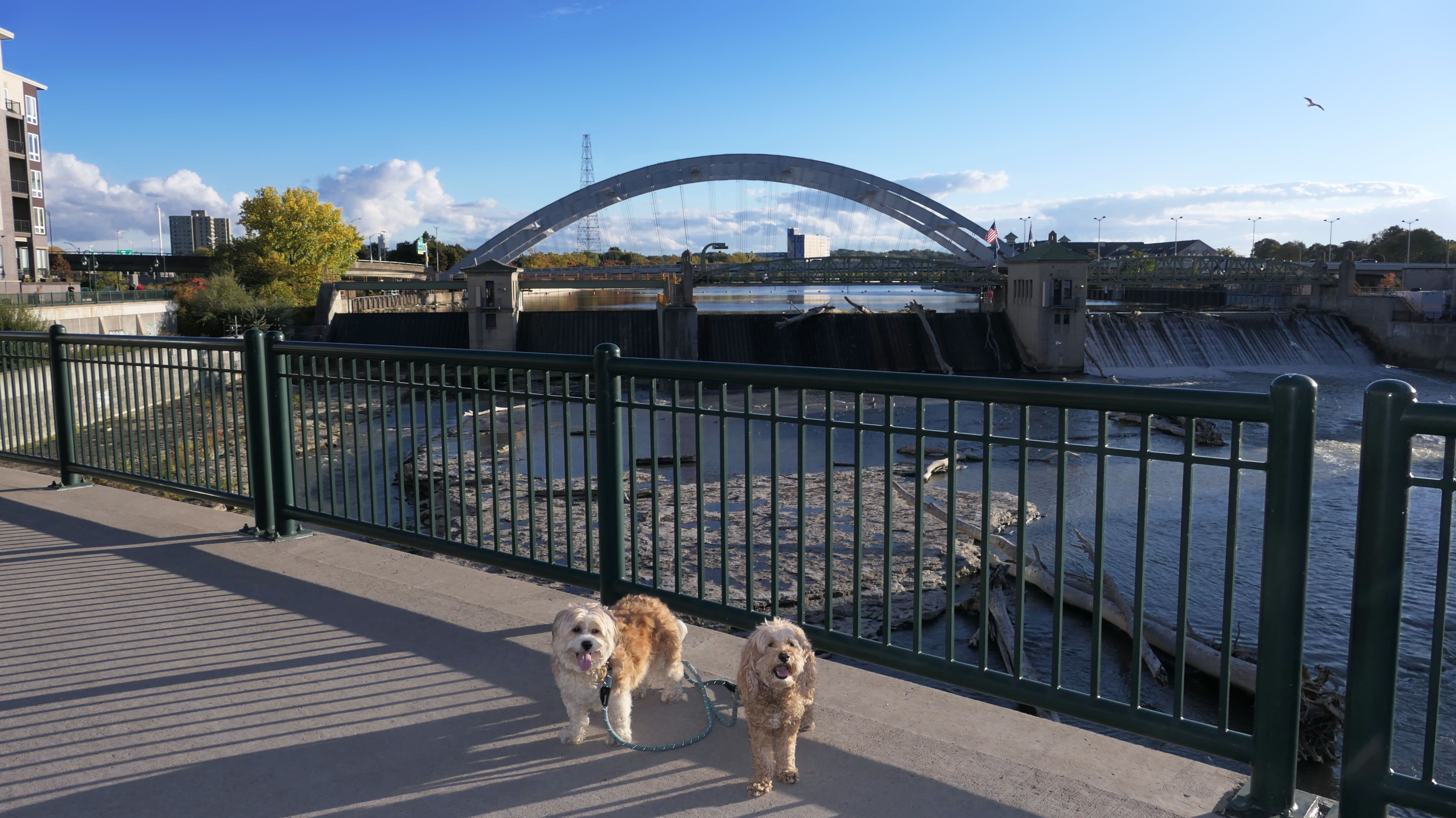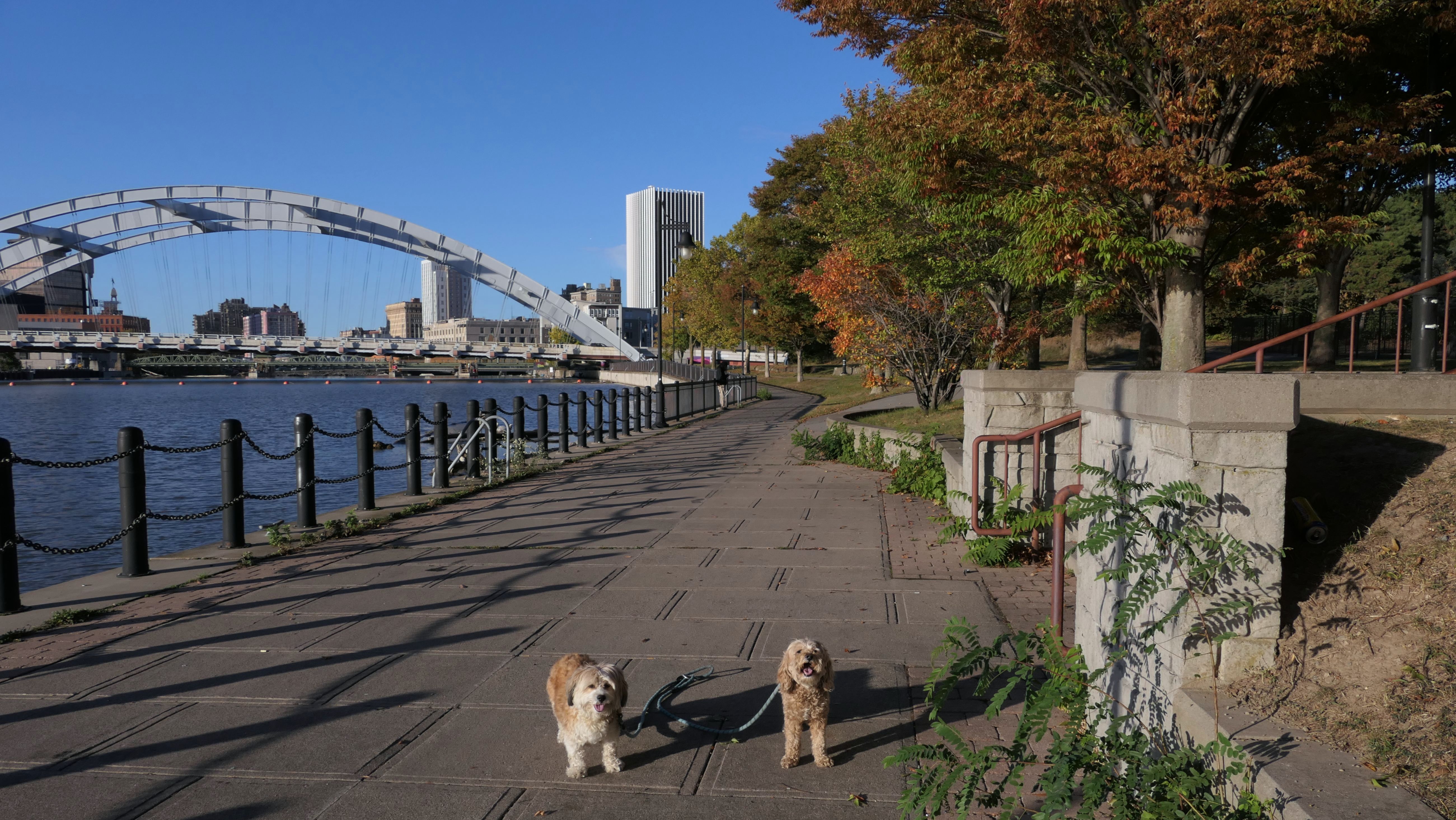 We actually adopted Mandy in Rochester, 10 years and 18 days prior to this visit! This was a homecoming for her, but I'm sure she doesn't remember any of it, as she was pretty much kept in a crate outside before we rescued her. At any rate, we were out near Syracuse in a town named Geddes, and decided to drive an hour east for the sunny skies in Rochester! This park features paved walking paths along the river, with great views of the city. The park was clean and looked well maintained. We didn't arrive until about 5:15PM, so we didn't have a lot of daylight left. The path led us to the downtown area, where we explored what we could, before heading back to the park. We walked a little over two and half miles total on a beautiful autumn evening.