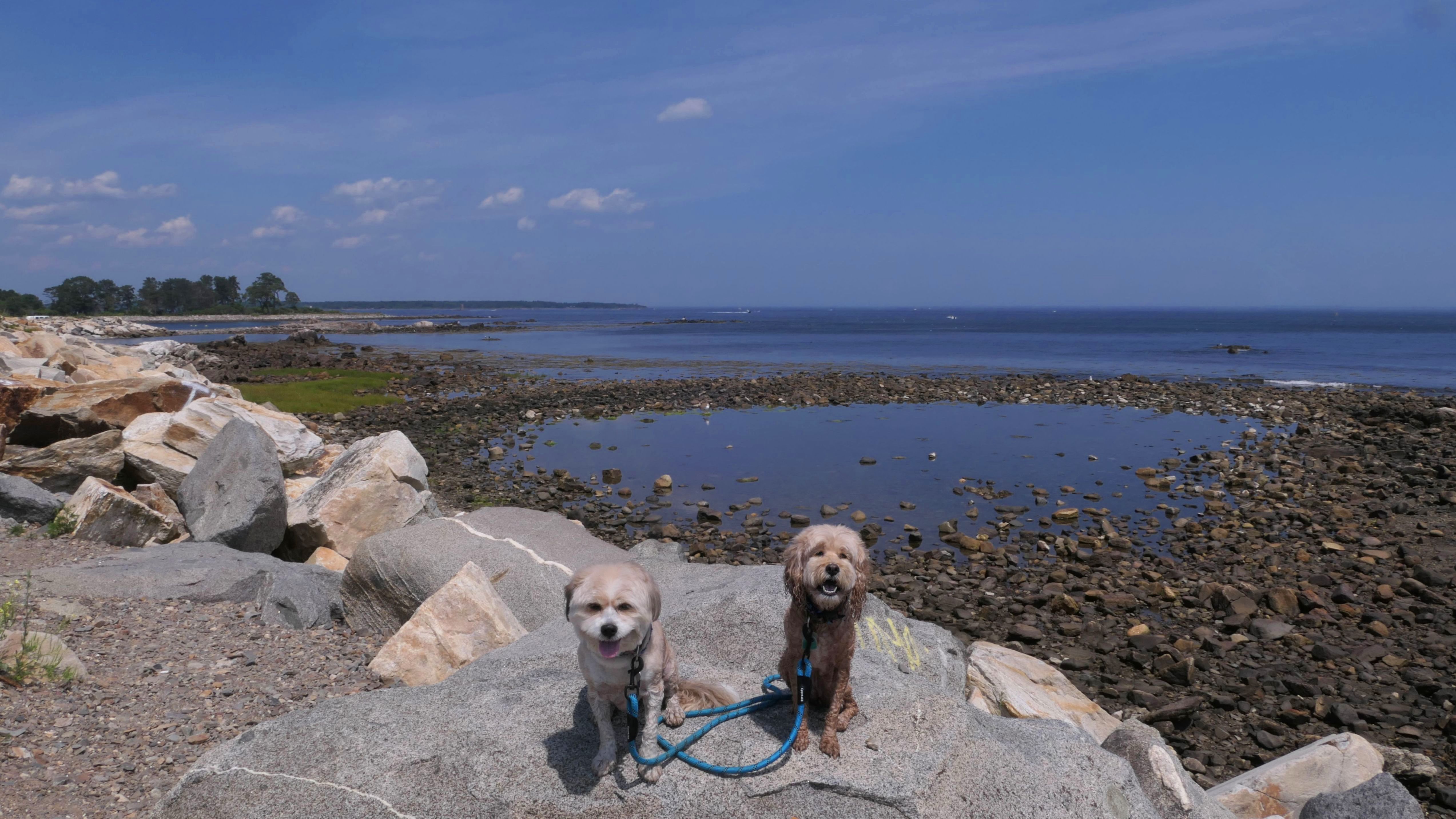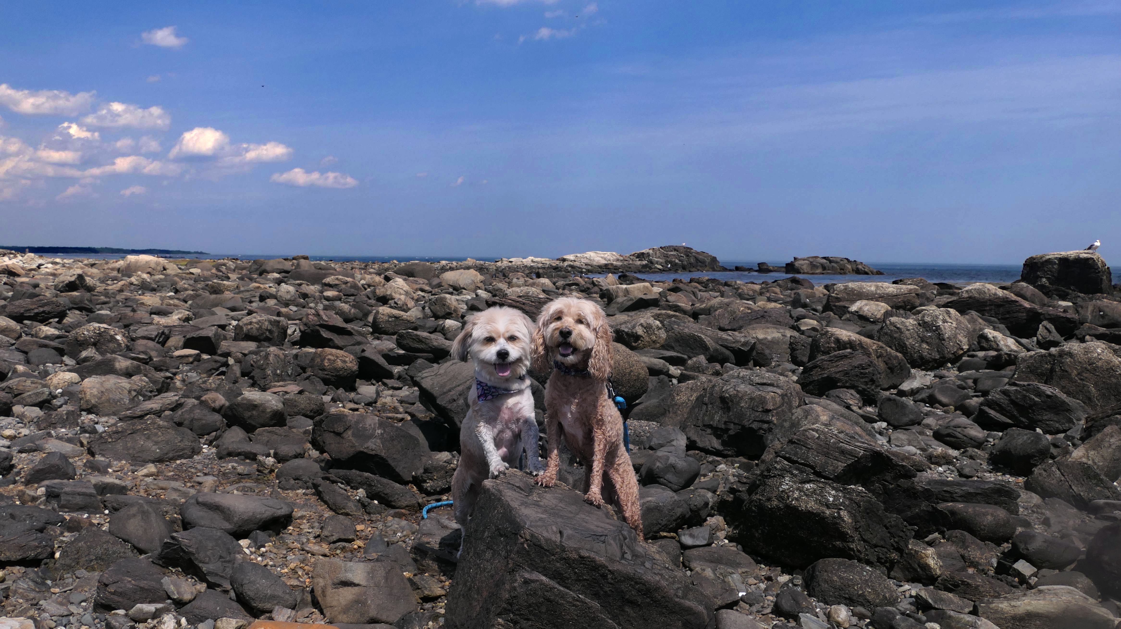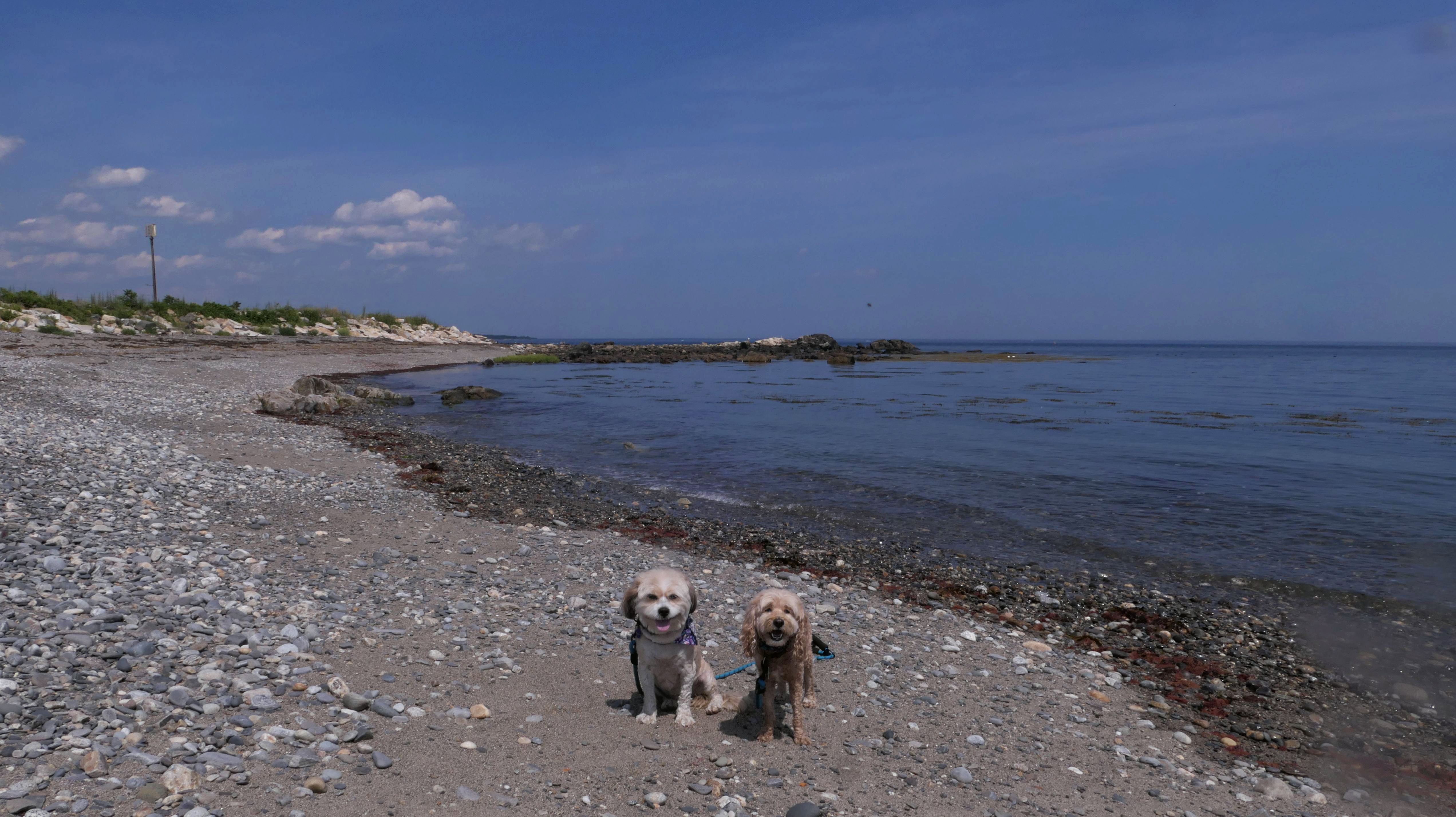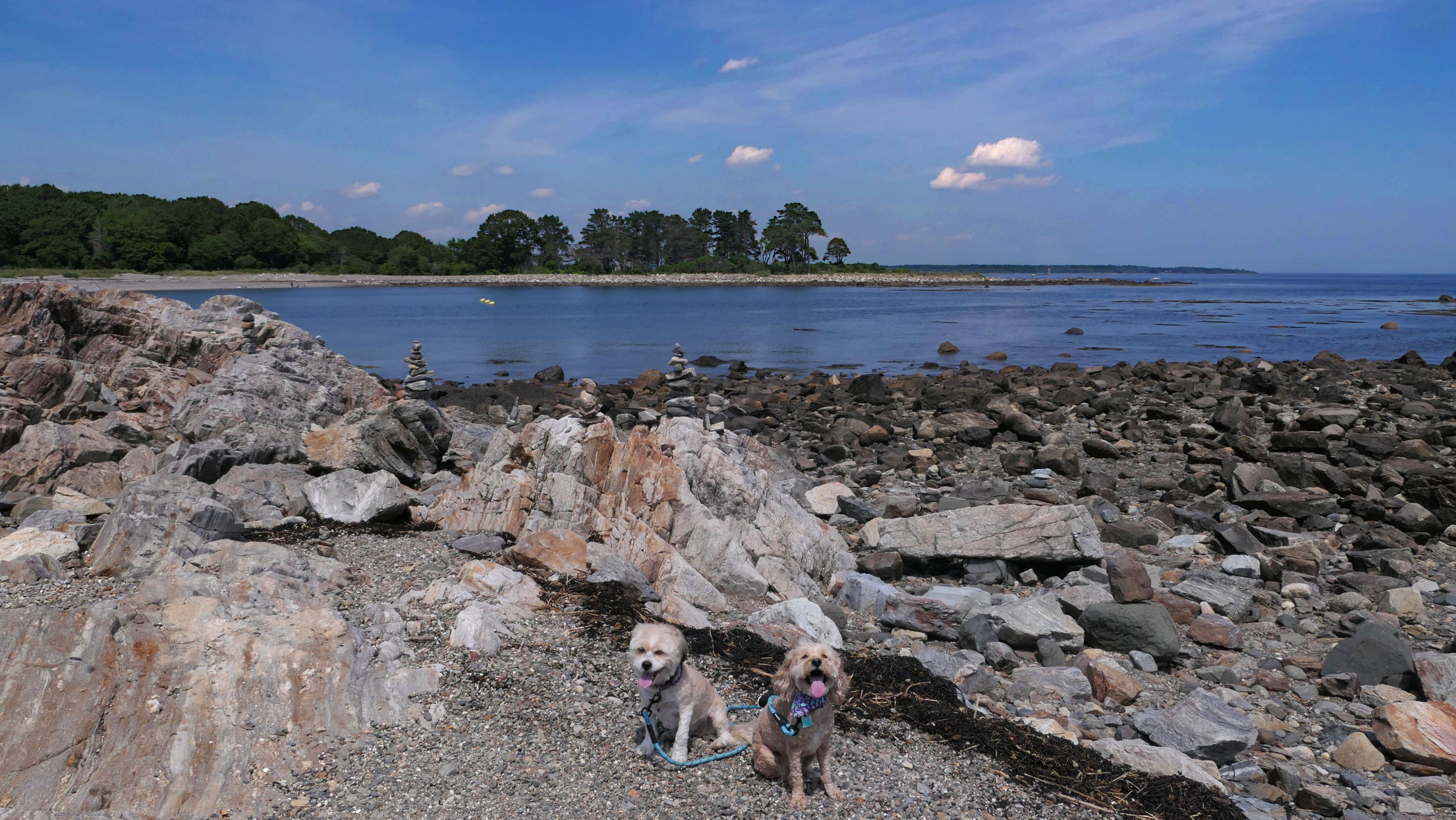 This was the first stop of three on our New Hampshire shore adventure. There are a number of small parking areas with free one hour parking along Ocean Boulevard, just south of Odiorne Point State Park. Be careful to stay south of park, because dogs are never allowed at the state park, but are allowed on this part of the shoreline. The area is rocky, but there are two cobble beaches here as well. Reviews online indicated that there were elaborate rock stacks, but we only saw a few, and they weren't very impressive. It was a super hot day, but I swear the temperature dropped 10 degrees as we got closer to the shore. It's a good spot for the dogs to get into the water on a hot day, especially since they aren't allowed at the nearby state park.