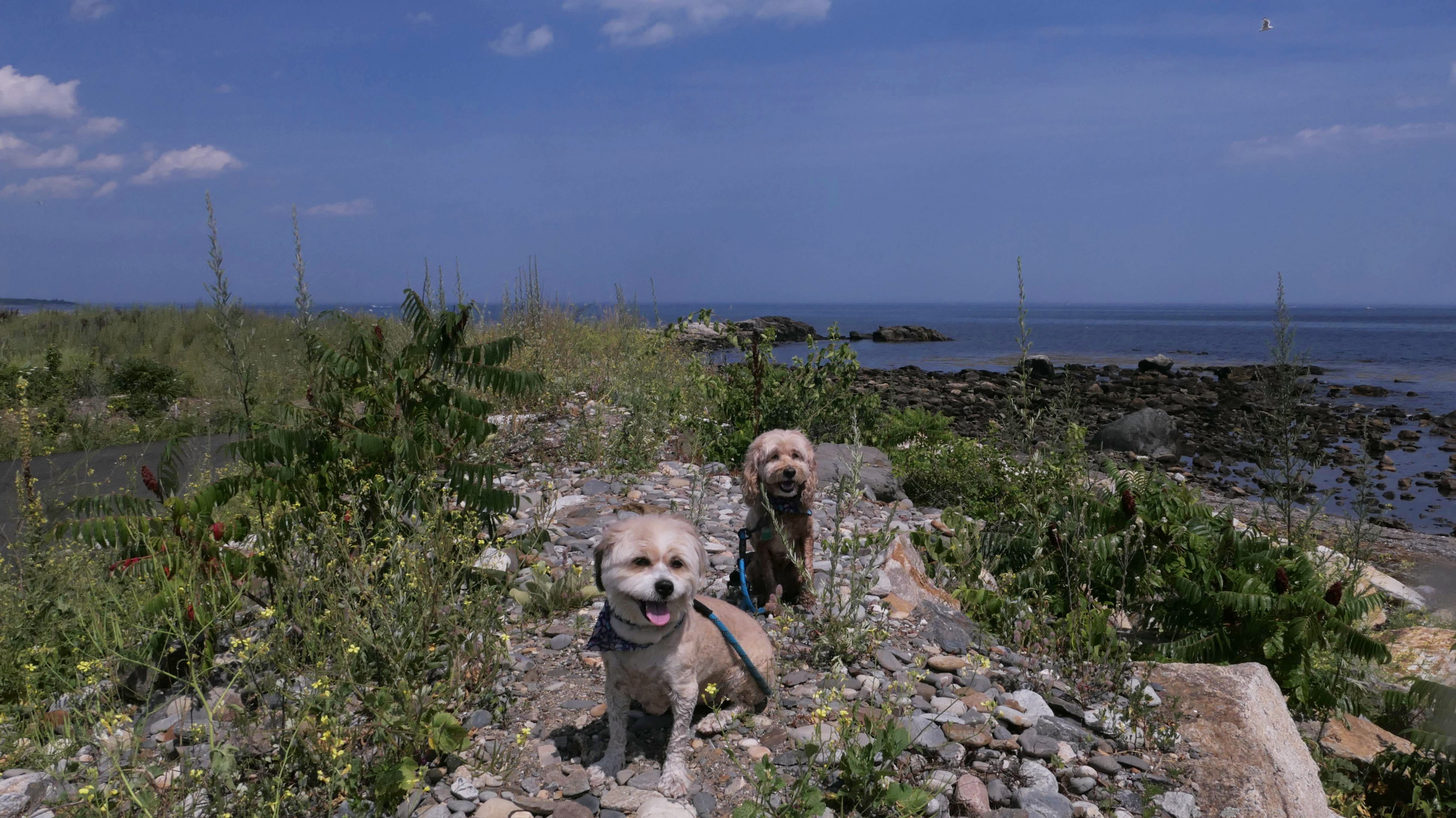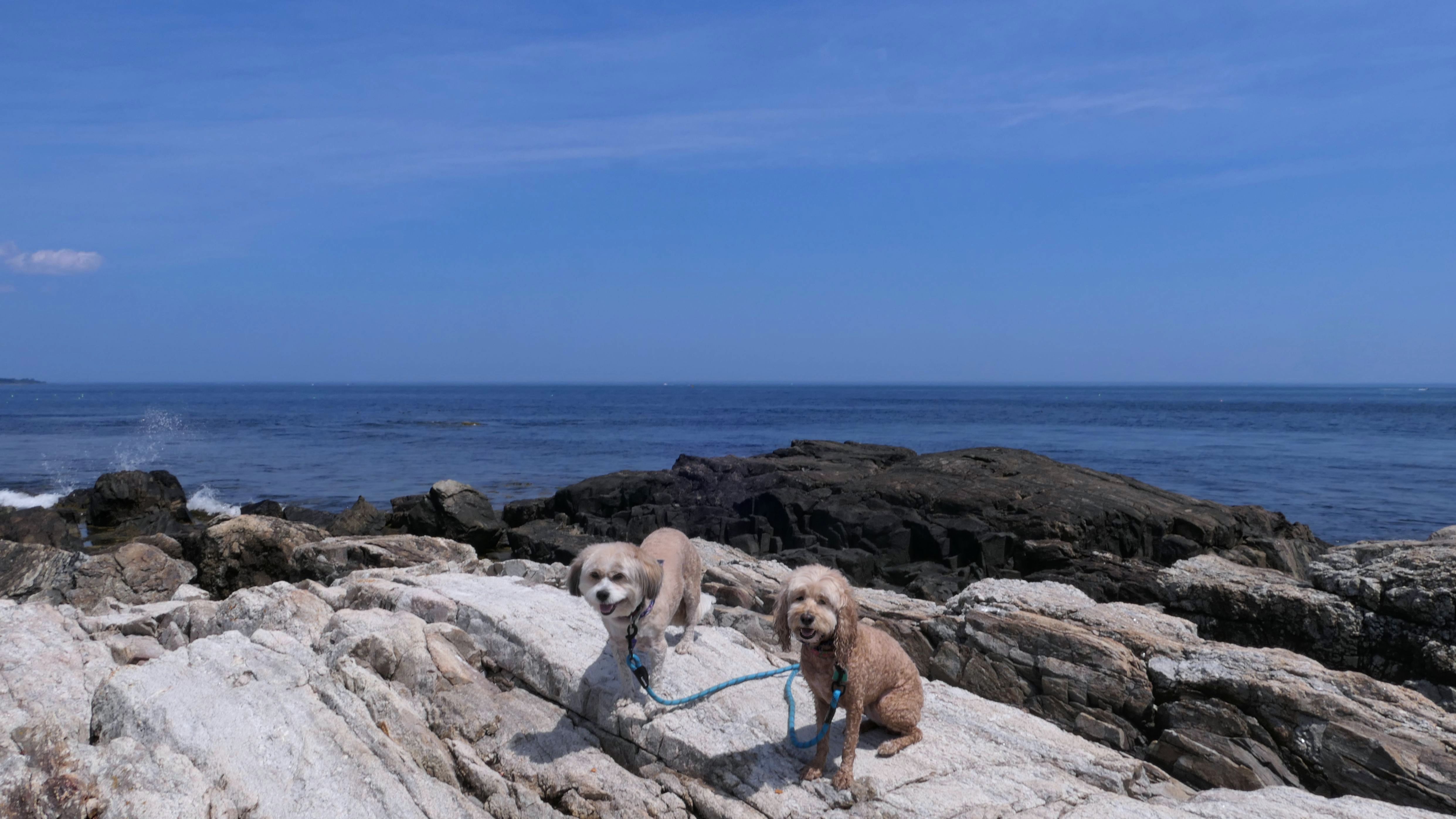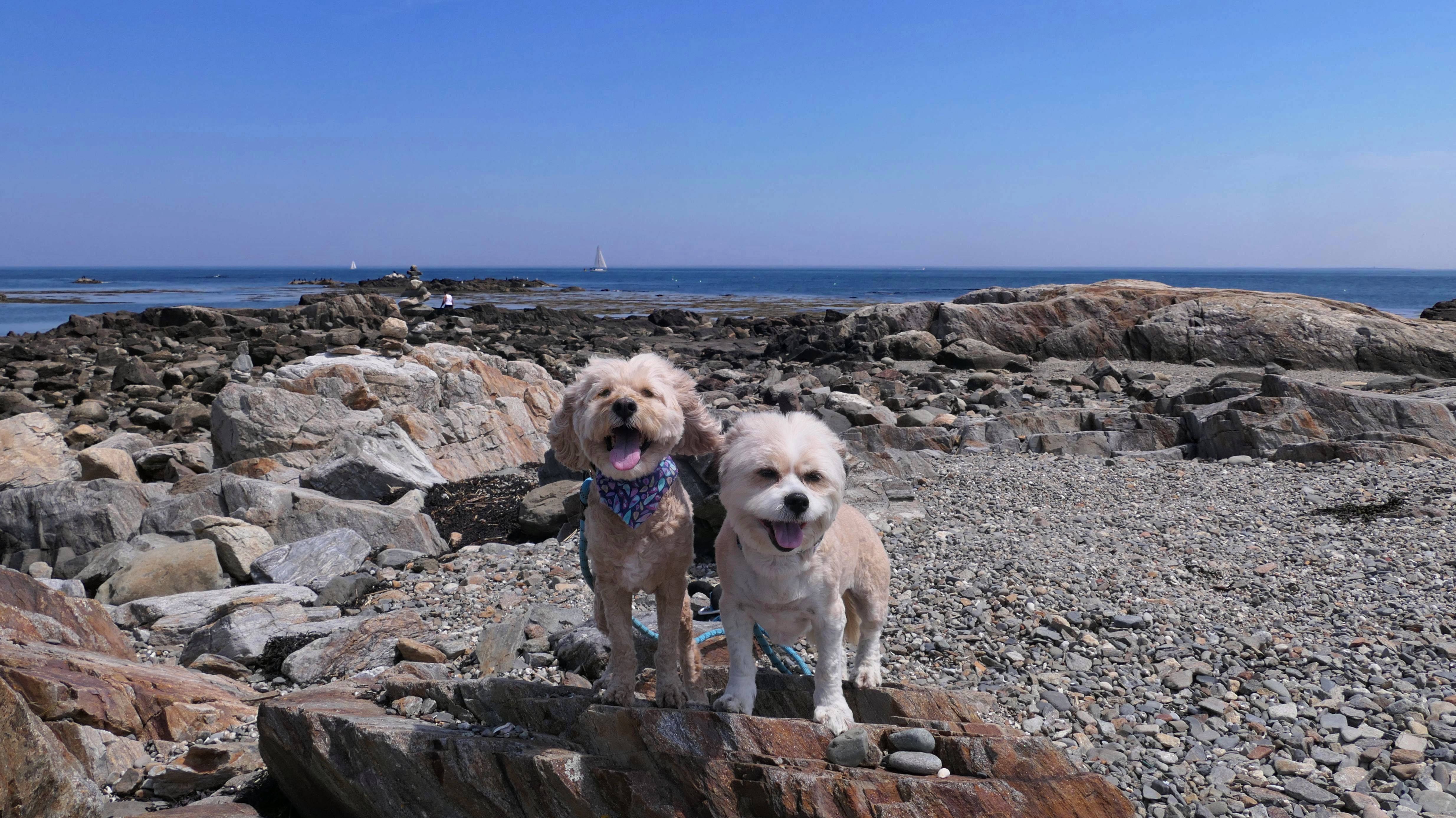 This was the first stop of three on our New Hampshire shore adventure. There are a number of small parking areas with free one hour parking along Ocean Boulevard, just south of Odiorne Point State Park. Be careful to stay south of park, because dogs are never allowed at the state park, but are allowed on this part of the shoreline. The area is rocky, but there are two cobble beaches here as well. Reviews online indicated that there were elaborate rock stacks, but we only saw a few, and they weren't very impressive. It was a super hot day, but I swear the temperature dropped 10 degrees as we got closer to the shore. It's a good spot for the dogs to get into the water on a hot day, especially since they aren't allowed at the nearby state park.