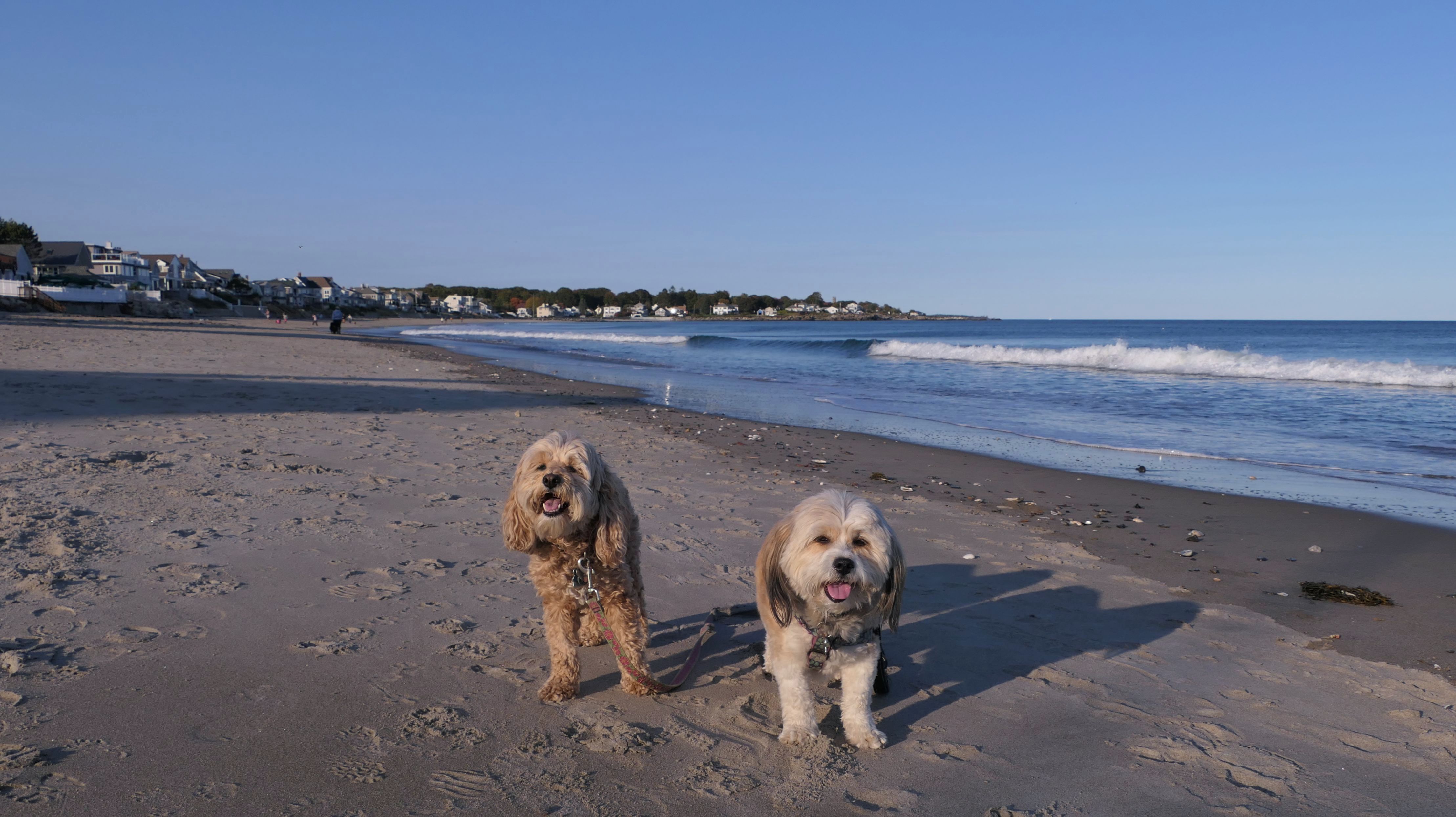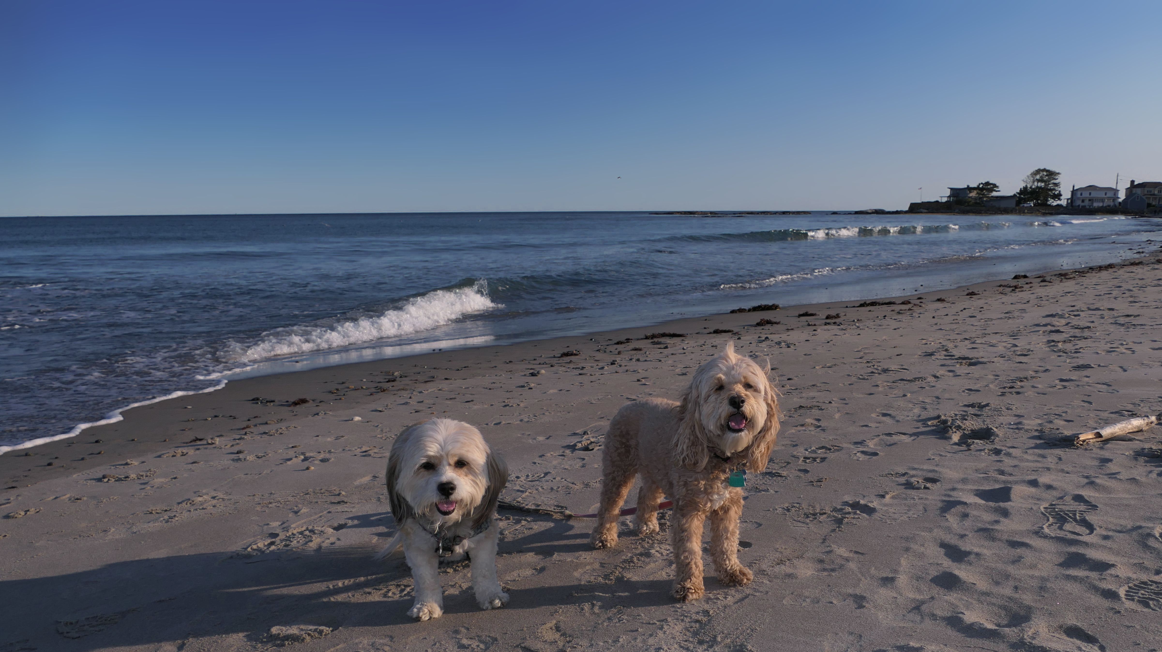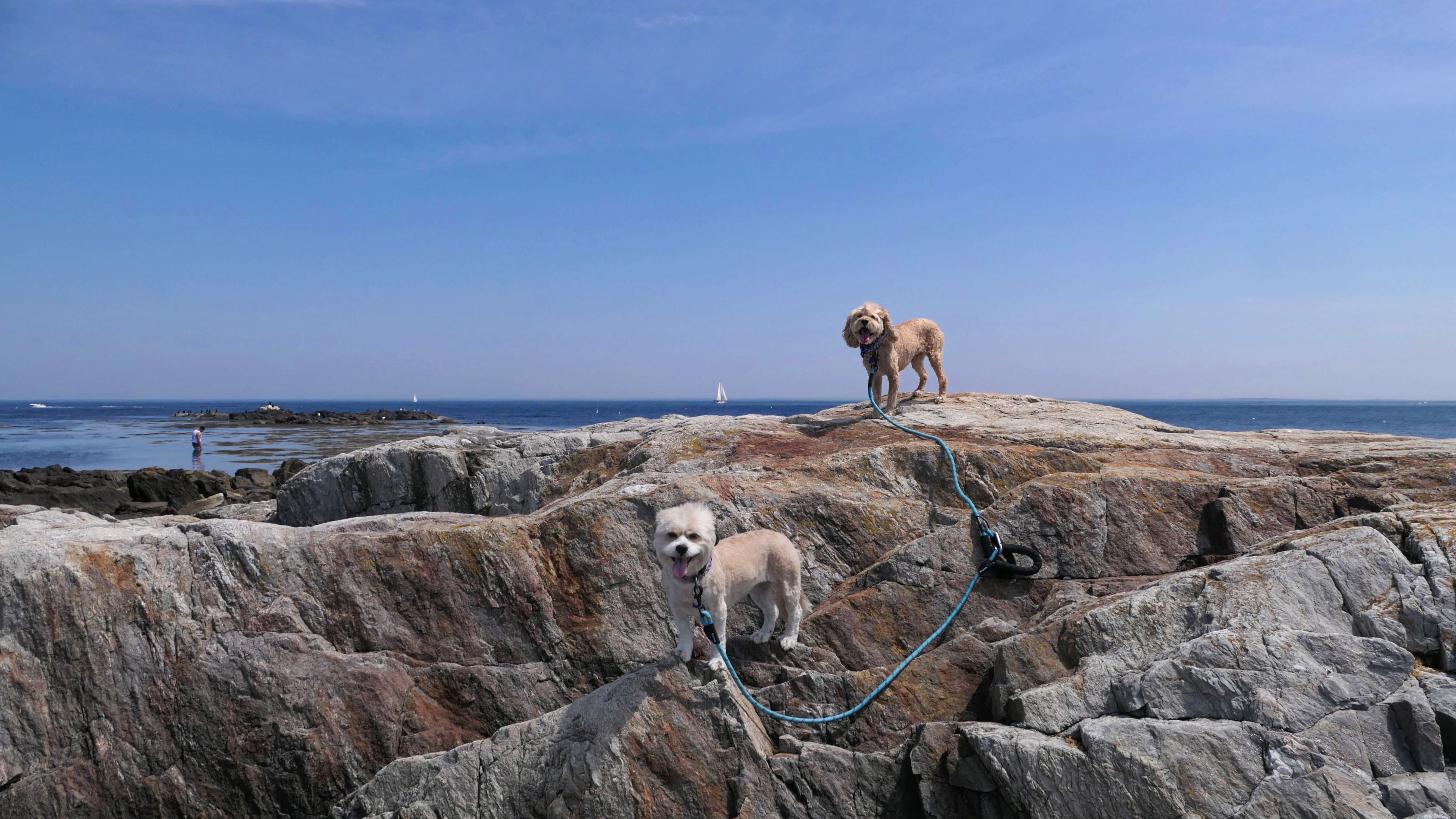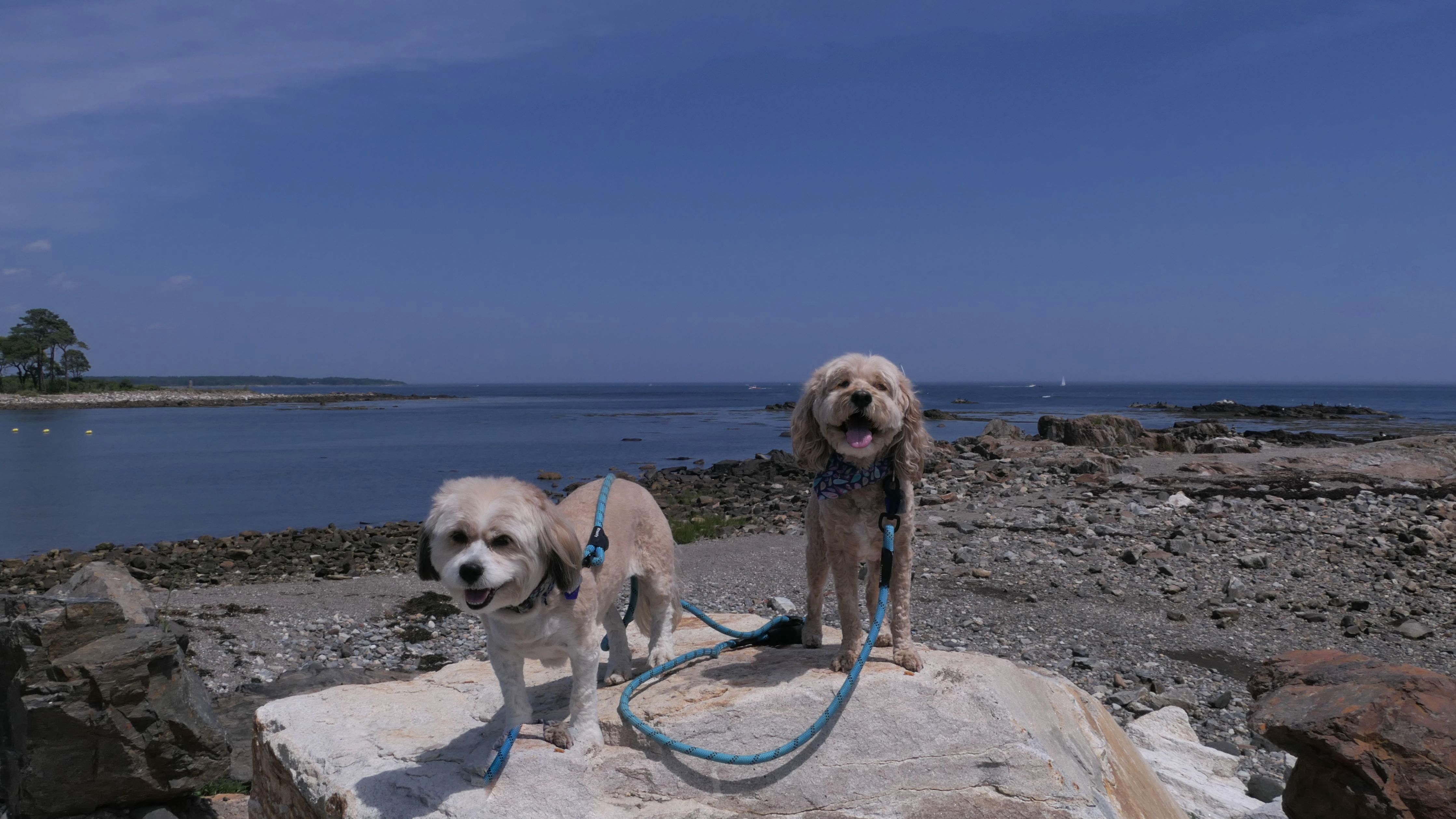 This was the first stop of three on our New Hampshire shore adventure. There are a number of small parking areas with free one hour parking along Ocean Boulevard, just south of Odiorne Point State Park. Be careful to stay south of park, because dogs are never allowed at the state park, but are allowed on this part of the shoreline. The area is rocky, but there are two cobble beaches here as well. Reviews online indicated that there were elaborate rock stacks, but we only saw a few, and they weren't very impressive. It was a super hot day, but I swear the temperature dropped 10 degrees as we got closer to the shore. It's a good spot for the dogs to get into the water on a hot day, especially since they aren't allowed at the nearby state park.