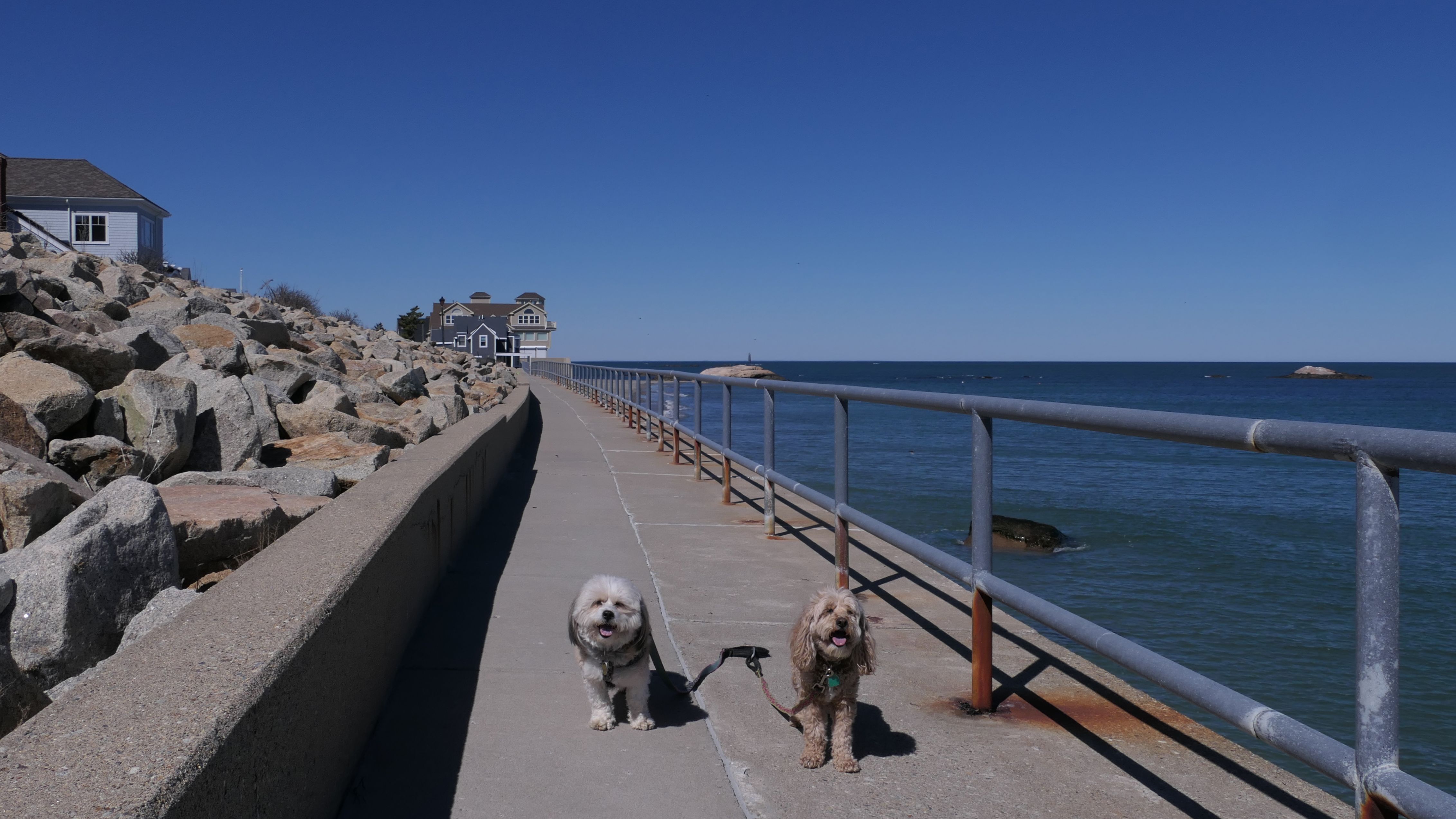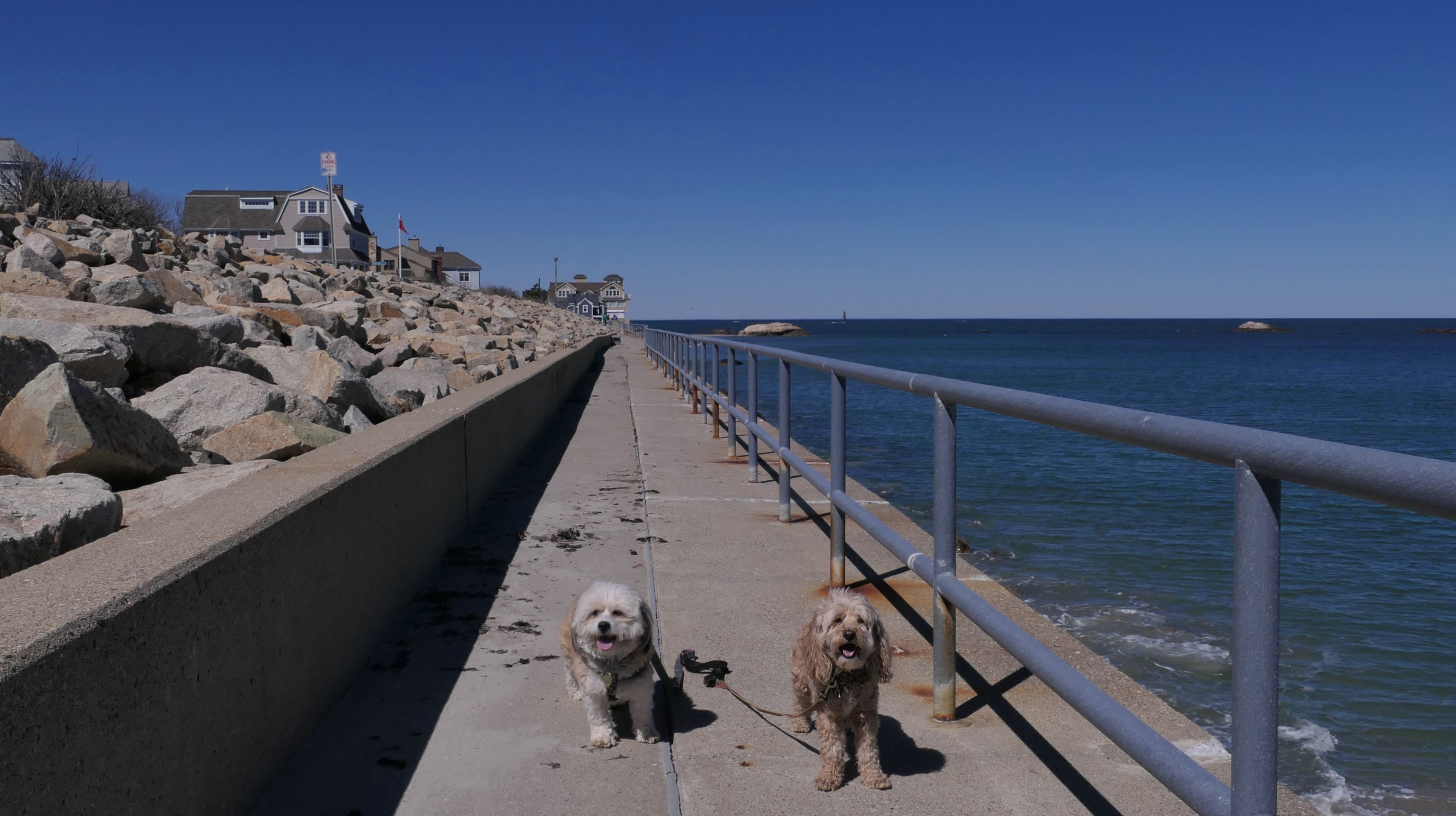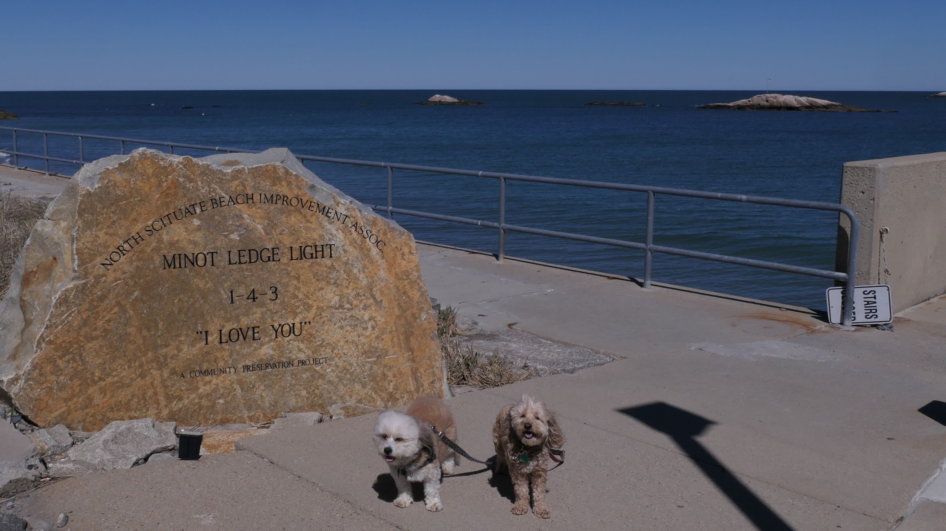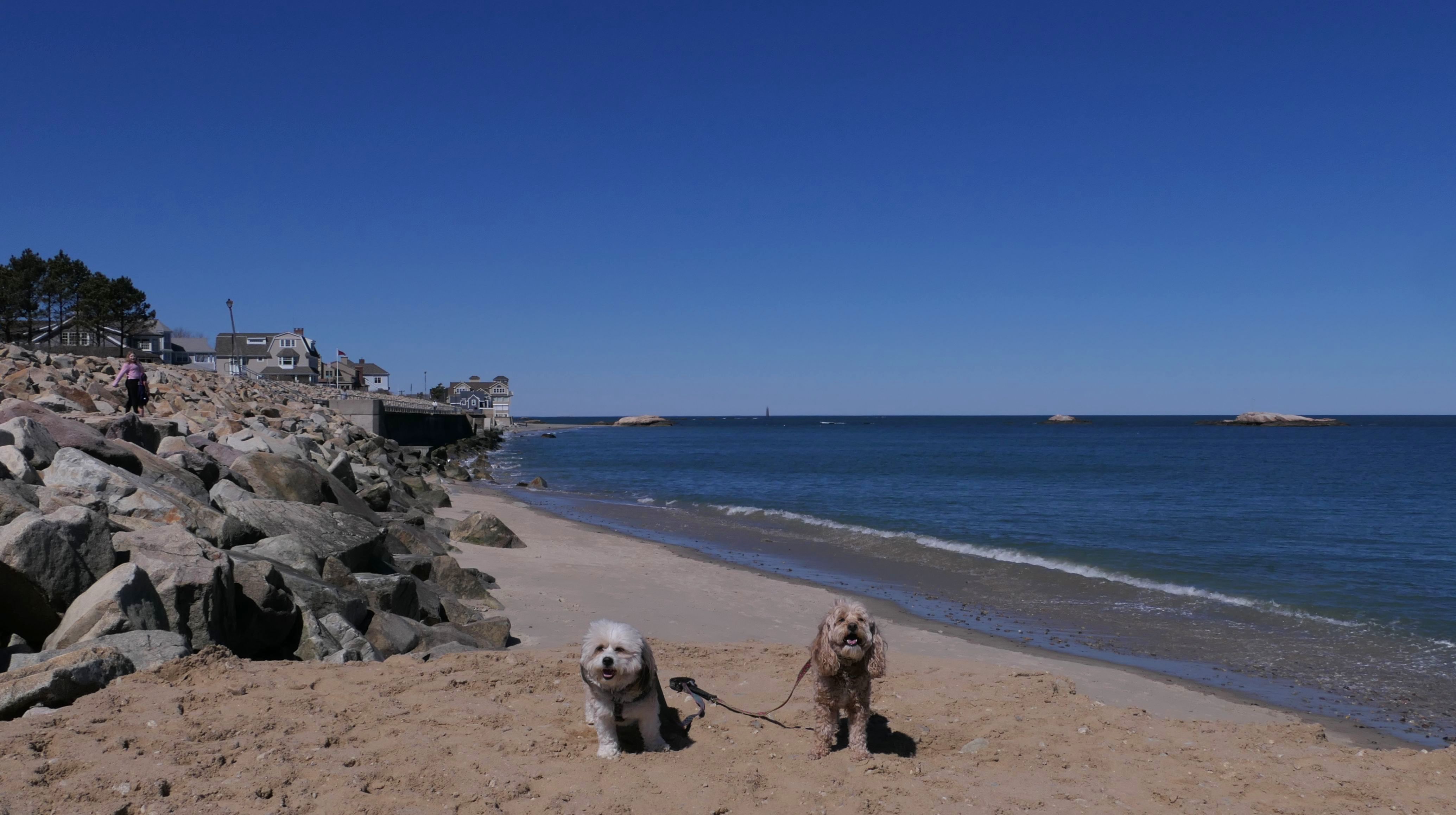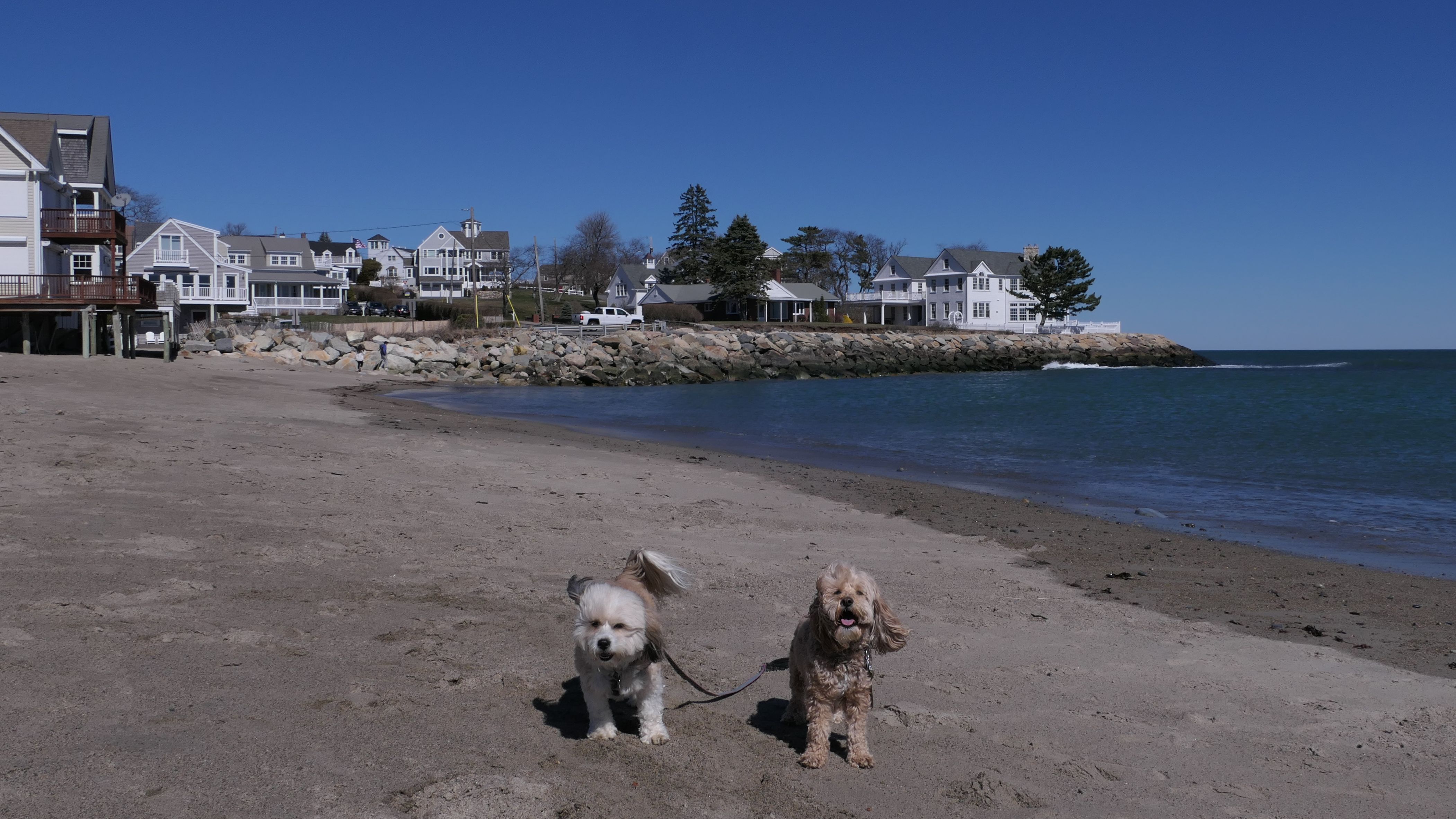 It was difficult to find a parking spot here. The small lots for this beach were all permit parking only. We eventually did find some parking on the road, but like Cohasset, I get the distinct impression the locals don't want us outsiders here. This is a small beach, and dogs are allowed from Sept 16 to June 14th. The beach is in two sections separated by a seawall. The seawall has a walking trail that runs along the top of the wall. There are poop bag dispensers, but no garbage cans. People left their filled poop bags all along the seawall. The bags were likely left by the people who live in the town and have a permit to park, but as an unwanted outsider, I took Mandy and Lexi's poop bags with me when I left.