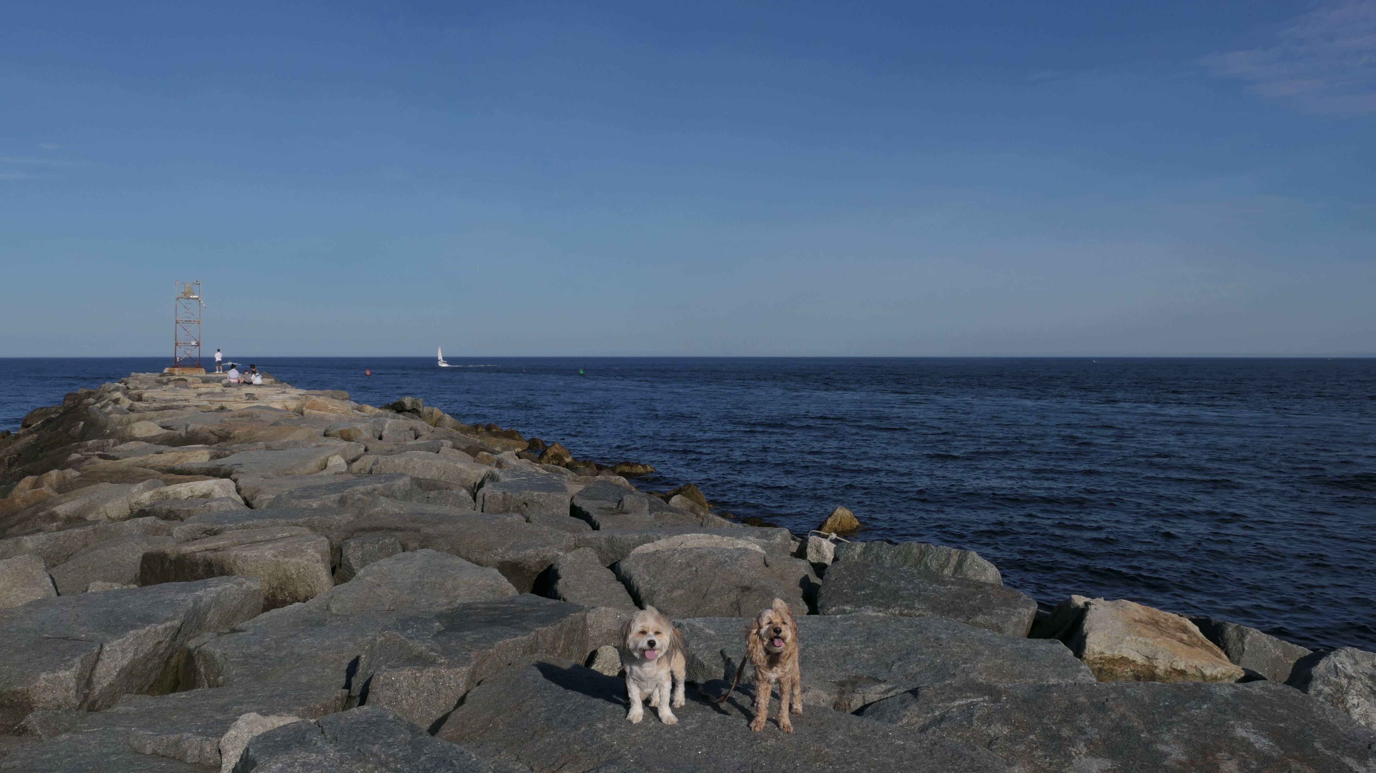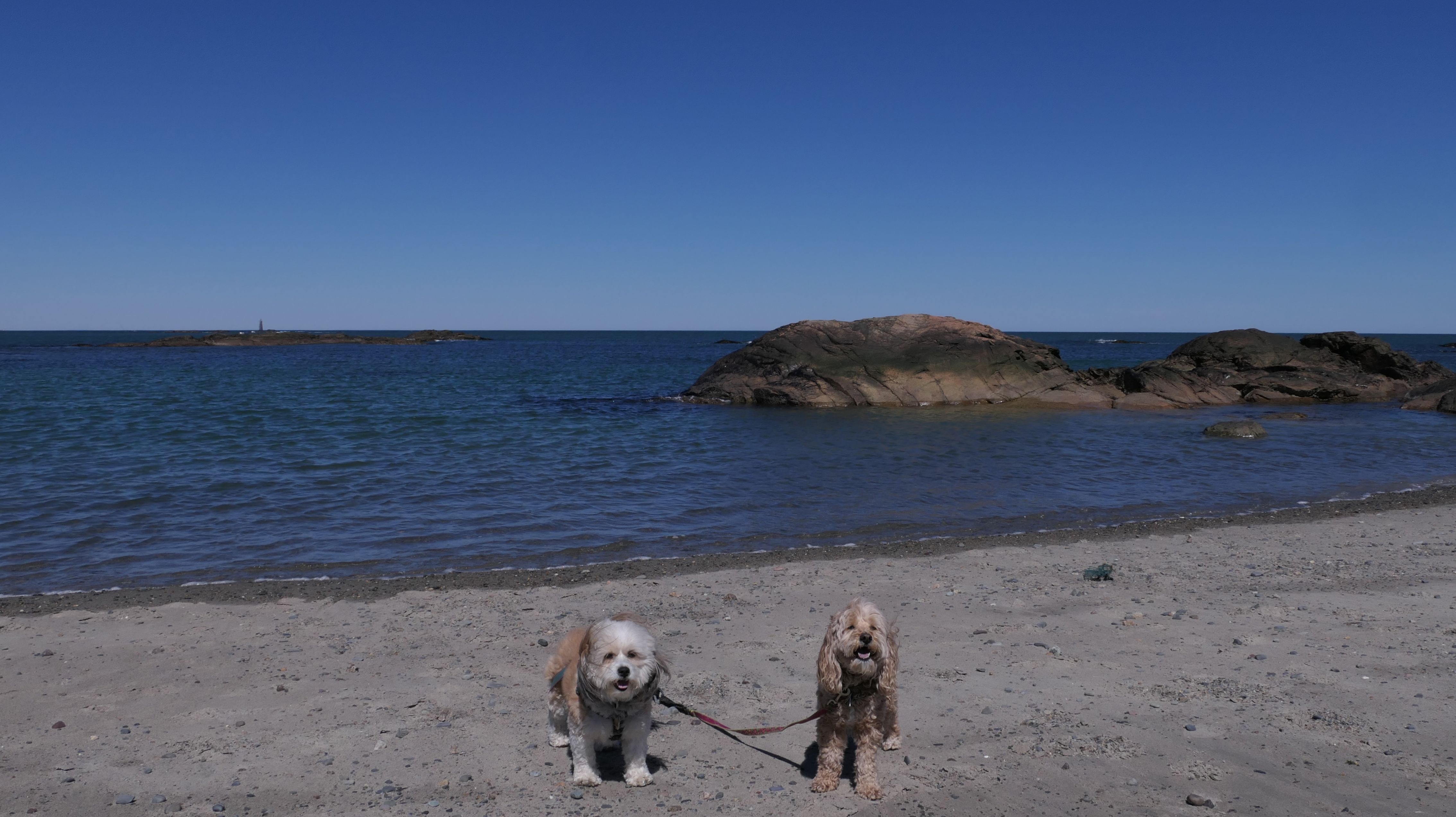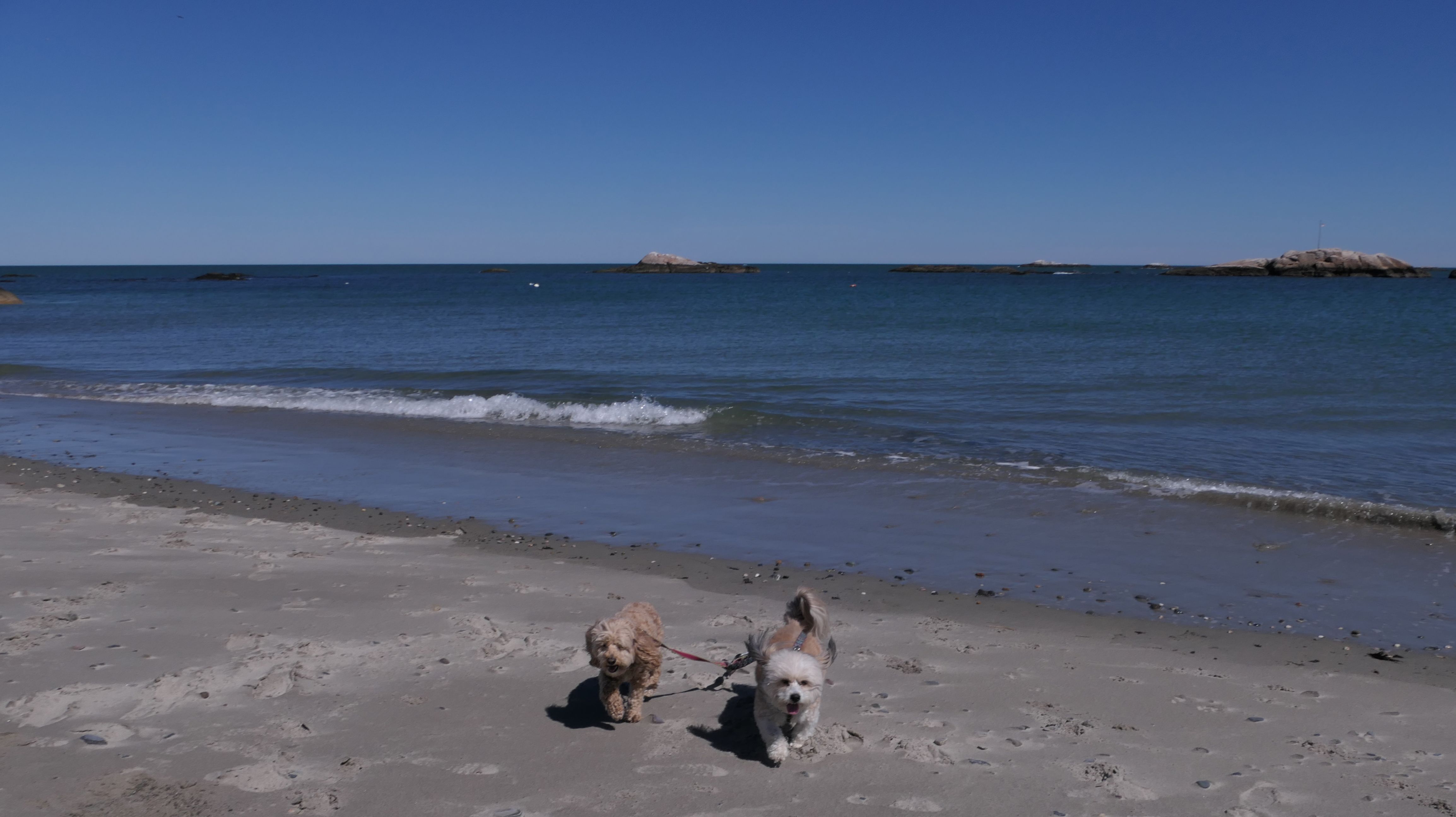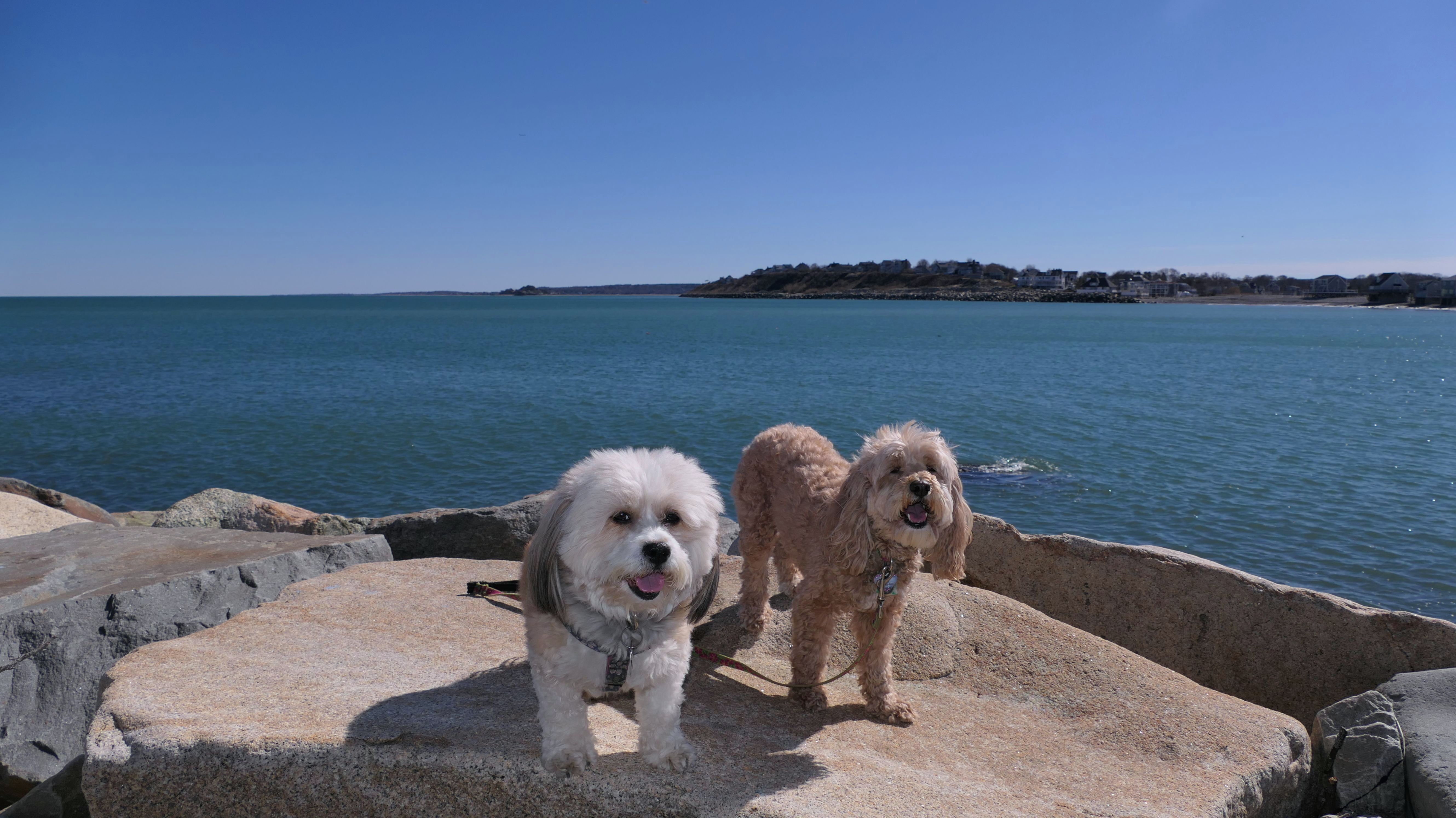 It was difficult to find a parking spot here. The small lots for this beach were all permit parking only. We eventually did find some parking on the road, but like Cohasset, I get the distinct impression the locals don't want us outsiders here. This is a small beach, and dogs are allowed from Sept 16 to June 14th. The beach is in two sections separated by a seawall. The seawall has a walking trail that runs along the top of the wall. There are poop bag dispensers, but no garbage cans. People left their filled poop bags all along the seawall. The bags were likely left by the people who live in the town and have a permit to park, but as an unwanted outsider, I took Mandy and Lexi's poop bags with me when I left.