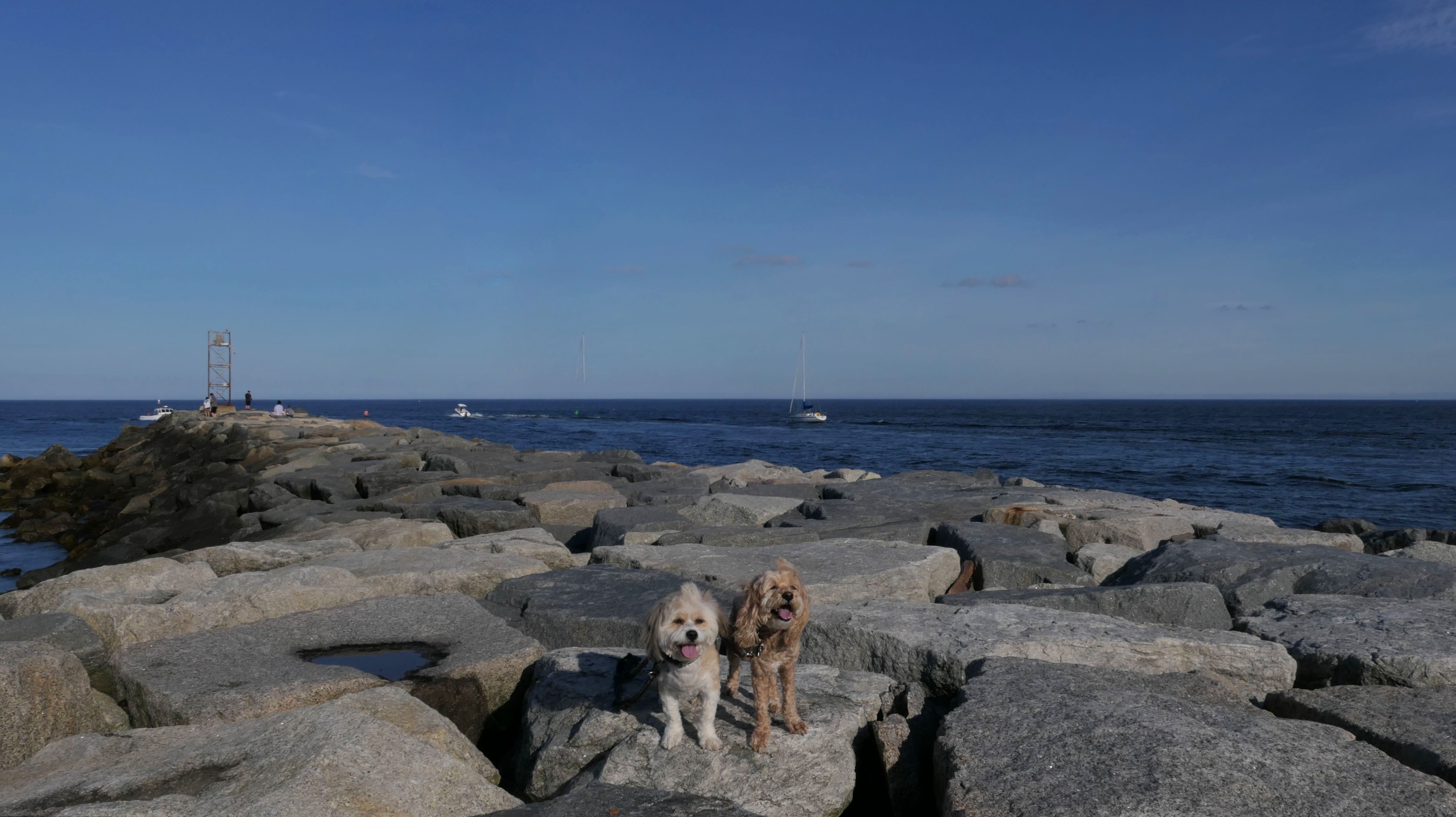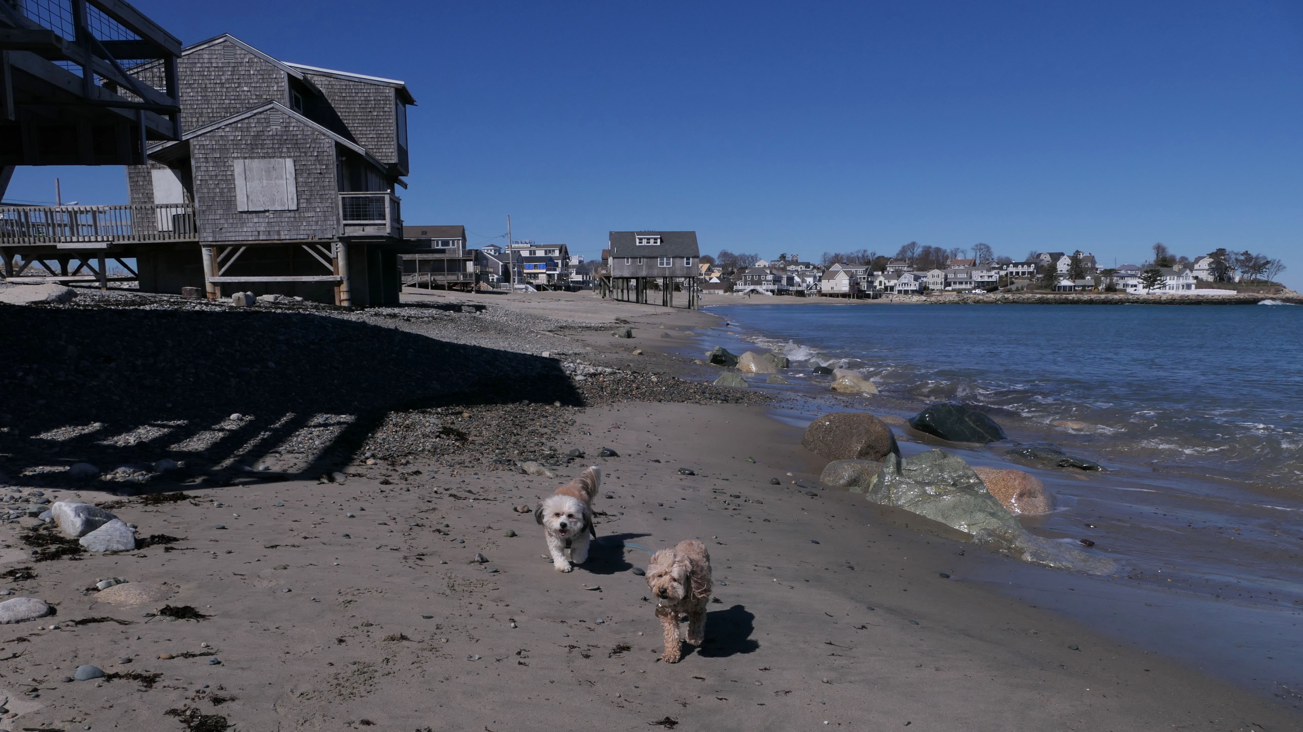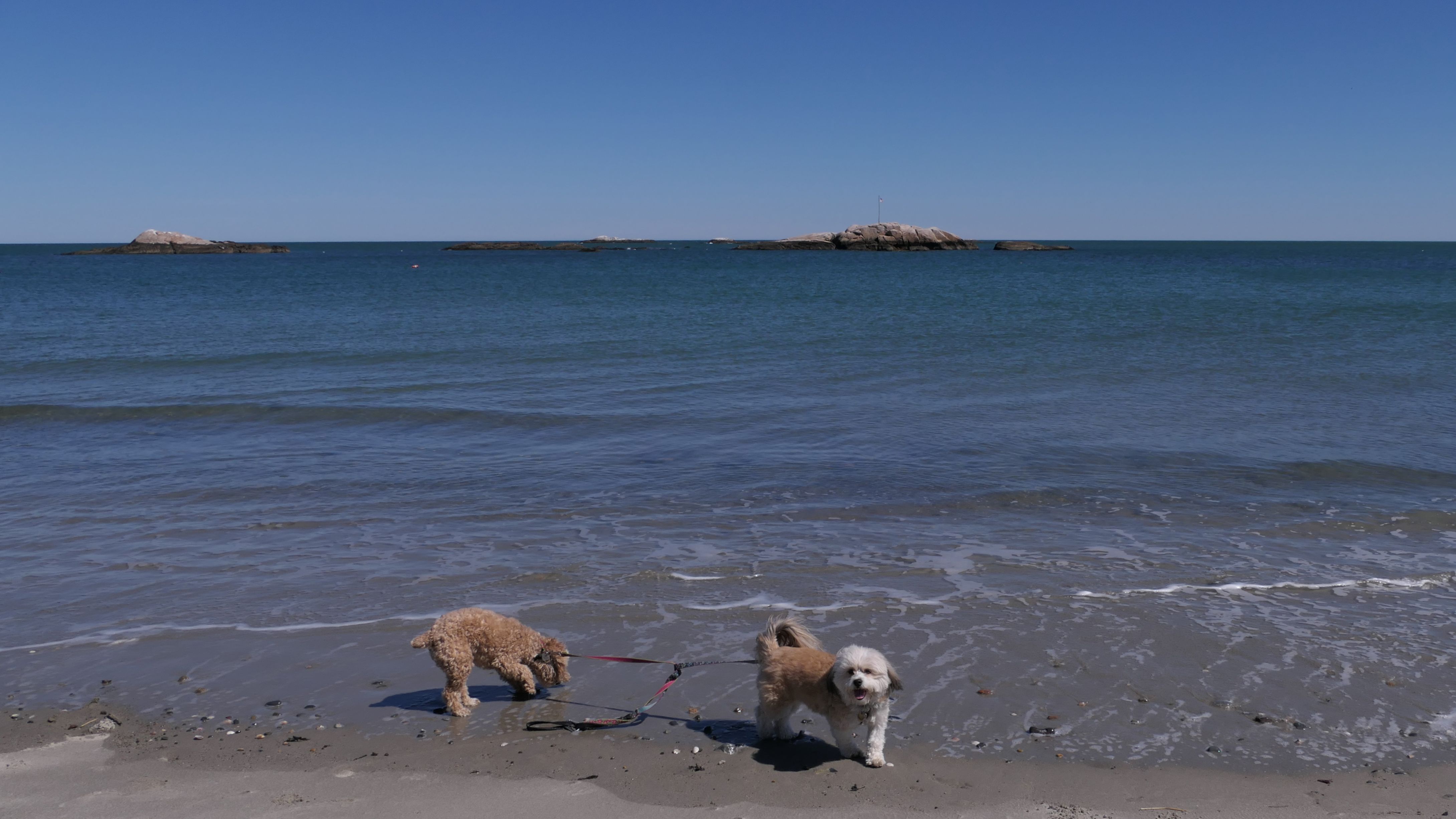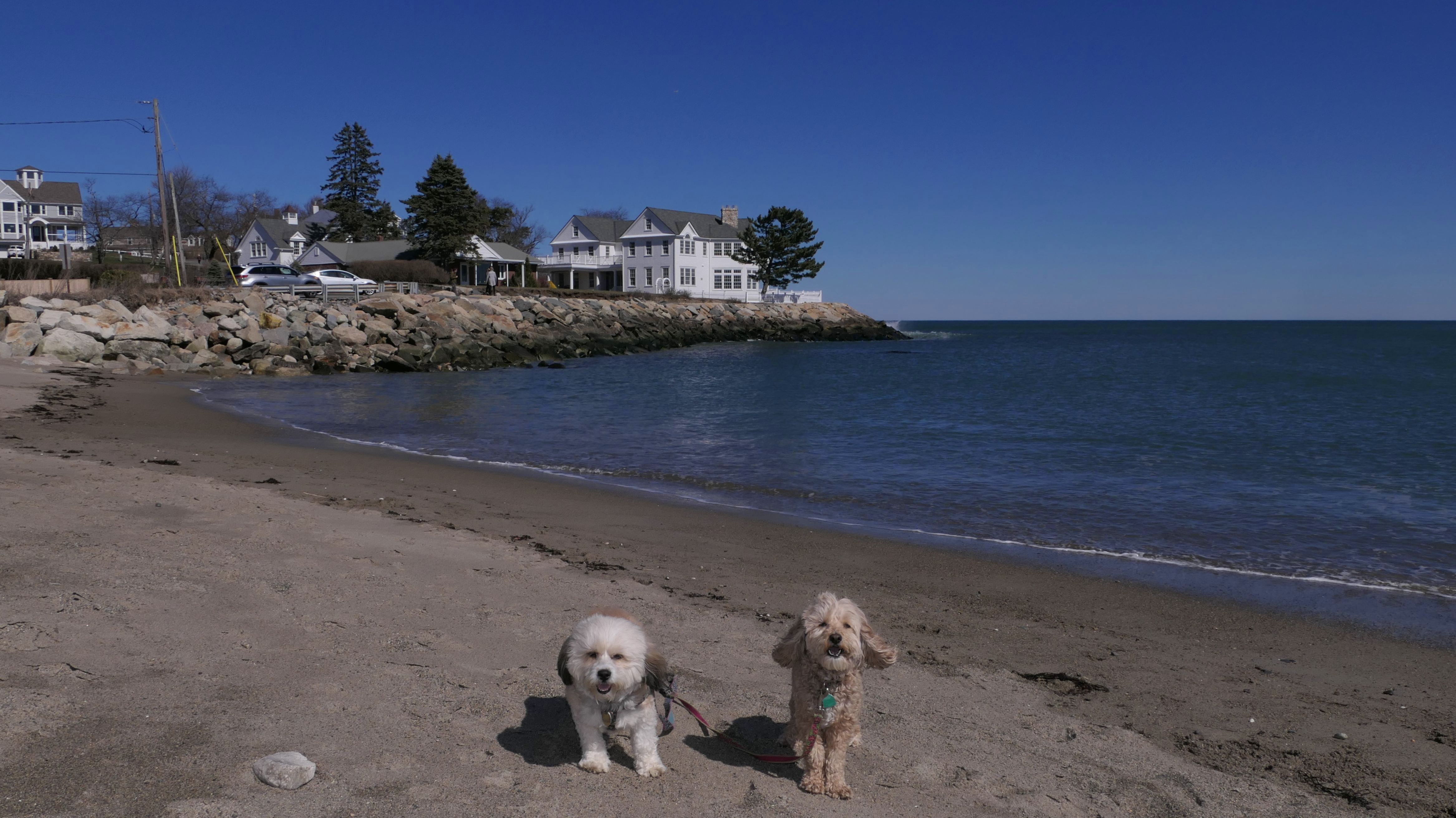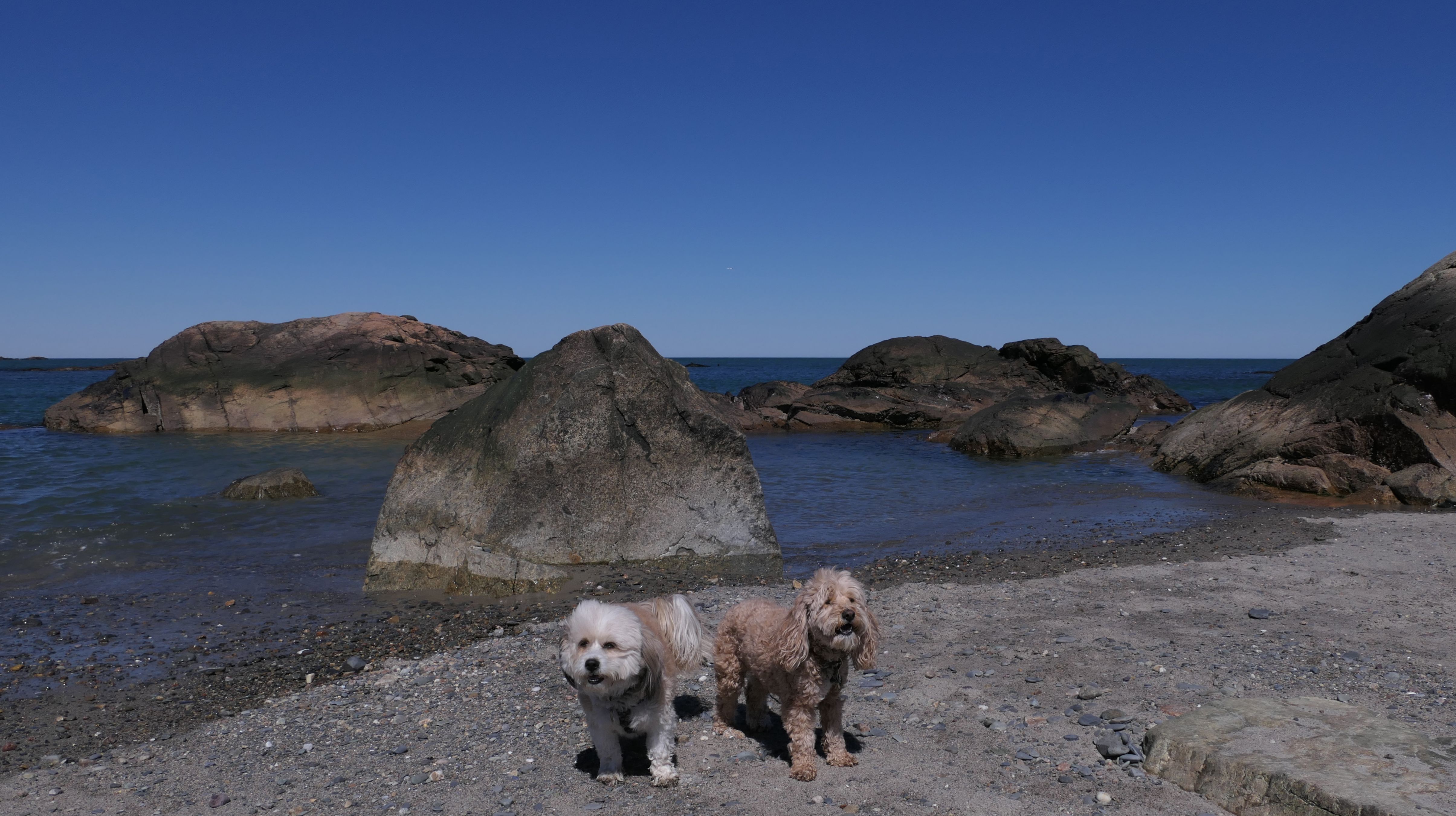 It was difficult to find a parking spot here. The small lots for this beach were all permit parking only. We eventually did find some parking on the road, but like Cohasset, I get the distinct impression the locals don't want us outsiders here. This is a small beach, and dogs are allowed from Sept 16 to June 14th. The beach is in two sections separated by a seawall. The seawall has a walking trail that runs along the top of the wall. There are poop bag dispensers, but no garbage cans. People left their filled poop bags all along the seawall. The bags were likely left by the people who live in the town and have a permit to park, but as an unwanted outsider, I took Mandy and Lexi's poop bags with me when I left.