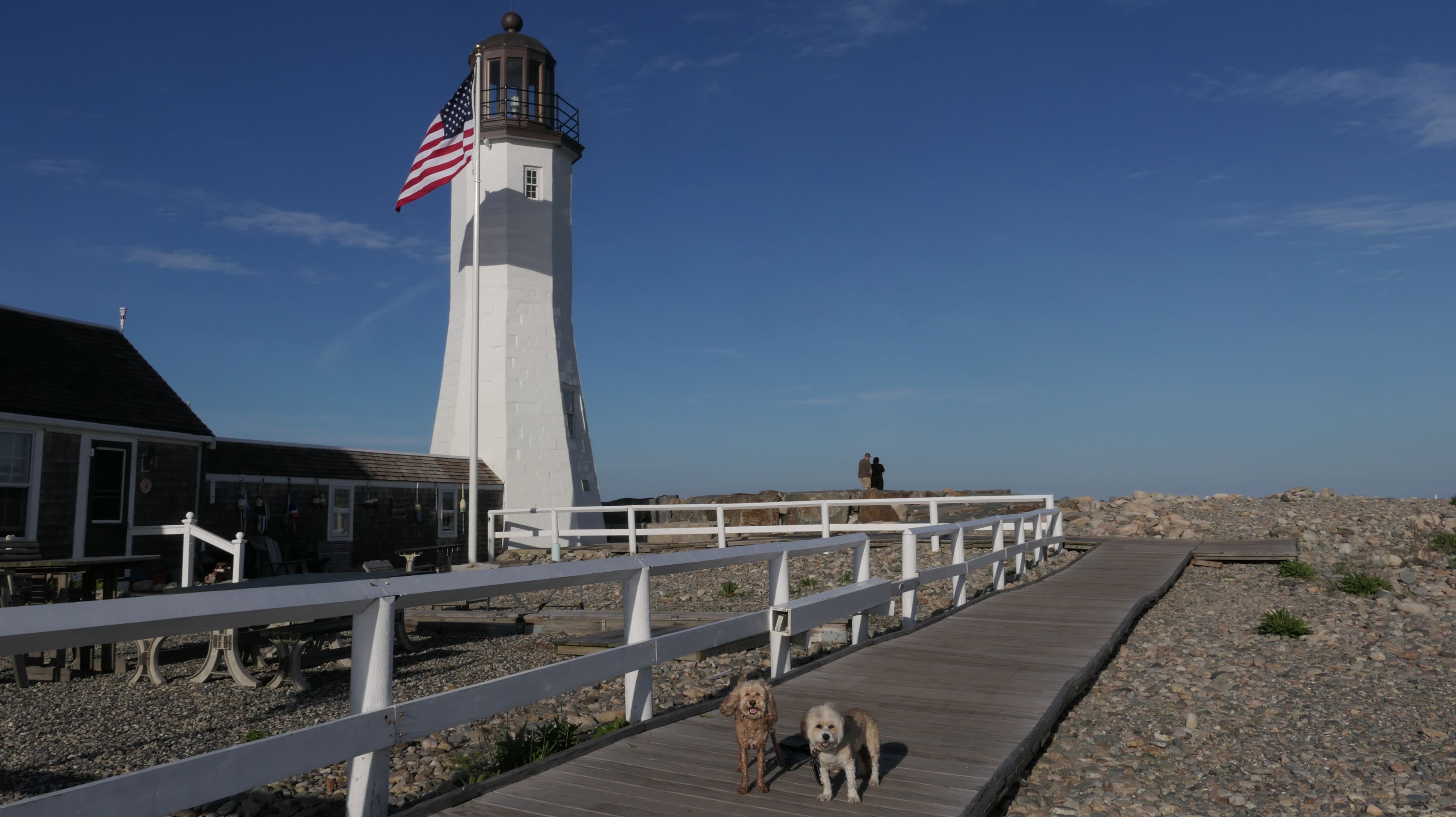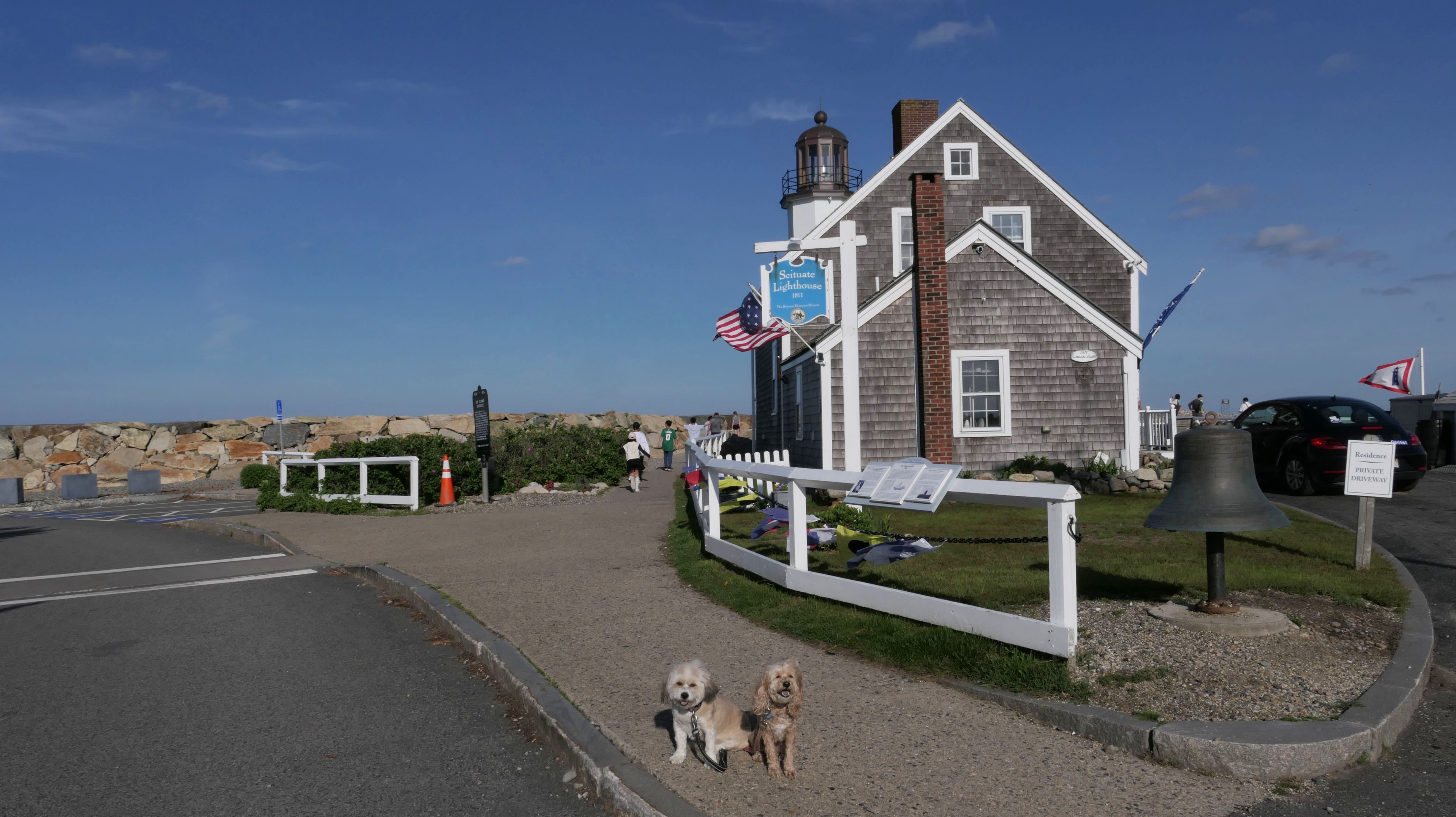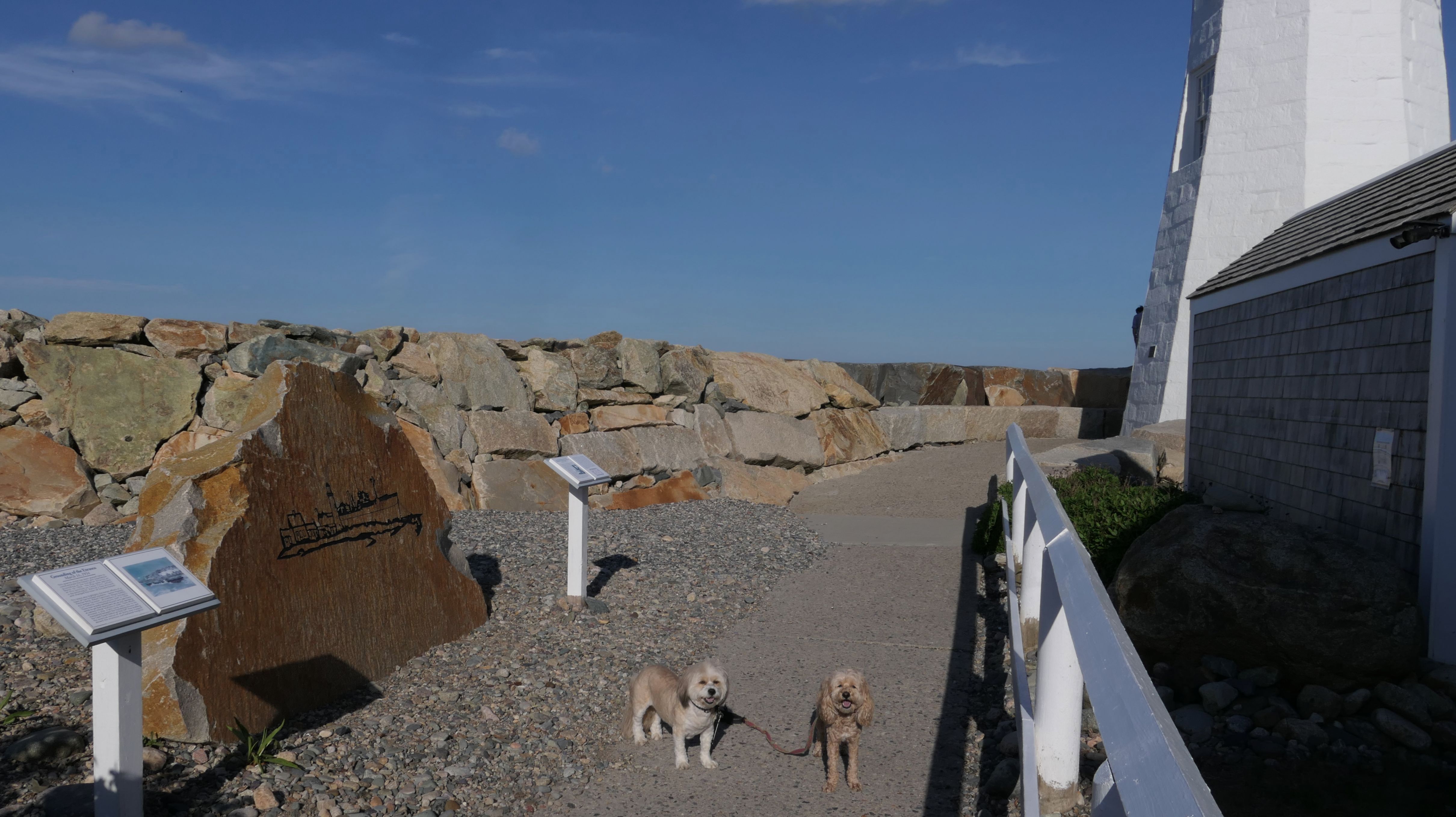 This is a park surrounding the old lighthouse at Scituate Harbor. There's a decent parking lot, and a number of benches overlooking the harbor. You can walk all the way around the lighthouse. We walked out the long jetty, and also to the sandy area on the other side of the large rocks, where Mandy and Lexi were able to cool off in the calm water. We also took about a mile walk through the adjacent neighborhood. This is definitely a nice place to hang out with the dogs for a bit.