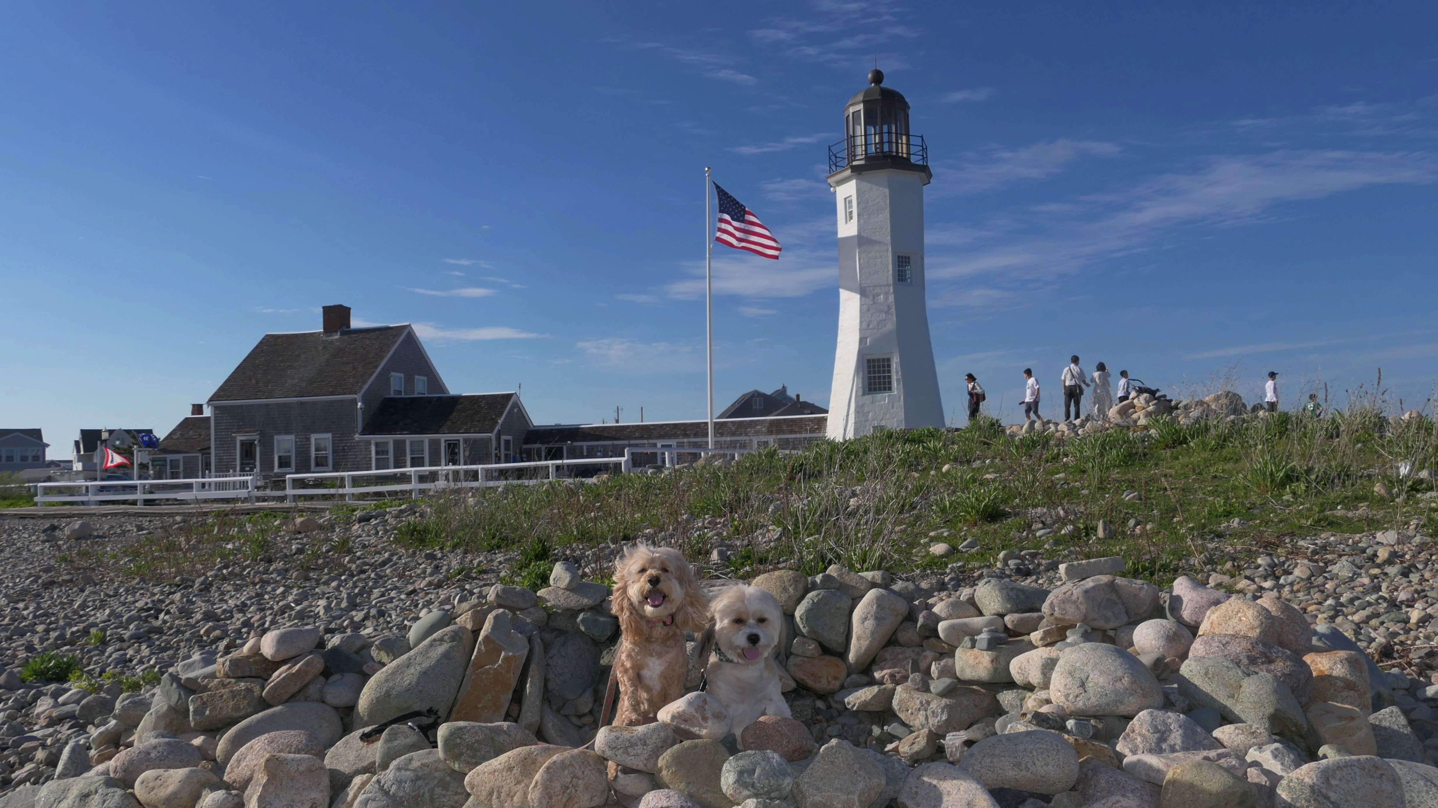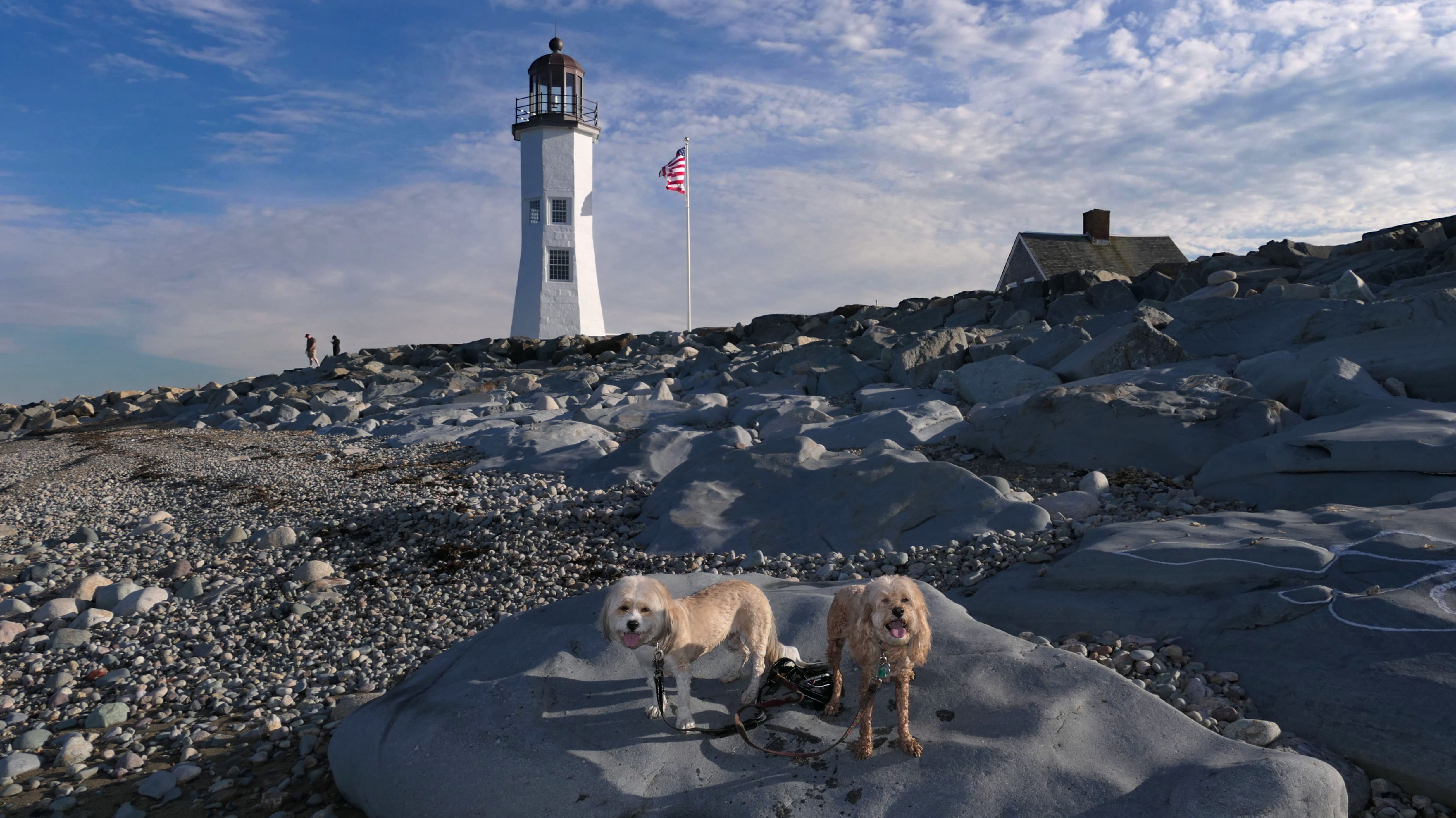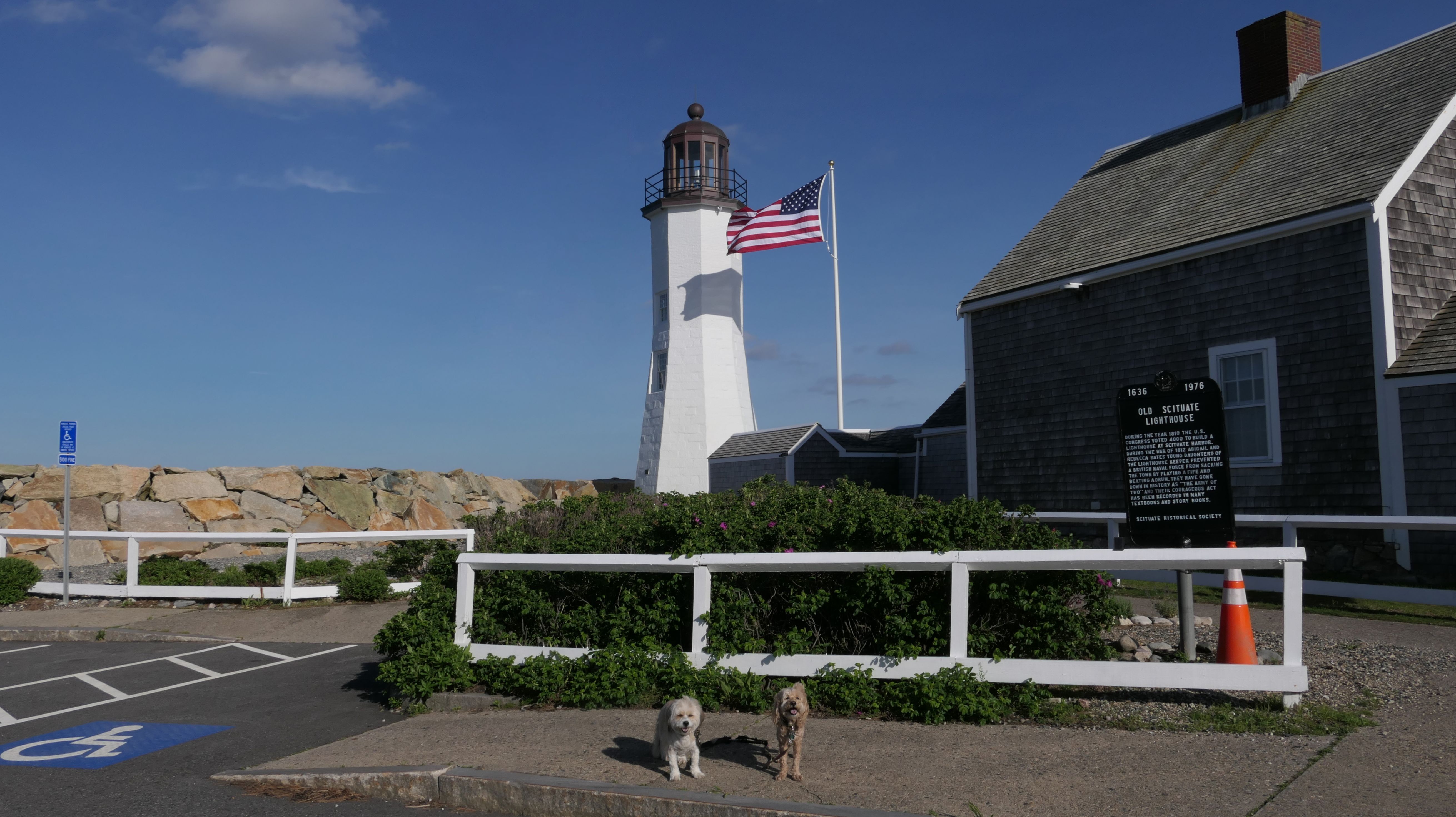 This is a park surrounding the old lighthouse at Scituate Harbor. There's a decent parking lot, and a number of benches overlooking the harbor. You can walk all the way around the lighthouse. We walked out the long jetty, and also to the sandy area on the other side of the large rocks, where Mandy and Lexi were able to cool off in the calm water. We also took about a mile walk through the adjacent neighborhood. This is definitely a nice place to hang out with the dogs for a bit.