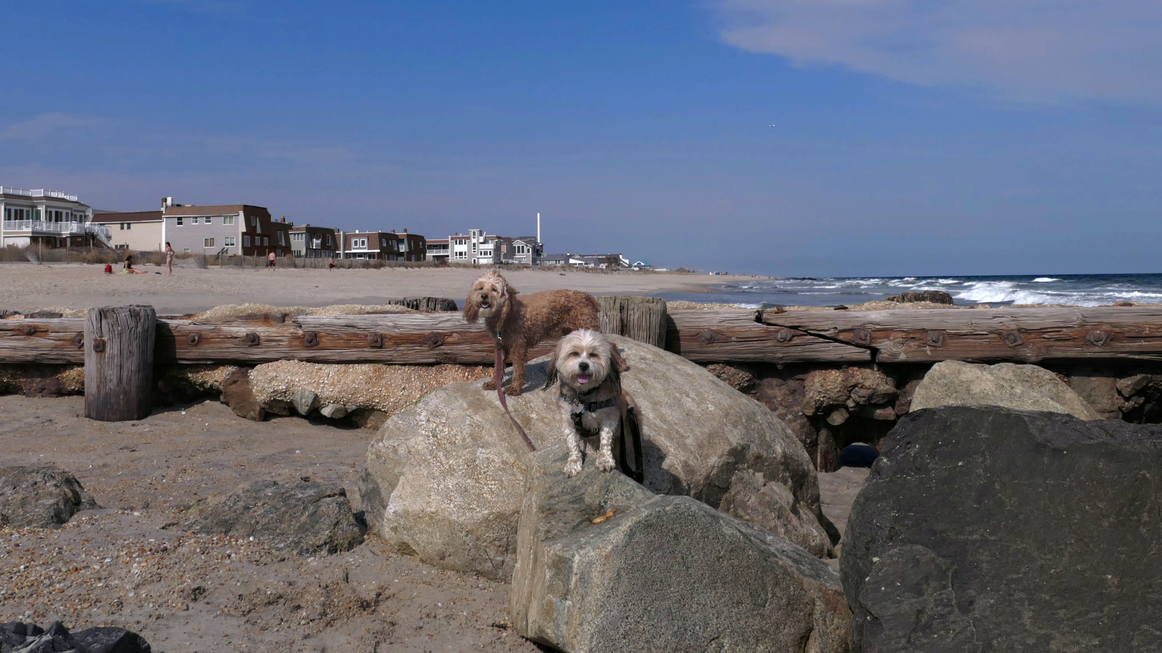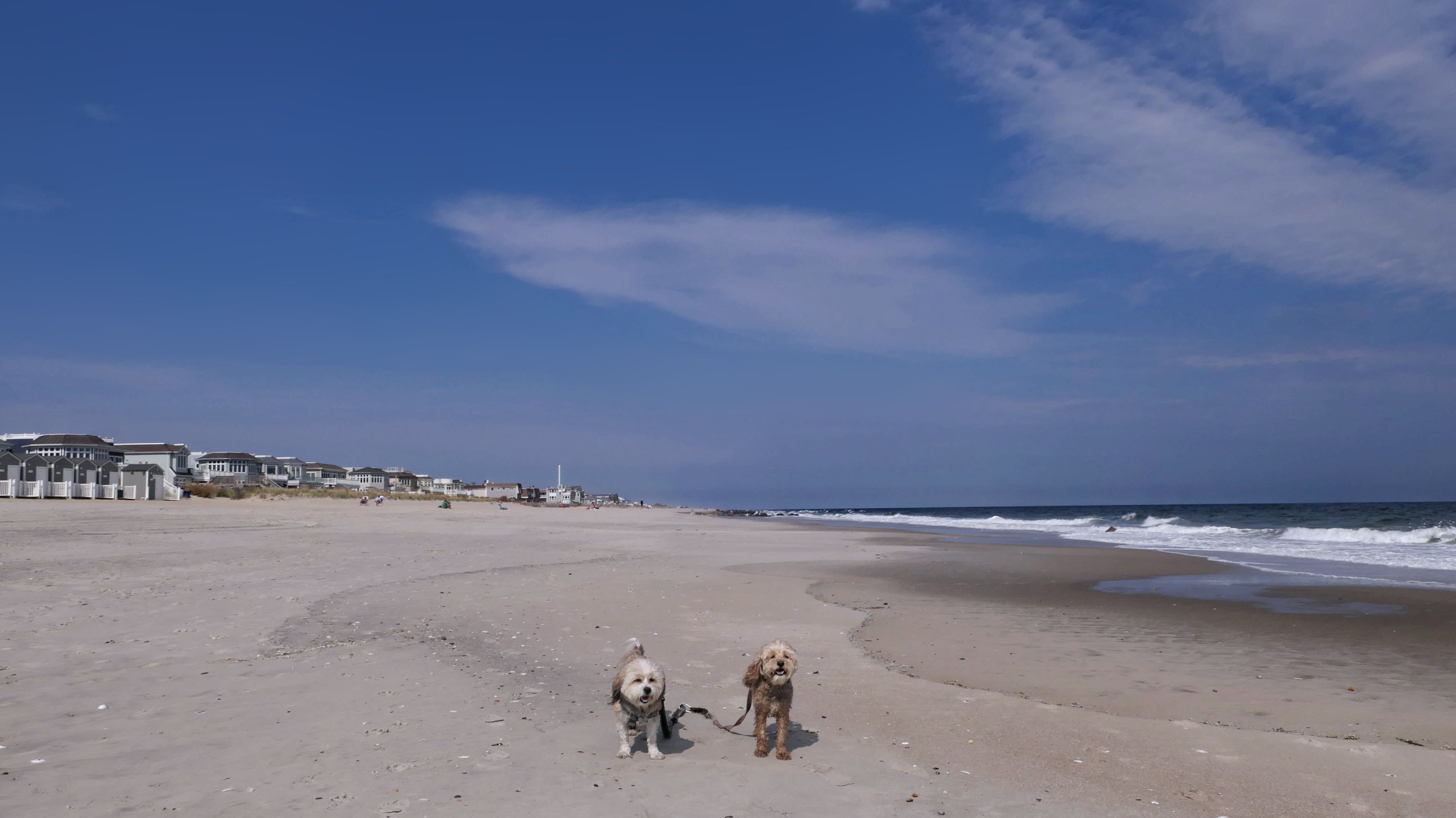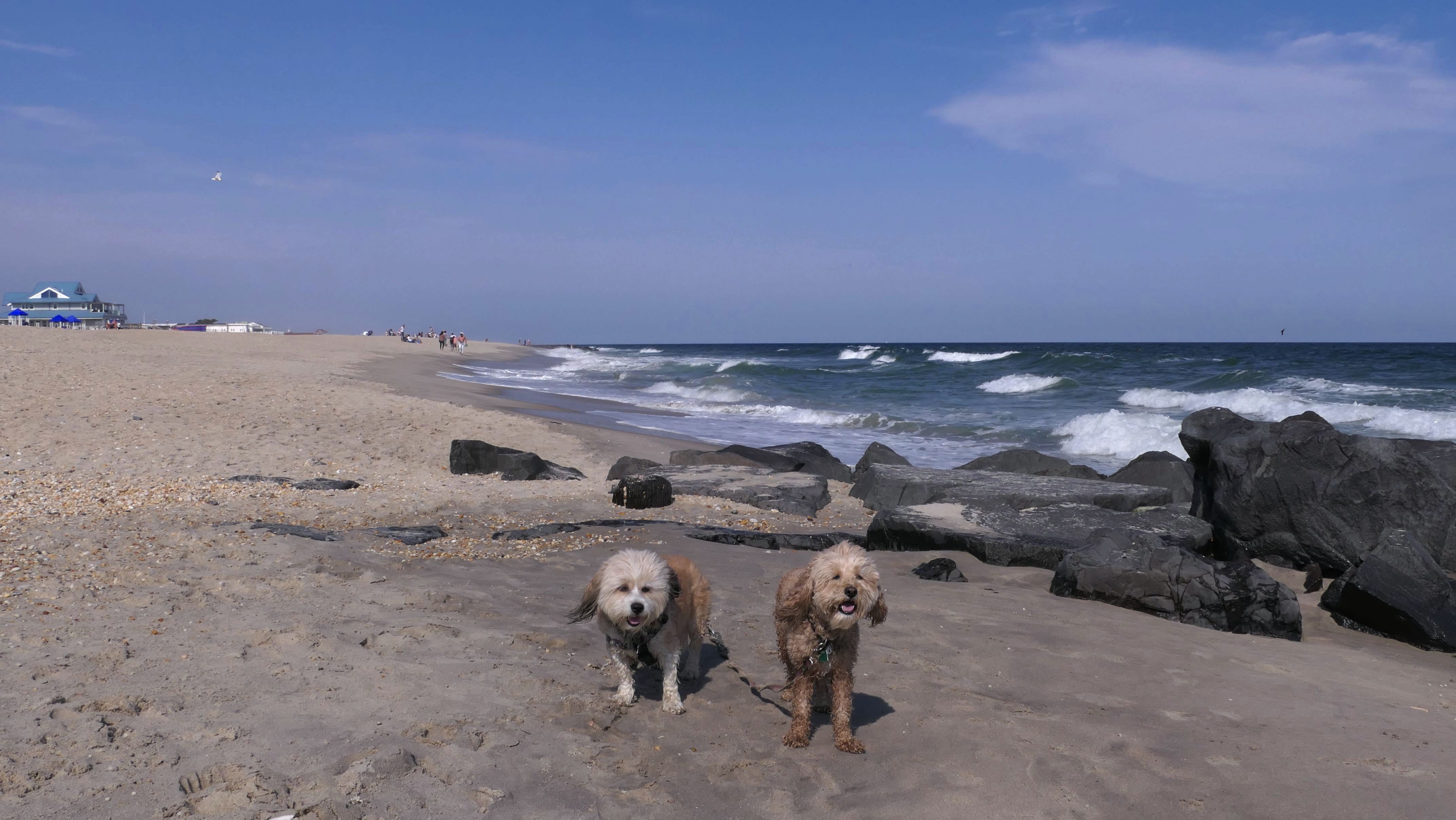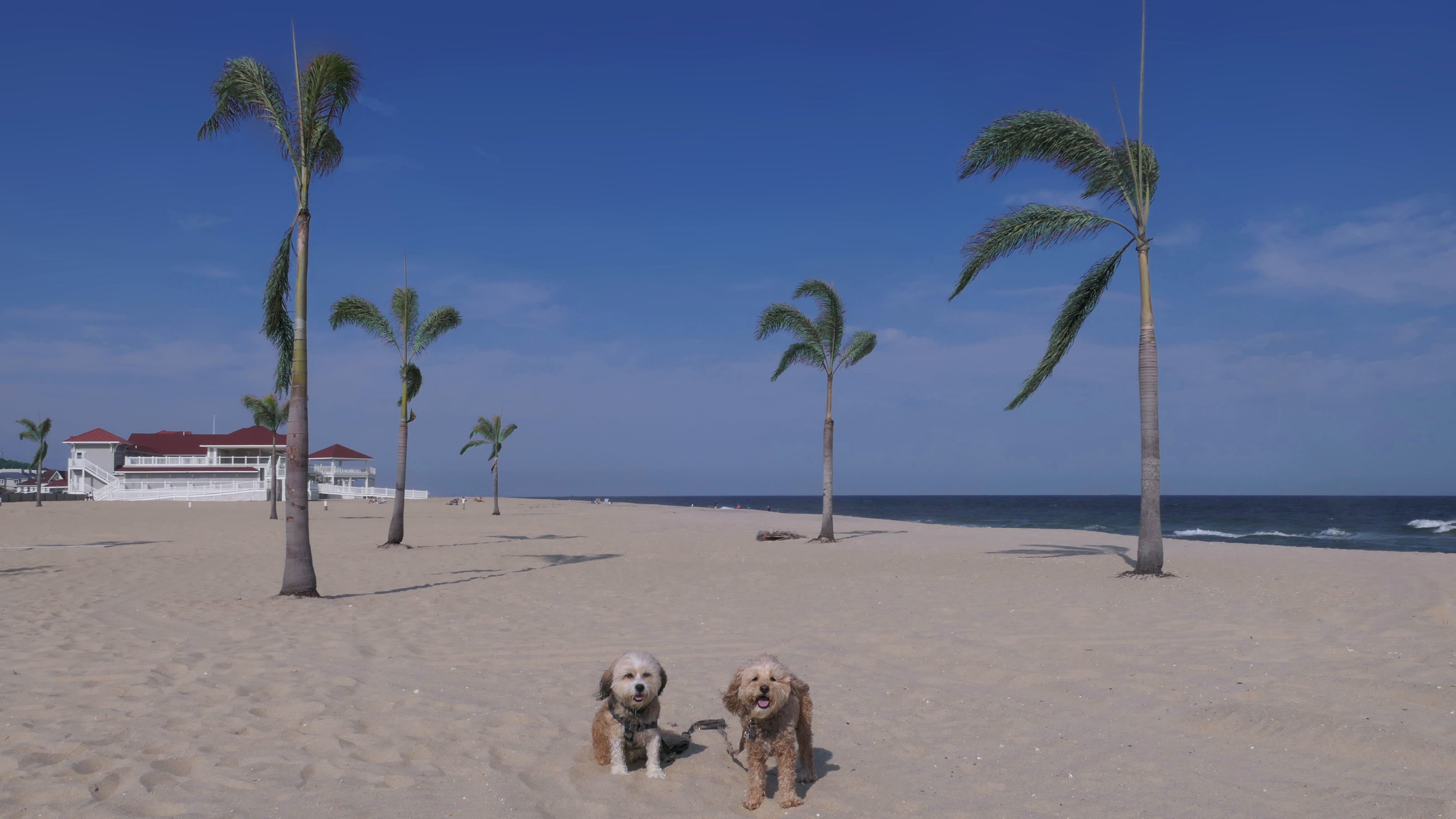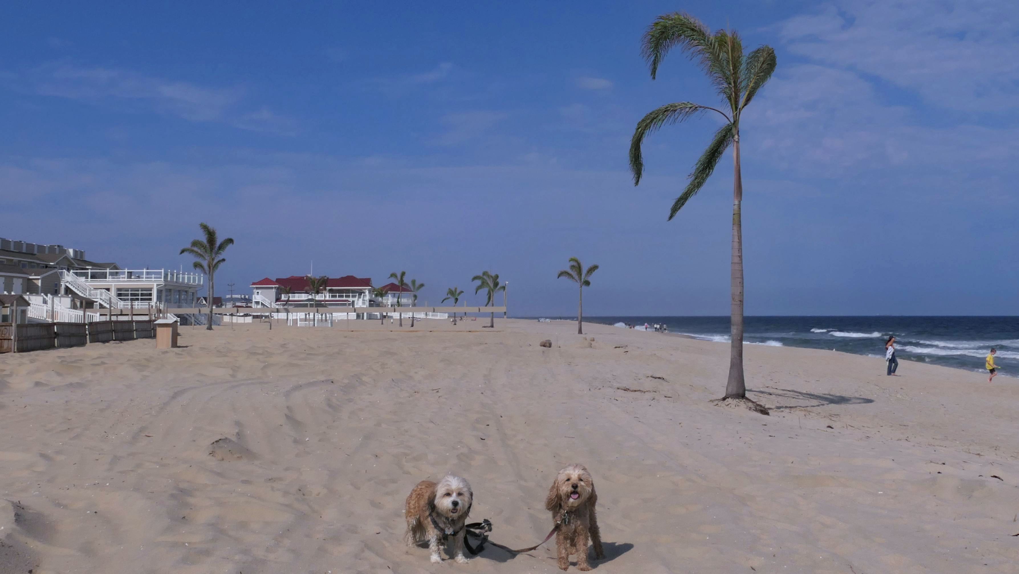 I just don't want to give up on summer! We drove 3+ hours for another little taste of summer. It was 45 degrees, cloudy and raining in Connecticut when we left the house, but 73 degrees, warm and mostly sunny at this beach on the Jersey Shore. It's a pretty nice beach too. Dogs are allowed in the off-season, from September 16th to March 14th. Parking is free in the off-season as well. We parked at the main lot and walked about a mile and back in both directions, walking a bit over four miles total. I was surprised to see the palm trees. They appear to be part of Surfrider Beach Club. Do they plant new ones every year? That, along with the haze in the air, certainly added to the summer feel. It was wonderful to have another day like this, especially considering how miserable the weather was in Connecticut.